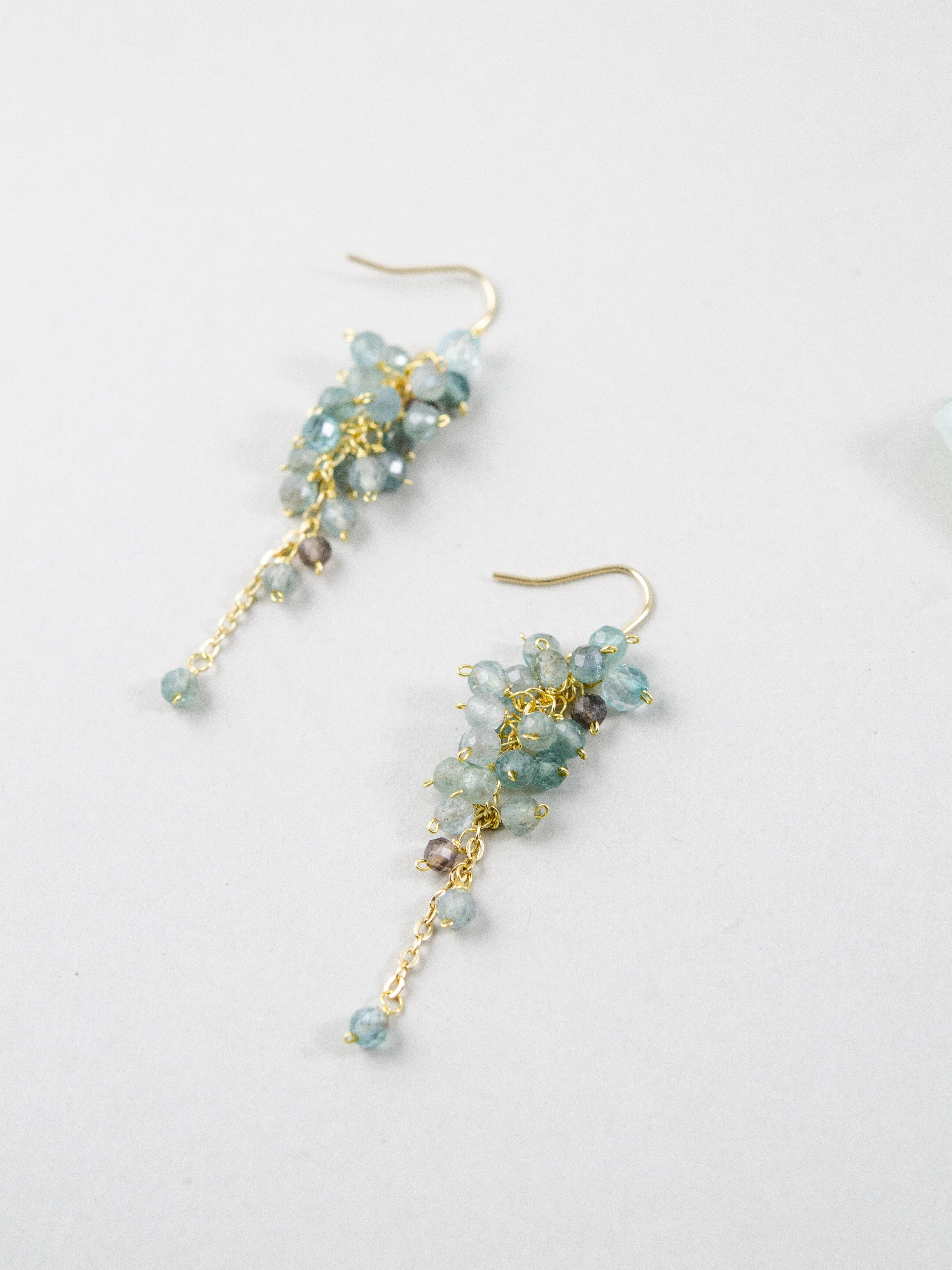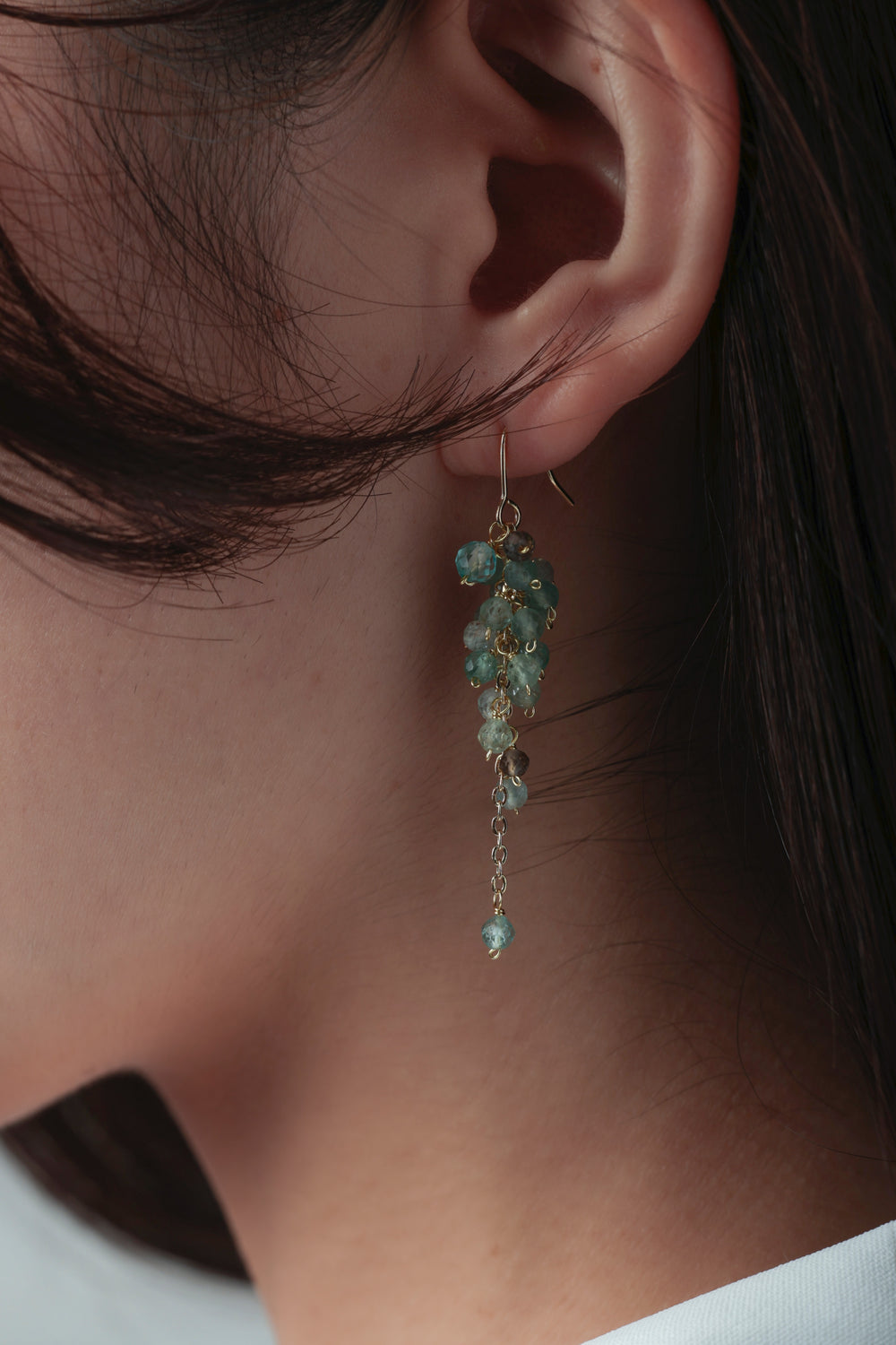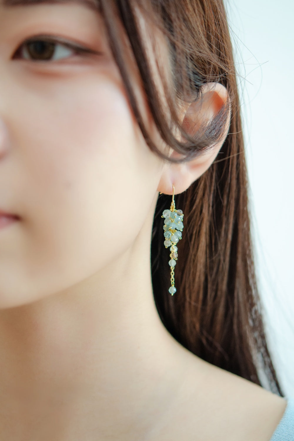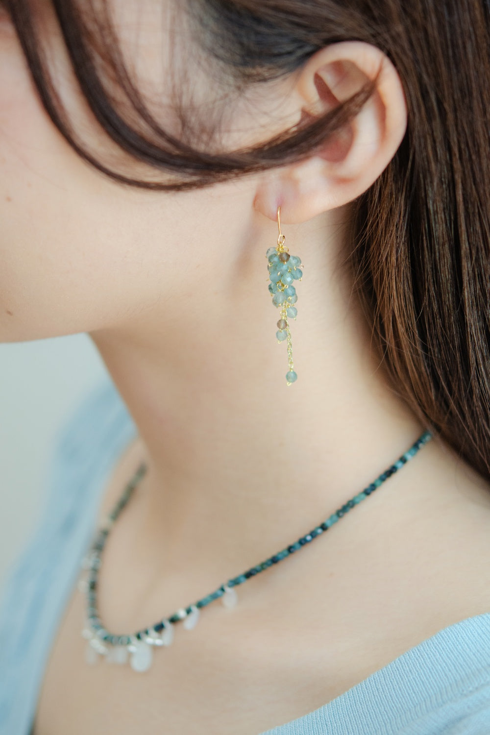 透き通るようなブルーグリーンのアパタイトを贅沢に使用し、軽やかに揺れるチェーンと組み合わせたロングピアスです。小粒ながらもきらめきの強い天然石が耳元で凛とした存在感を放ち、清涼感あふれる色合いがコーディネートに爽やかな印象を添えます。春夏の装いにぴったりな清涼感のあるデザインです。