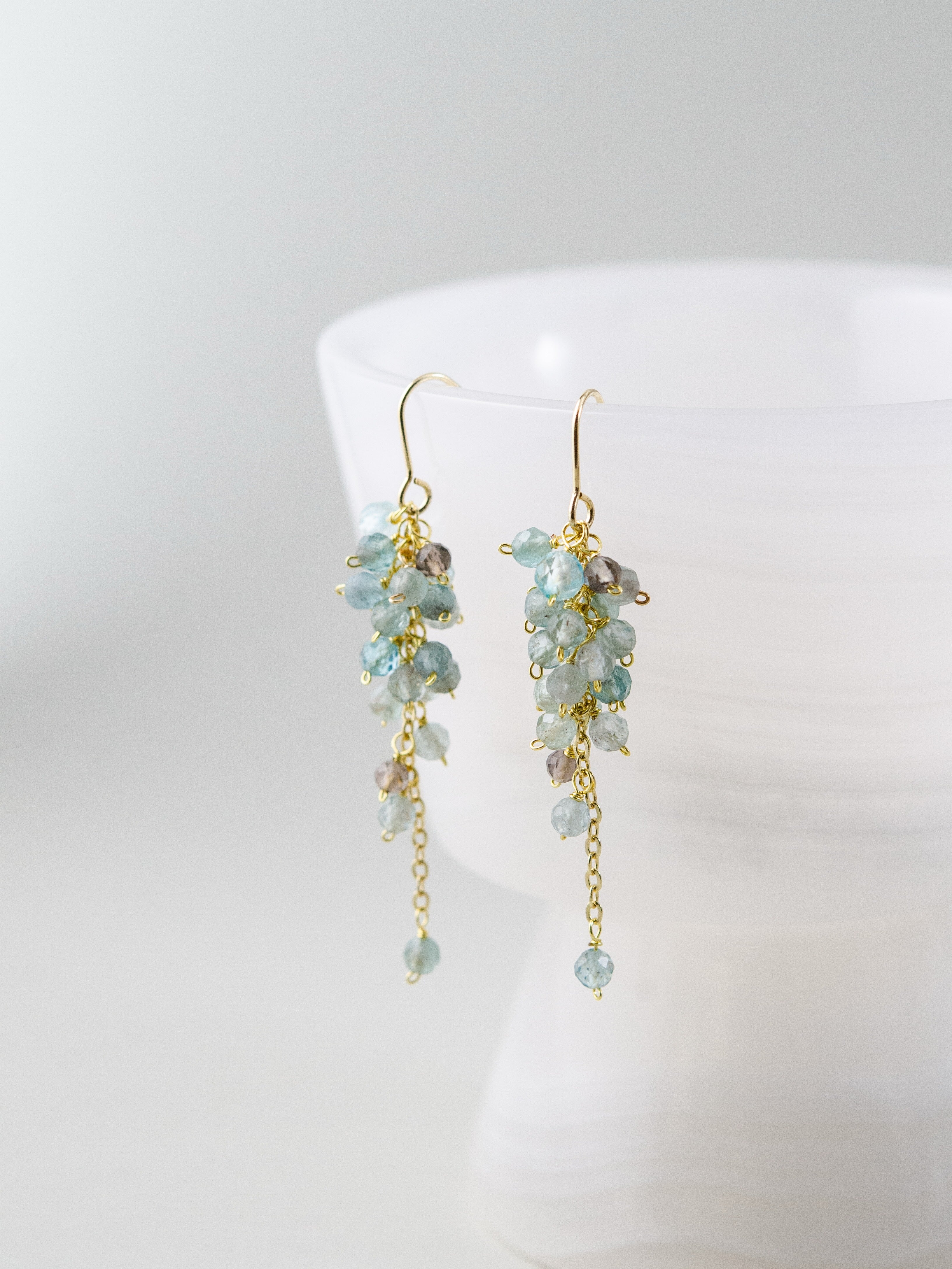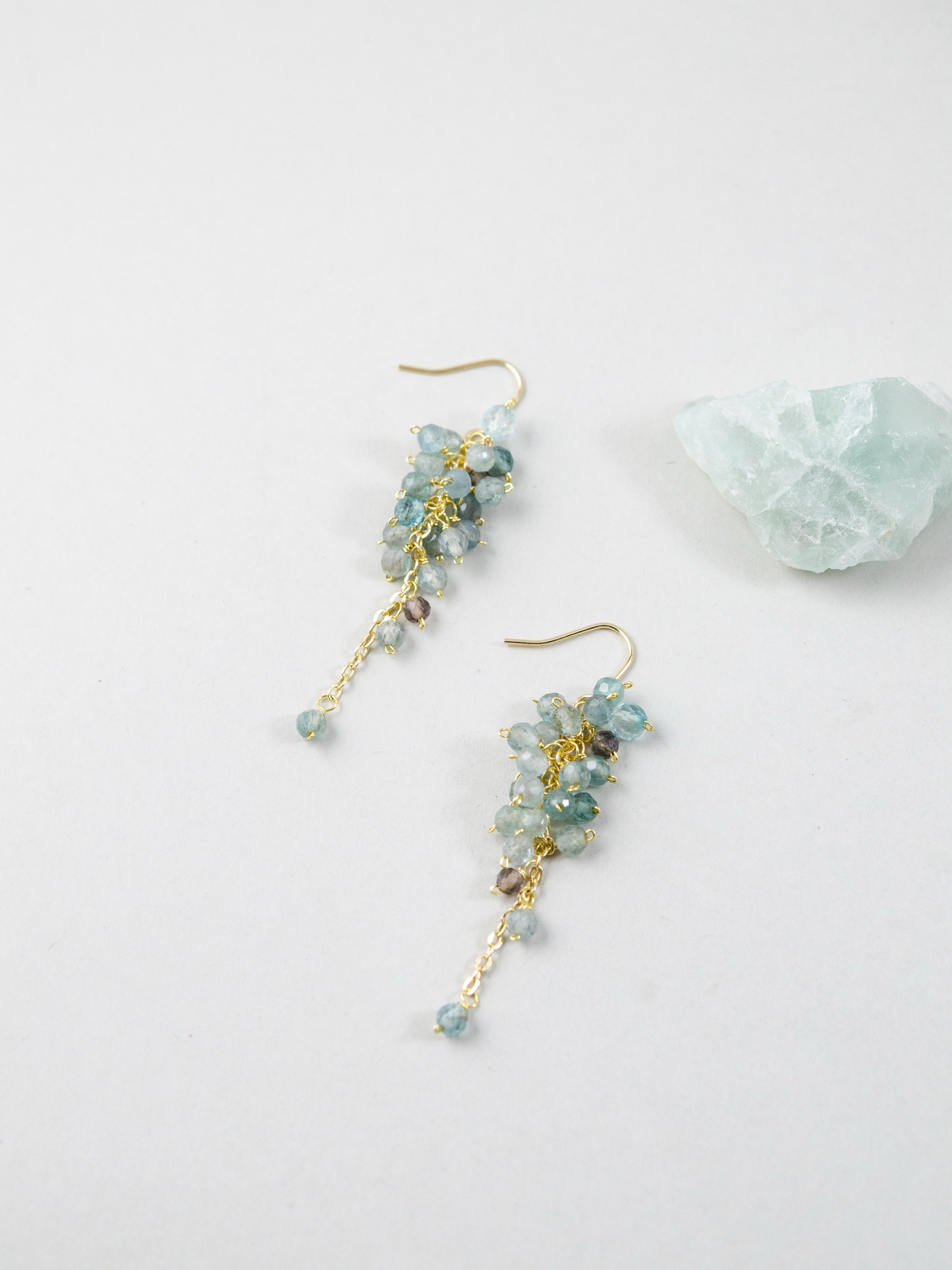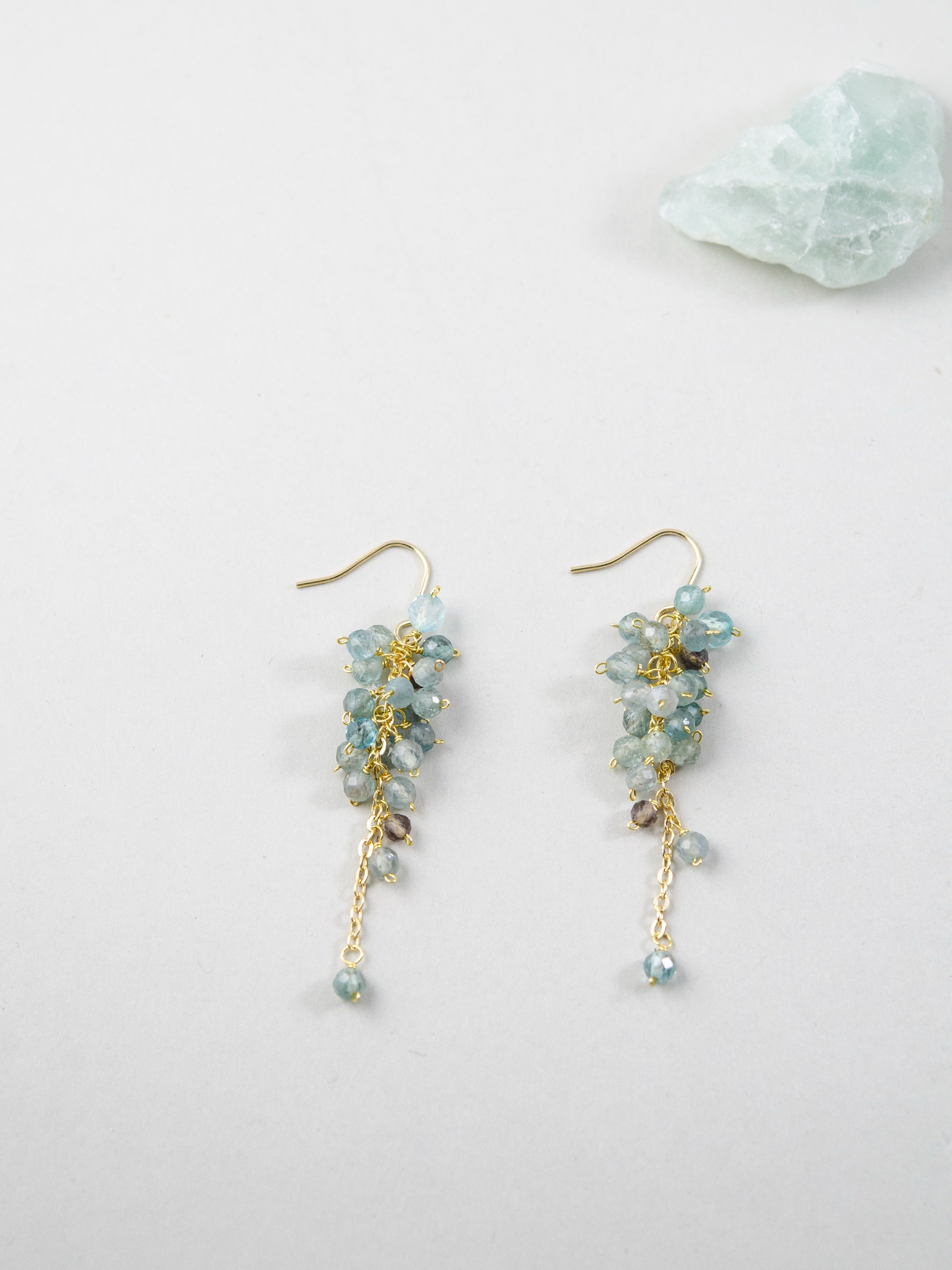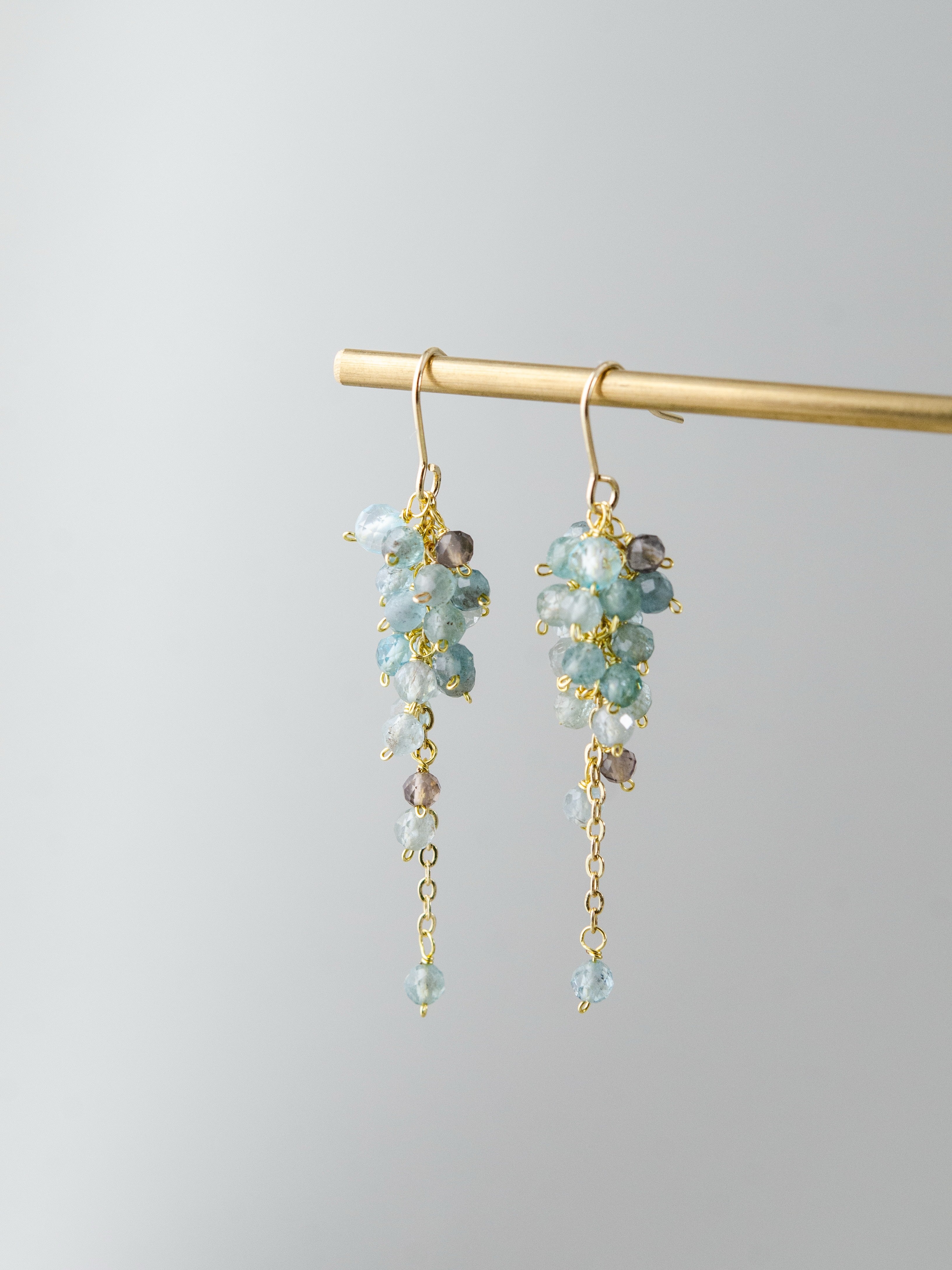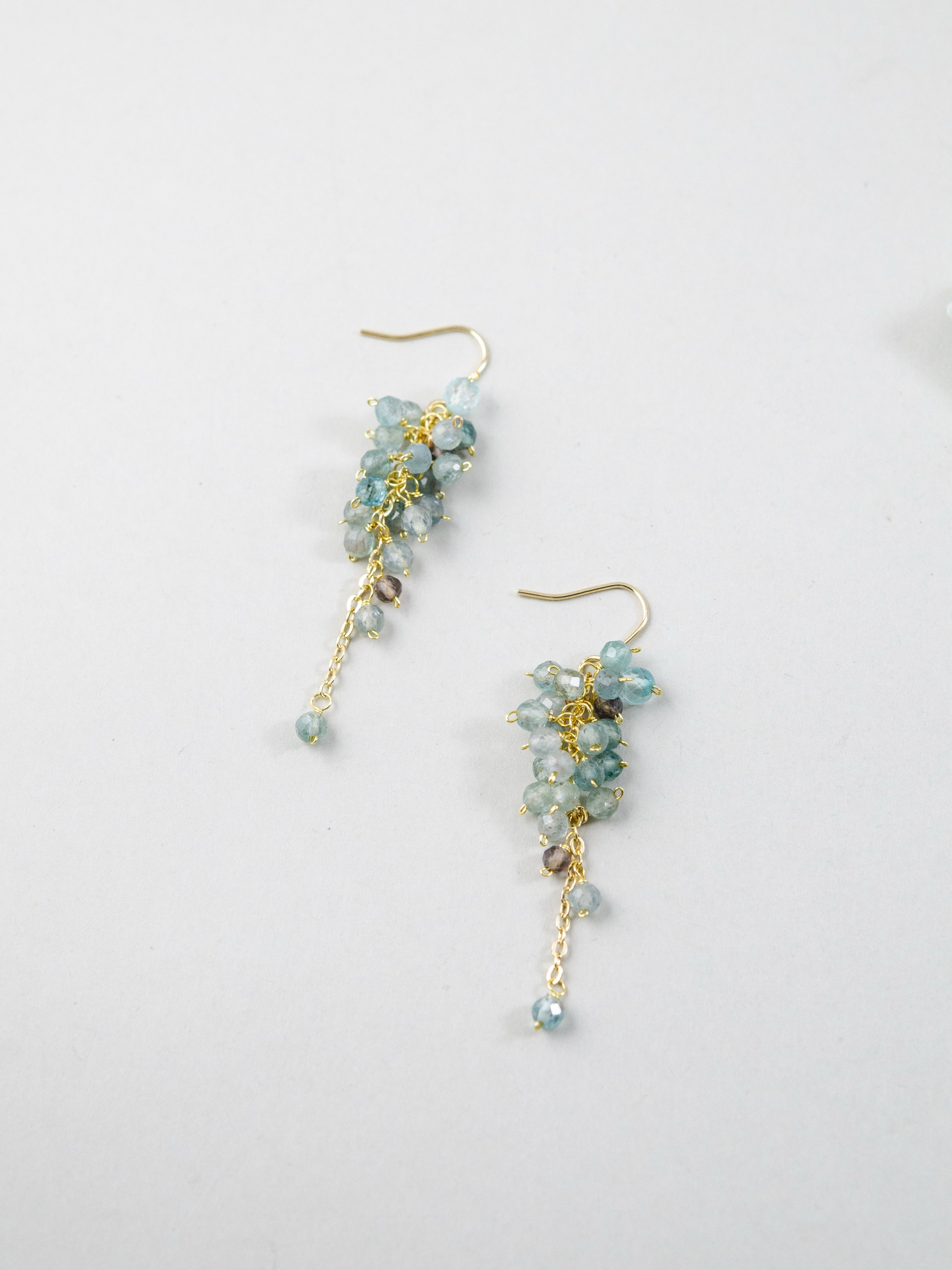 透き通るようなブルーグリーンのアパタイトを贅沢に使用し、軽やかに揺れるチェーンと組み合わせたロングピアスです。小粒ながらもきらめきの強い天然石が耳元で凛とした存在感を放ち、清涼感あふれる色合いがコーディネートに爽やかな印象を添えます。春夏の装いにぴったりな清涼感のあるデザインです。