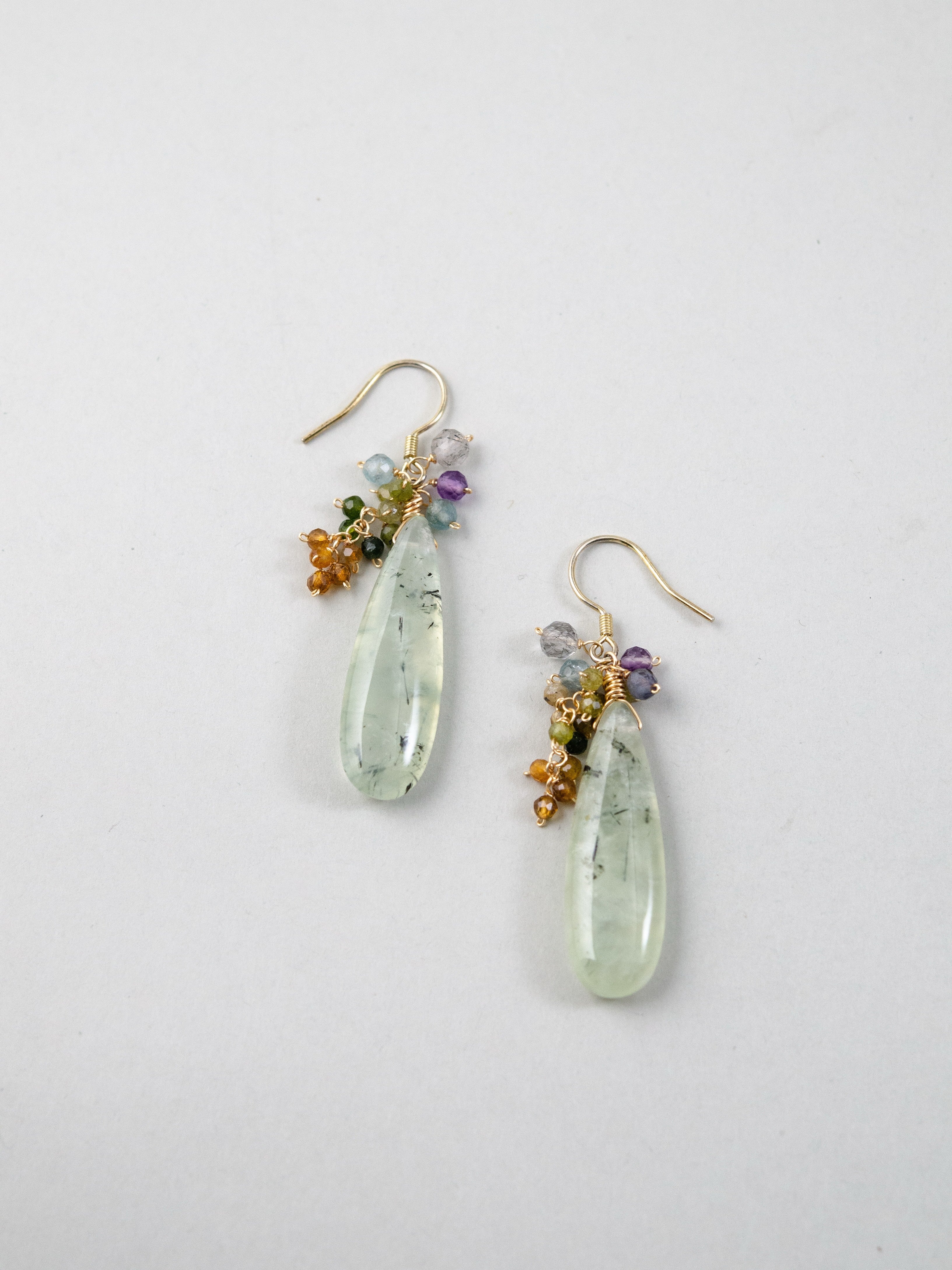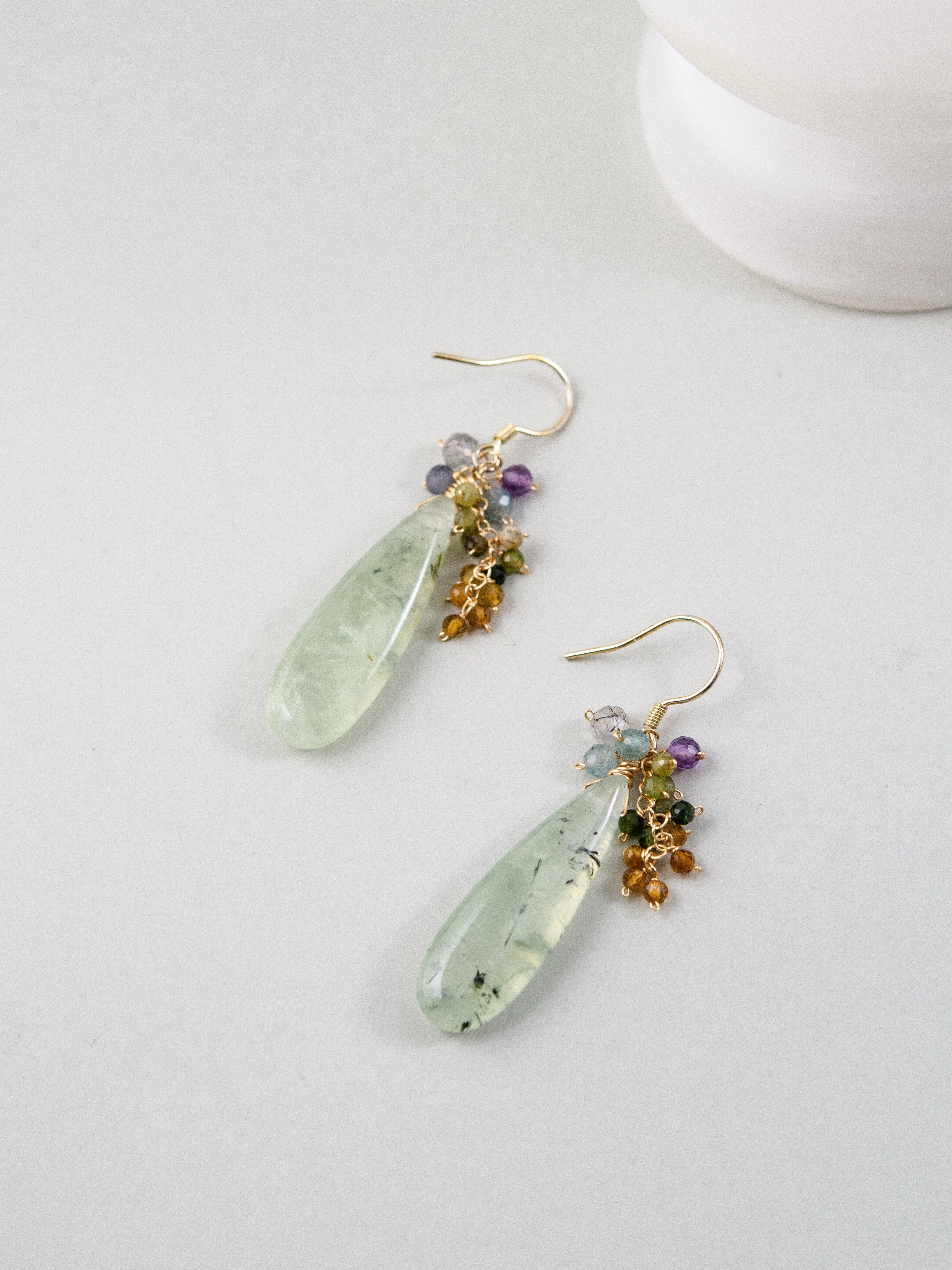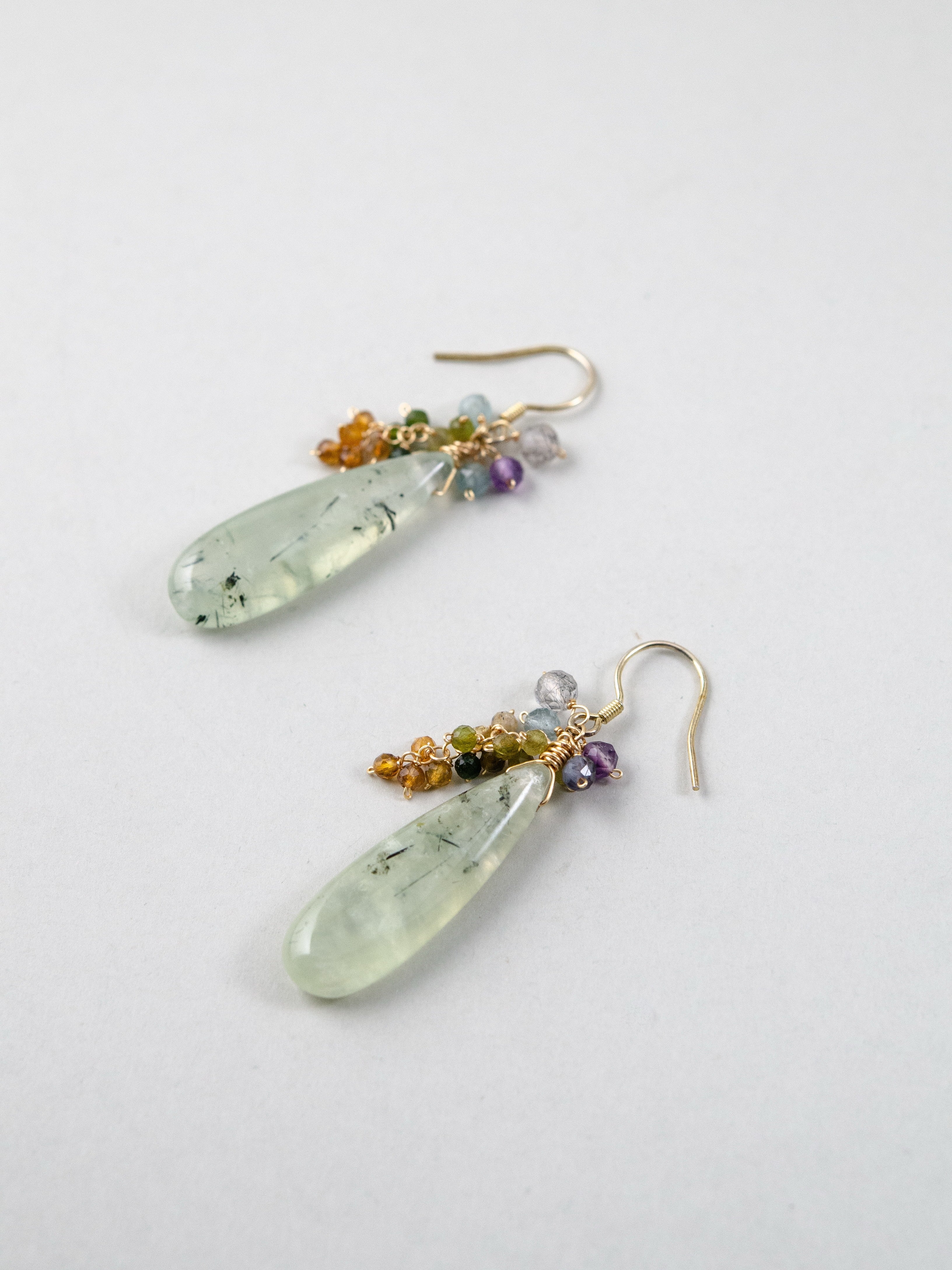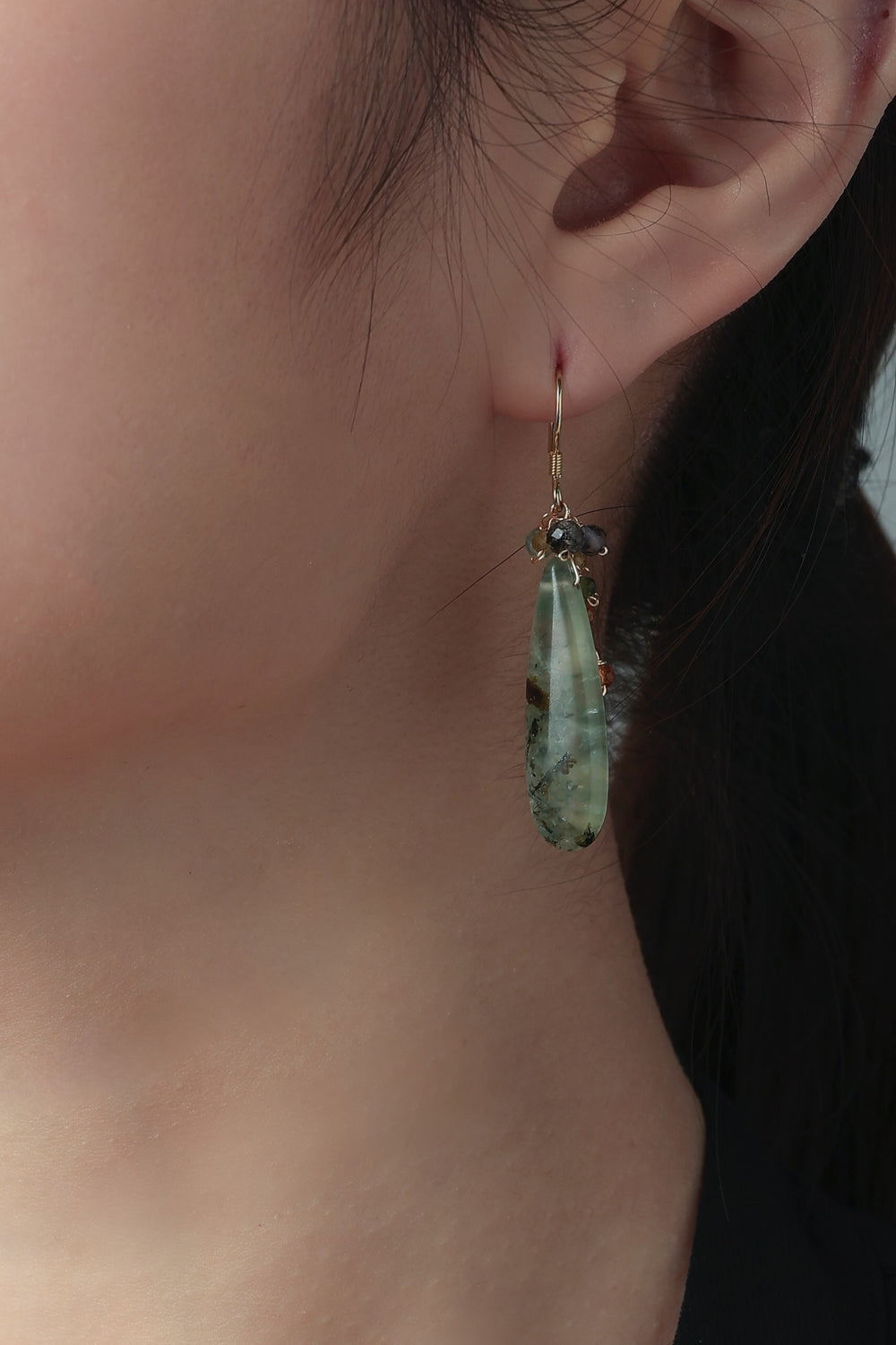 みずみずしい艶を持つプレナイトを主役に、マルチカラーのトルマリンを添えたナチュラルで洗練された印象のピアスです。しずく型の天然石が耳元で上品に揺れ、透明感と優しさを演出します。しずく型の艶やかなカットが自然な存在感を与え、ナチュラルでフェミニン、個性派スタイルにも寄り添う、大人の耳元にぴったりの一点です。