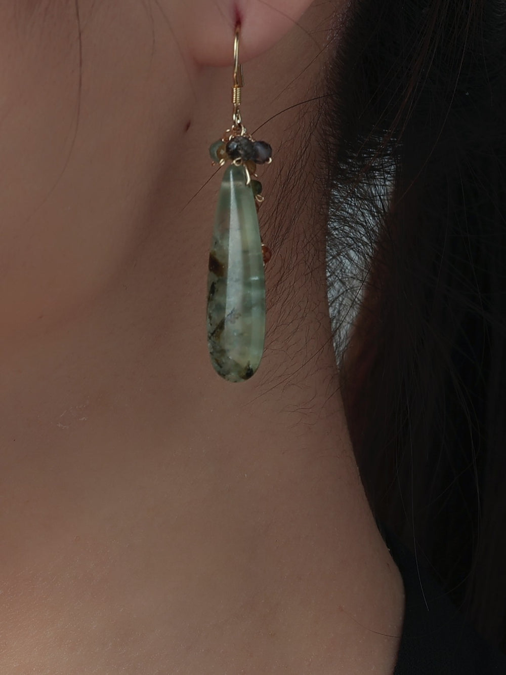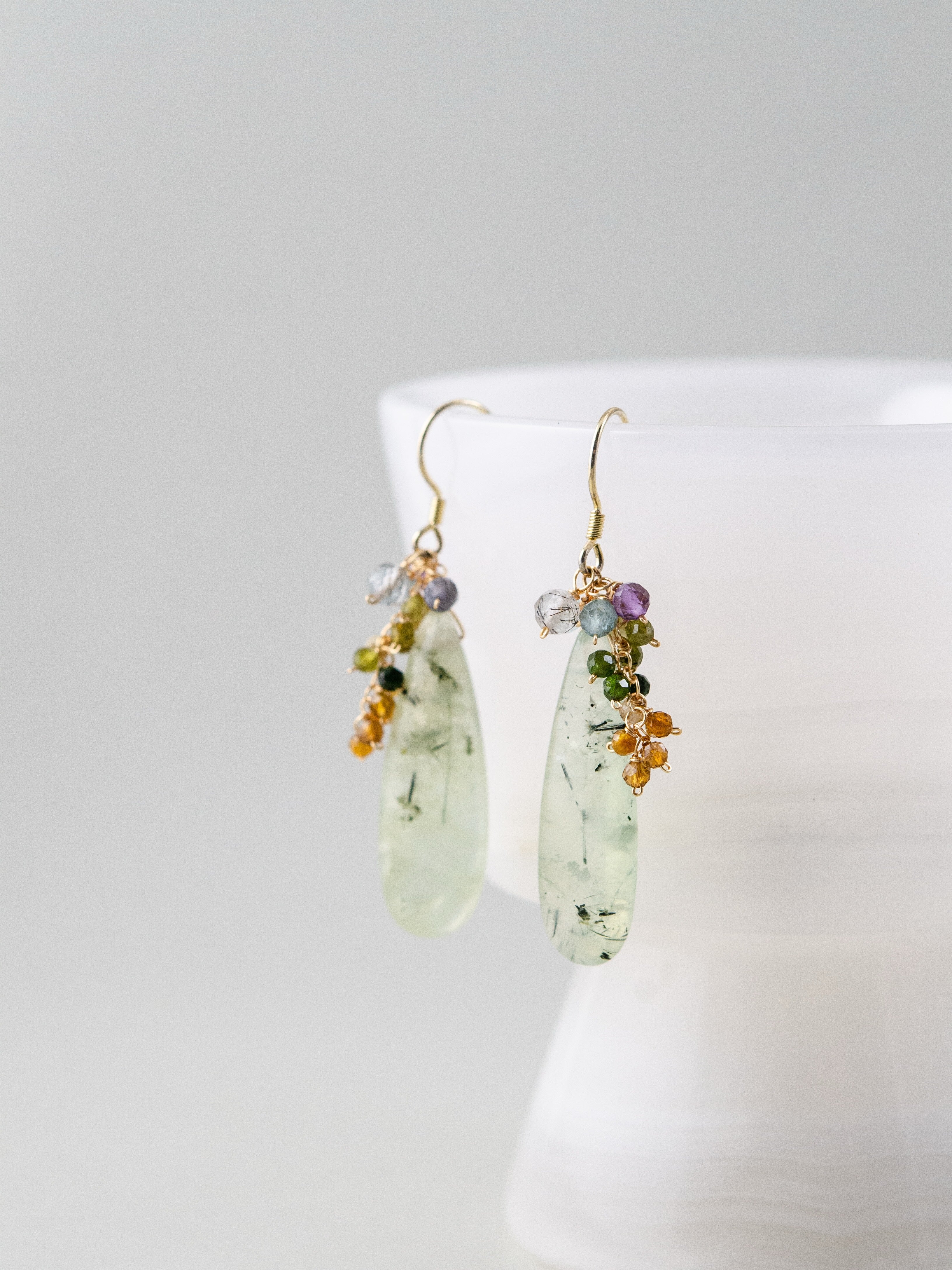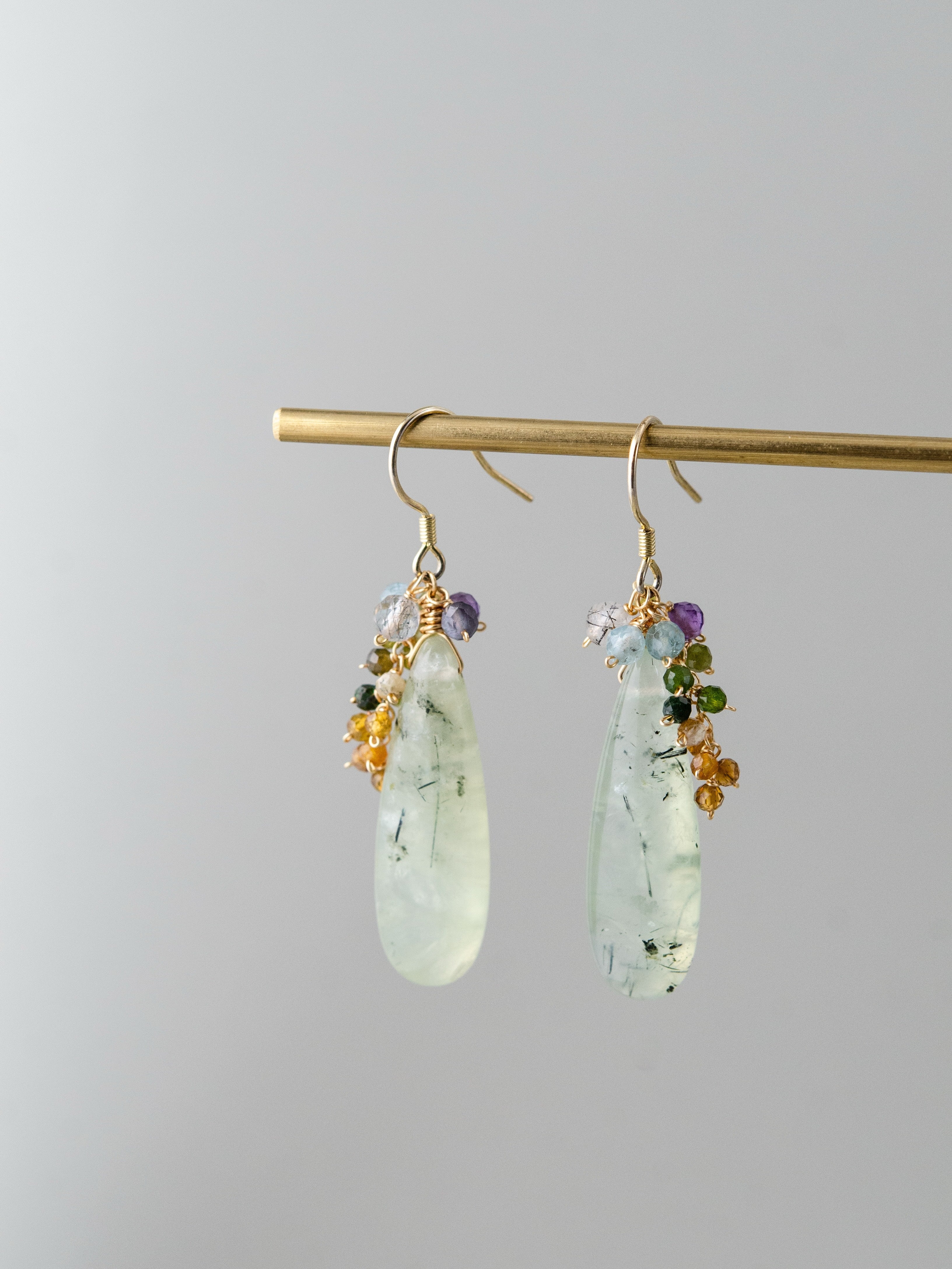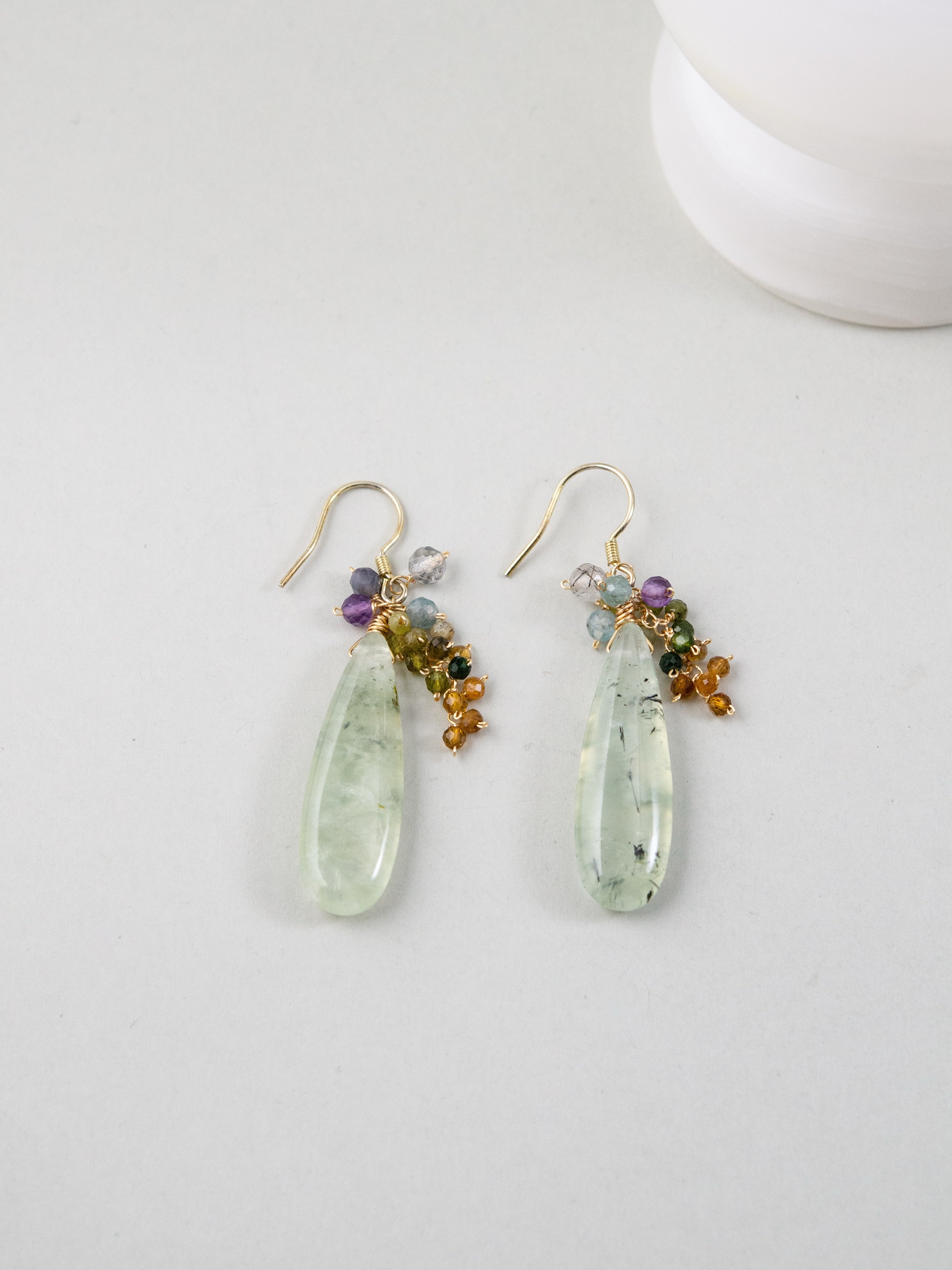 みずみずしい艶を持つプレナイトを主役に、マルチカラーのトルマリンを添えたナチュラルで洗練された印象のピアスです。しずく型の天然石が耳元で上品に揺れ、透明感と優しさを演出します。しずく型の艶やかなカットが自然な存在感を与え、ナチュラルでフェミニン、個性派スタイルにも寄り添う、大人の耳元にぴったりの一点です。