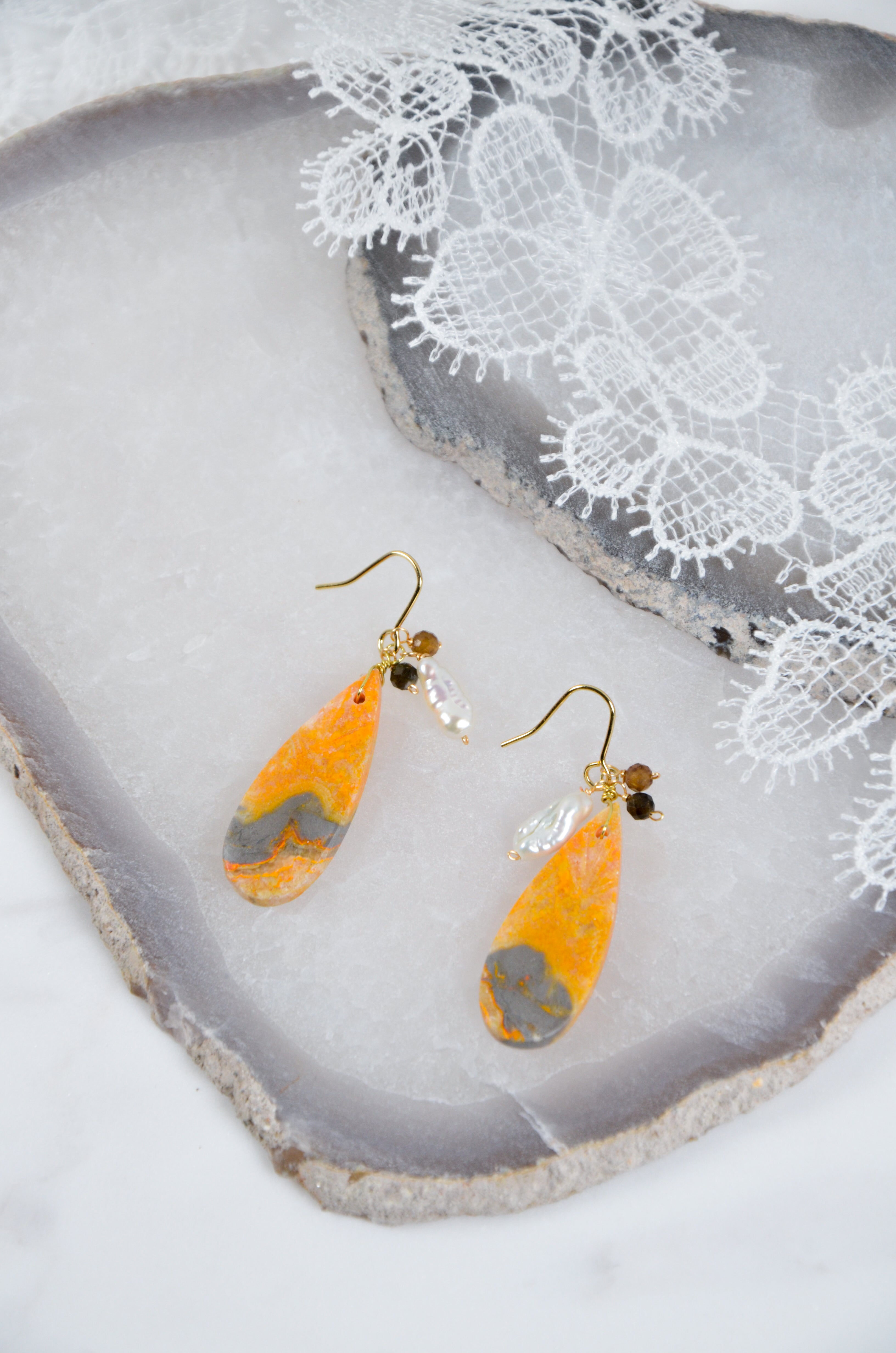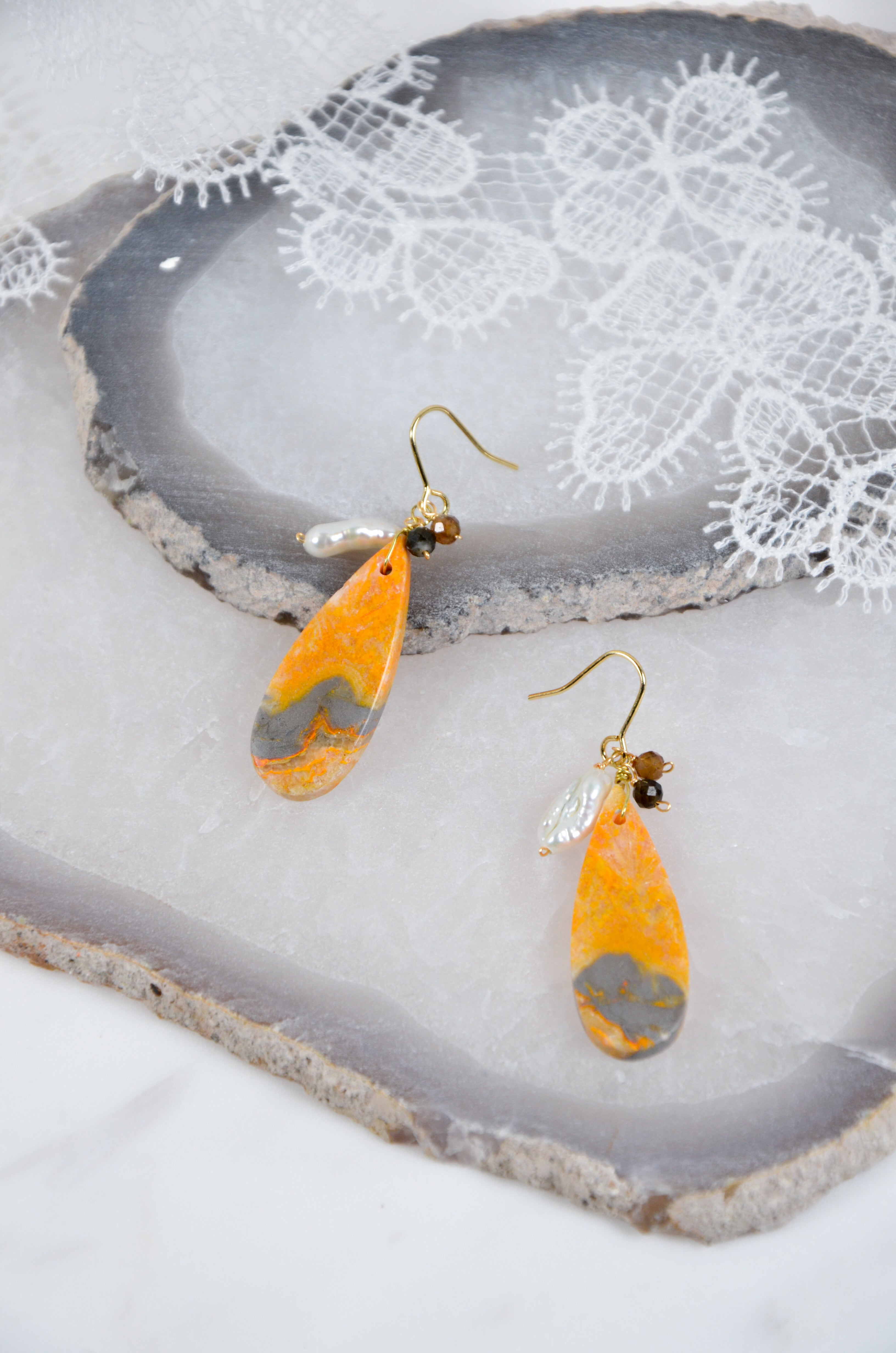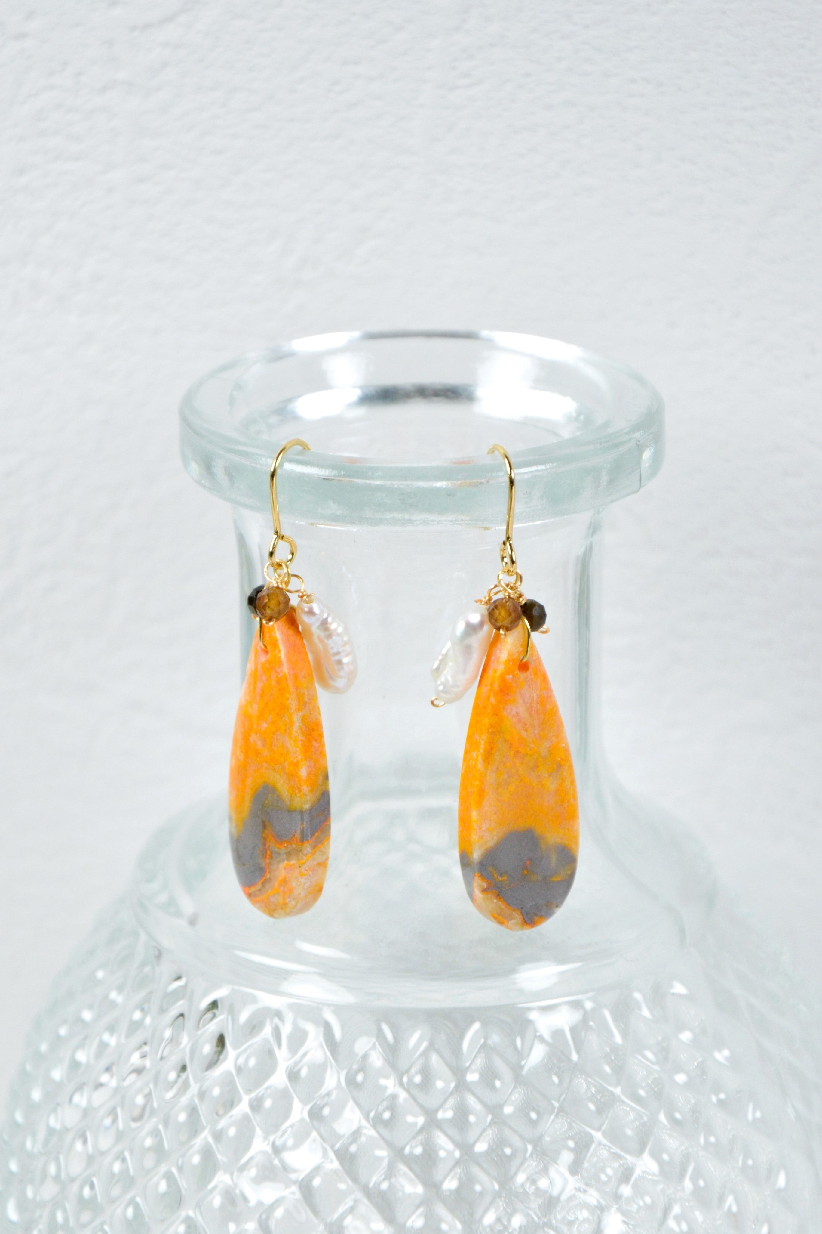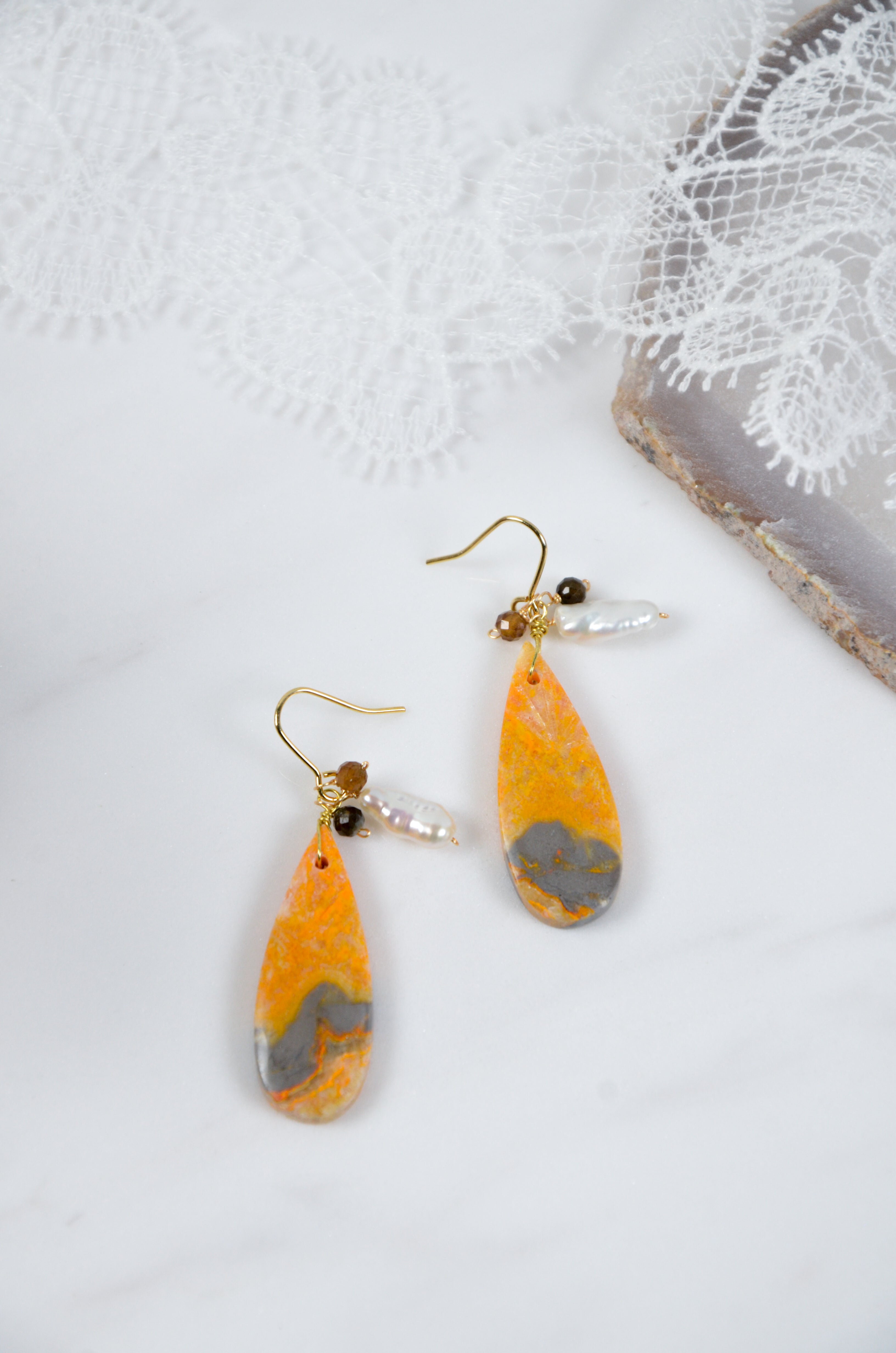 ビビッドなオレンジカラーに、グレーの模様が美しく重なる天然カルサイトを主役にした一点物ピアス。まるで夕暮れの大地を切り取ったかのような、アートピースのような存在感を放ち、個性的でありながら上品さも感じられる、大人のためのアクセサリーです。