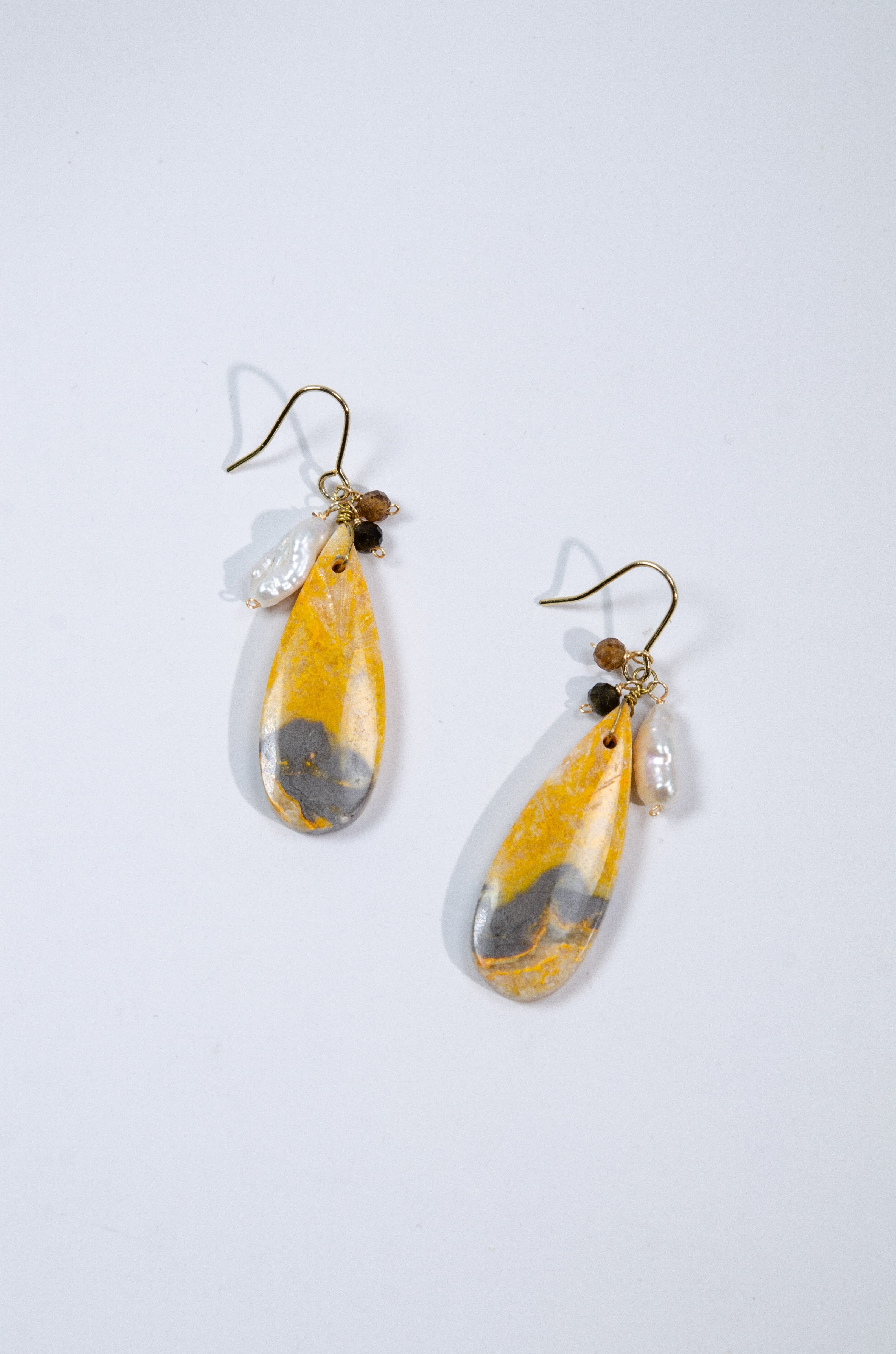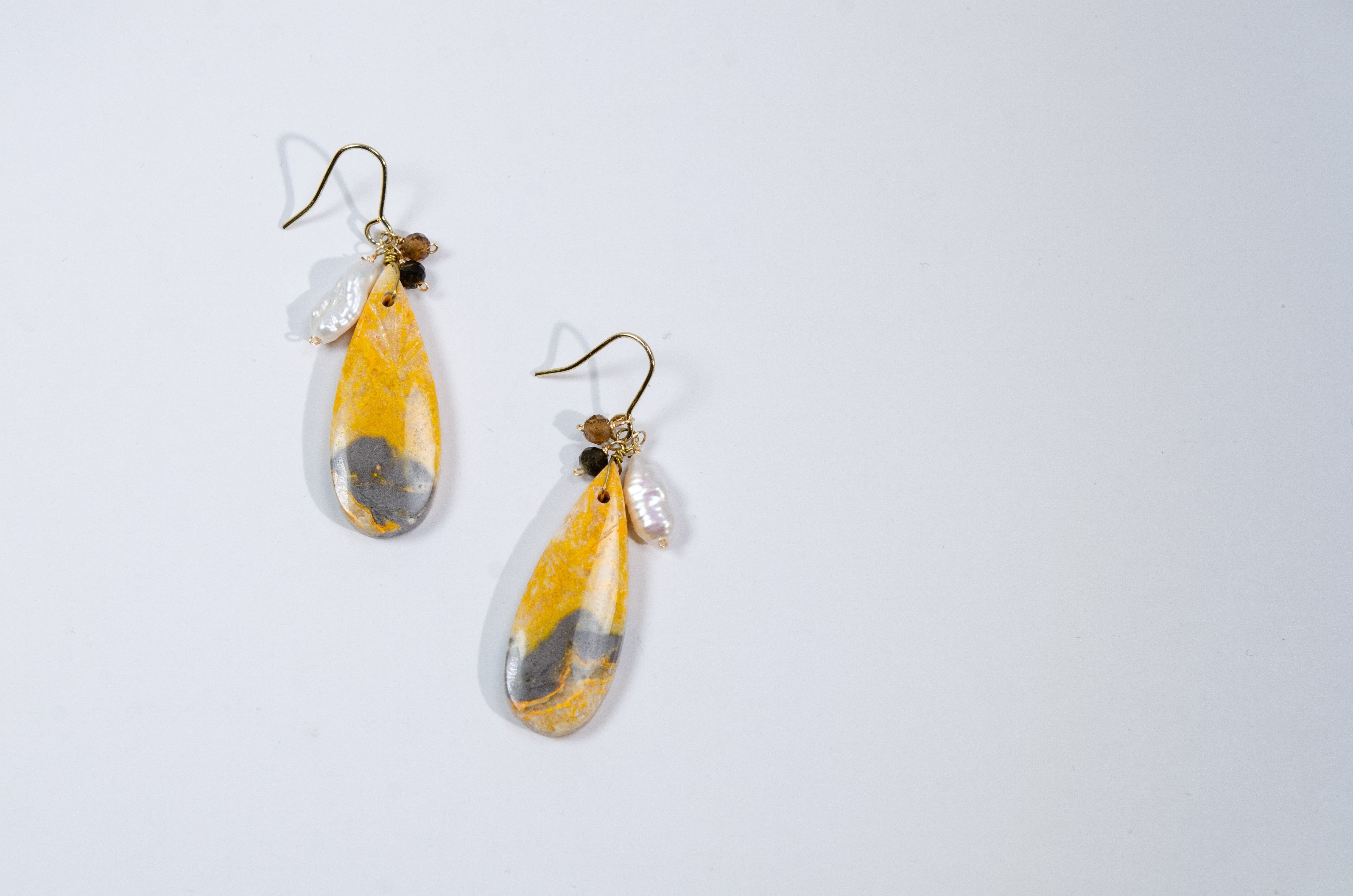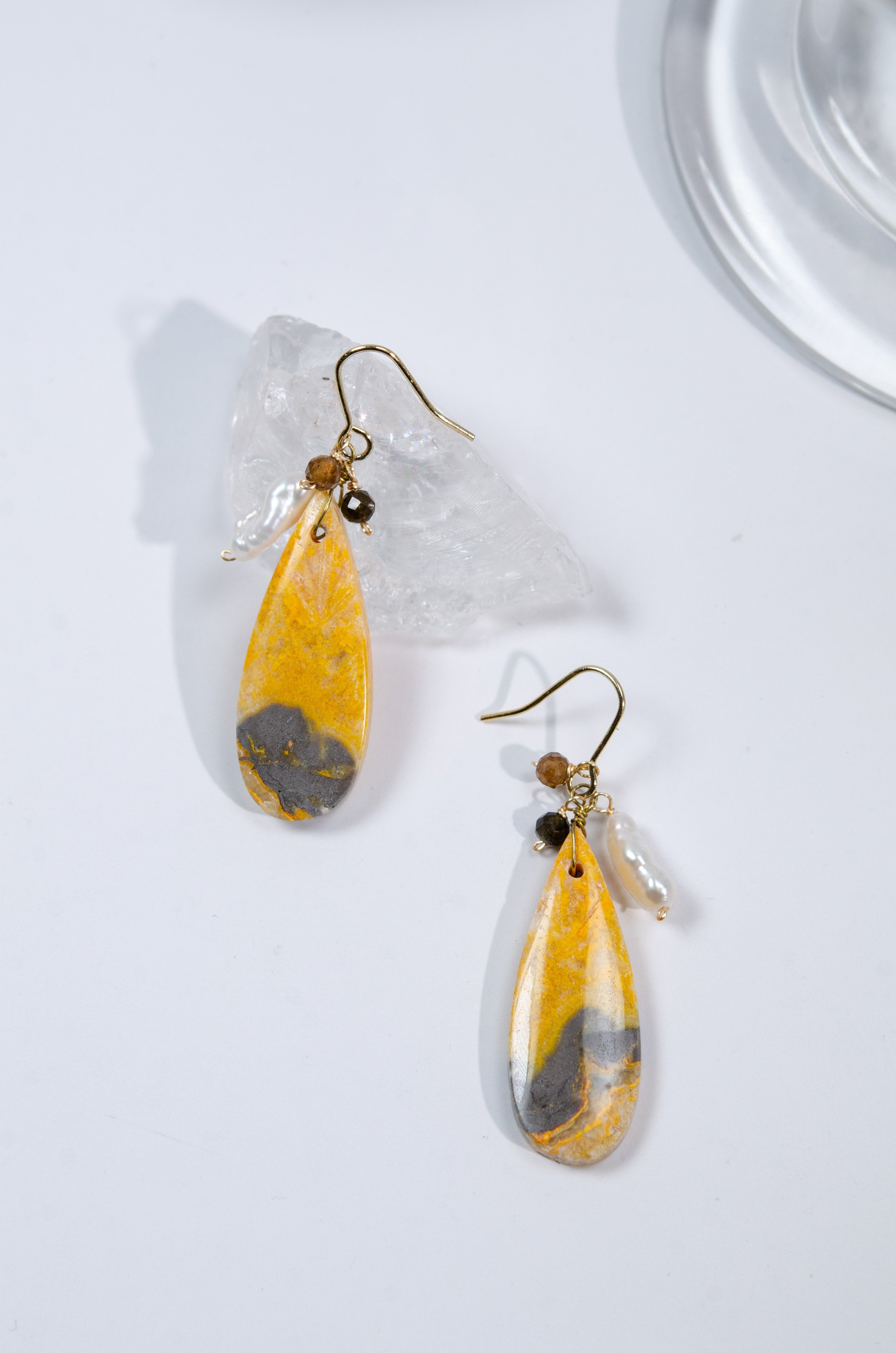 オレンジとグレーの絶妙な天然模様が魅力のカルサイトを使用。淡水パールとスモーキークォーツを組み合わせることで、柔らかな輝きと立体感をプラス。温かみのあるカラーは秋冬の装いにもぴったりで、顔まわりにさりげない華やかさを添えます。