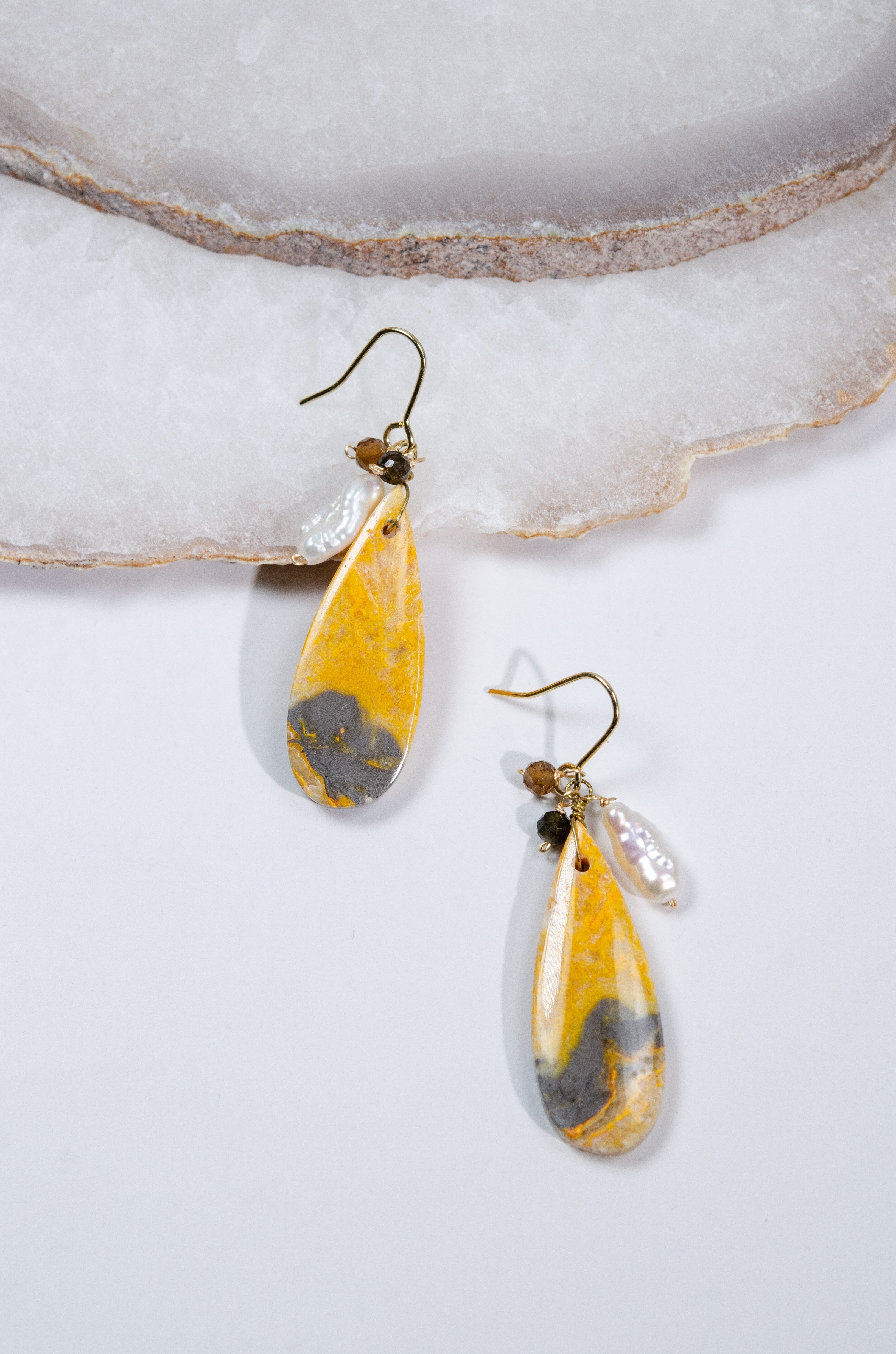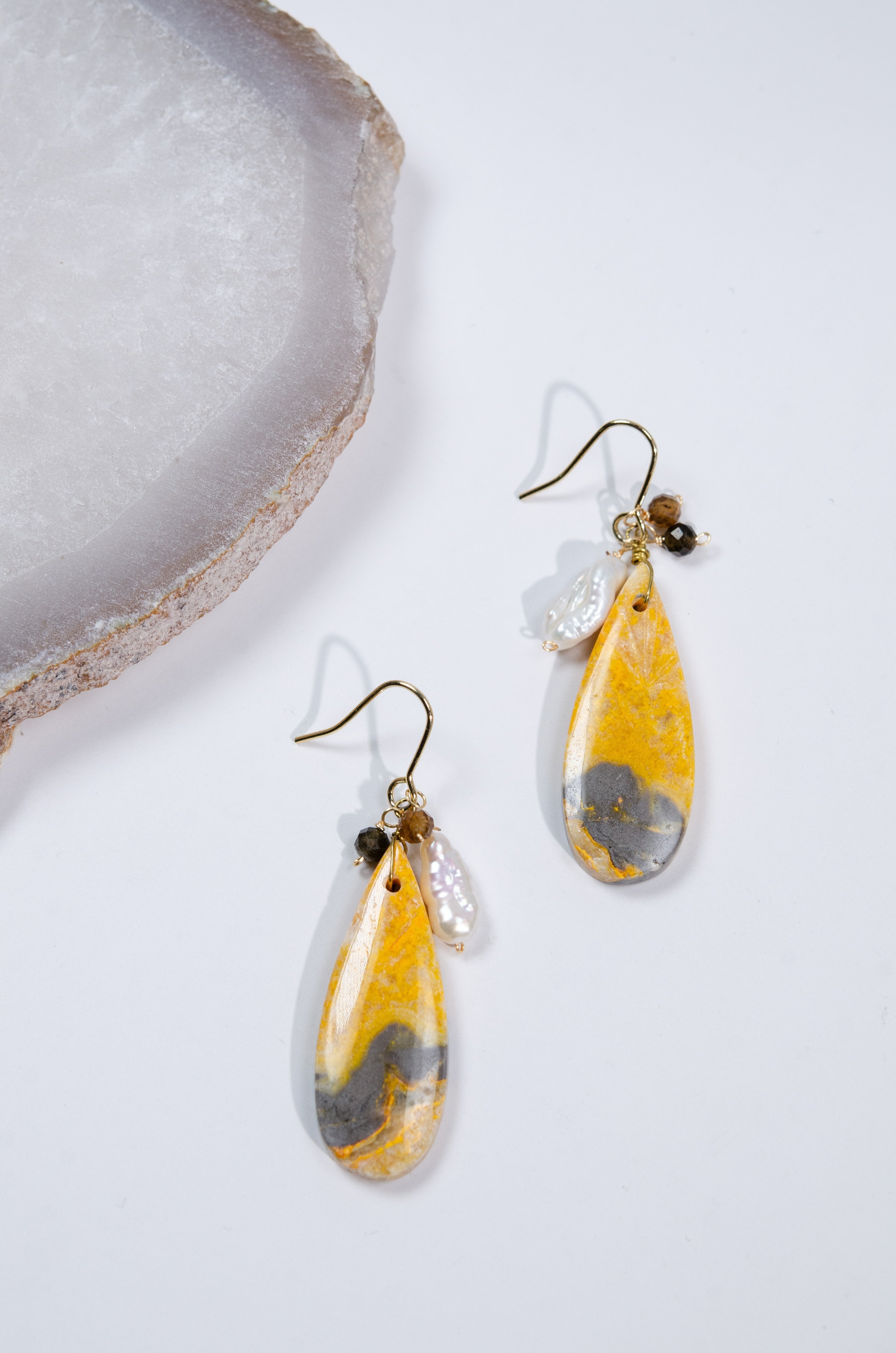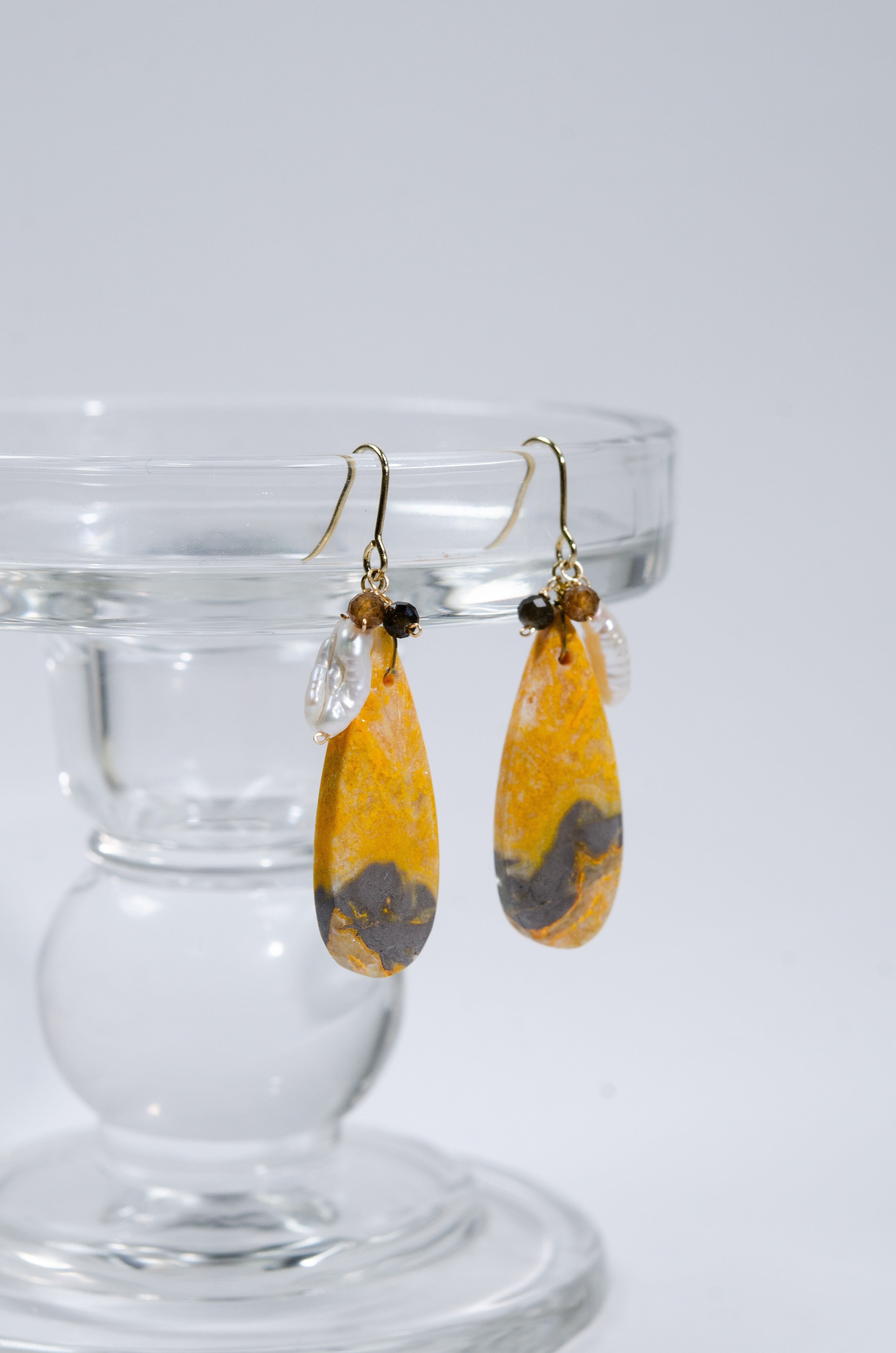 オレンジとグレーの絶妙な天然模様が魅力のカルサイトを使用。淡水パールとスモーキークォーツを組み合わせることで、柔らかな輝きと立体感をプラス。温かみのあるカラーは秋冬の装いにもぴったりで、顔まわりにさりげない華やかさを添えます。