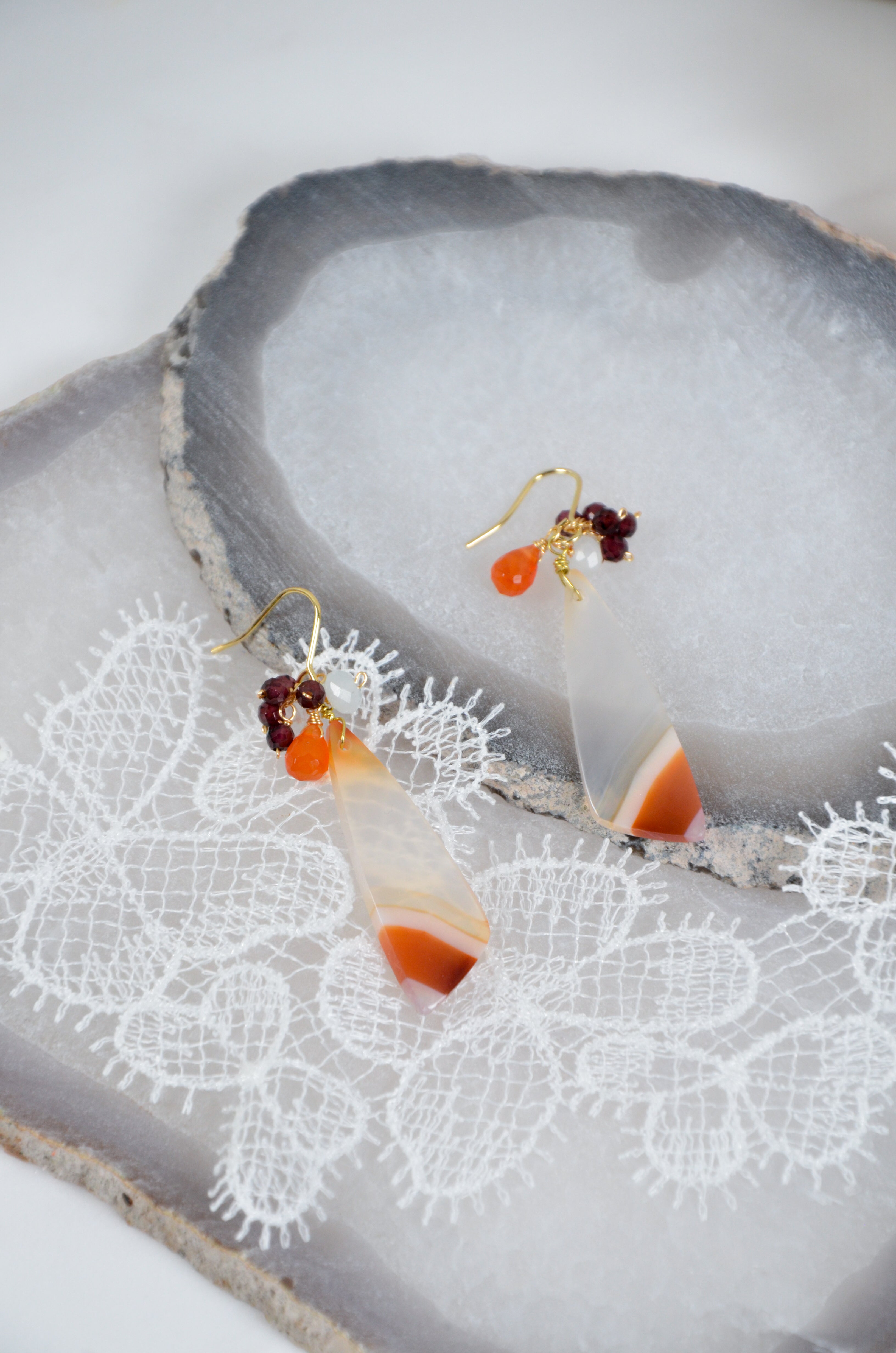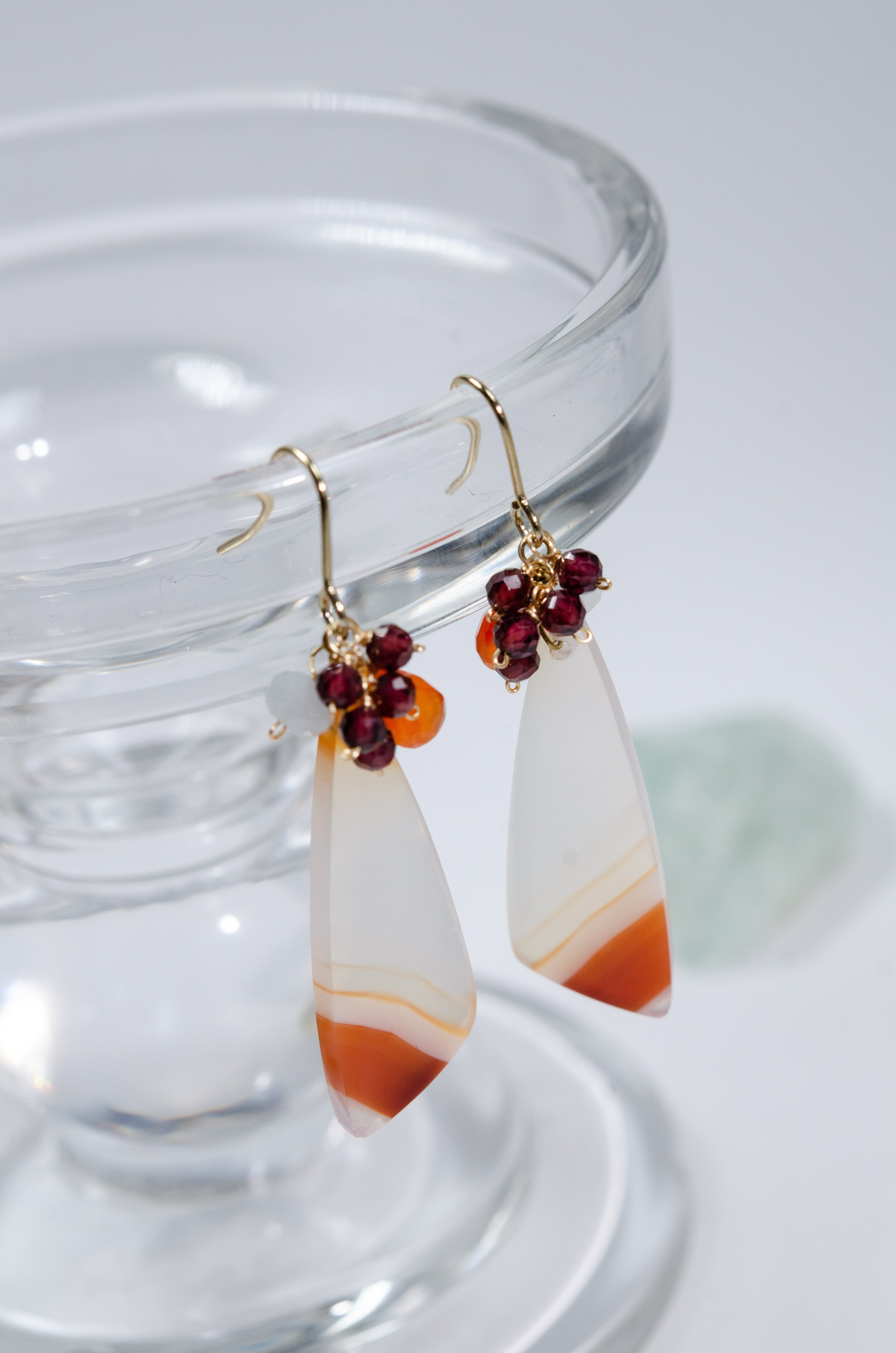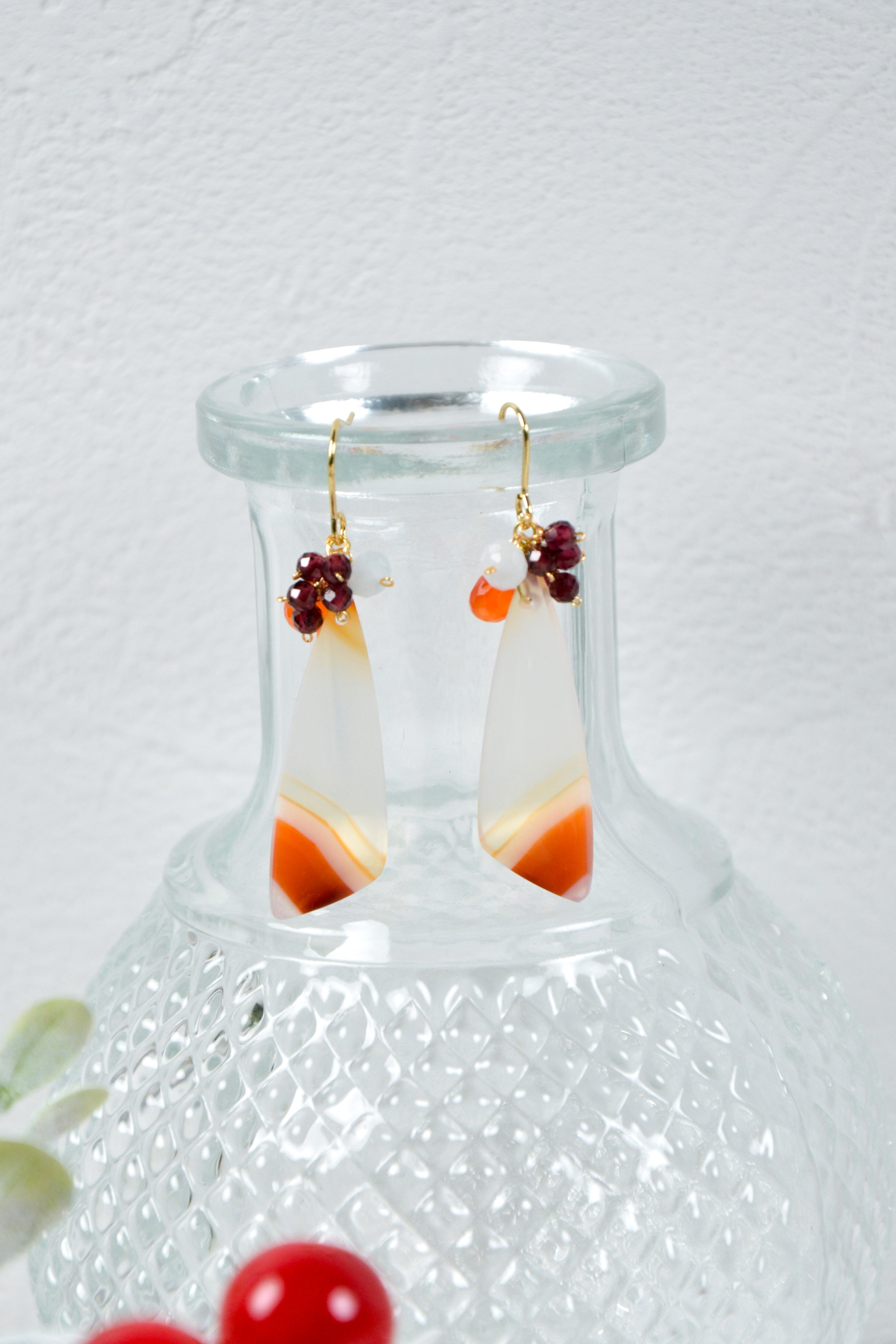 滑らかな質感とナチュラルな模様が魅力のオレンジ系アゲート(瑪瑙)を主役に、深い赤色のガーネットとミルキーなホワイトストーンを組み合わせたピアス。まるで果実をイメージしたような瑞々しさと温もりが耳元を優しく彩ります。天然アゲートの独特な縞模様と美しい艶感が、上品で華やかな印象を演出します。