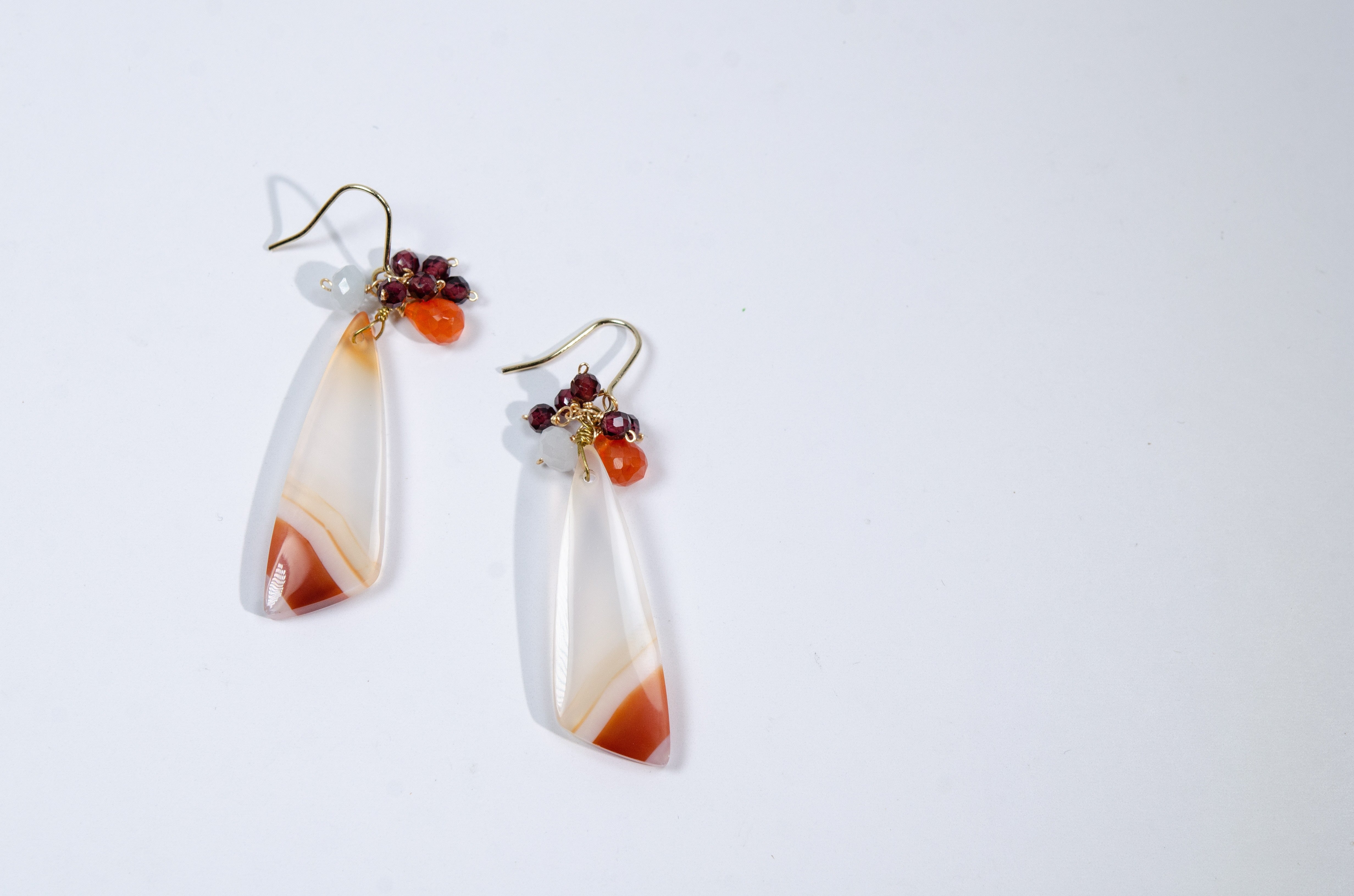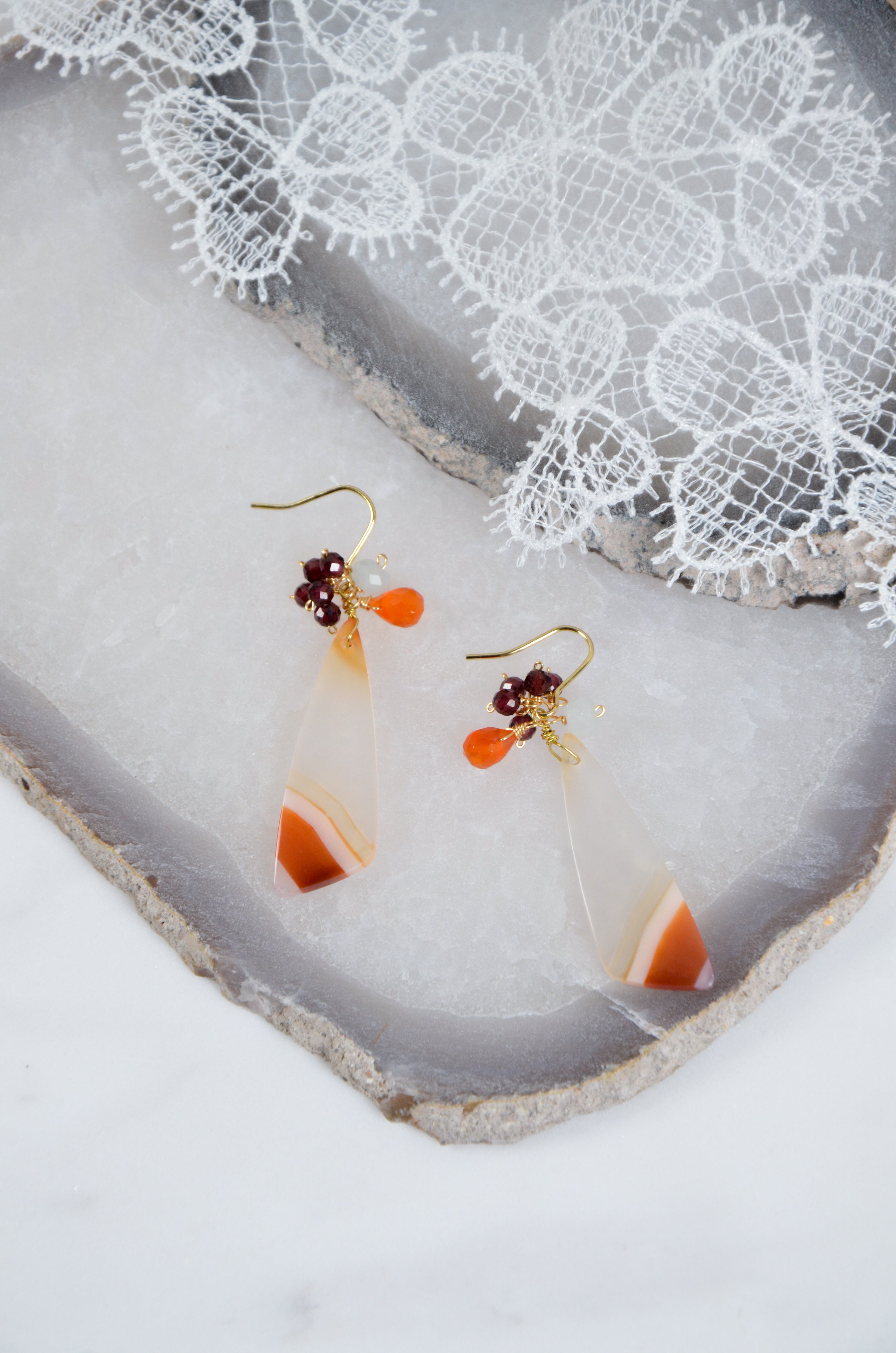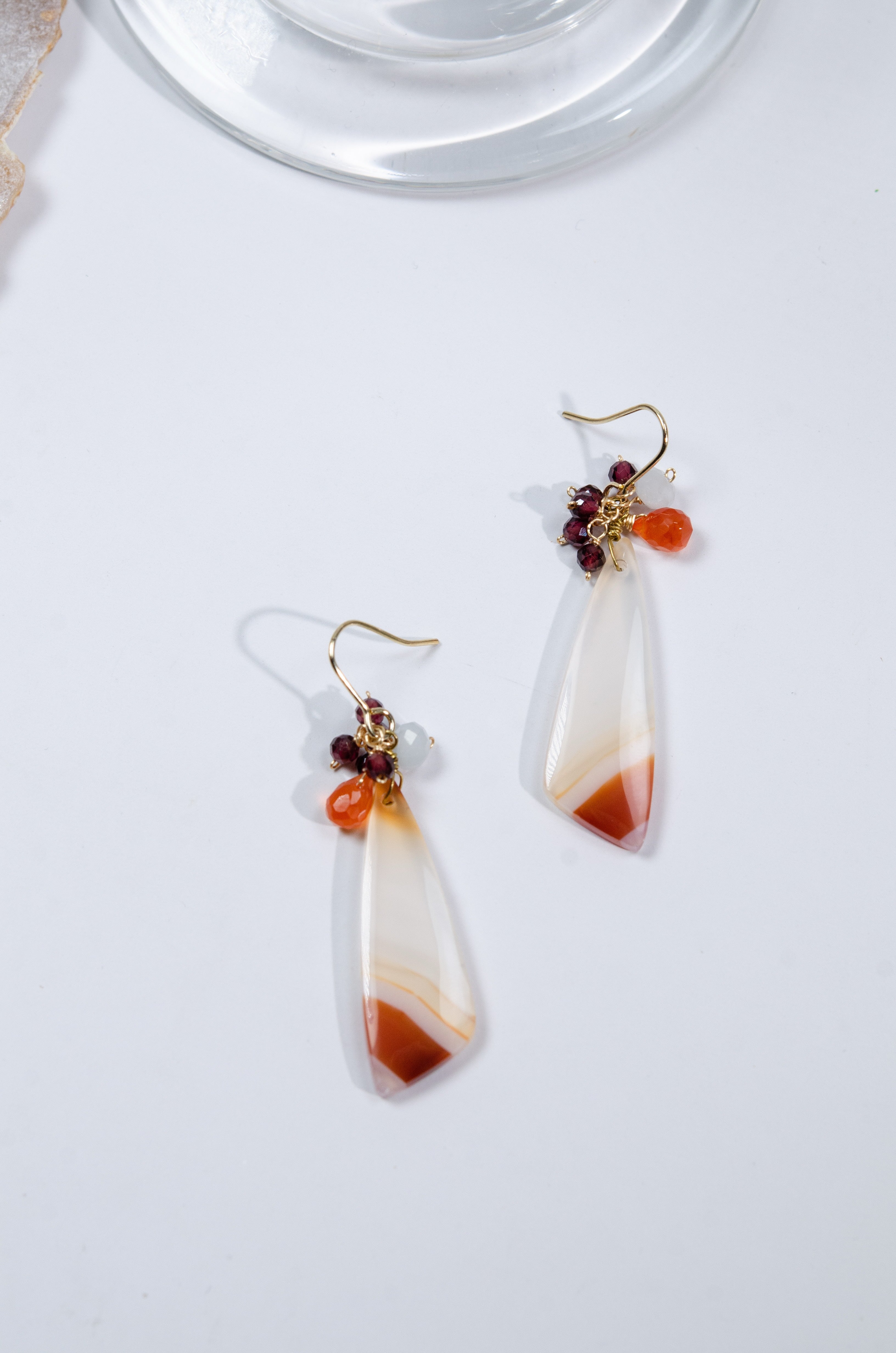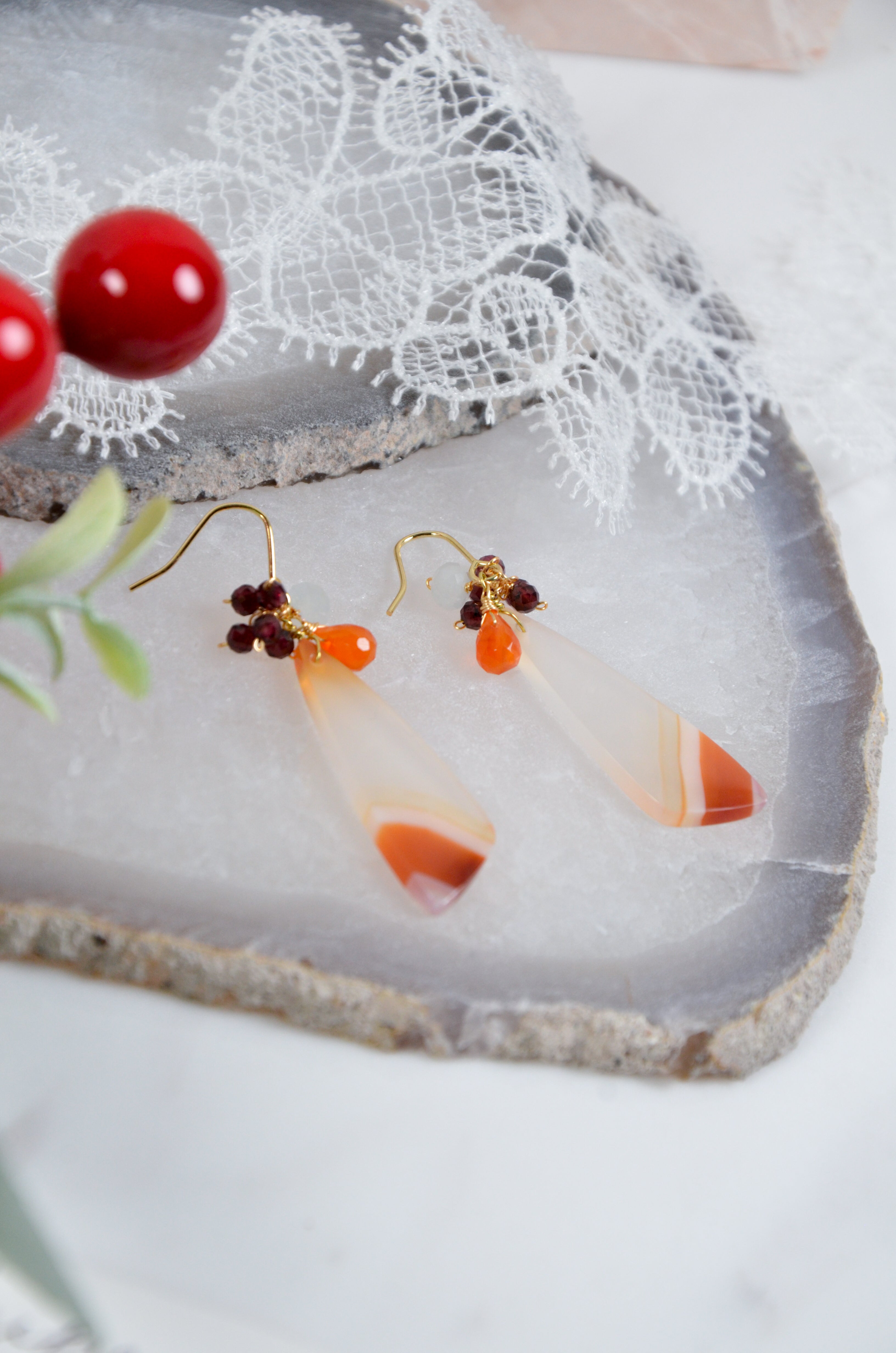 滑らかな質感とナチュラルな模様が魅力のオレンジ系アゲート(瑪瑙)を主役に、深い赤色のガーネットとミルキーなホワイトストーンを組み合わせたピアス。まるで果実をイメージしたような瑞々しさと温もりが耳元を優しく彩ります。天然アゲートの独特な縞模様と美しい艶感が、上品で華やかな印象を演出します。