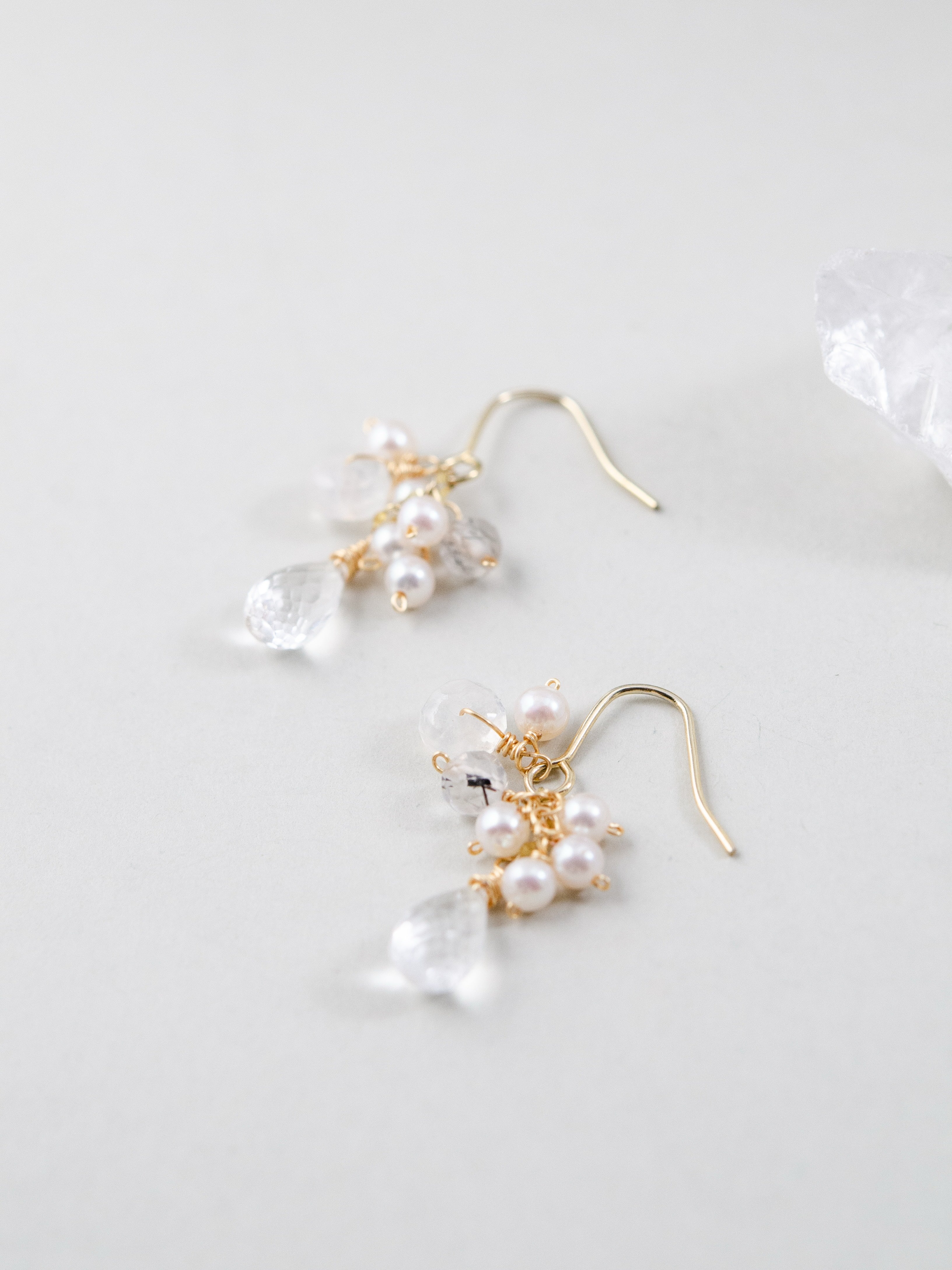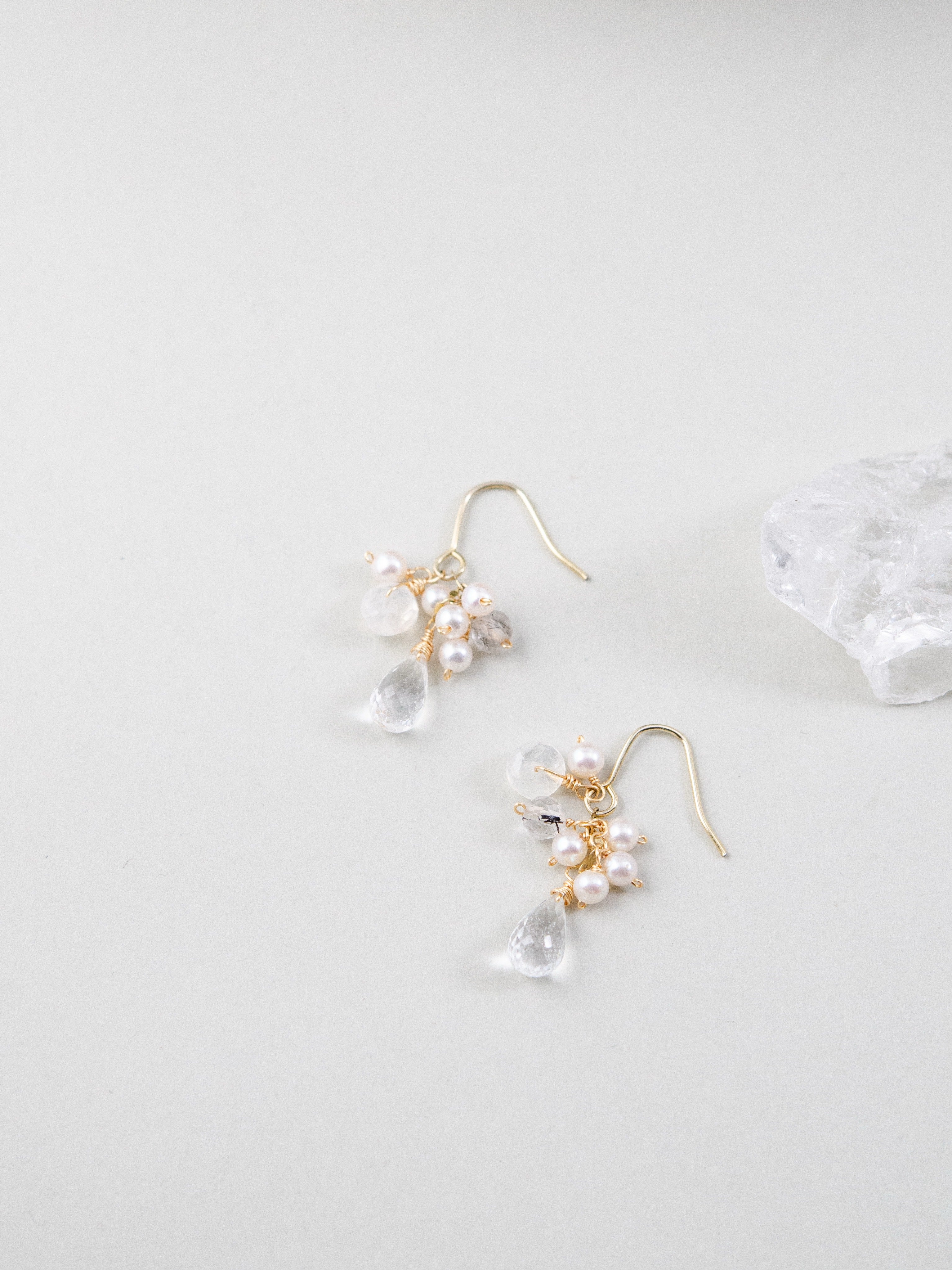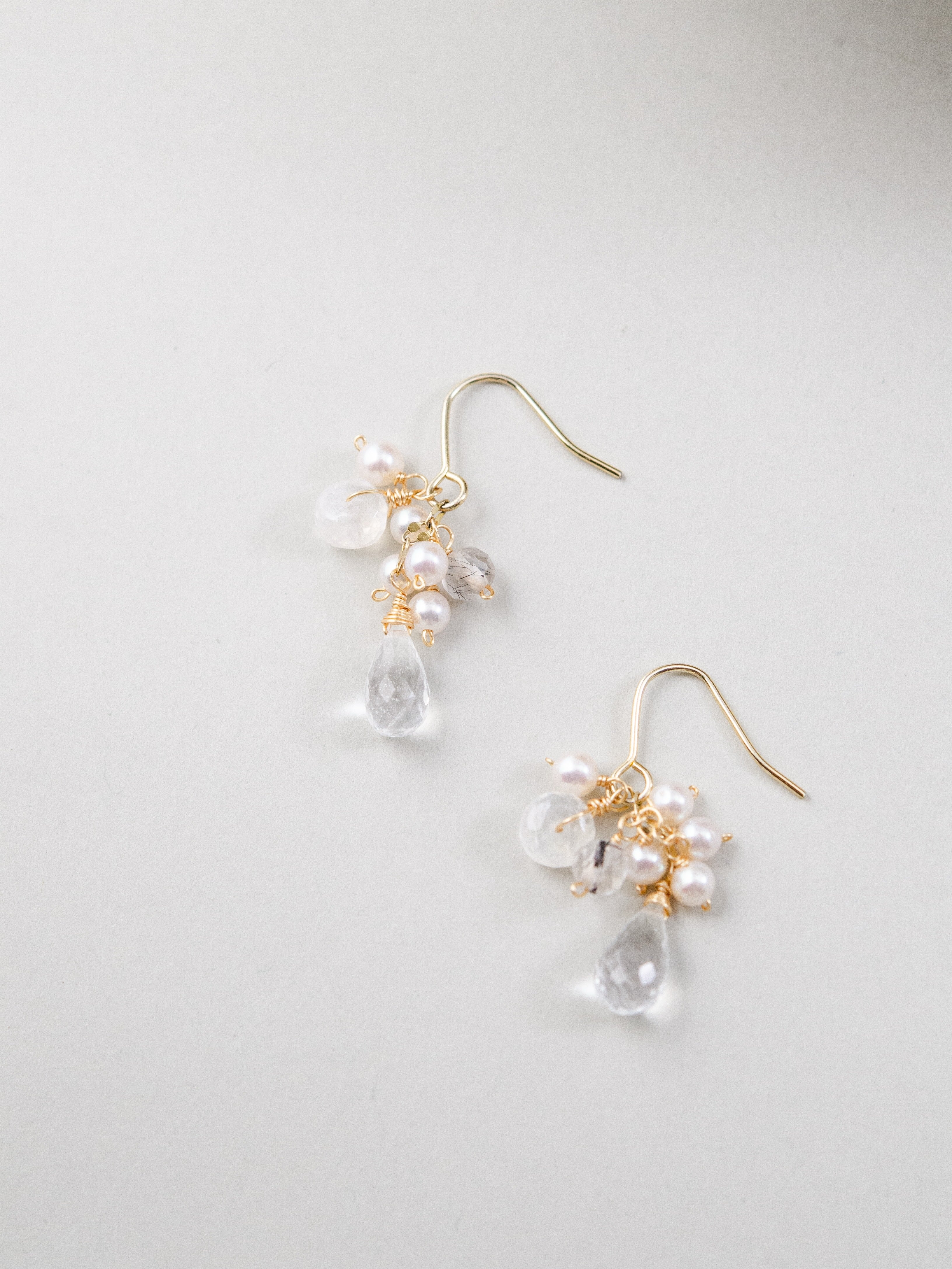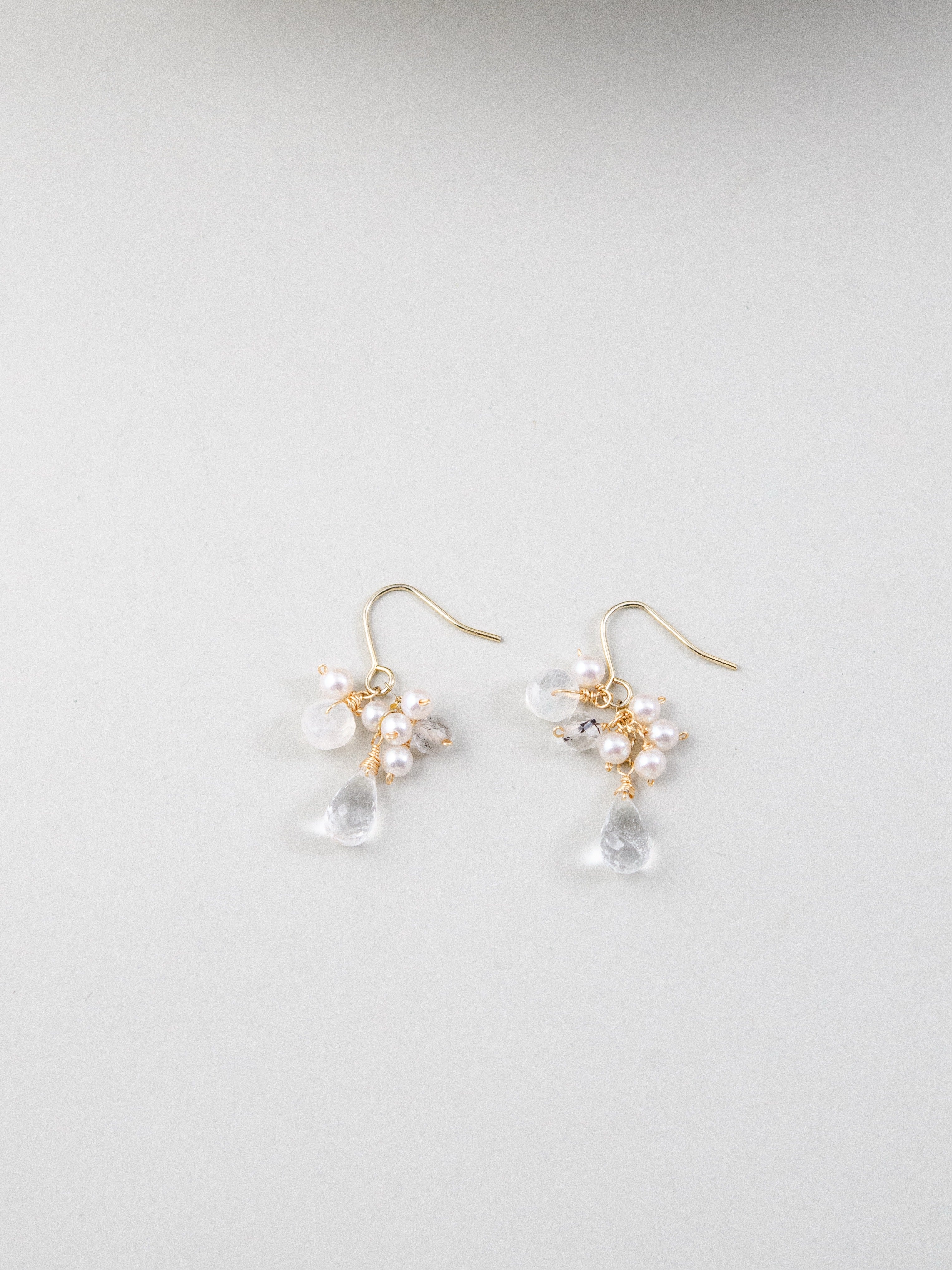透明感のあるクリスタルドロップを主役に、小粒のパールと天然石をあしらった、繊細で可憐な印象のピアスです。柔らかな光沢と澄んだ輝きが重なり合い、耳元に清らかで上品な雰囲気を添えます。特別な日にも、日常のさりげないおしゃれにも寄り添う、やさしい存在感が魅力のデザインです。