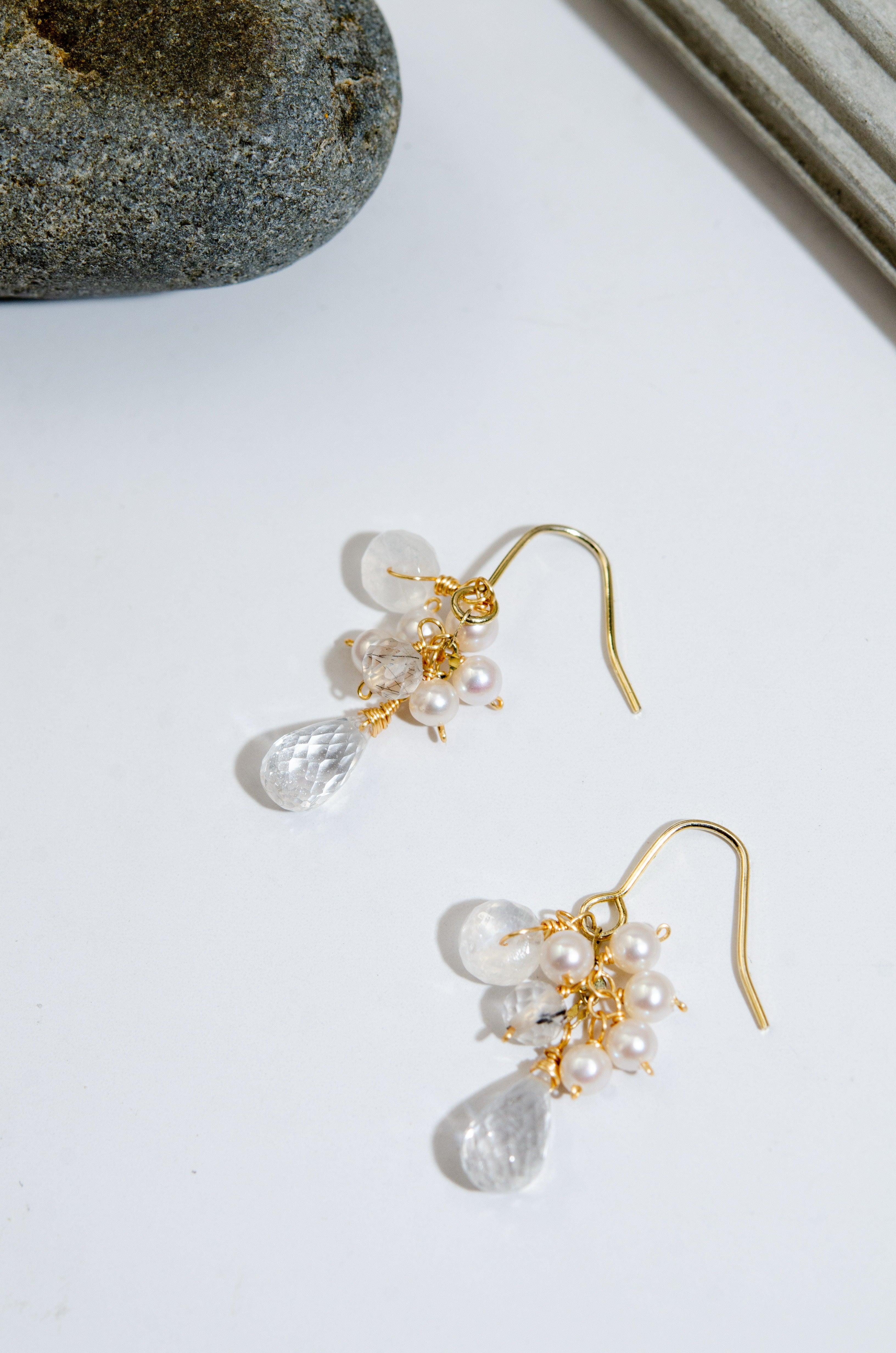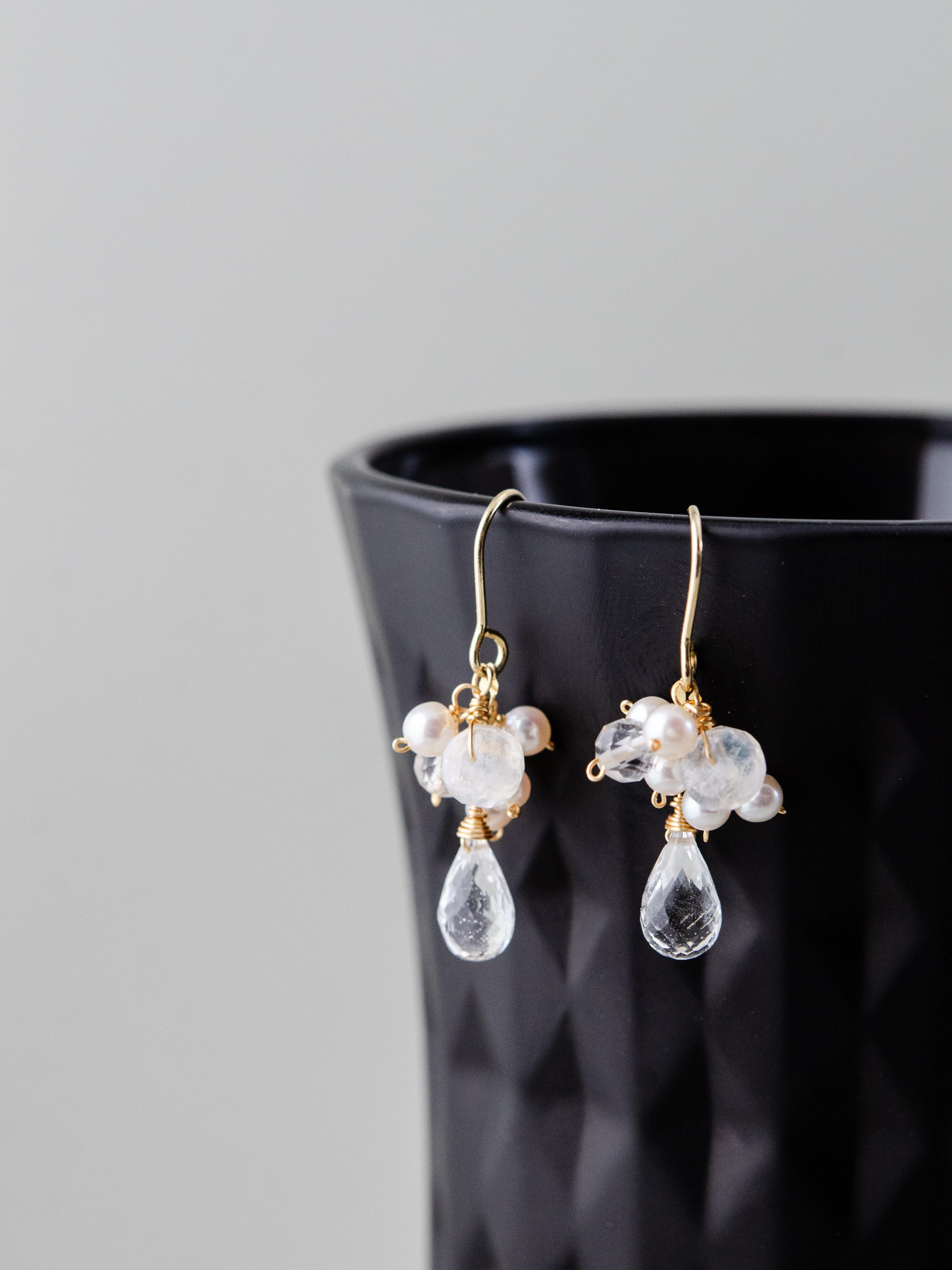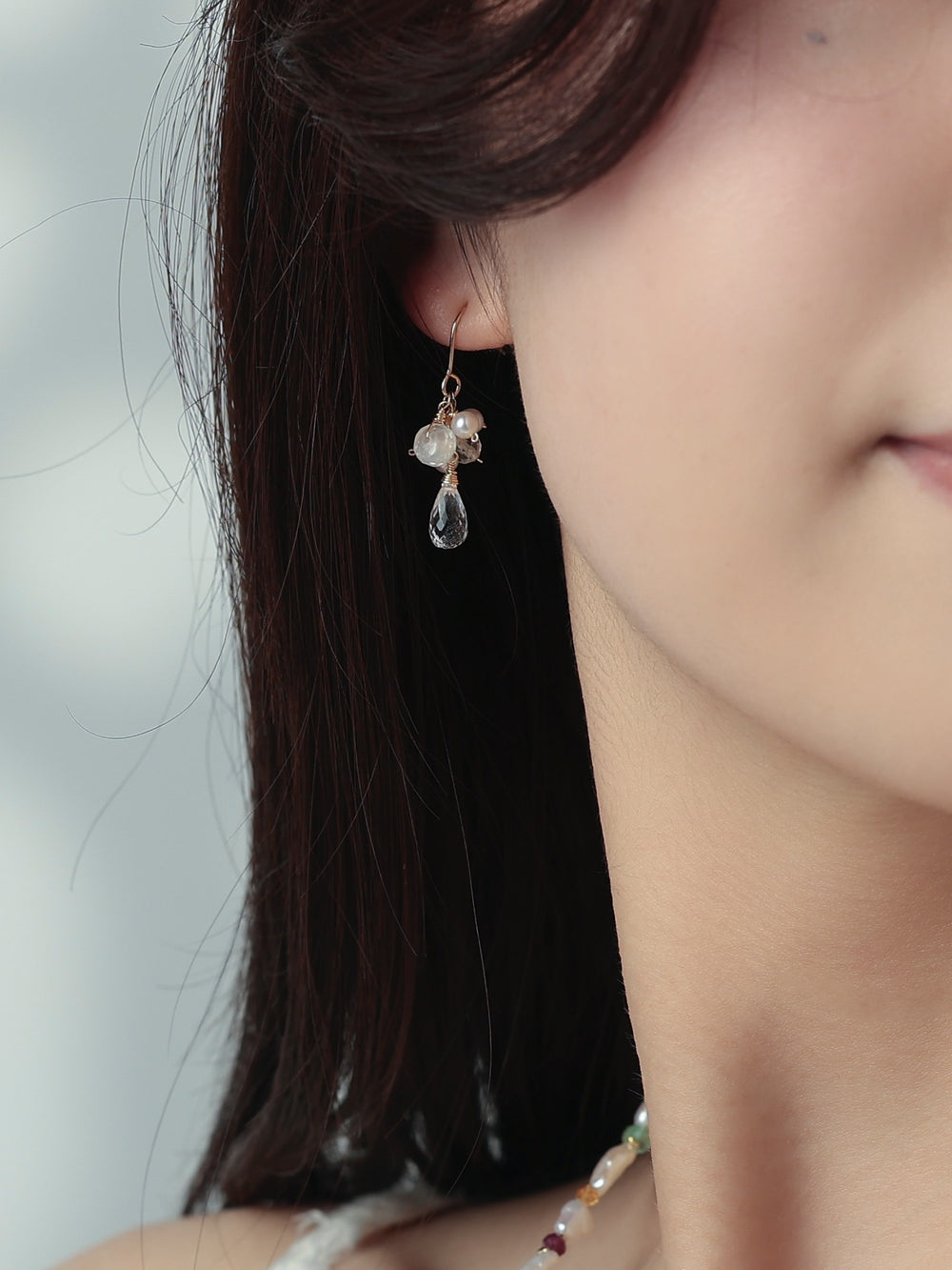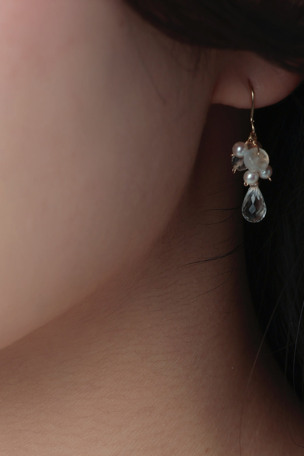 透明感のあるクリスタルドロップを主役に、小粒のパールと天然石をあしらった、繊細で可憐な印象のピアスです。柔らかな光沢と澄んだ輝きが重なり合い、耳元に清らかで上品な雰囲気を添えます。特別な日にも、日常のさりげないおしゃれにも寄り添う、やさしい存在感が魅力のデザインです。