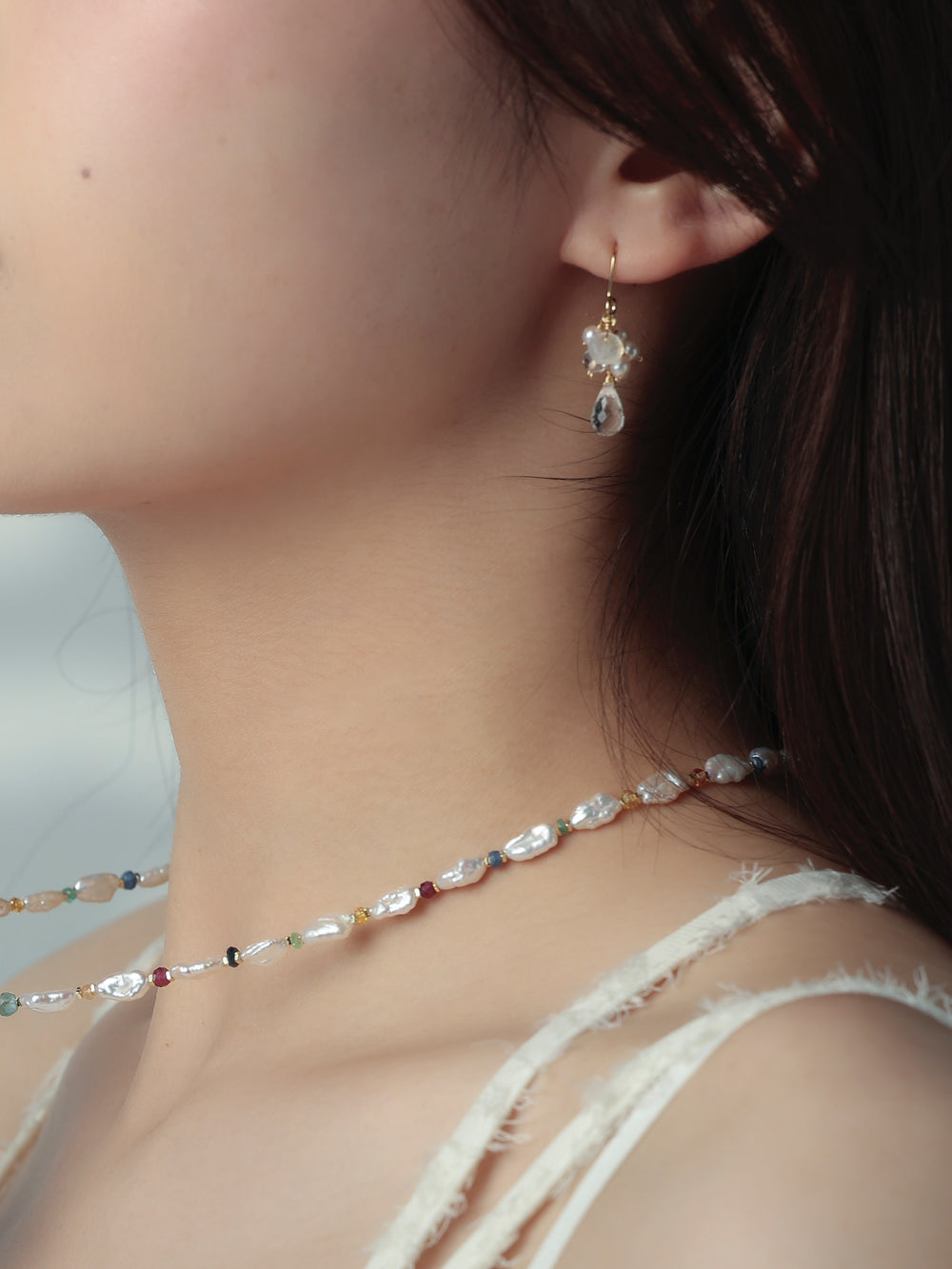 「浄化」と「愛」を象徴するクリスタルとパールを贅沢に使用し、肌なじみの良いホワイトトーンでまとめた上品な一品。滴るようなカットが光を受けて繊細にきらめき、顔まわりを明るく見せます。ブライダルや特別なギフトにもぴったりのエレガントなデザインです。