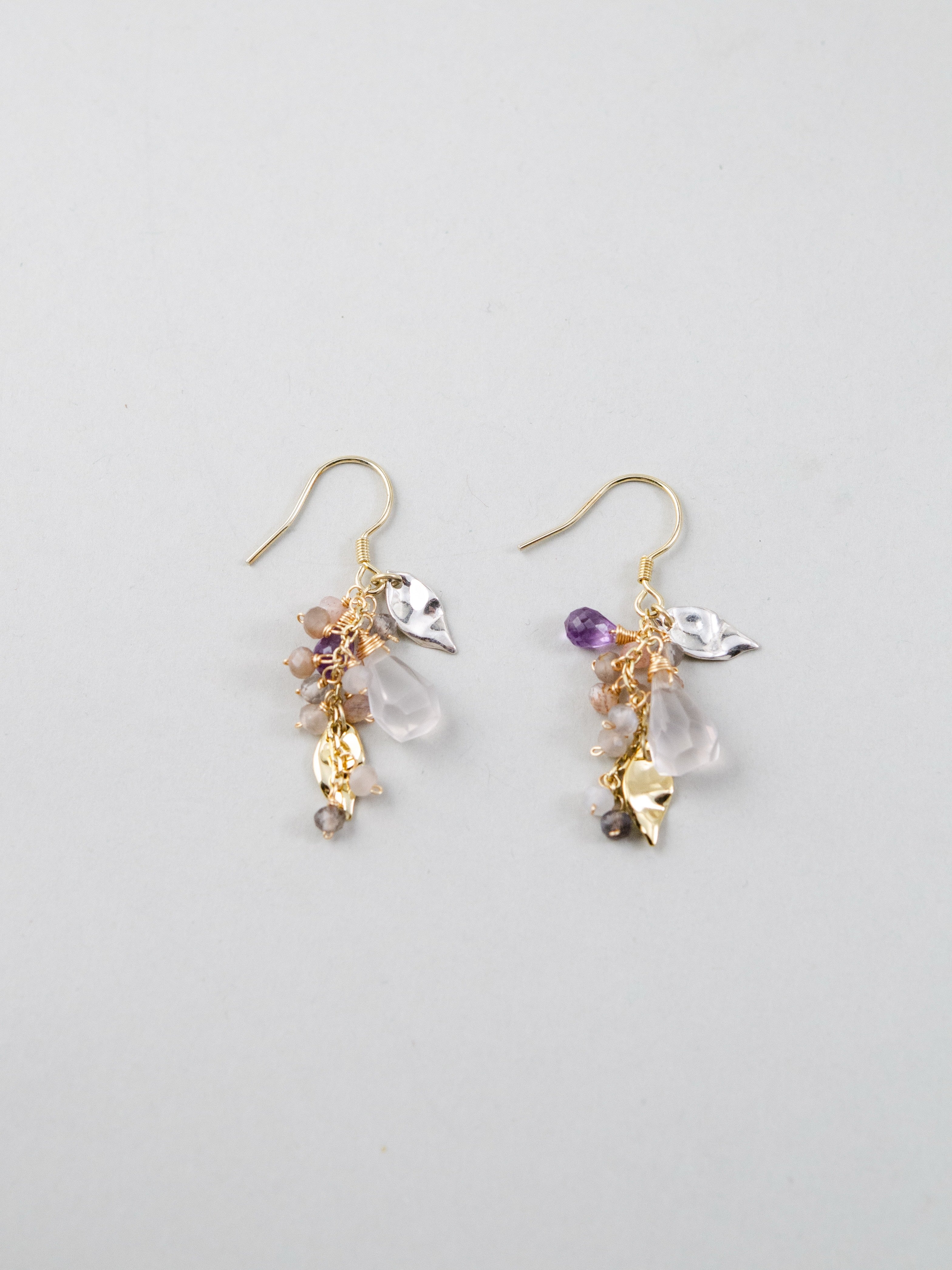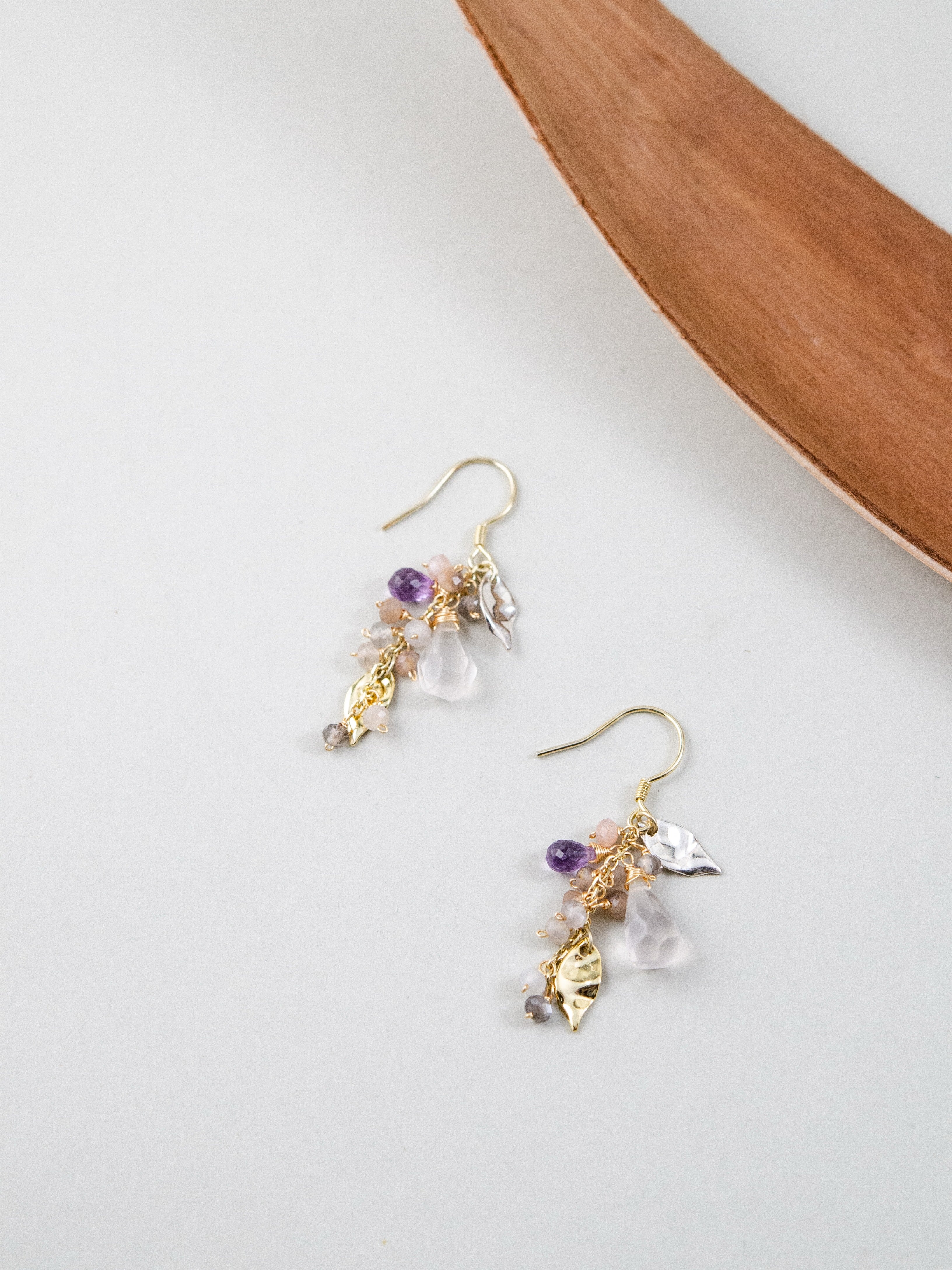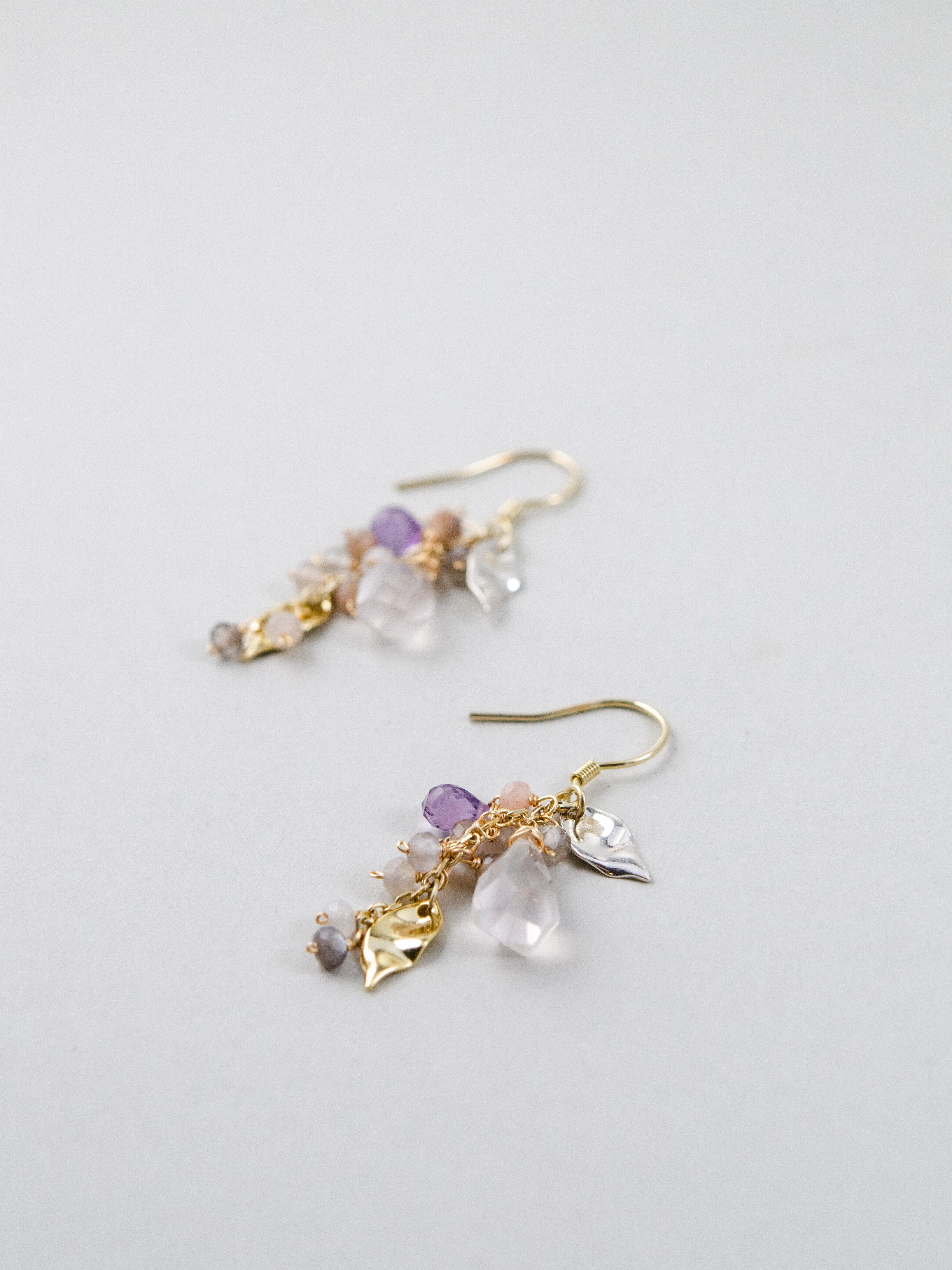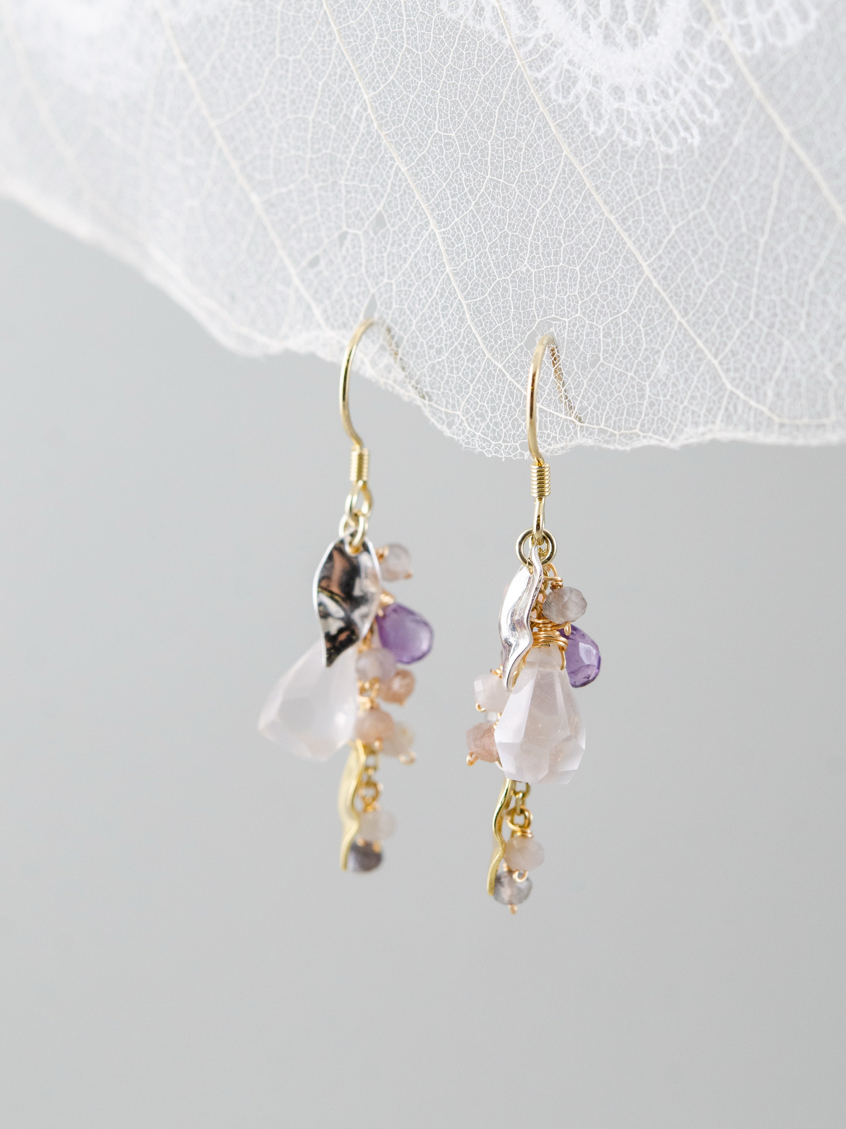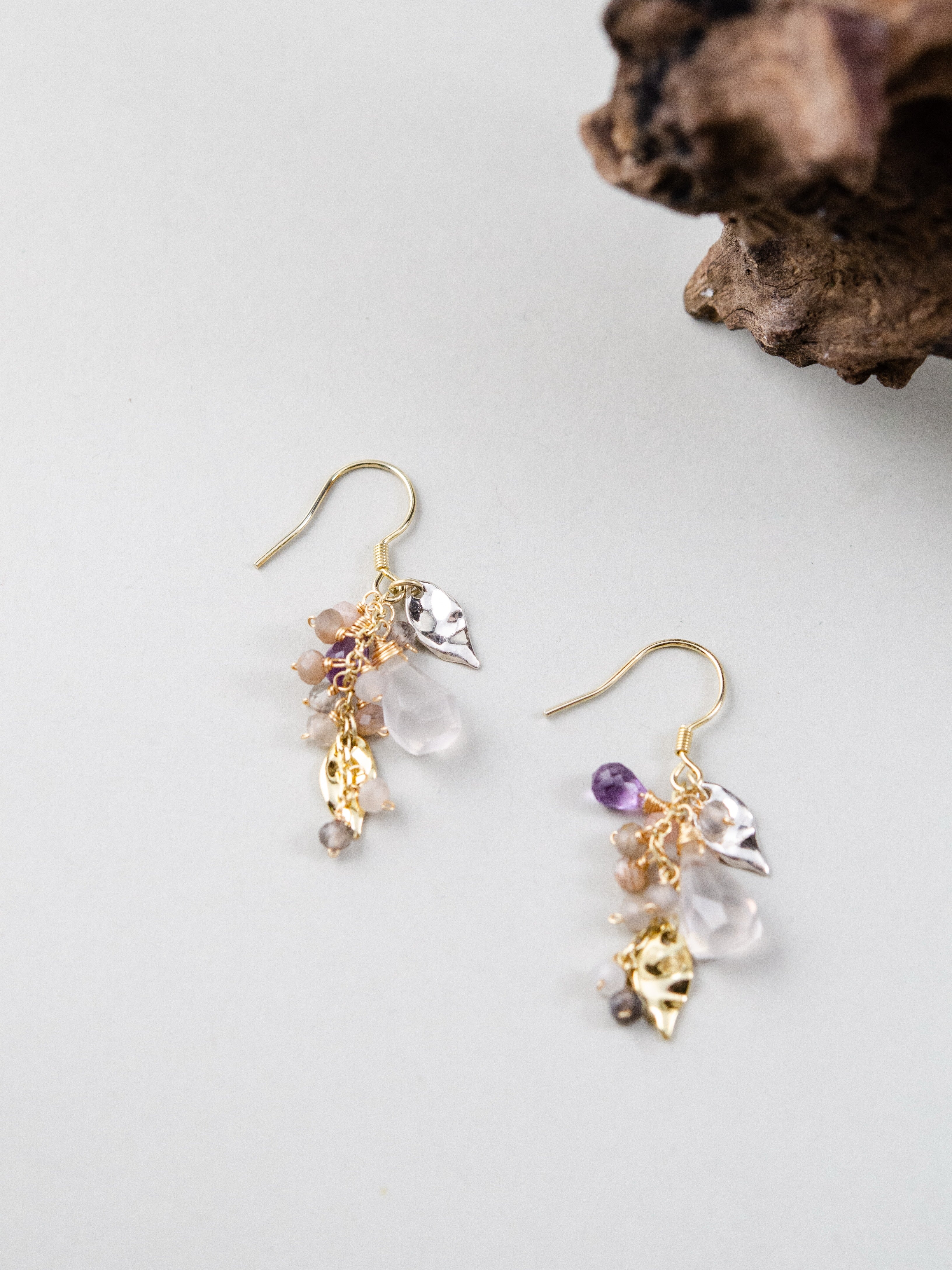 優しいピンクのローズクォーツと深みのあるアメジストを組み合わせ、ナチュラルなゴールド&シルバーのリーフモチーフで彩ったピアスです。ローズクォーツが柔らかく上品な雰囲気を演出し、アメジストが洗練された深みとスピリチュアルな魅力をプラス。