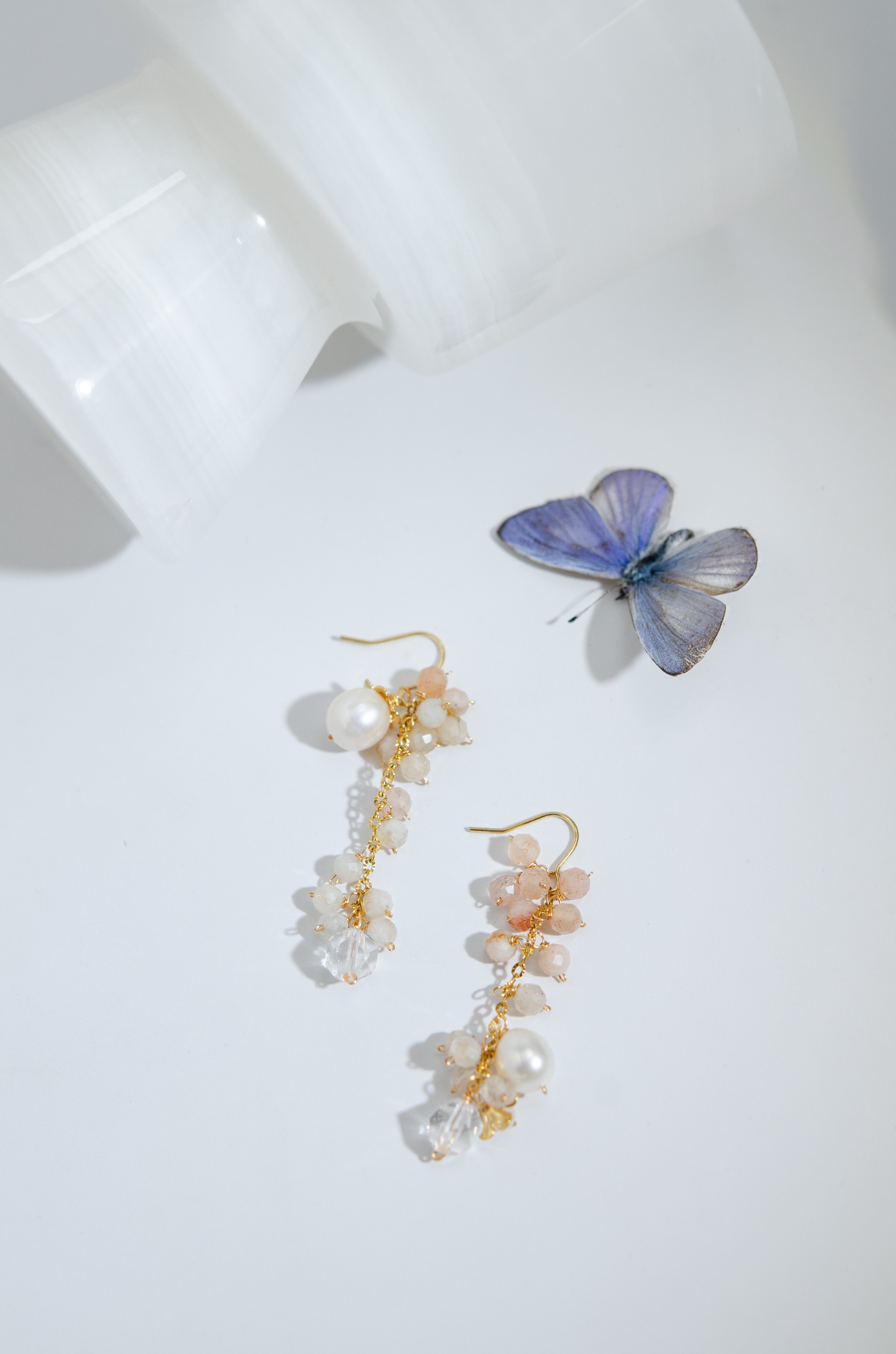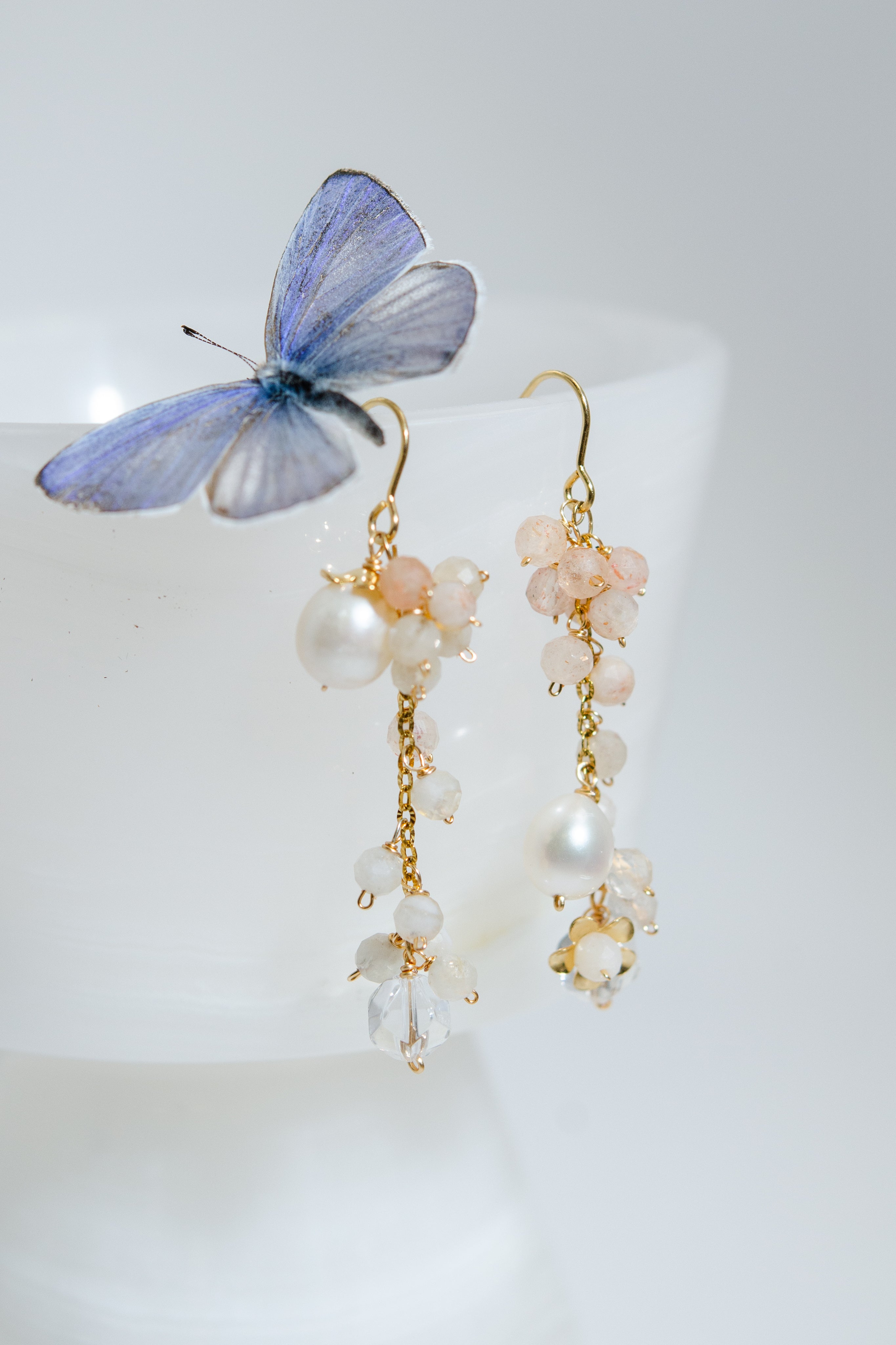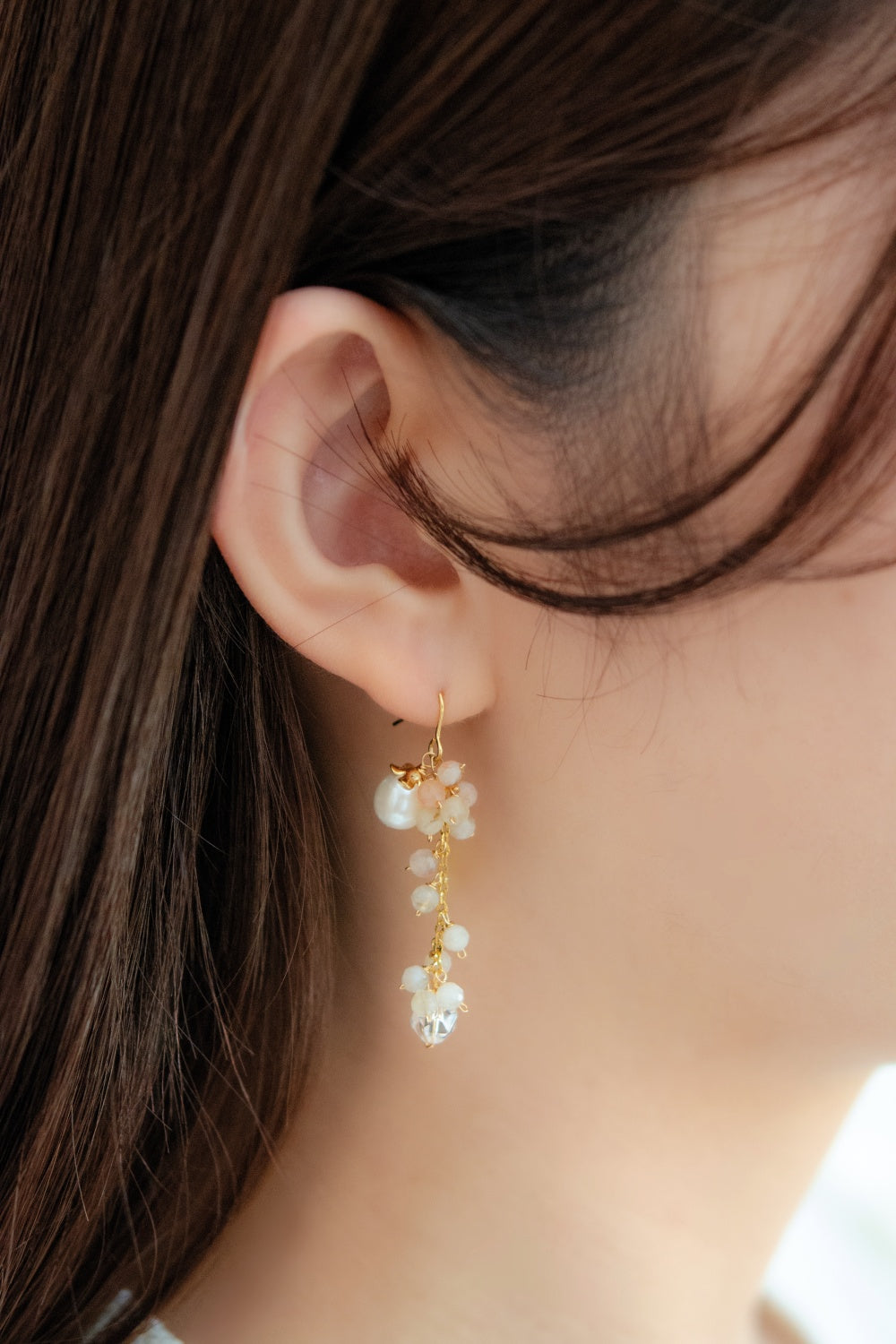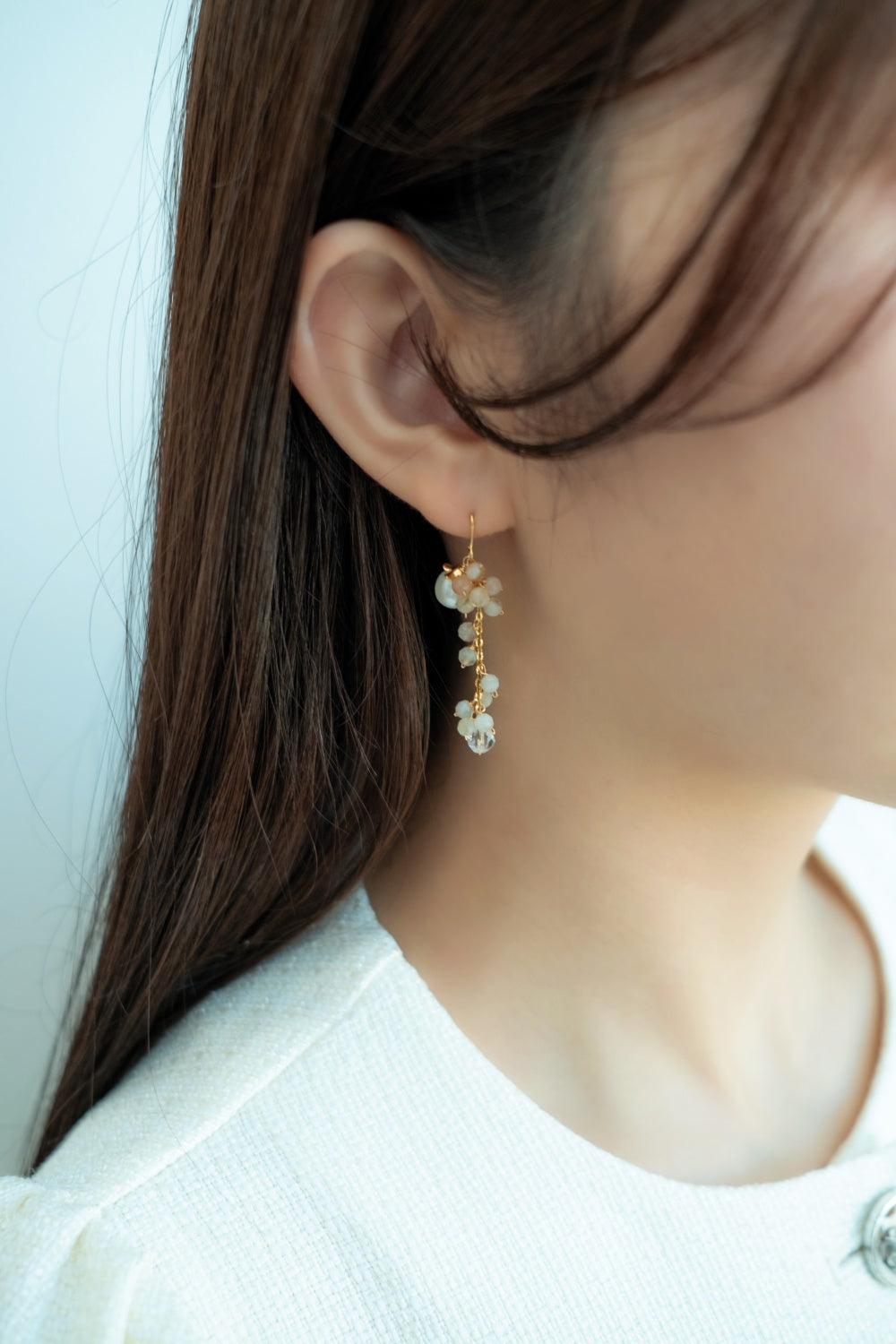 透明感あふれる天然石を異形カットで仕立て、柔らかな光沢のパールと組み合わせた耳元で揺れるピアスです。天然石の独特な模様とパールの繊細な輝きが調和し、洗練された個性を耳元に添えます。動きに合わせて揺れるシルエットが、静けさの中にも凛とした存在感を演出。