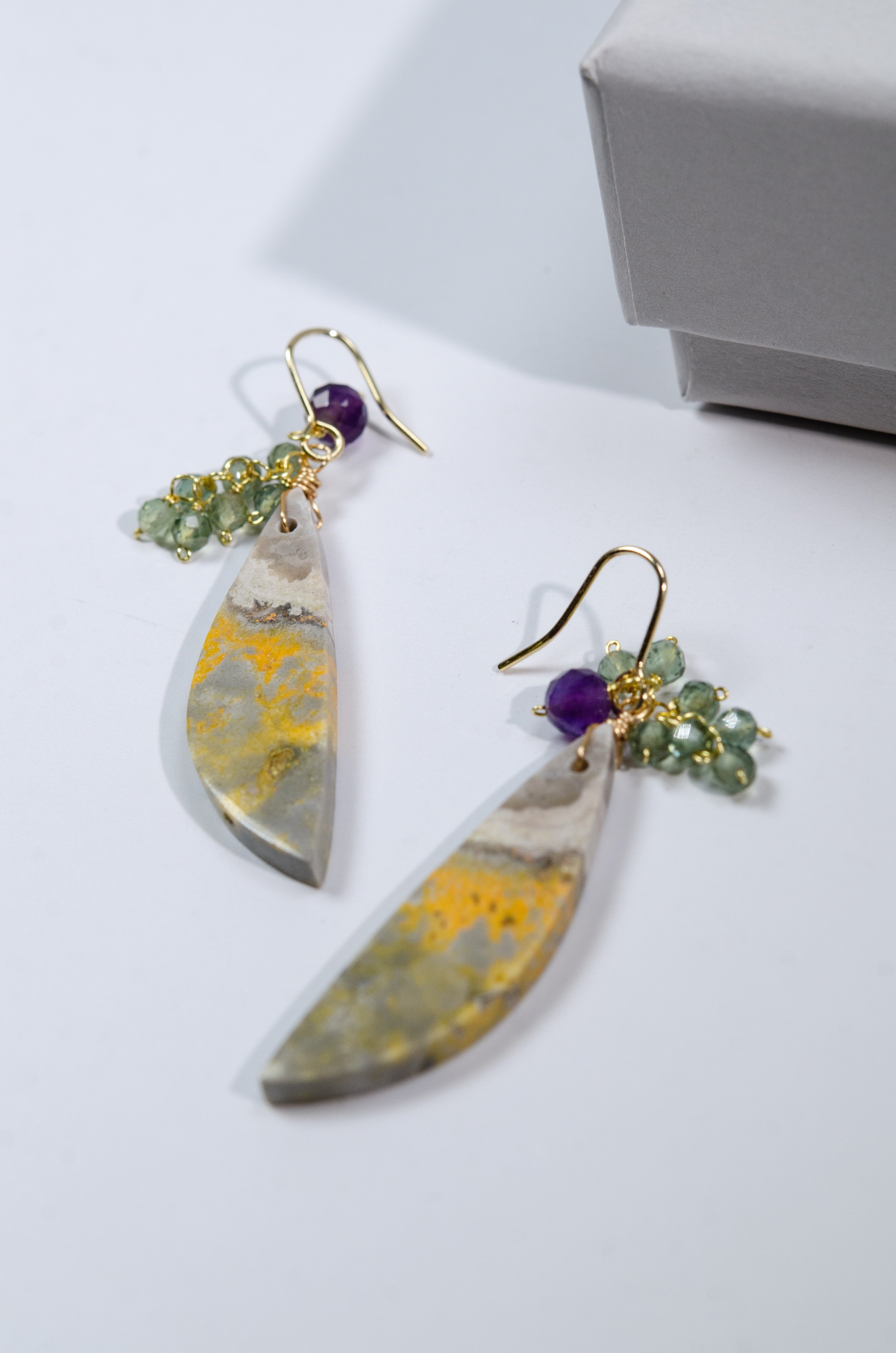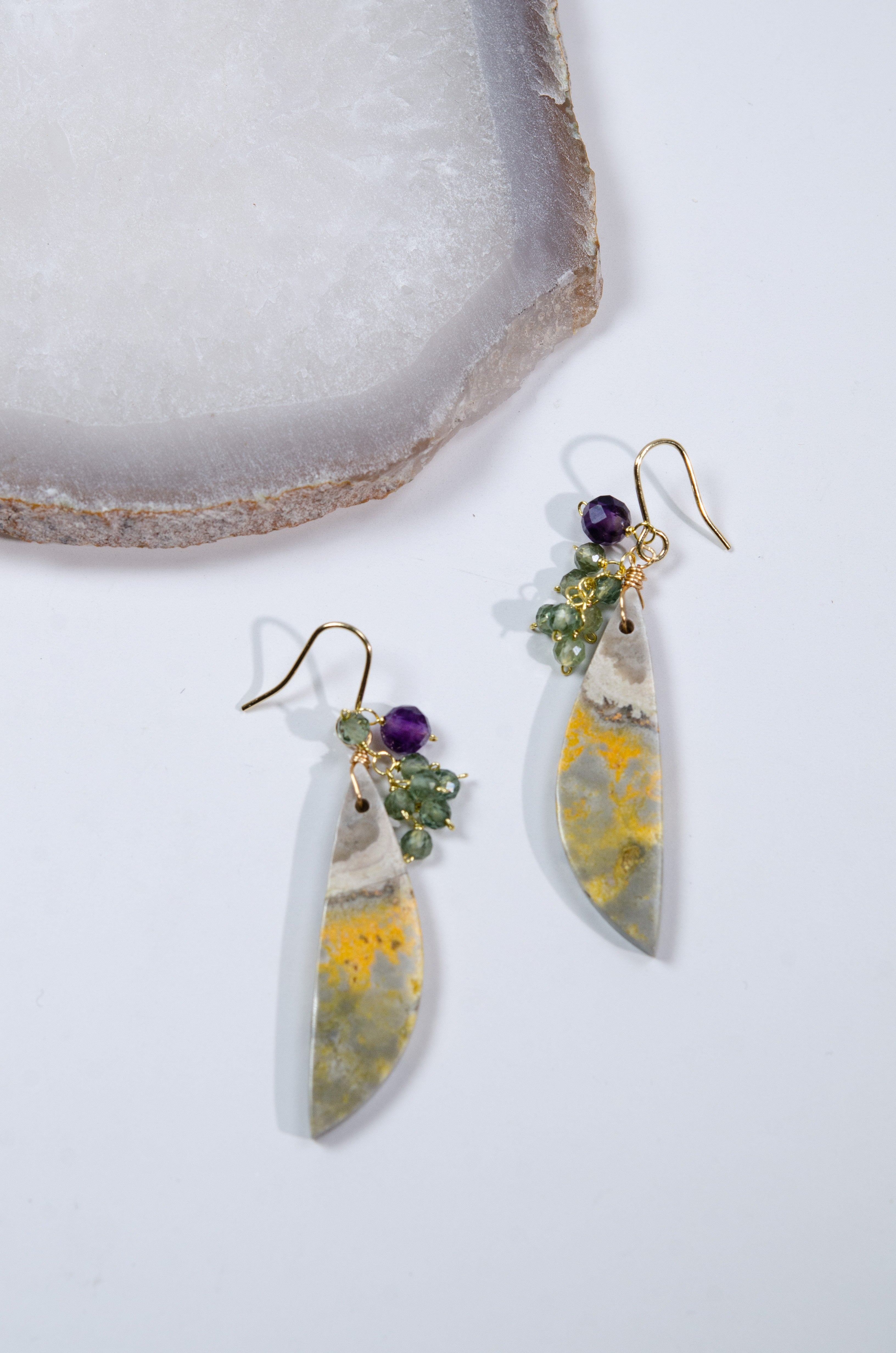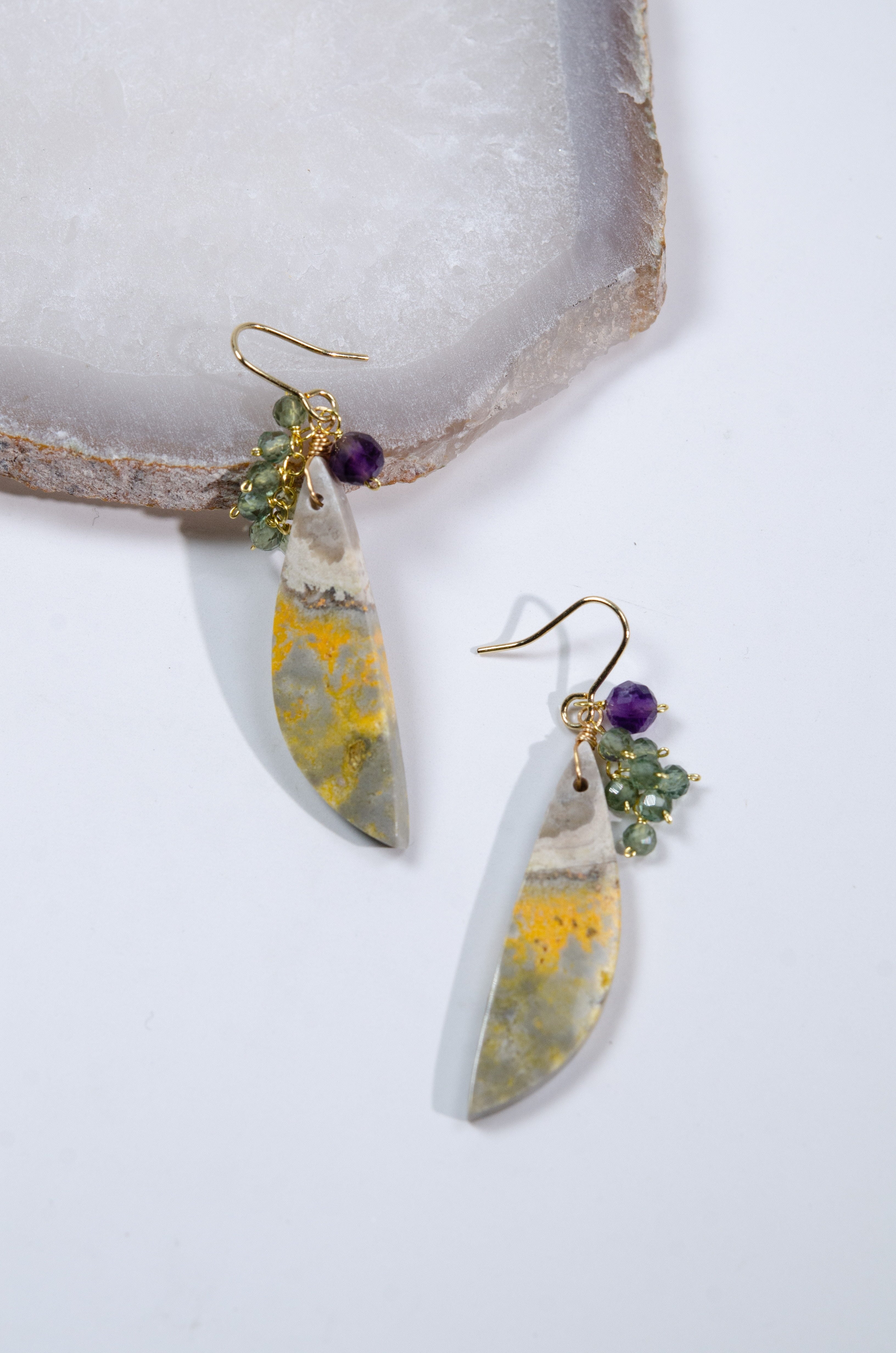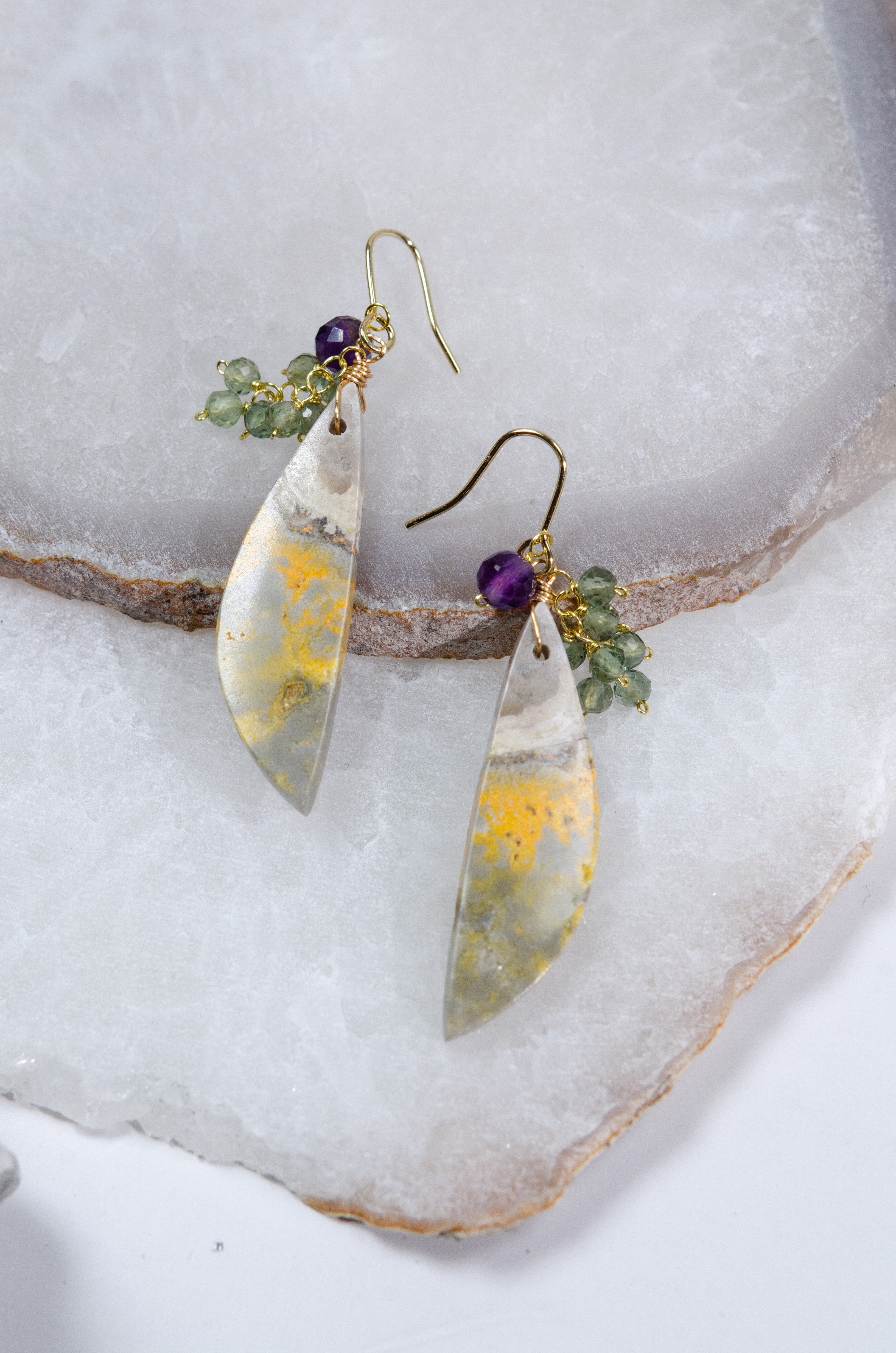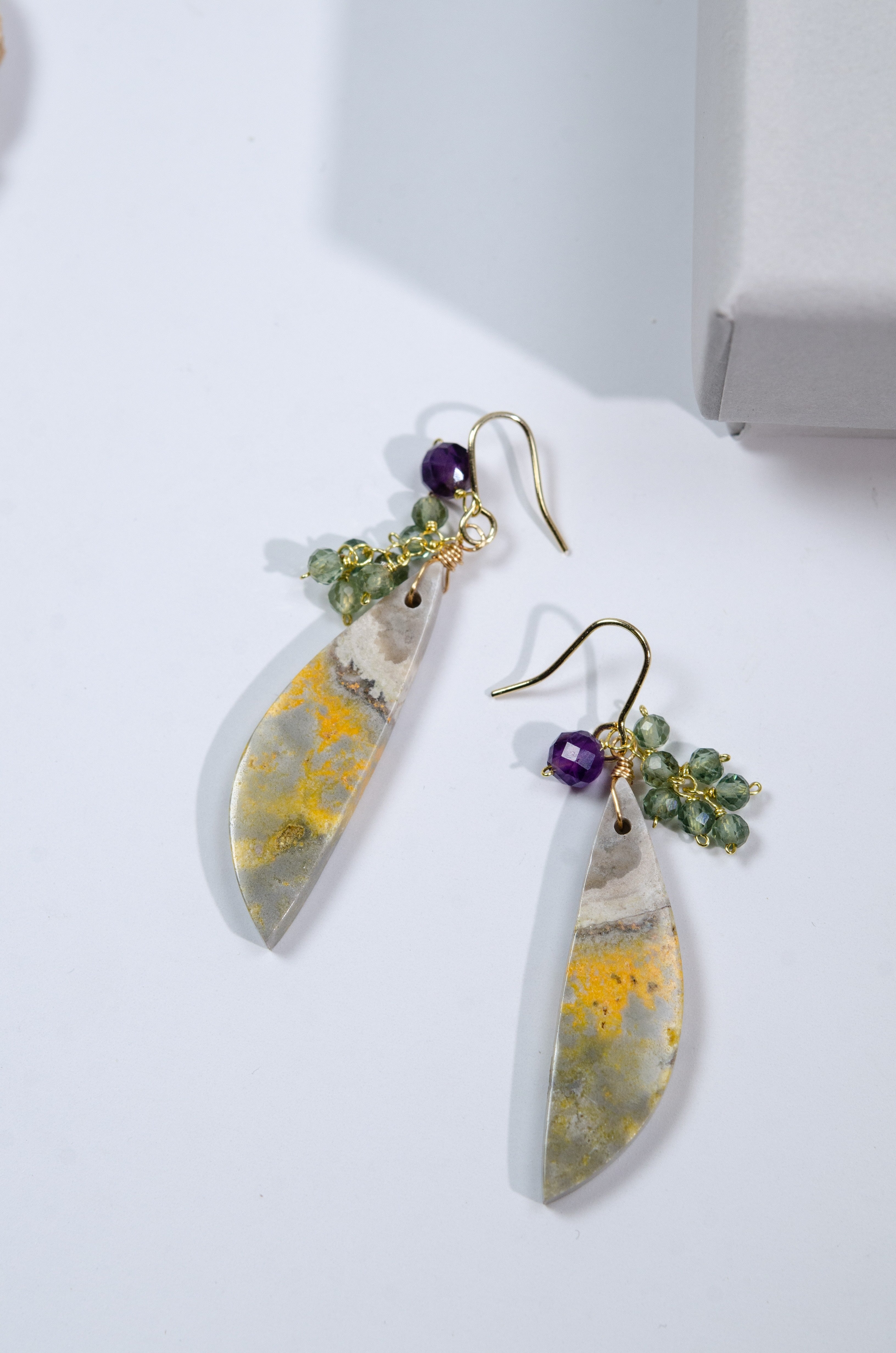 天然の模様を持つカルサイトを流れるような異形カットで仕立て、瑞々しいグリーンのプレナイトと高貴なアメジストを添えたイヤリングです。カルサイトの個性的な模様とカットがアートピースのような美しさを放ち、プレナイトの優しいグリーンとアメジストの落ち着いた紫が耳元で色彩のハーモニーを奏でます。自然のエネルギーと神秘的な雰囲気を感じられる、アーティスティックなデザインです。