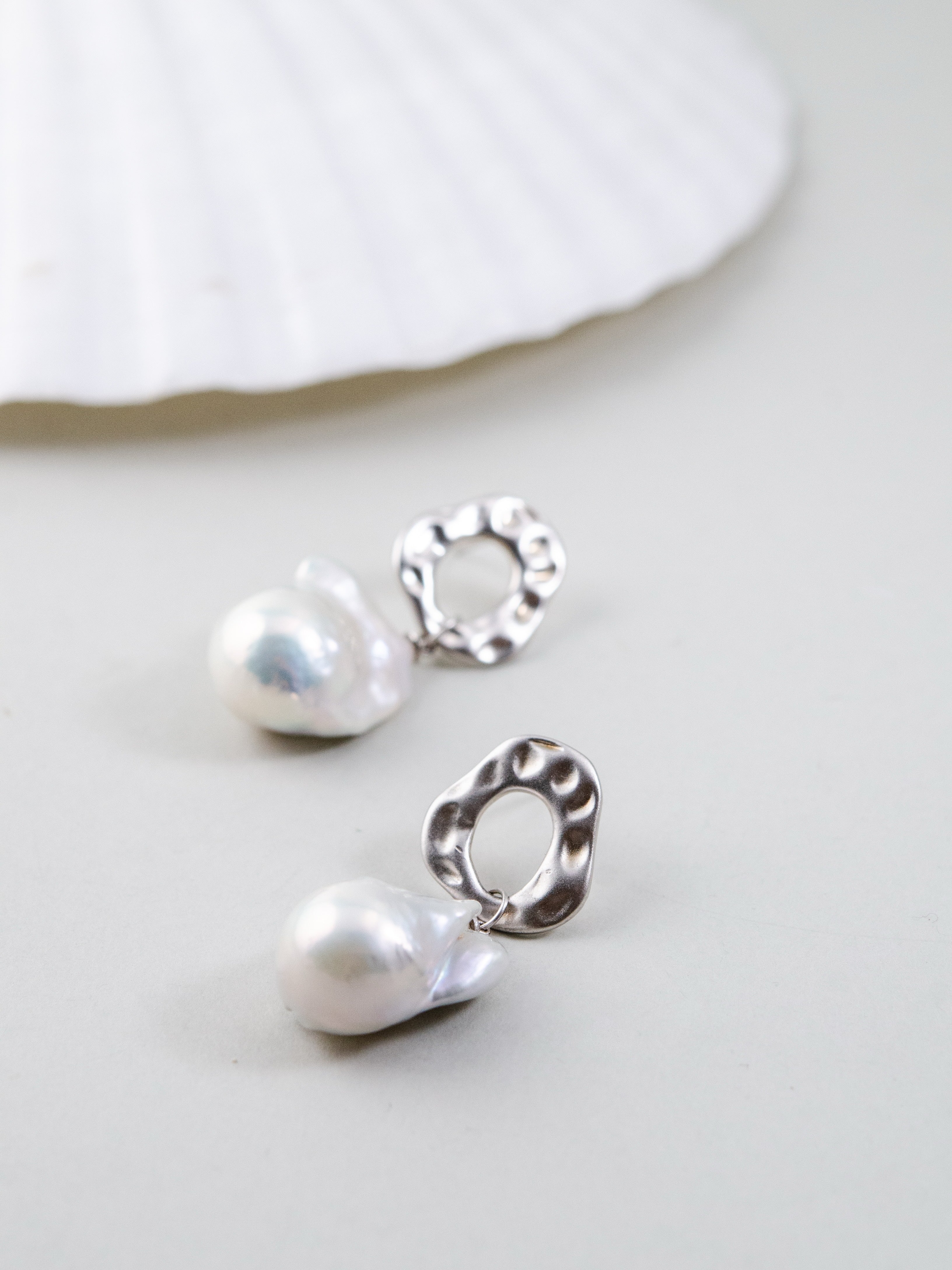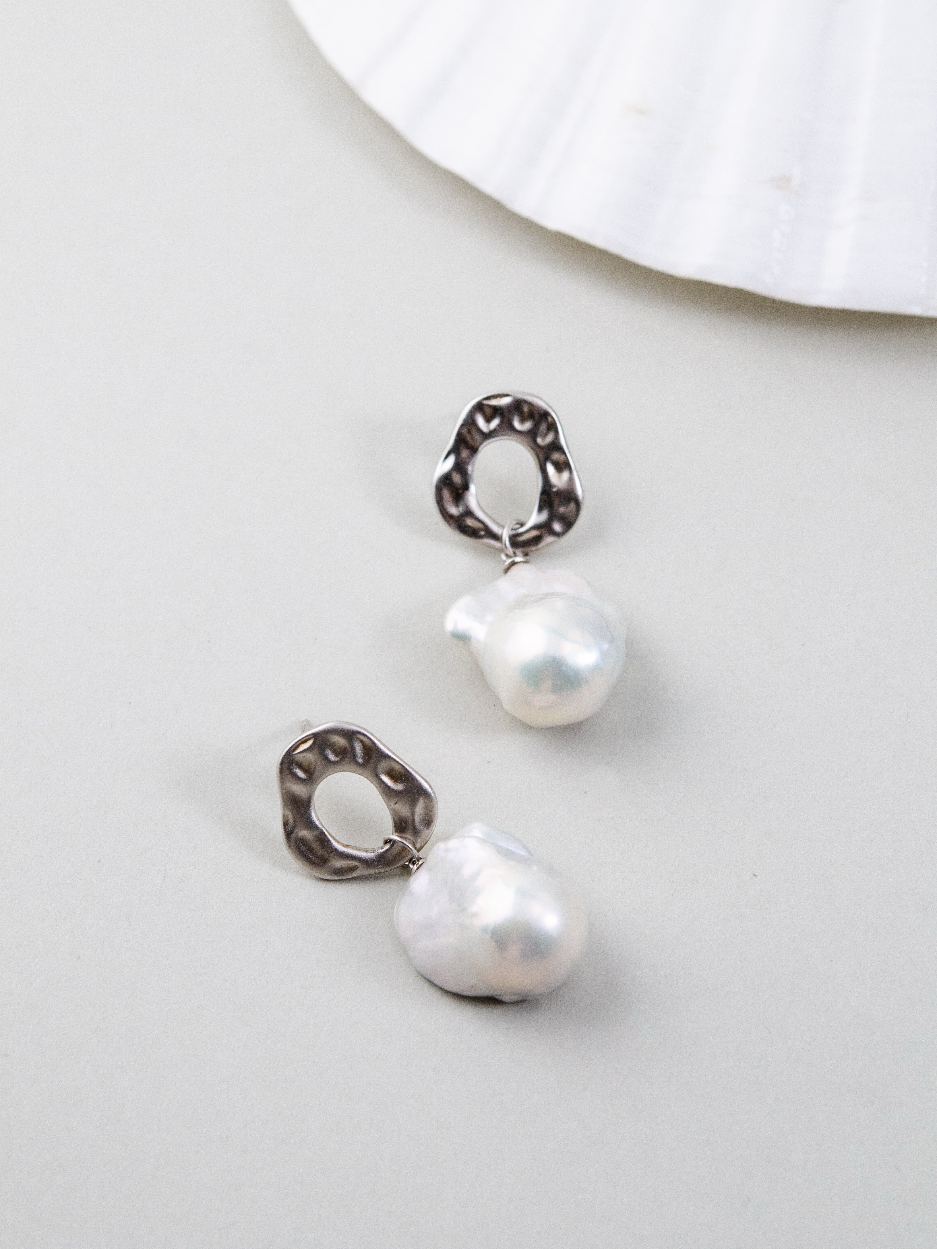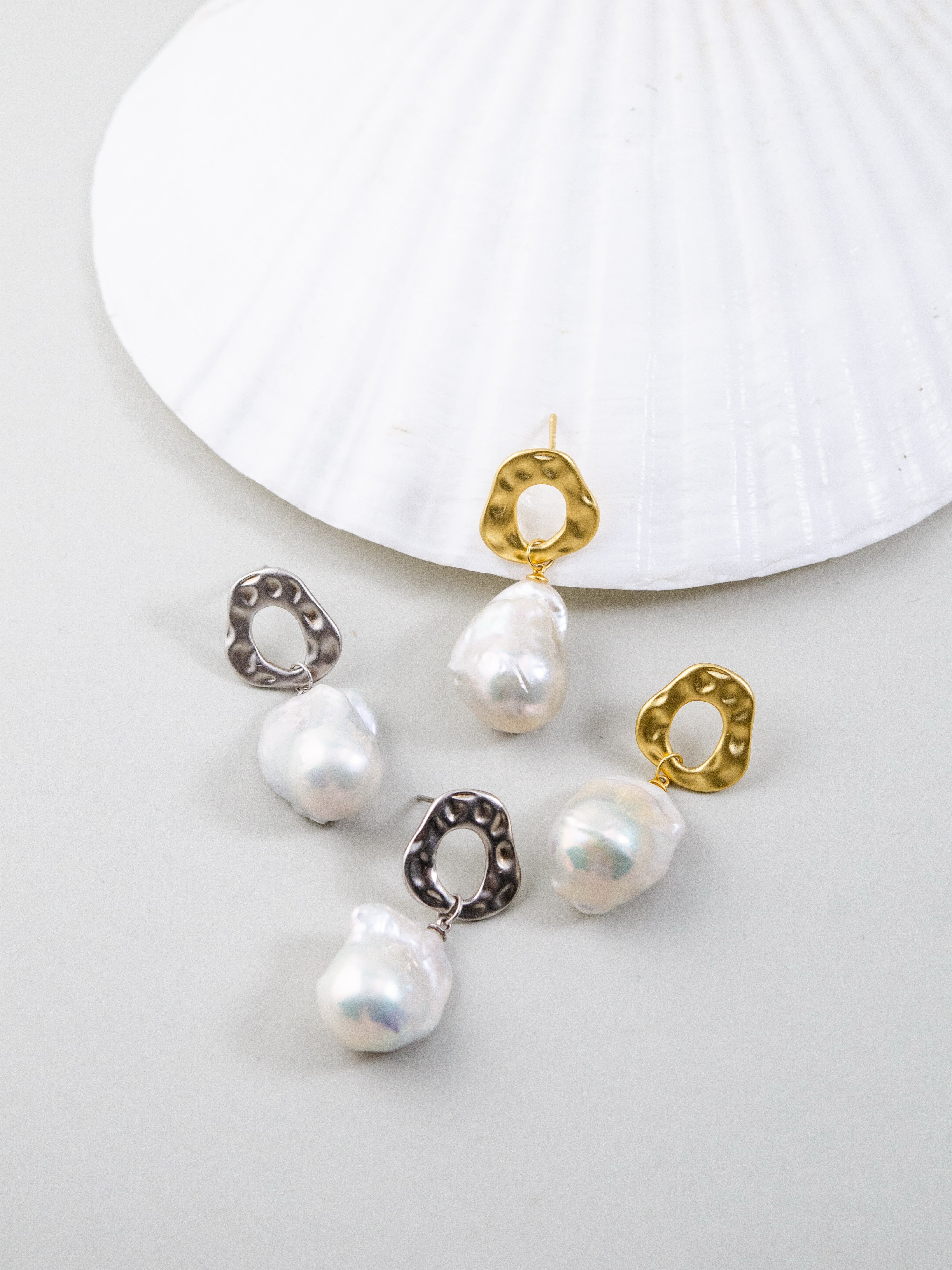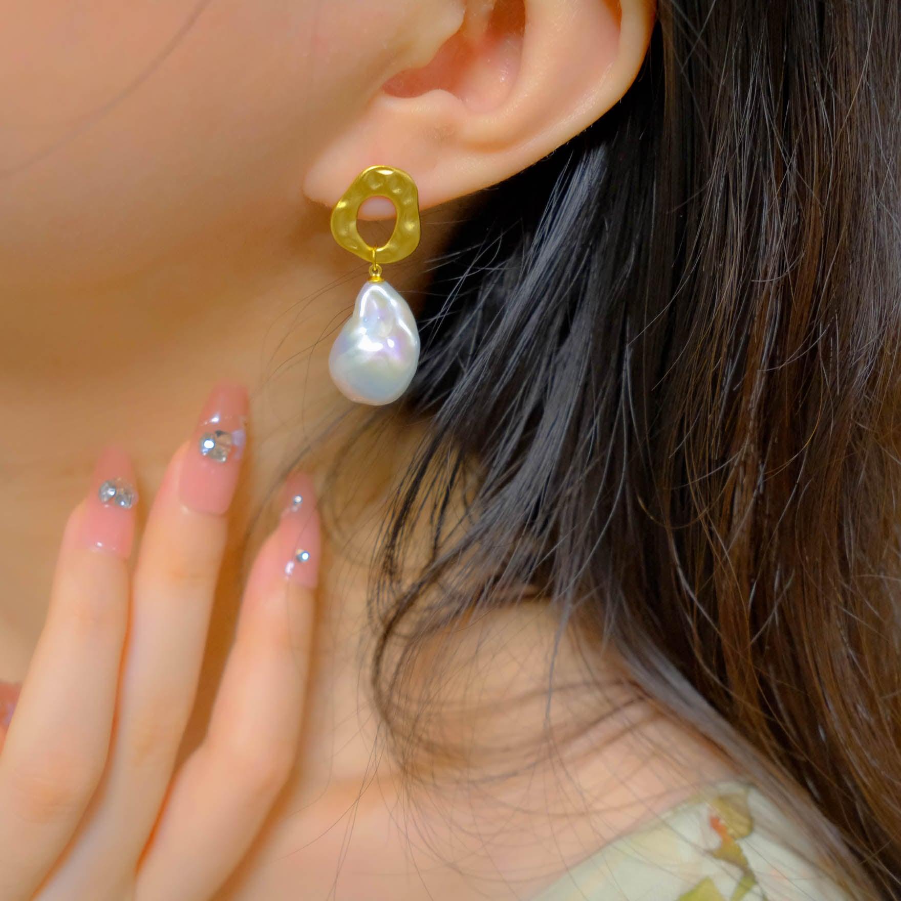 自然界からインスピレーションを受け、滑らかな凹凸が特徴のメタルパーツと個性豊かな天然バロックパールを組み合わせたピアスです。無機質な金属と有機的なパールのフォルムが融合し、モダンでアート感のある印象を演出します。一点一点形の異なるバロックパールは唯一無二の表情を持ち、耳元でさりげなく華やかさを添えます。