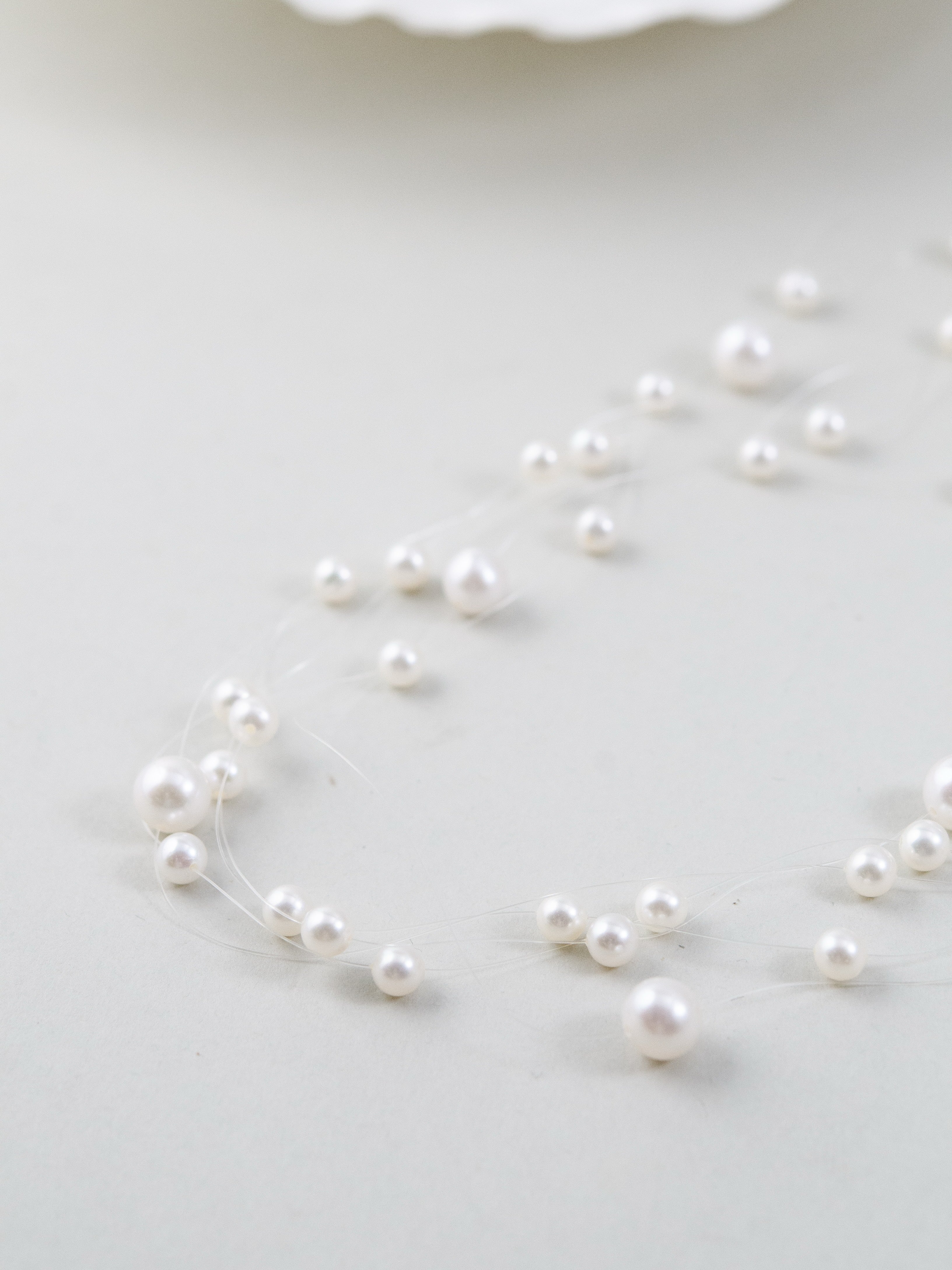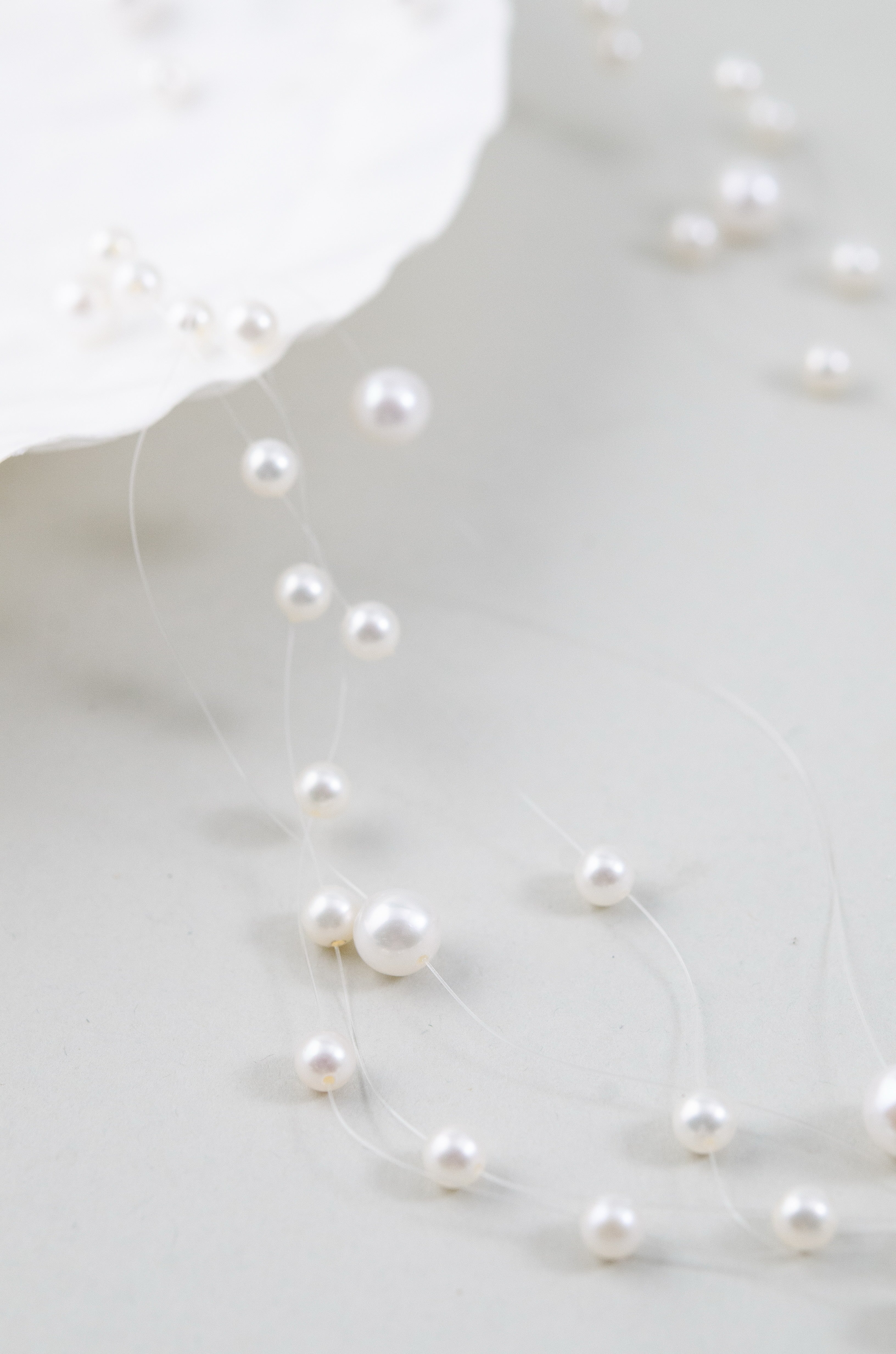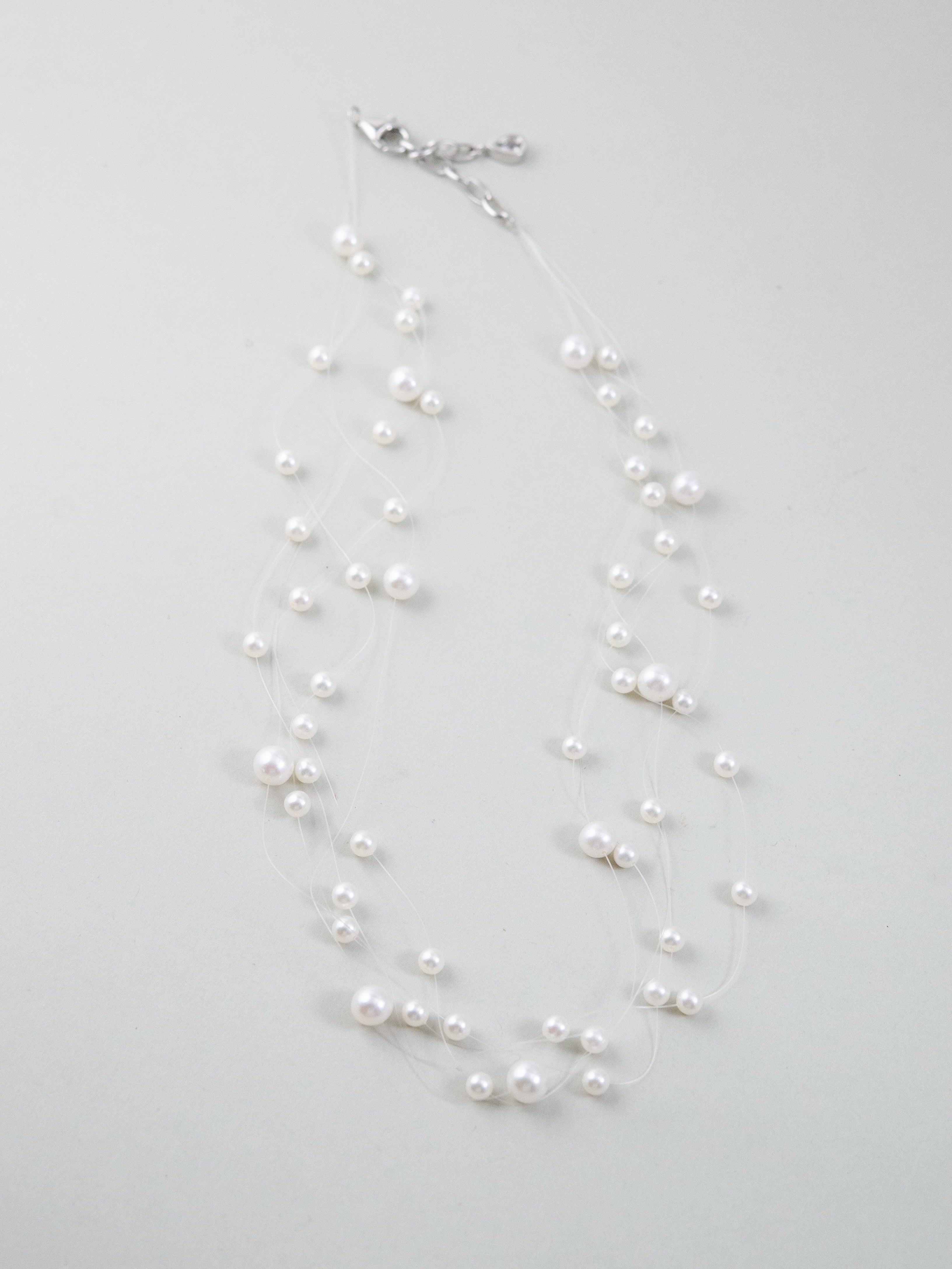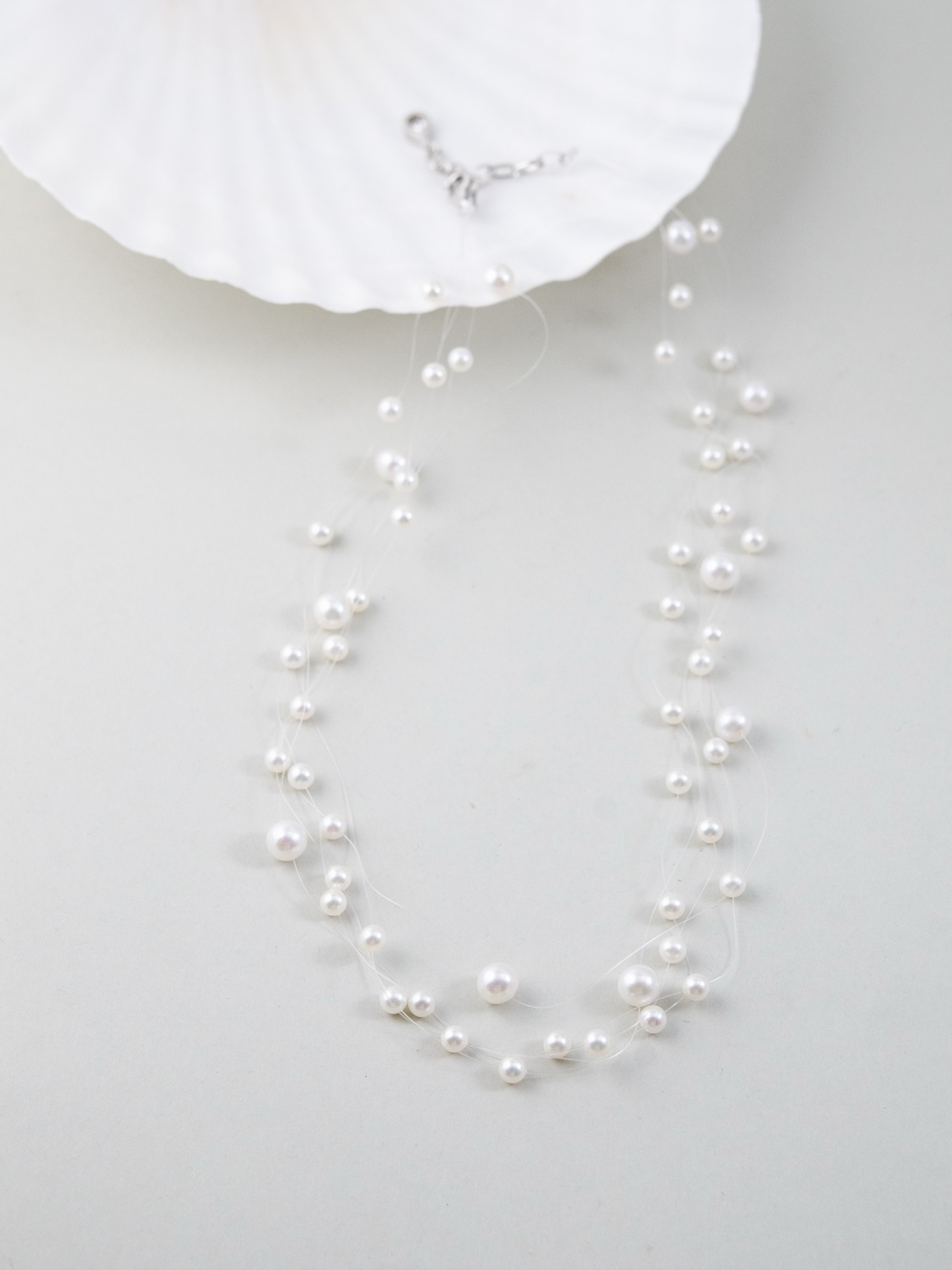まるで“人魚の涙”が肌の上をそっと滑るように――。透明なテグスに大小さまざまな淡水パールを散りばめた、繊細で幻想的なネックレスです。空気のように軽やかで、まるで素肌に直接パールが浮かんでいるような“隠れジュエリー”感覚をお楽しみいただけます。サイズの異なるパールを不規則に配置したリズミカルで有機的なデザインが、動きに合わせてきらめきを生み出します。