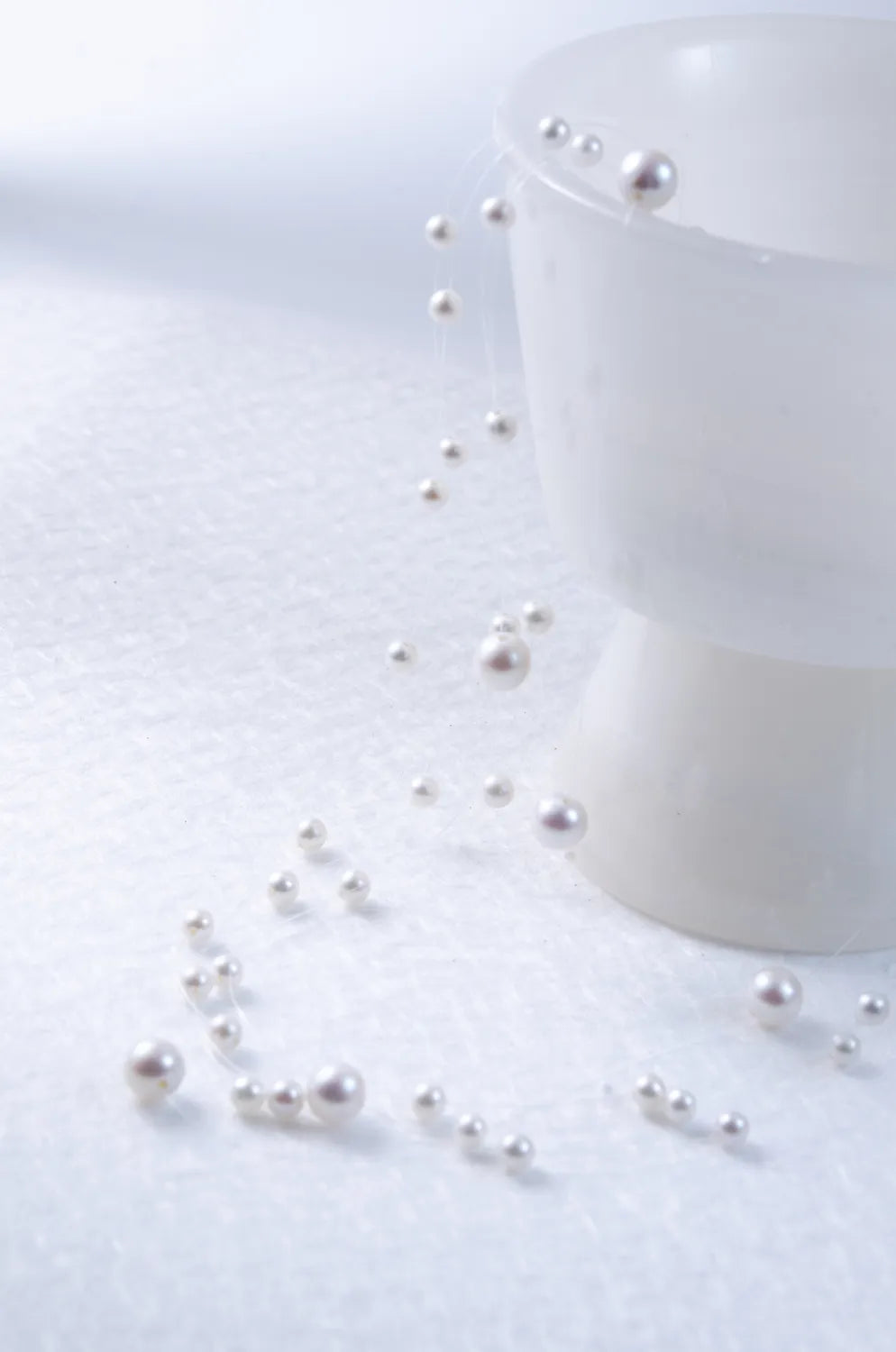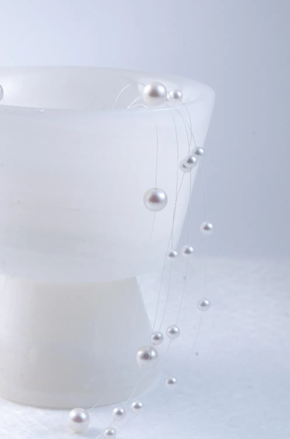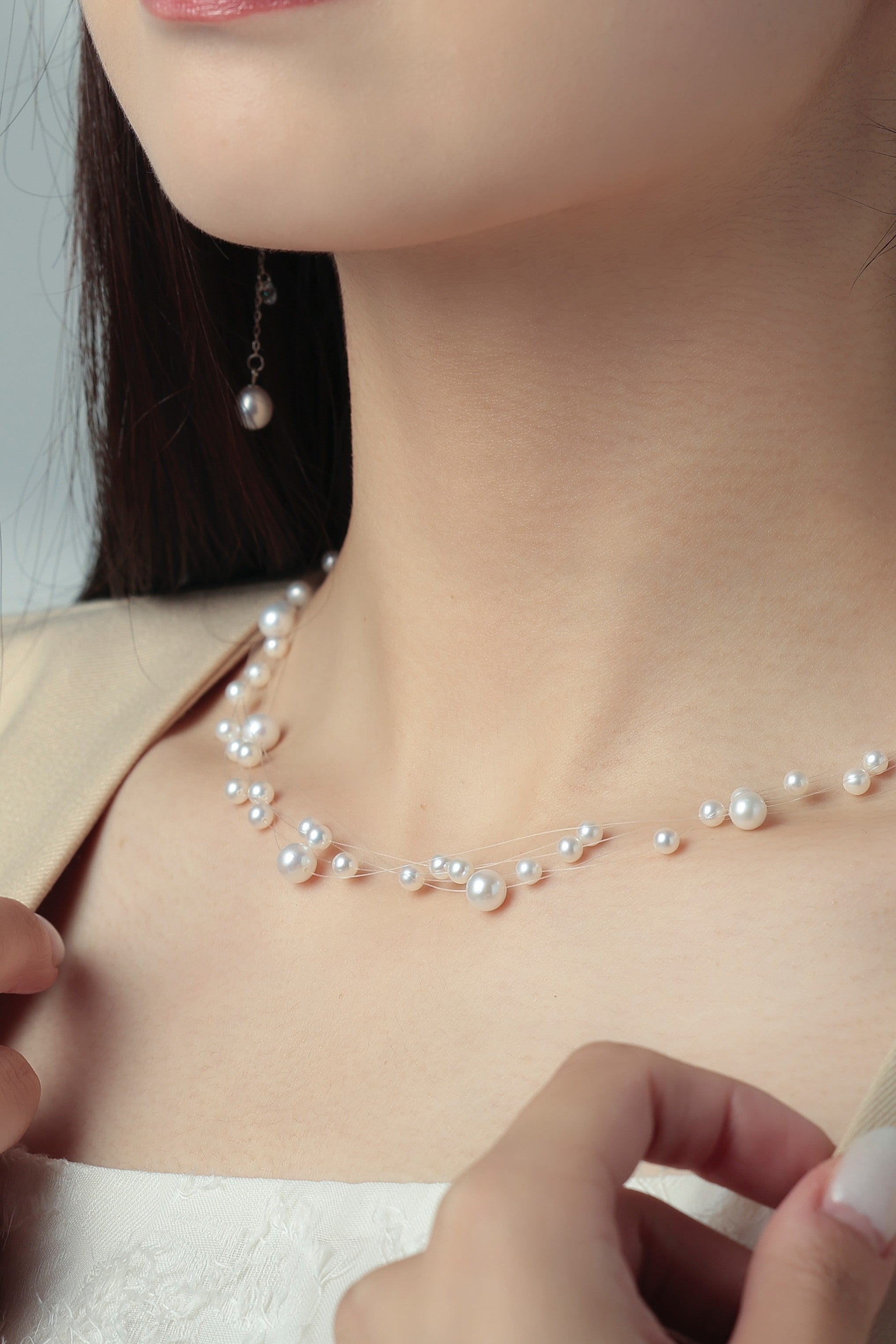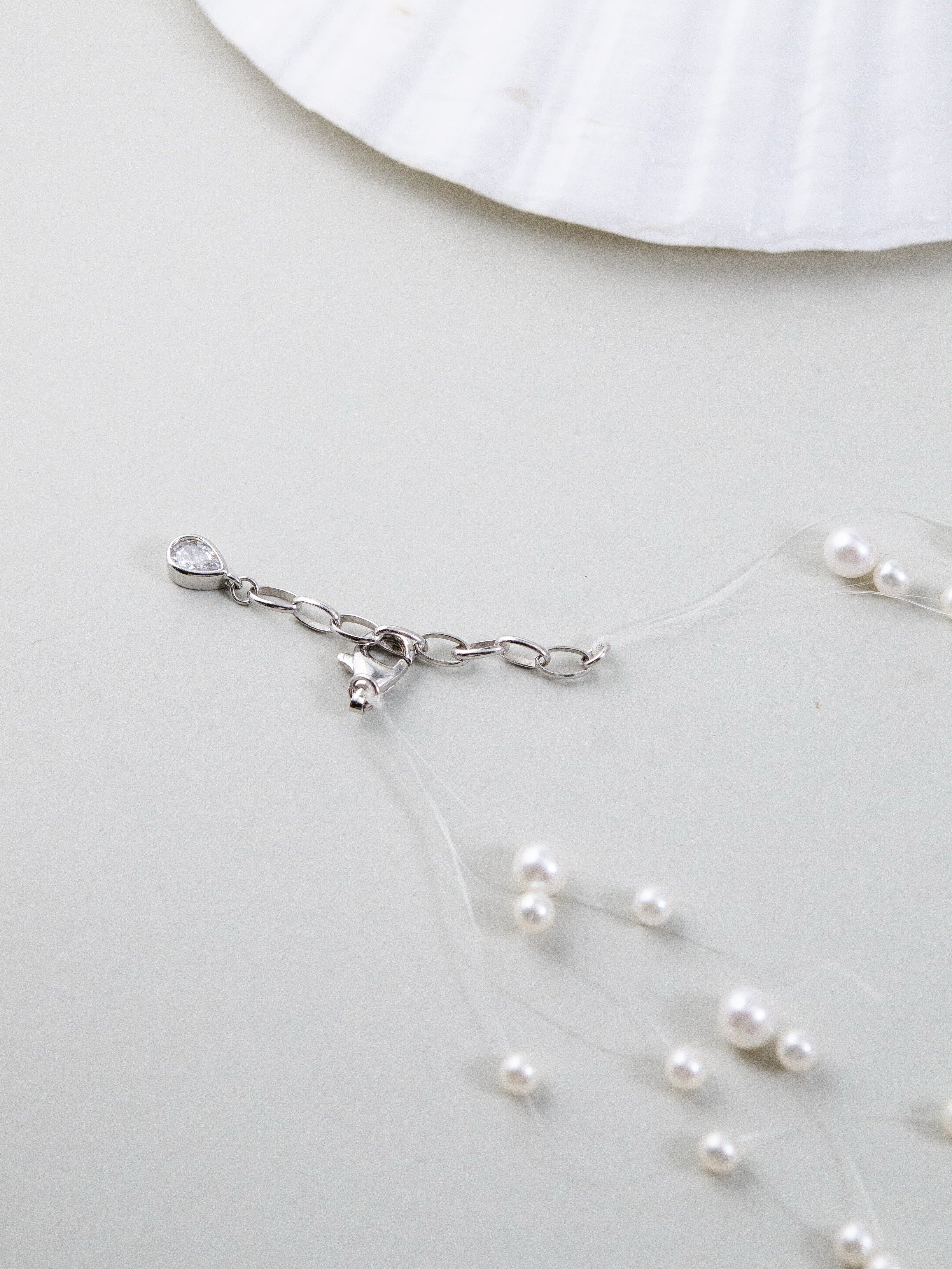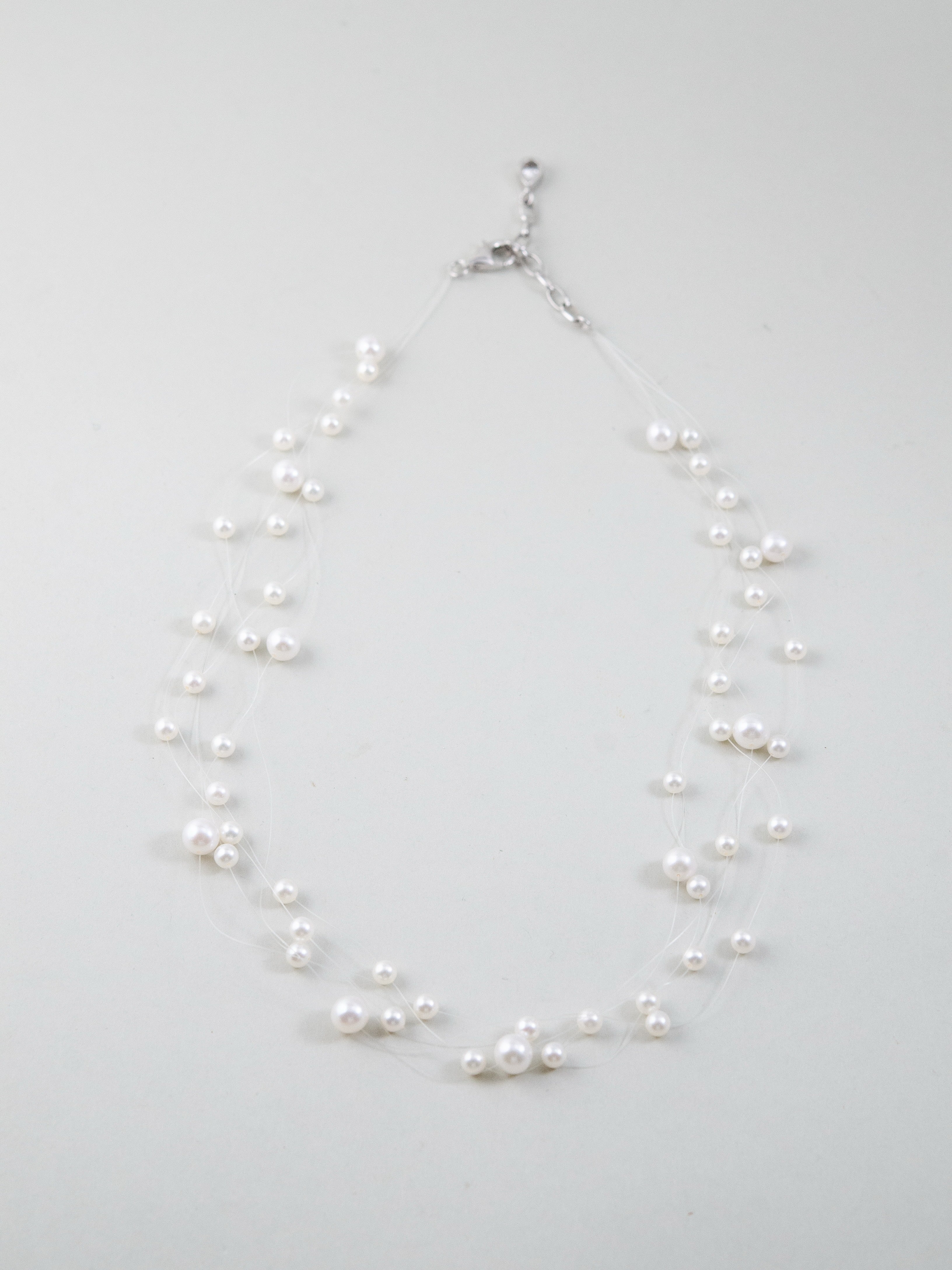 まるで“人魚の涙”が肌の上をそっと滑るように――。透明なテグスに大小さまざまな淡水パールを散りばめた、繊細で幻想的なネックレスです。空気のように軽やかで、まるで素肌に直接パールが浮かんでいるような“隠れジュエリー”感覚をお楽しみいただけます。サイズの異なるパールを不規則に配置したリズミカルで有機的なデザインが、動きに合わせてきらめきを生み出します。