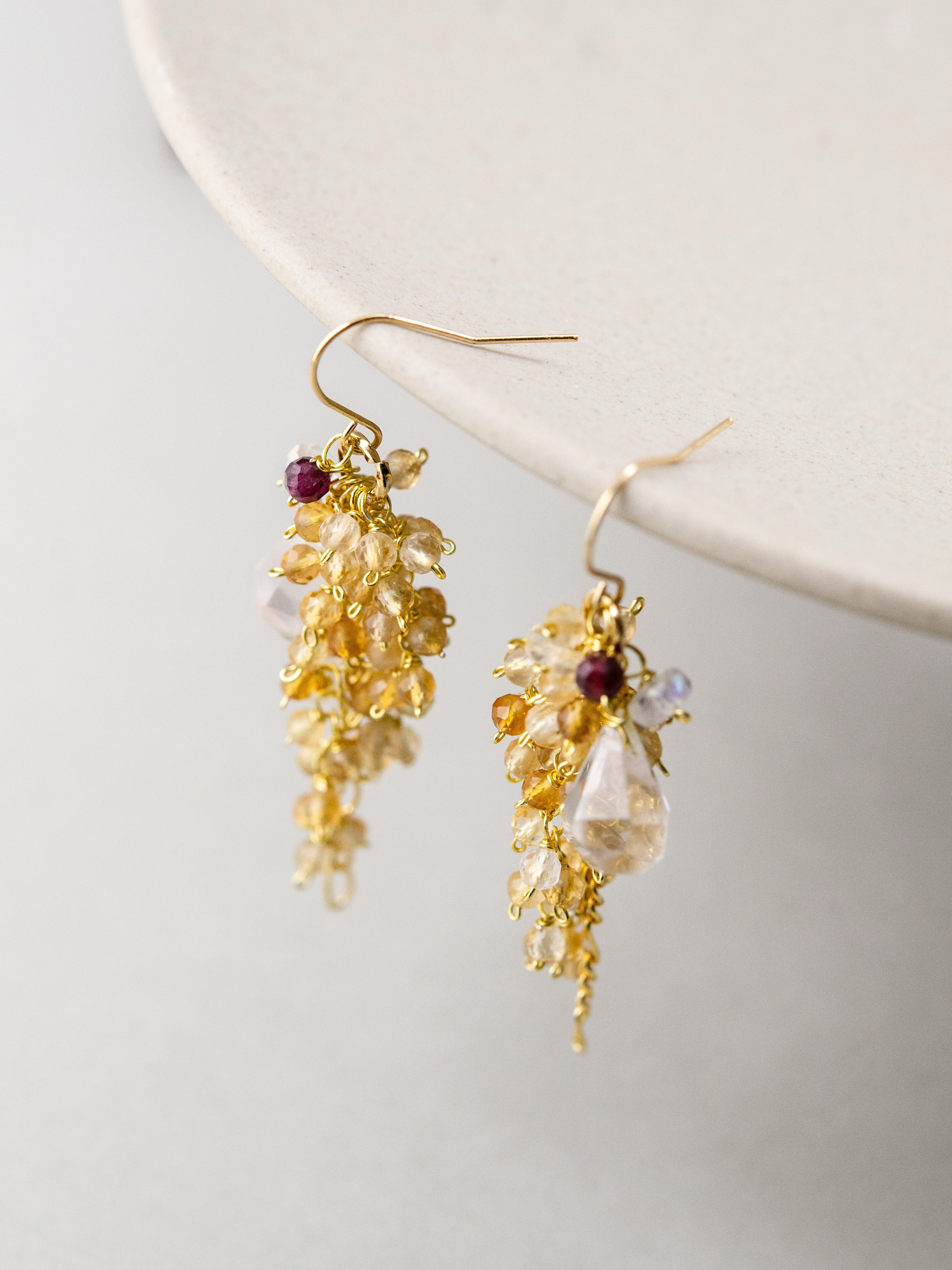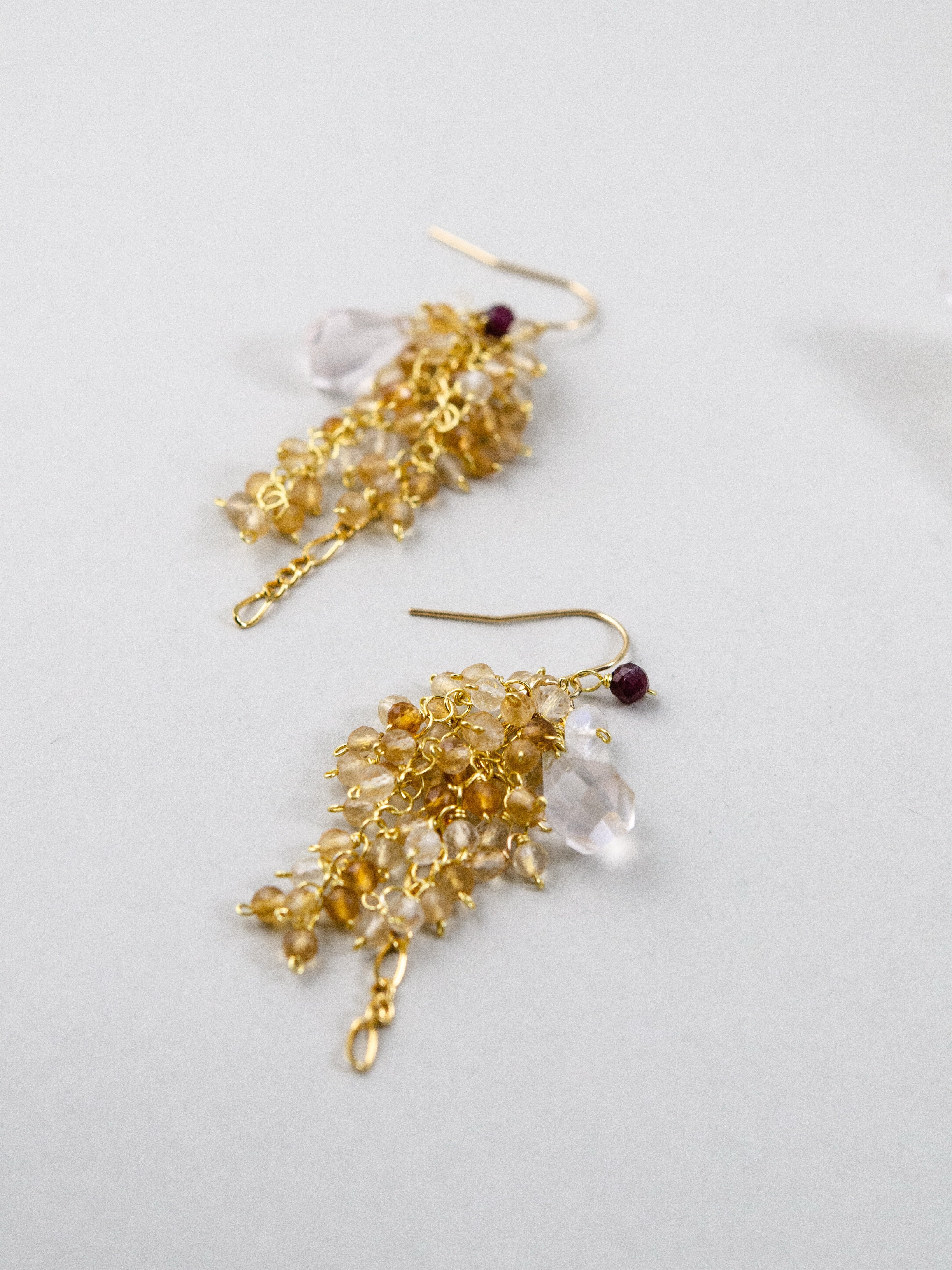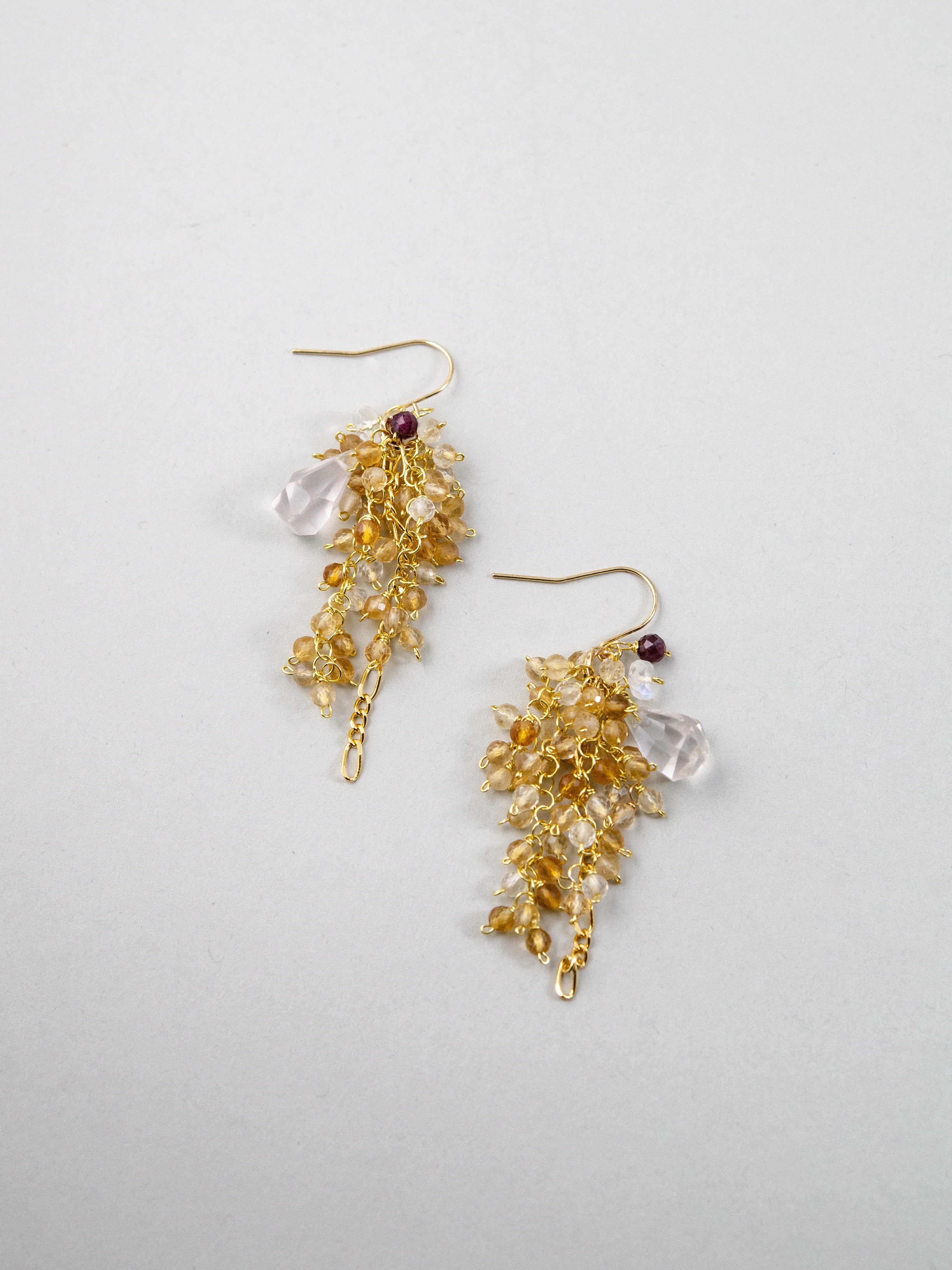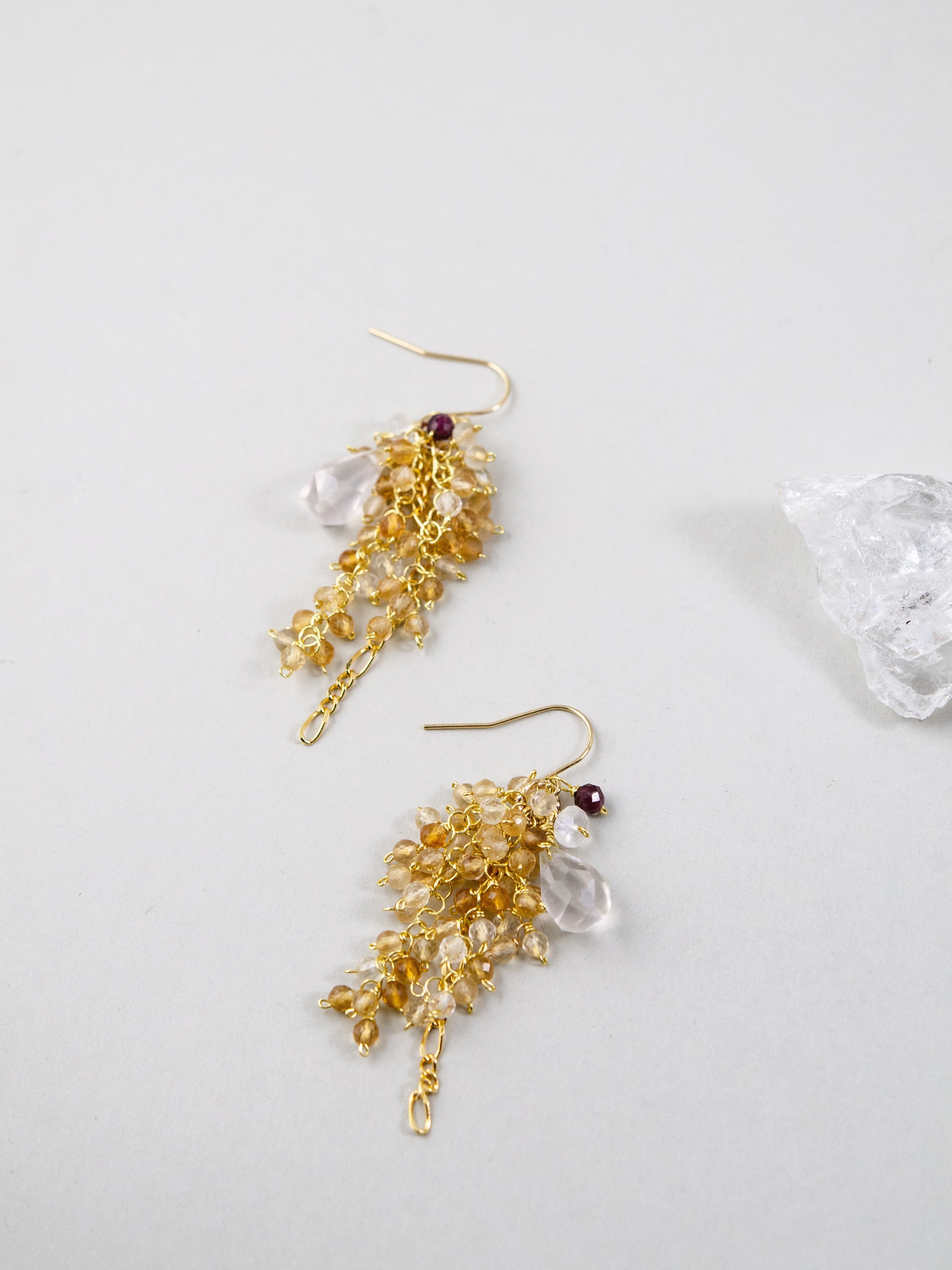 朝露に輝く光を映すシトリンと、やさしく包み込むローズクォーツを組み合わせたピアス。太陽のような明るさと、心を癒す穏やかさを耳元に添えます。透明感のあるシトリンが軽やかに揺れ、笑顔を引き立てるハッピーカラーに。ローズクォーツの柔らかい色合いが、女性らしい優しさを演出。