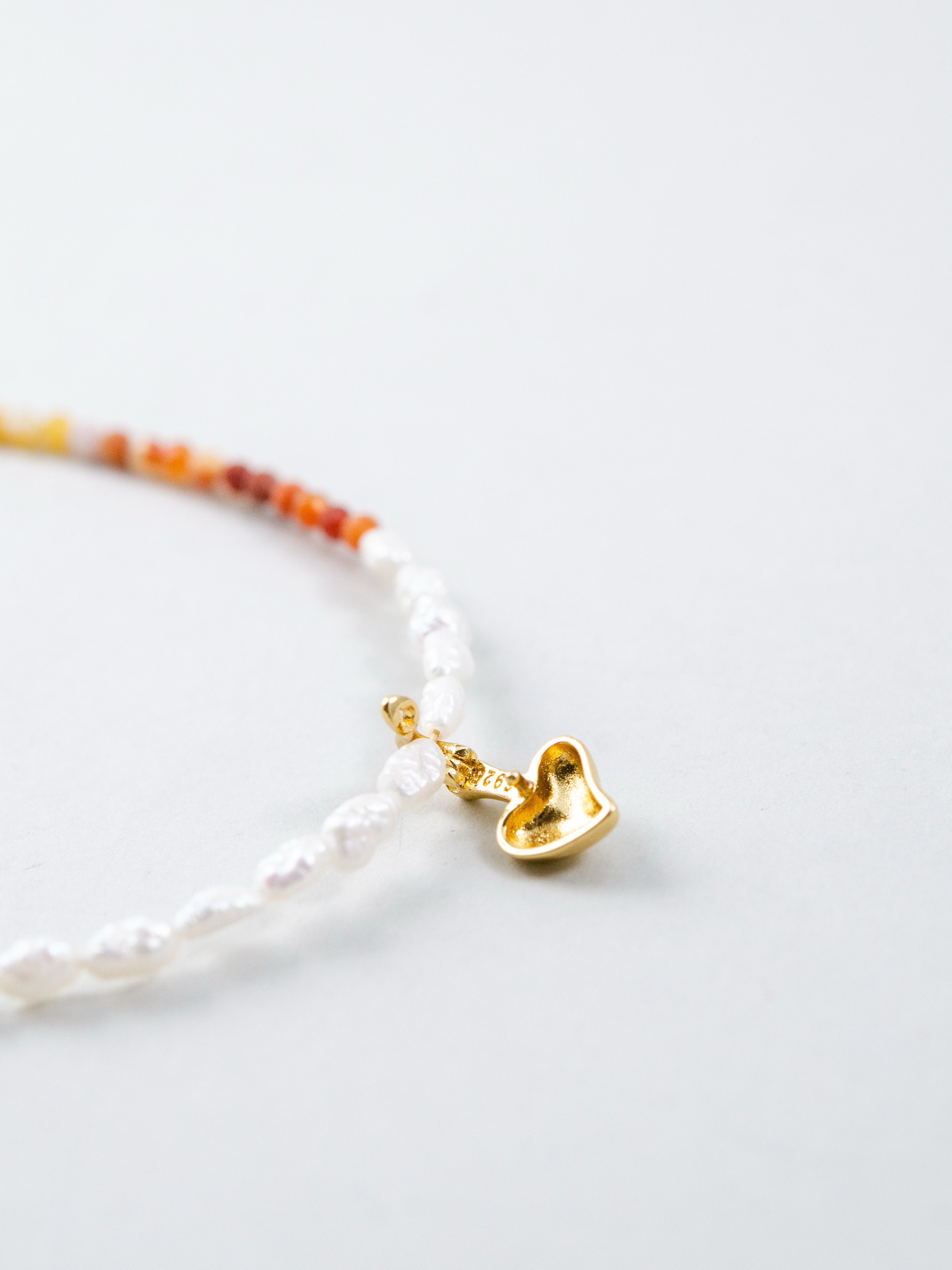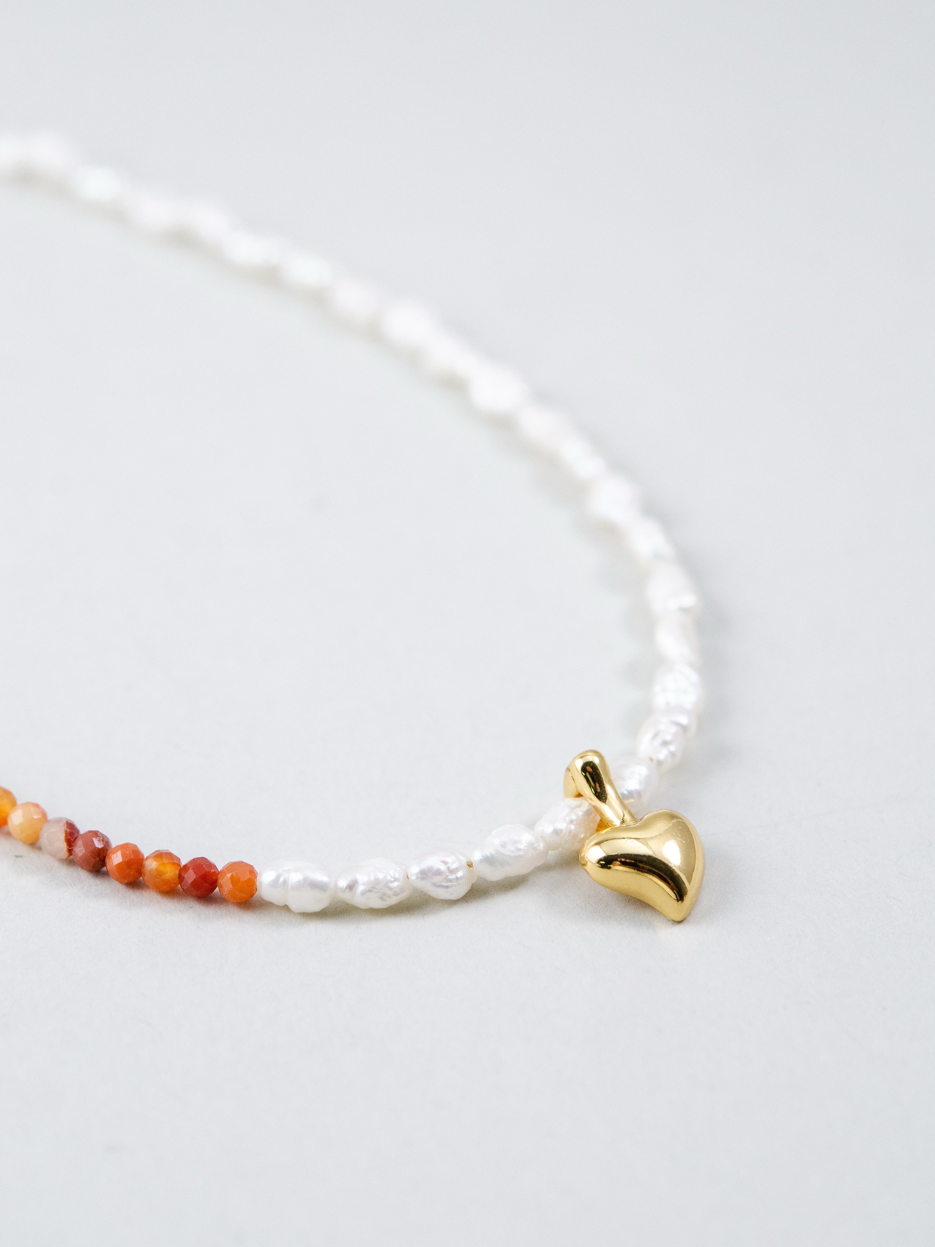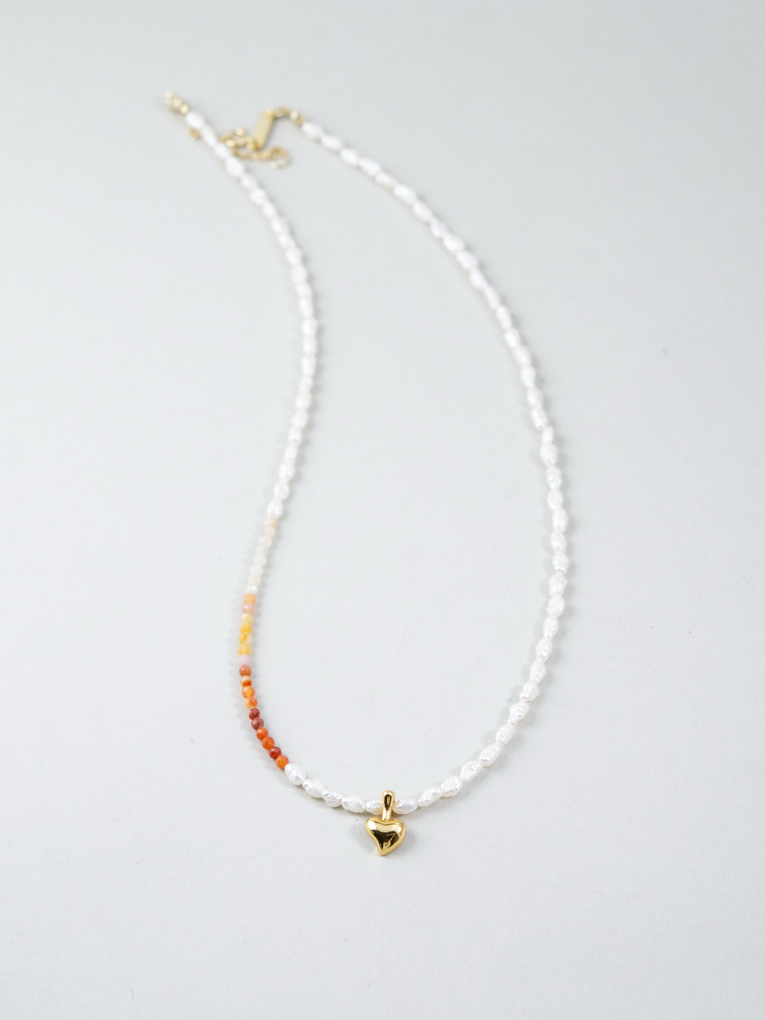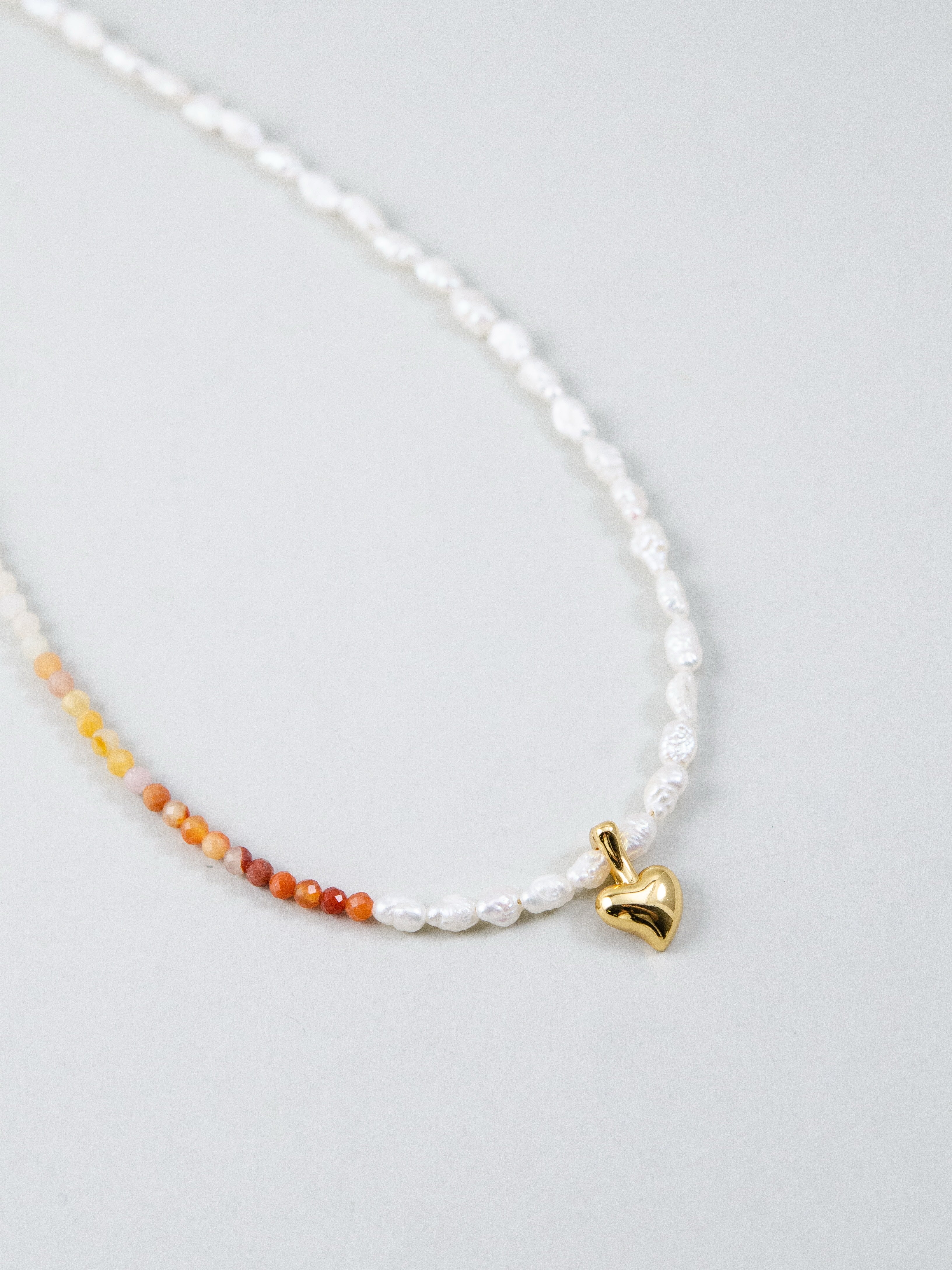 ナチュラルな淡水パールをベースに、オレンジのグラデーション天然石を片側にあしらった、遊び心のあるデザイン。まるで朝焼けの光を閉じ込めたような、やさしくあたたかい印象に仕上げています。中央にはゴールドのハートチャームがきらりと揺れ、無邪気で愛らしい雰囲気をプラス。毎日にささやかなトキメキを添えてくれるネックレスです。