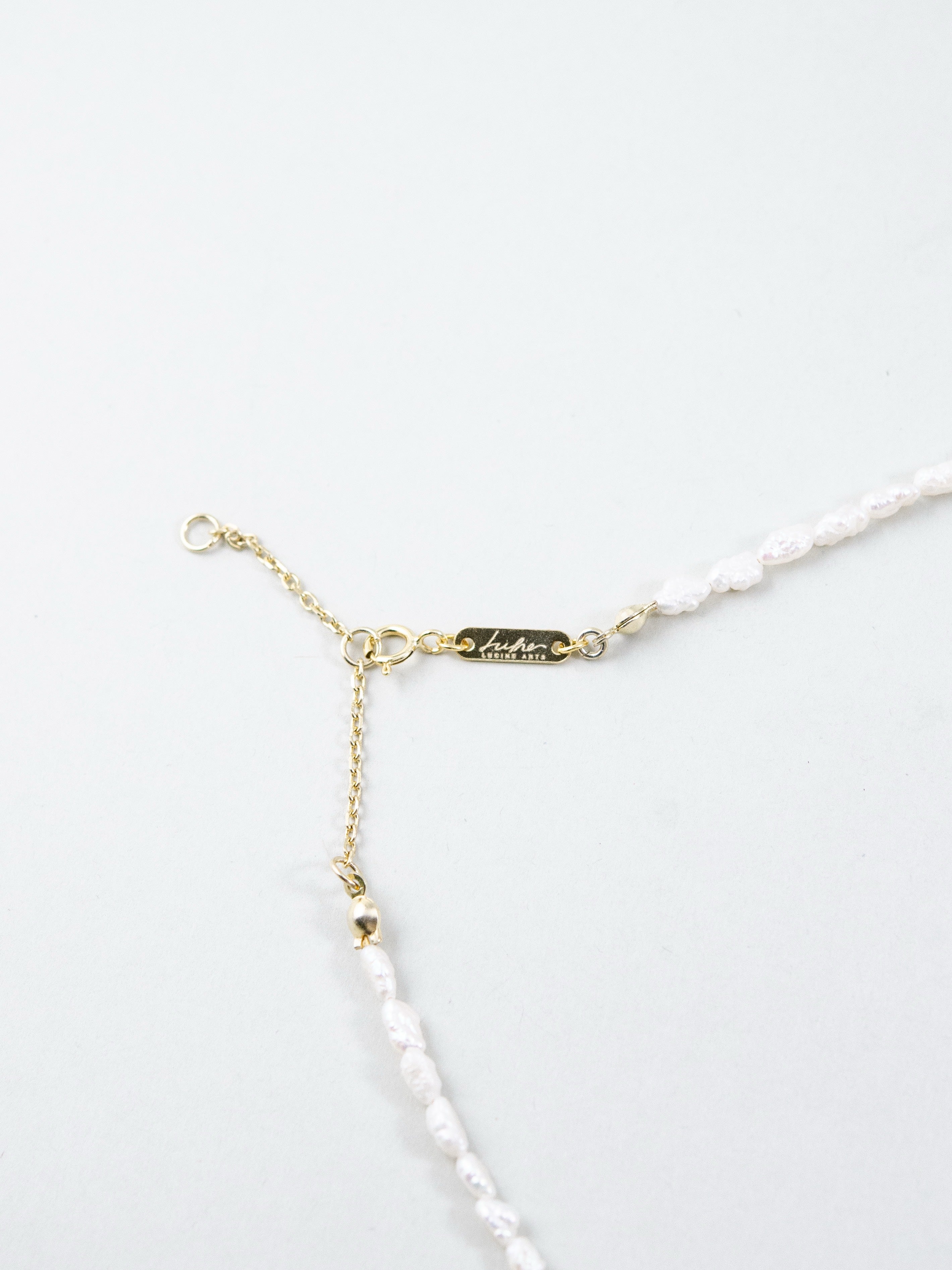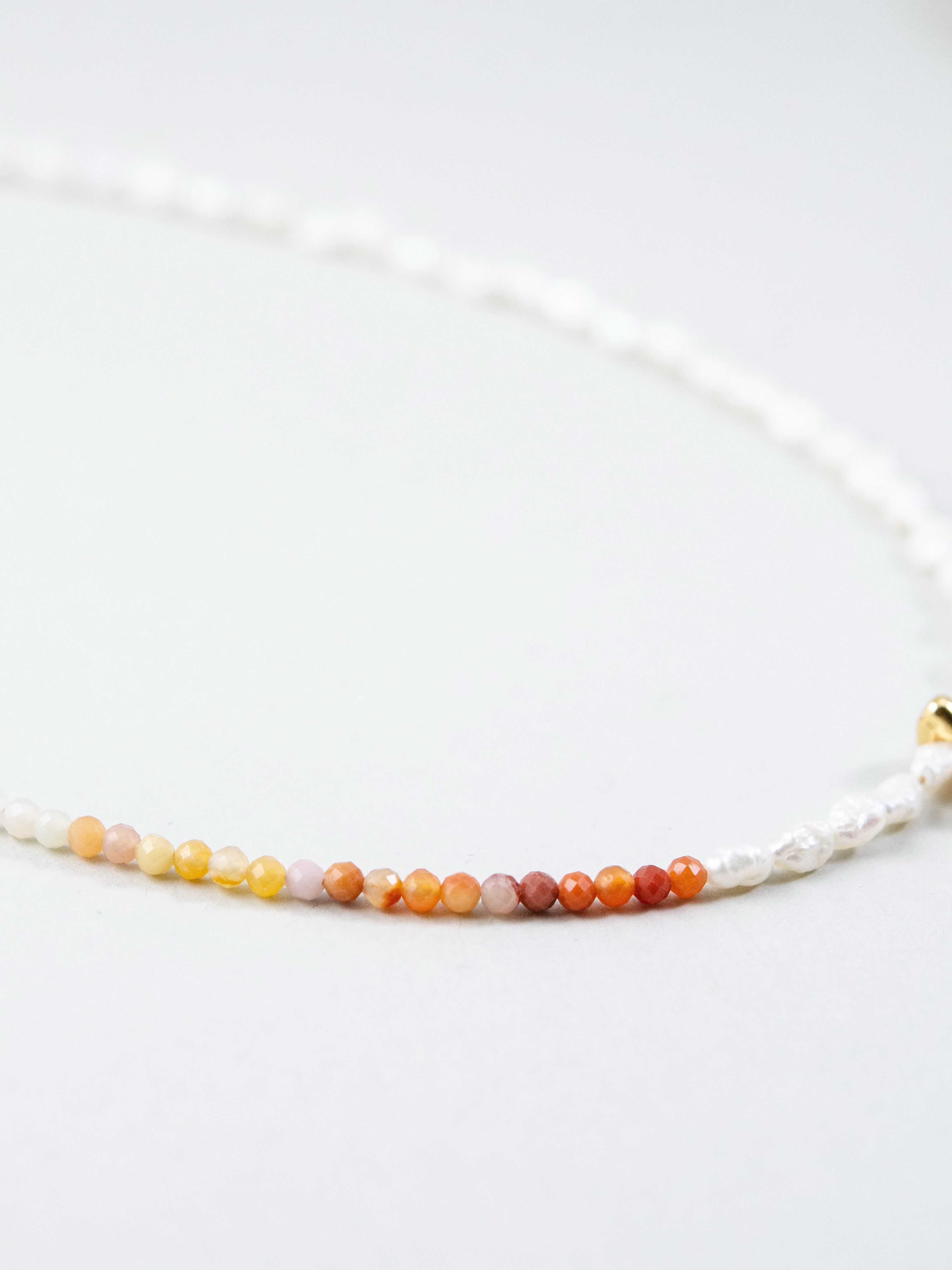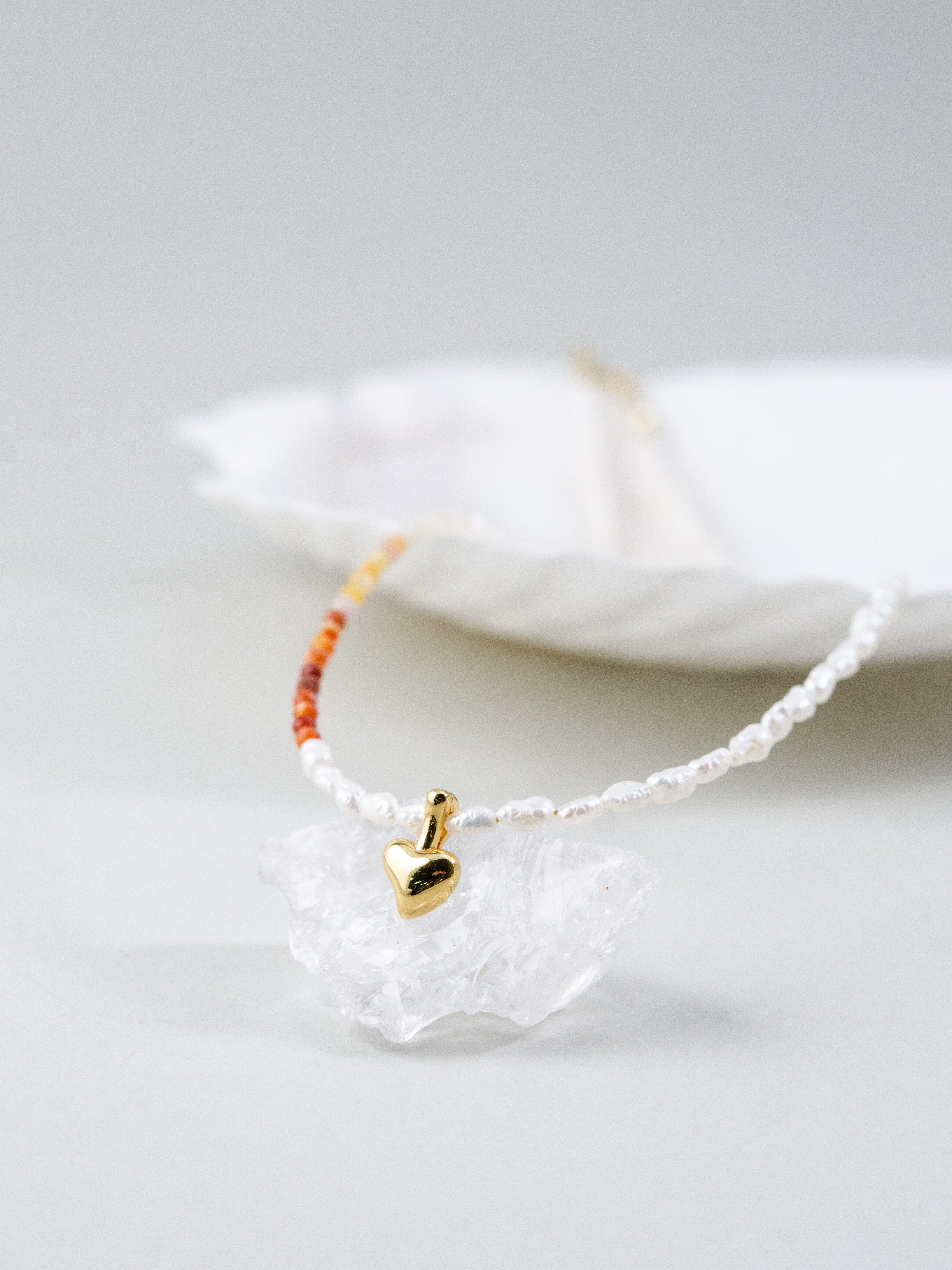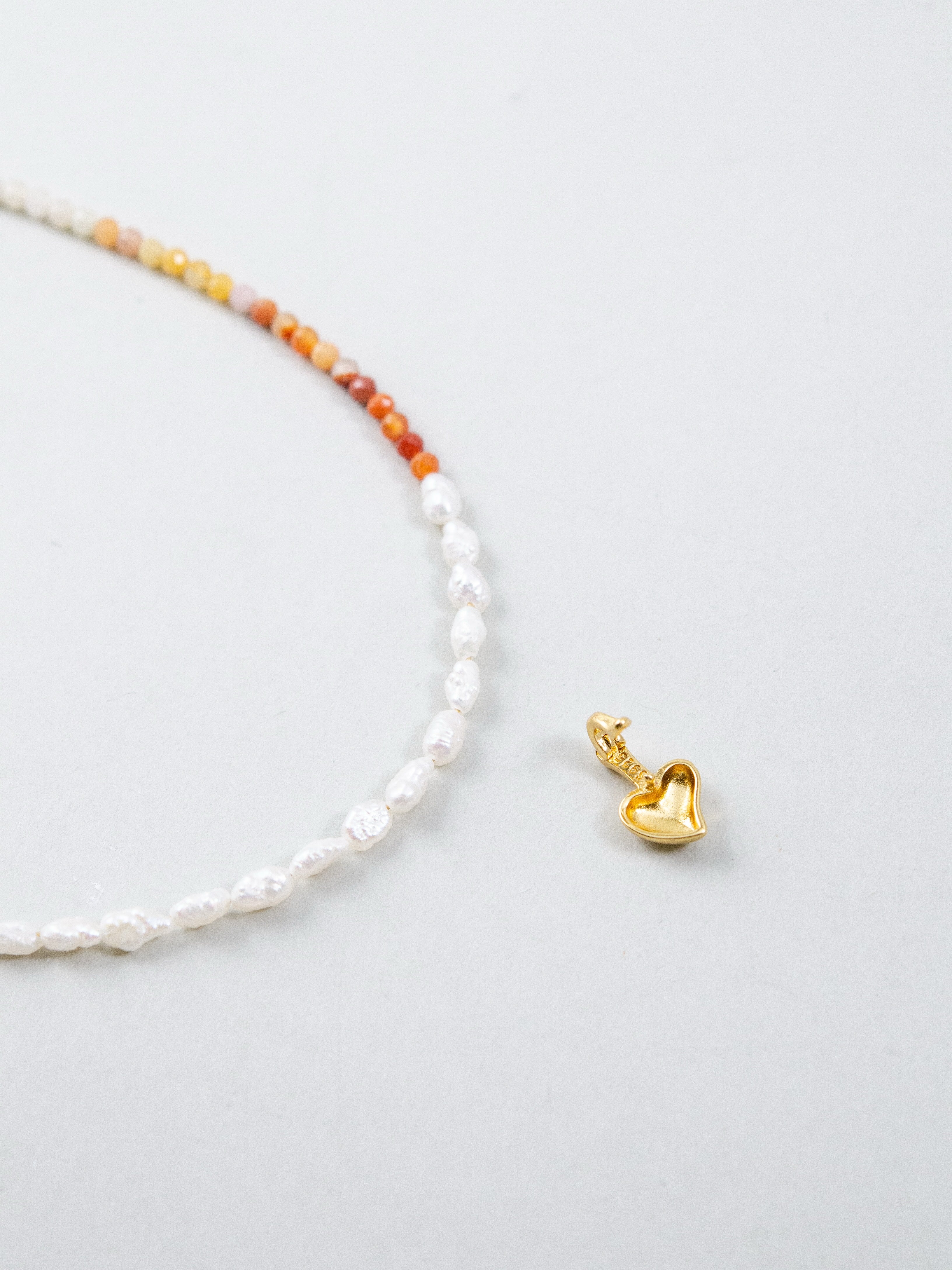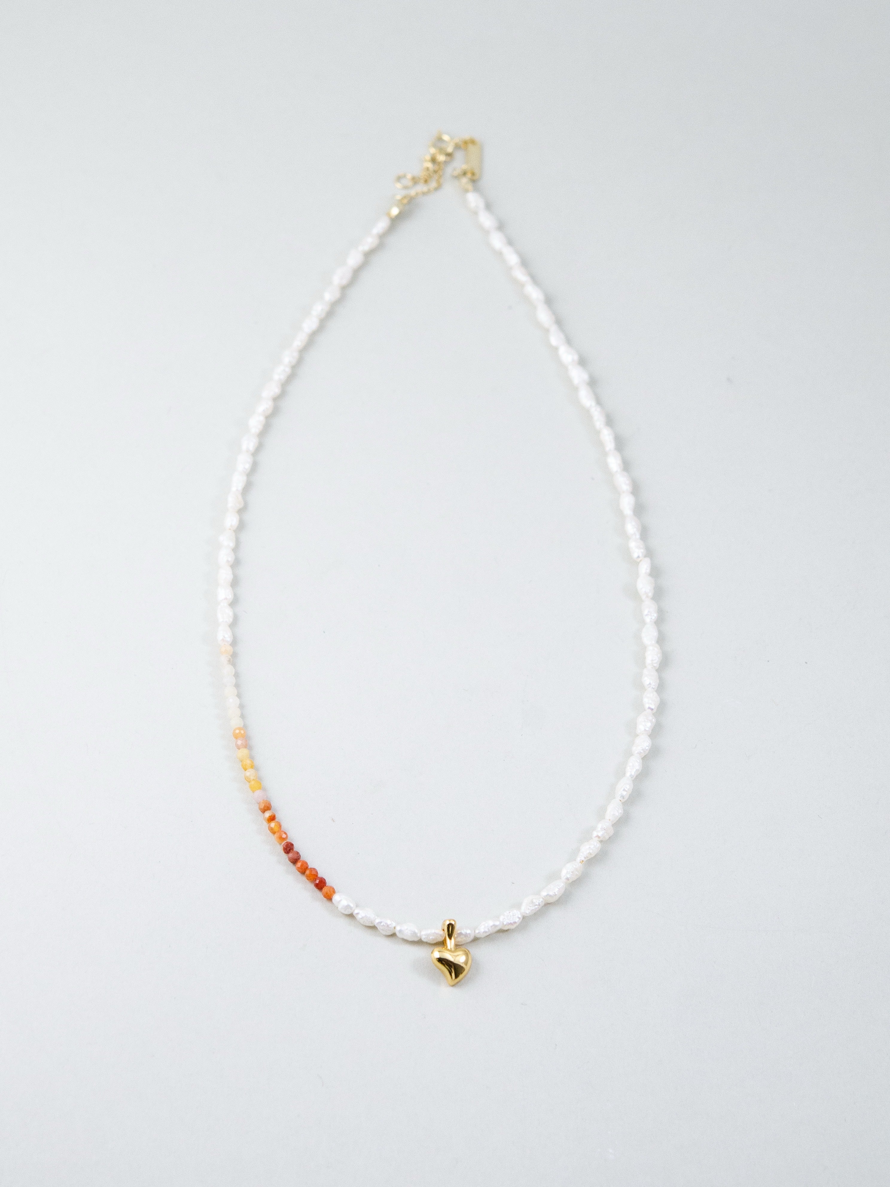 ナチュラルな淡水パールをベースに、オレンジのグラデーション天然石を片側にあしらった、遊び心のあるデザイン。まるで朝焼けの光を閉じ込めたような、やさしくあたたかい印象に仕上げています。中央にはゴールドのハートチャームがきらりと揺れ、無邪気で愛らしい雰囲気をプラス。毎日にささやかなトキメキを添えてくれるネックレスです。