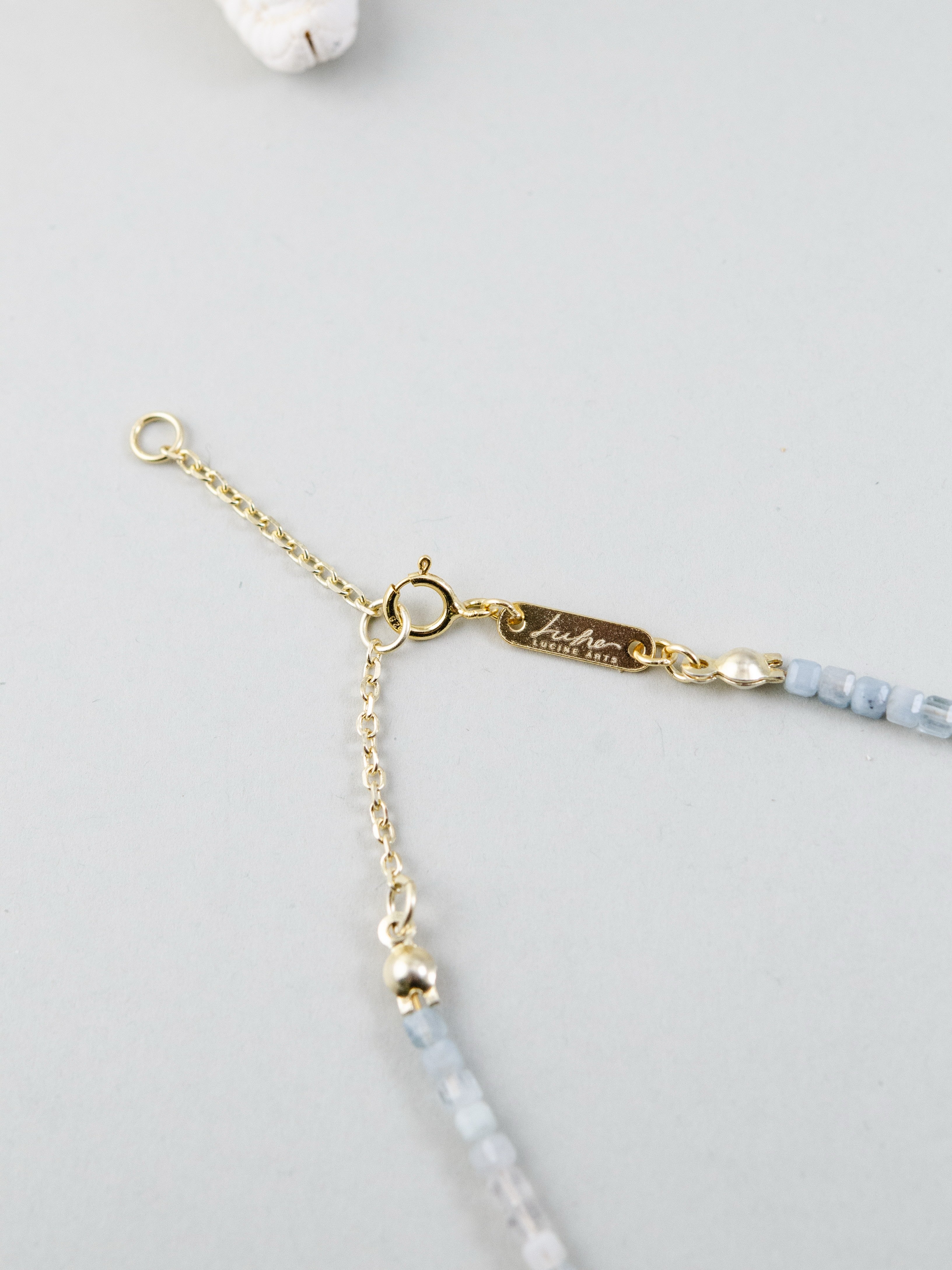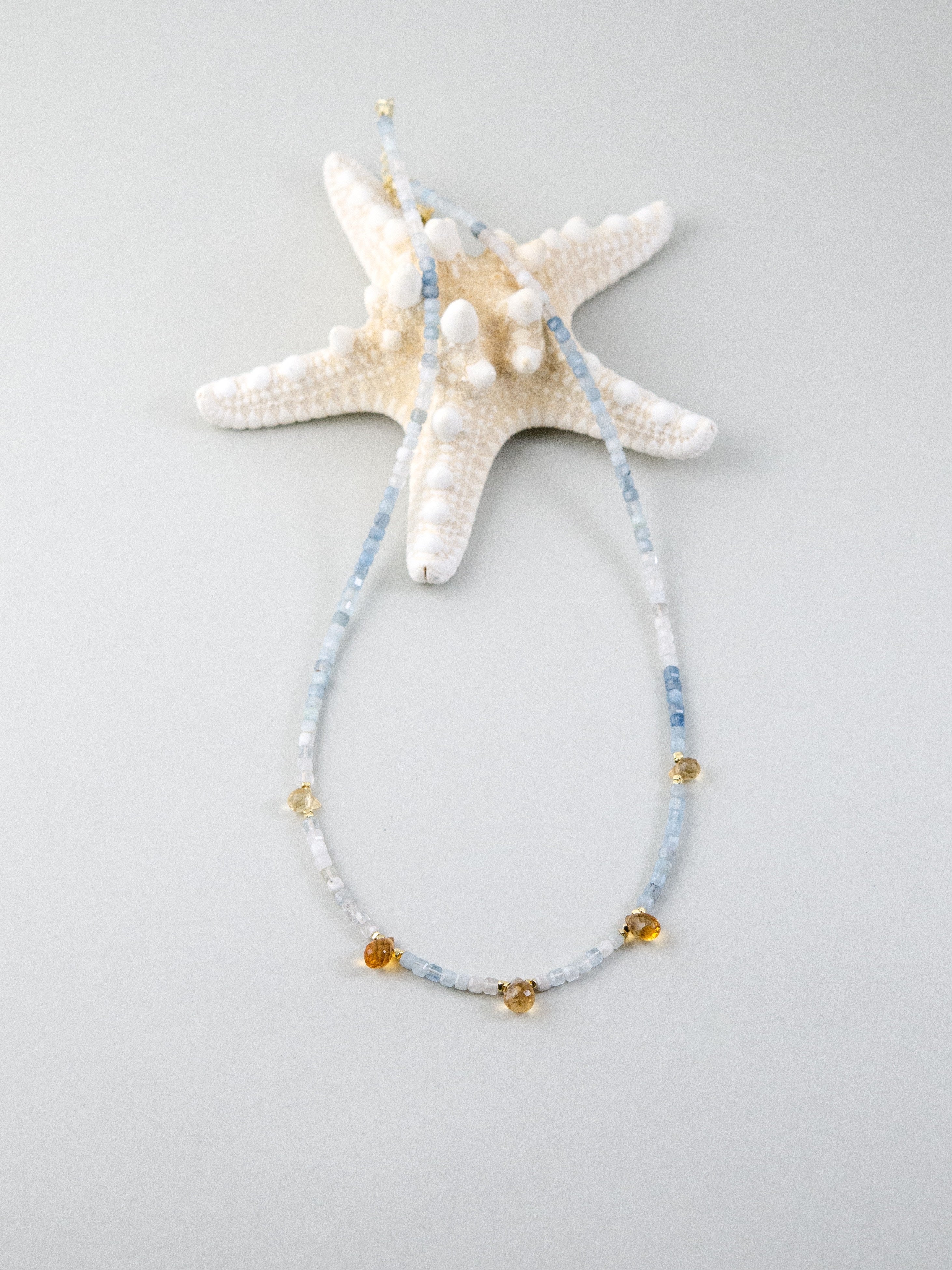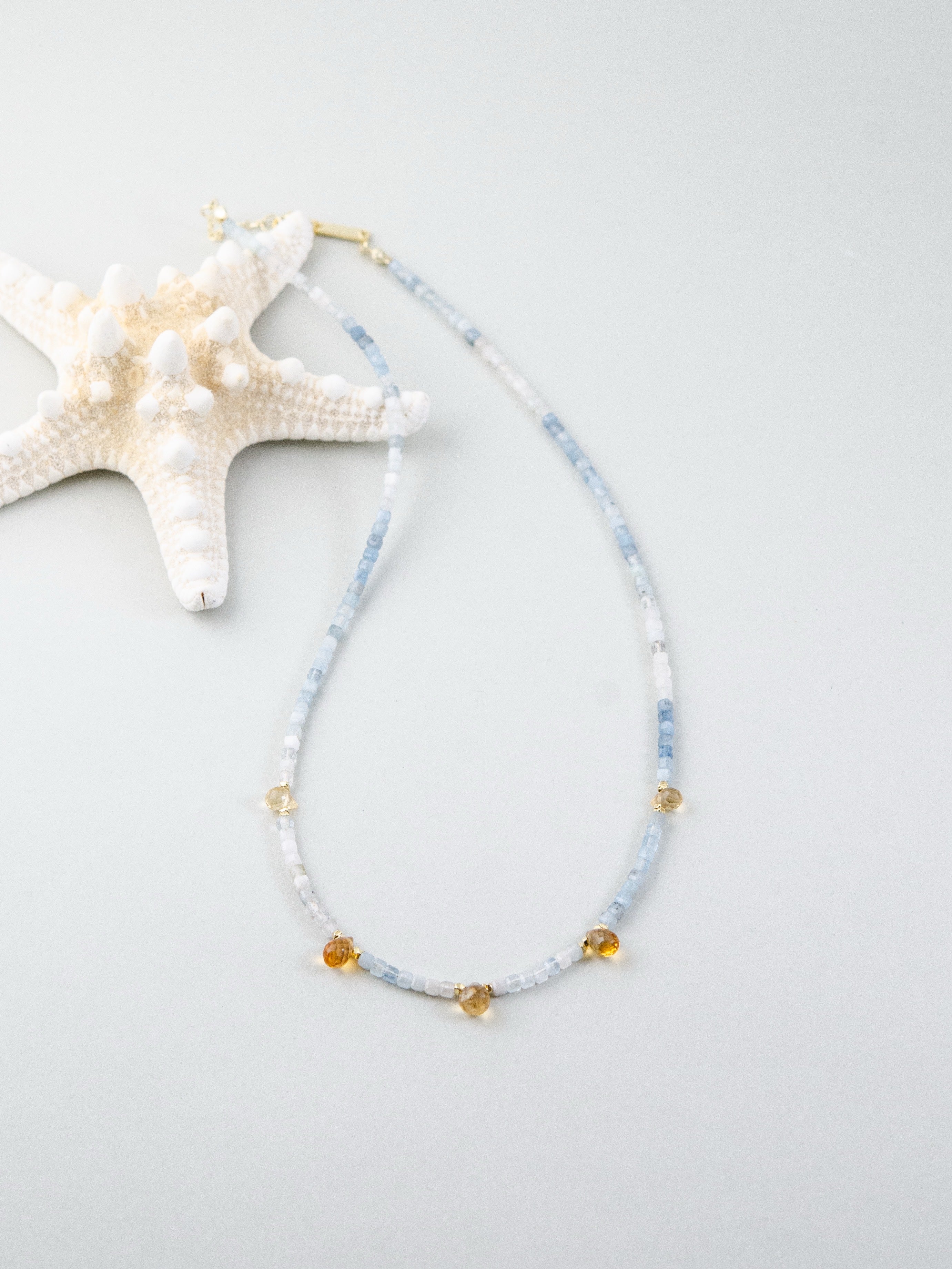 やわらかなブルーのグラデーションが美しいアクアマリンに、太陽のように輝くシトリンを水滴モチーフで添え、「海と光」をテーマに仕上げたネックレス。静けさと明るさが共存するデザインで、穏やかな癒しと前向きなエネルギーを感じさせます。
