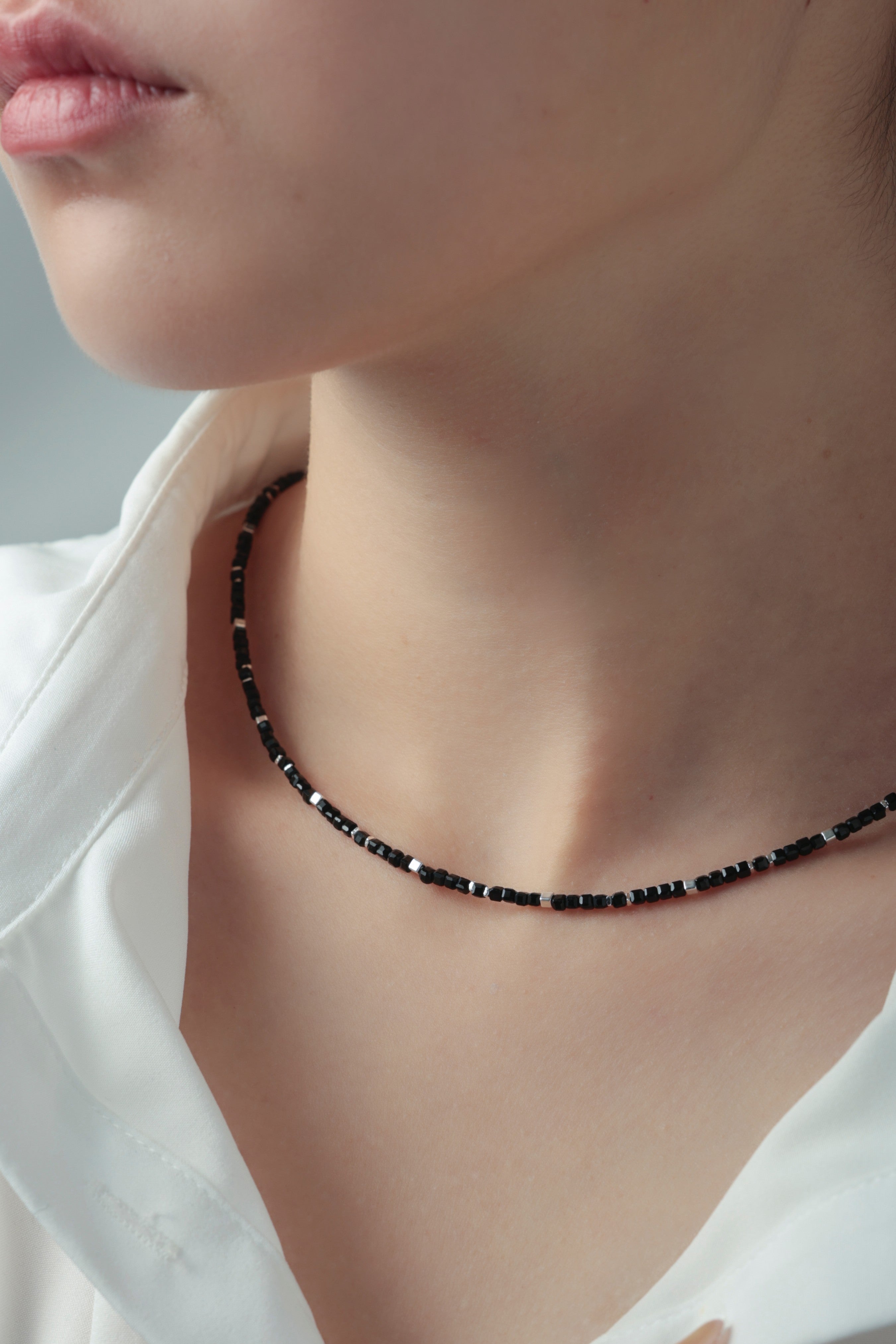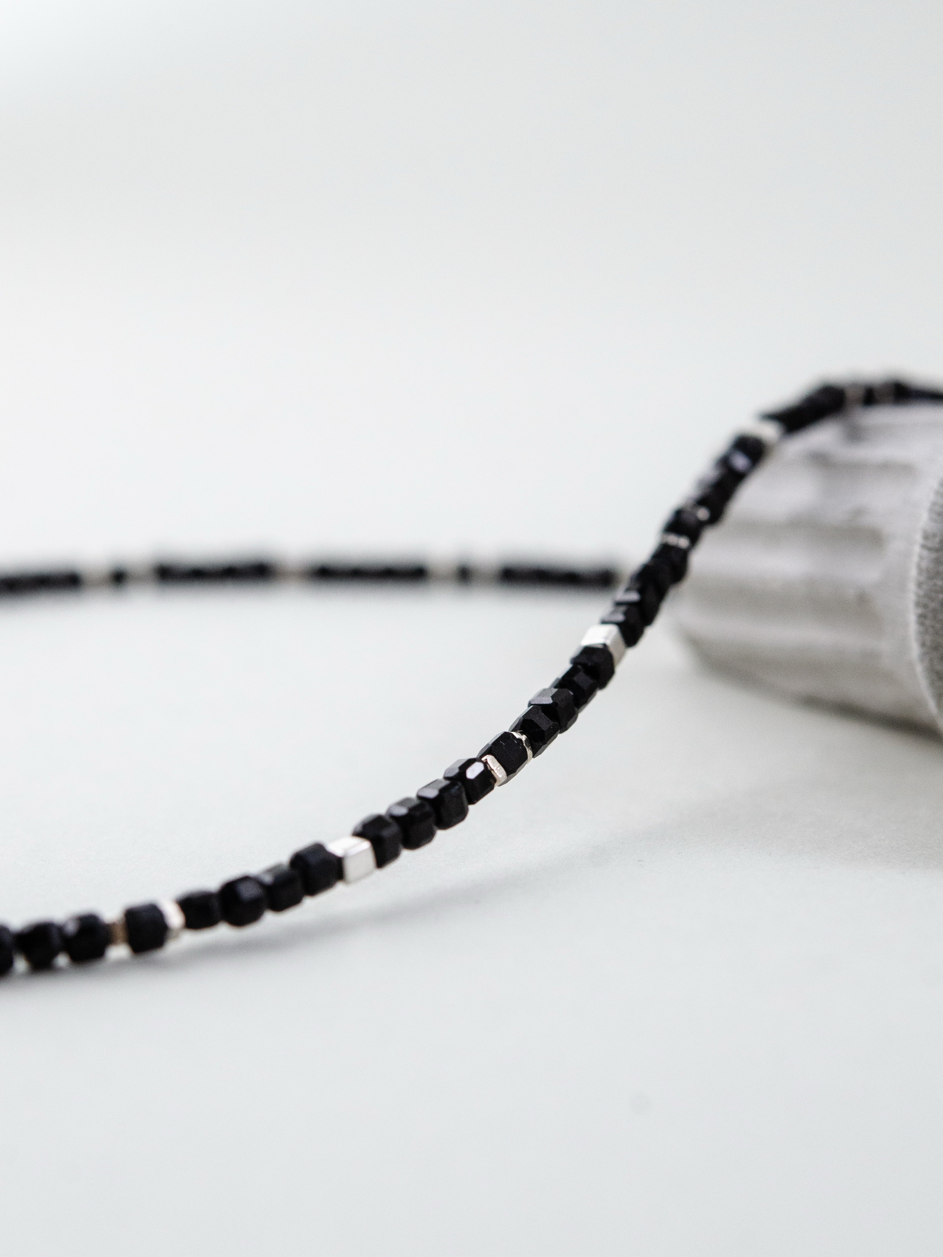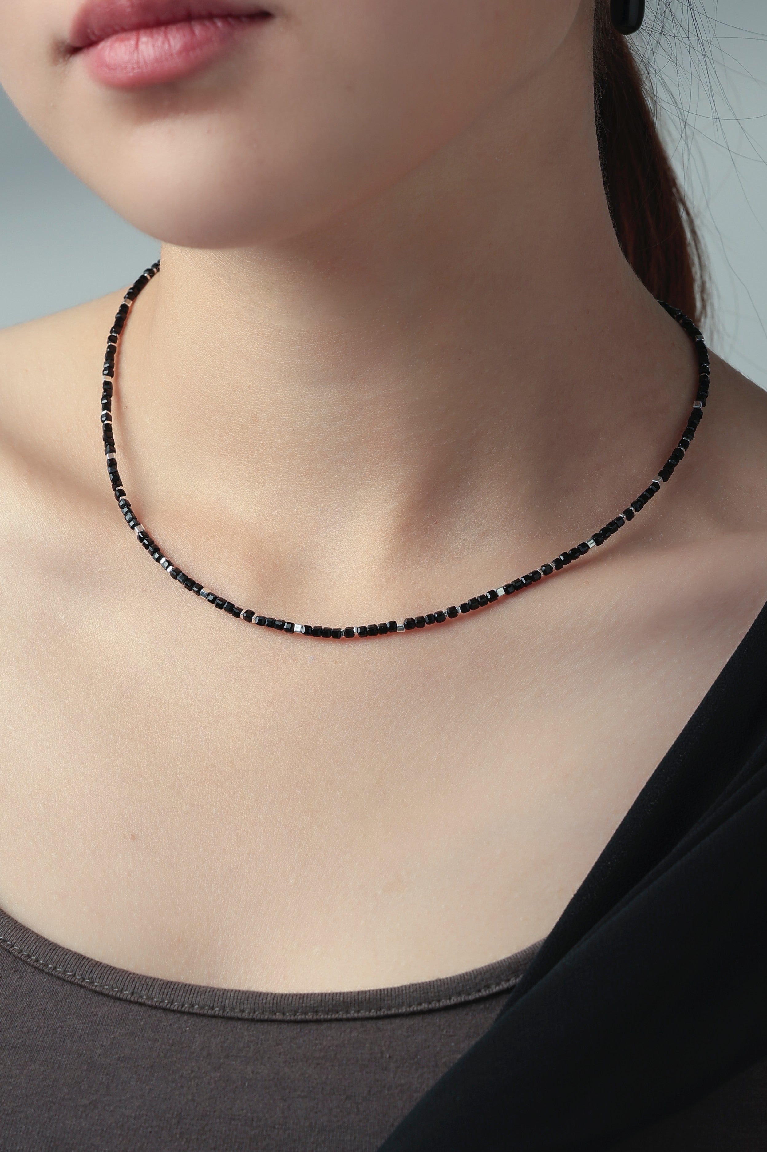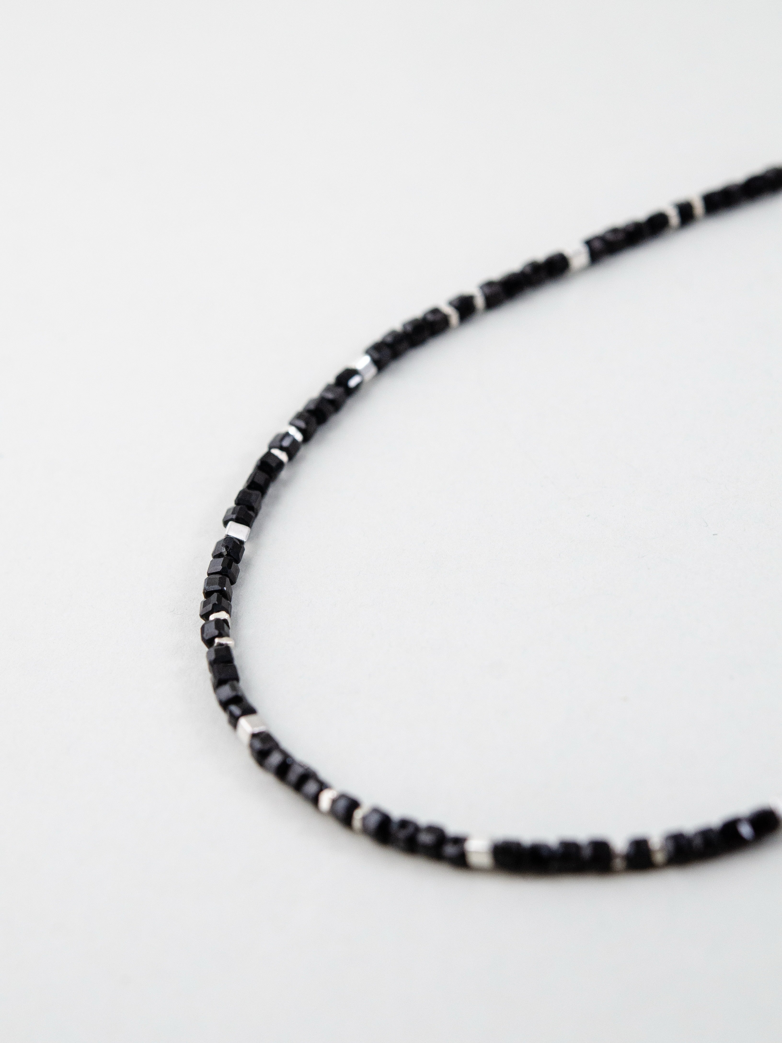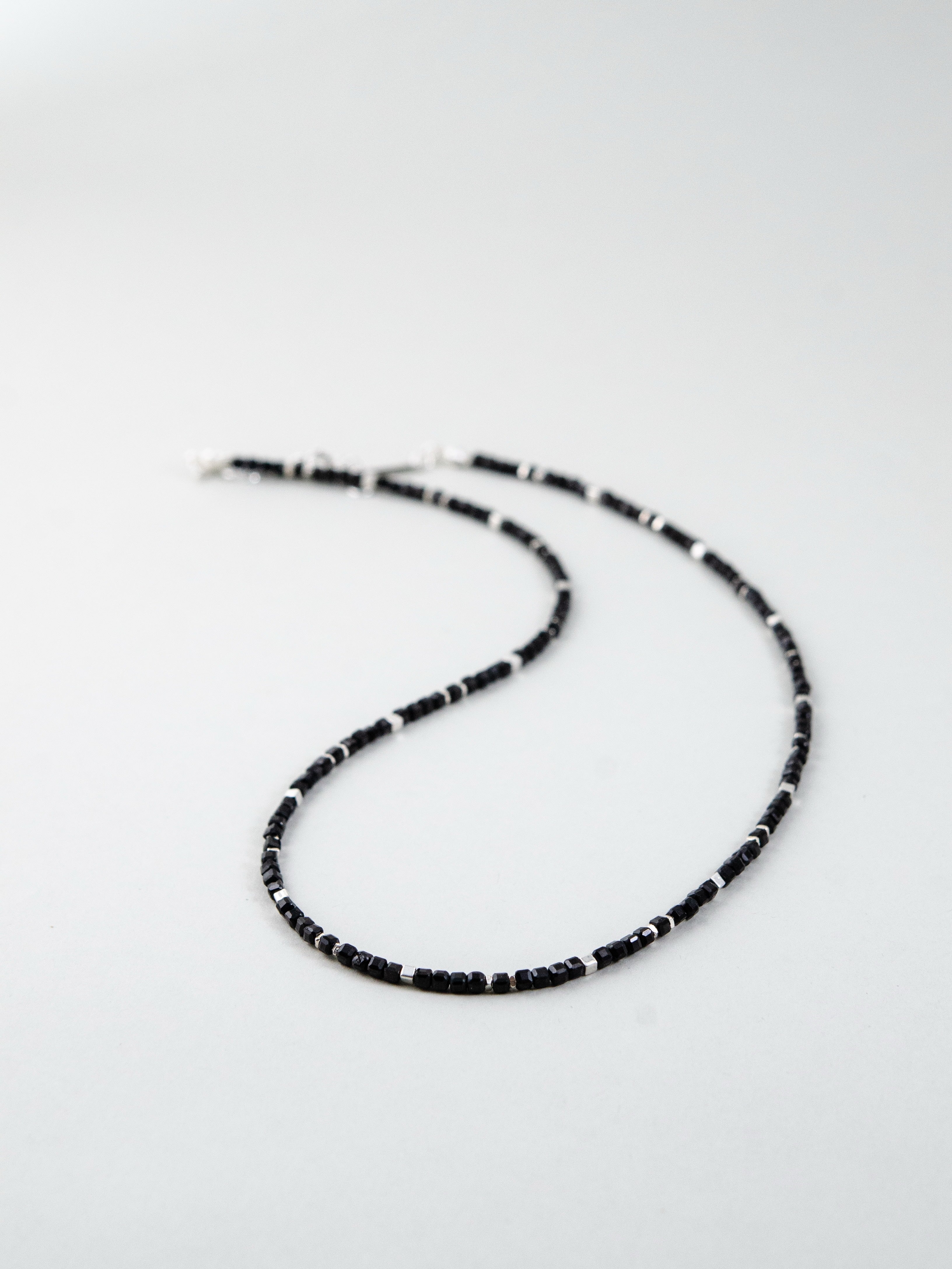 深みのあるブラックオニキスを使用した、ミニマルでスタイリッシュなネックレスです。カットの美しい輝きが控えめながらも確かな存在感を放ち、無駄を削ぎ落としたシンプルなデザインが静かに強さと品格を語ります。さりげなく個性を演出したい方にぴったりの一本です。