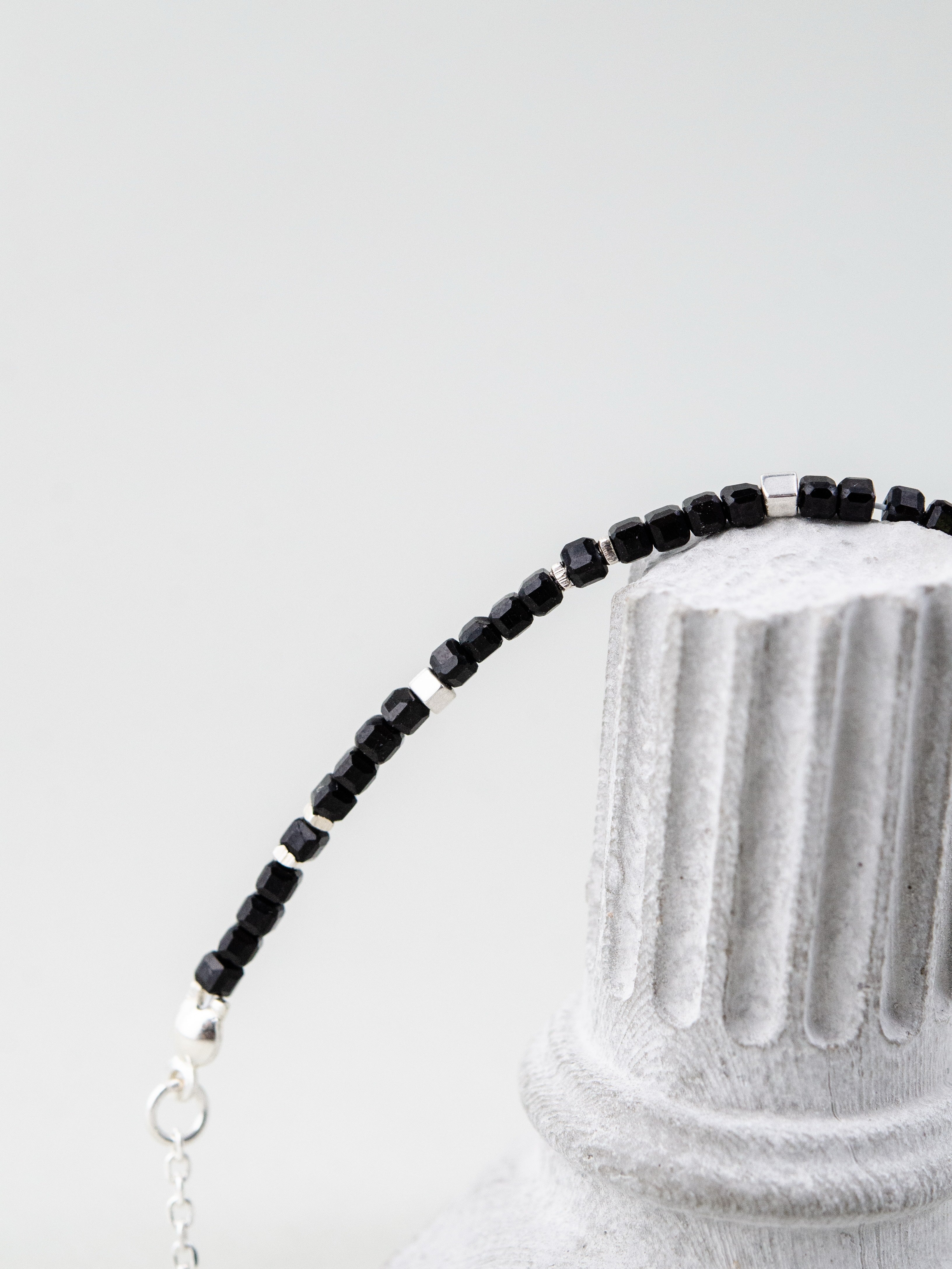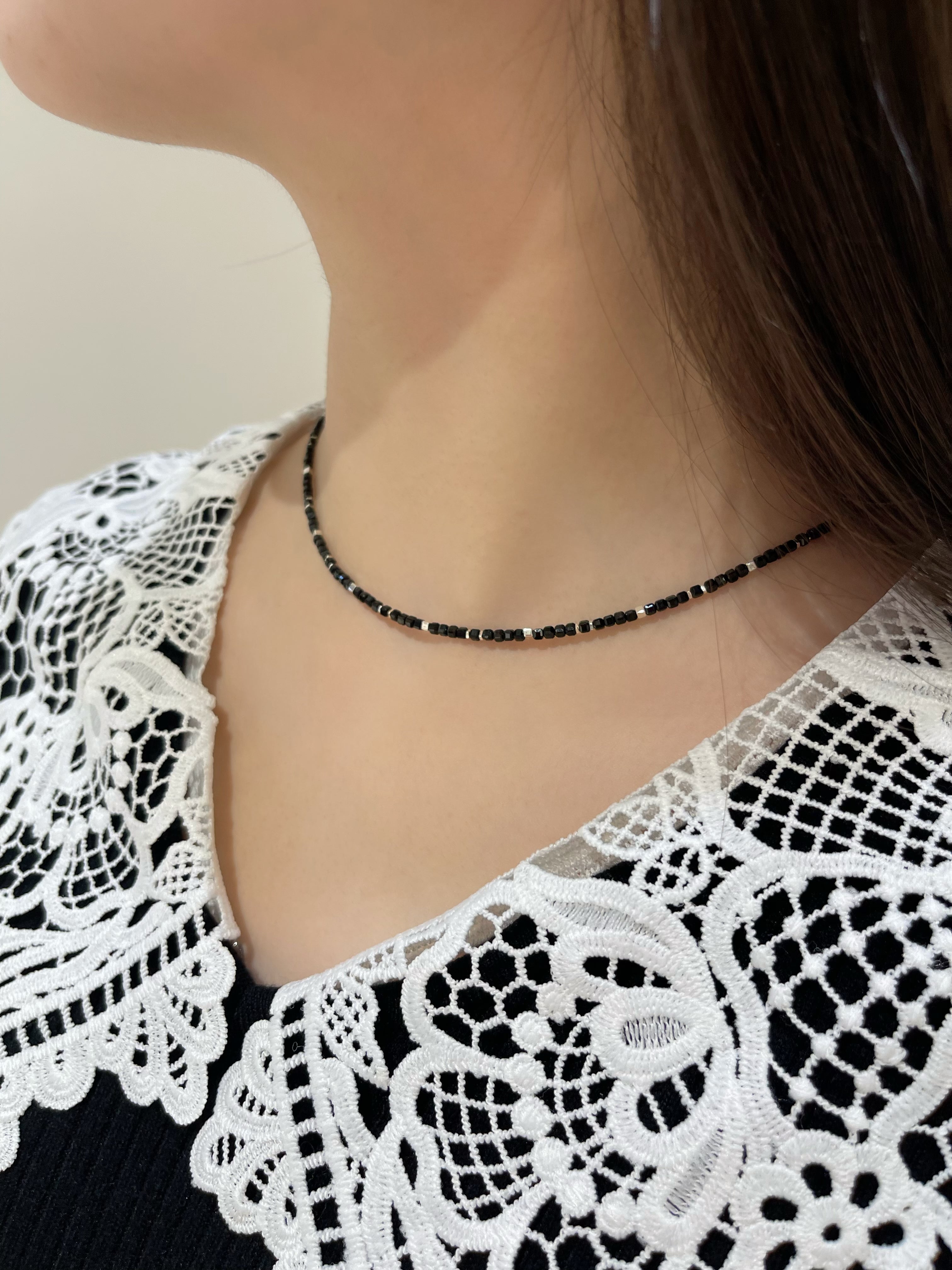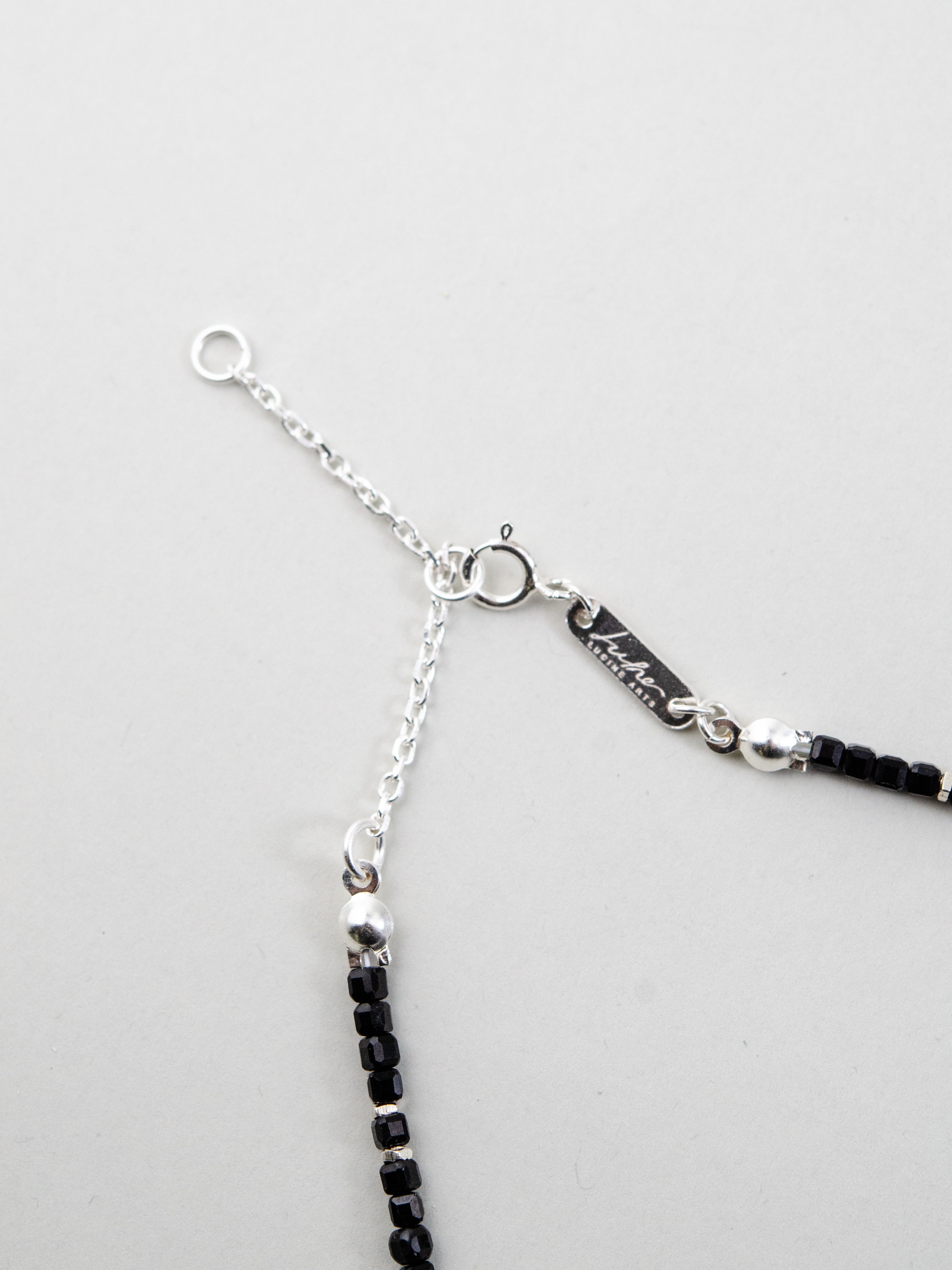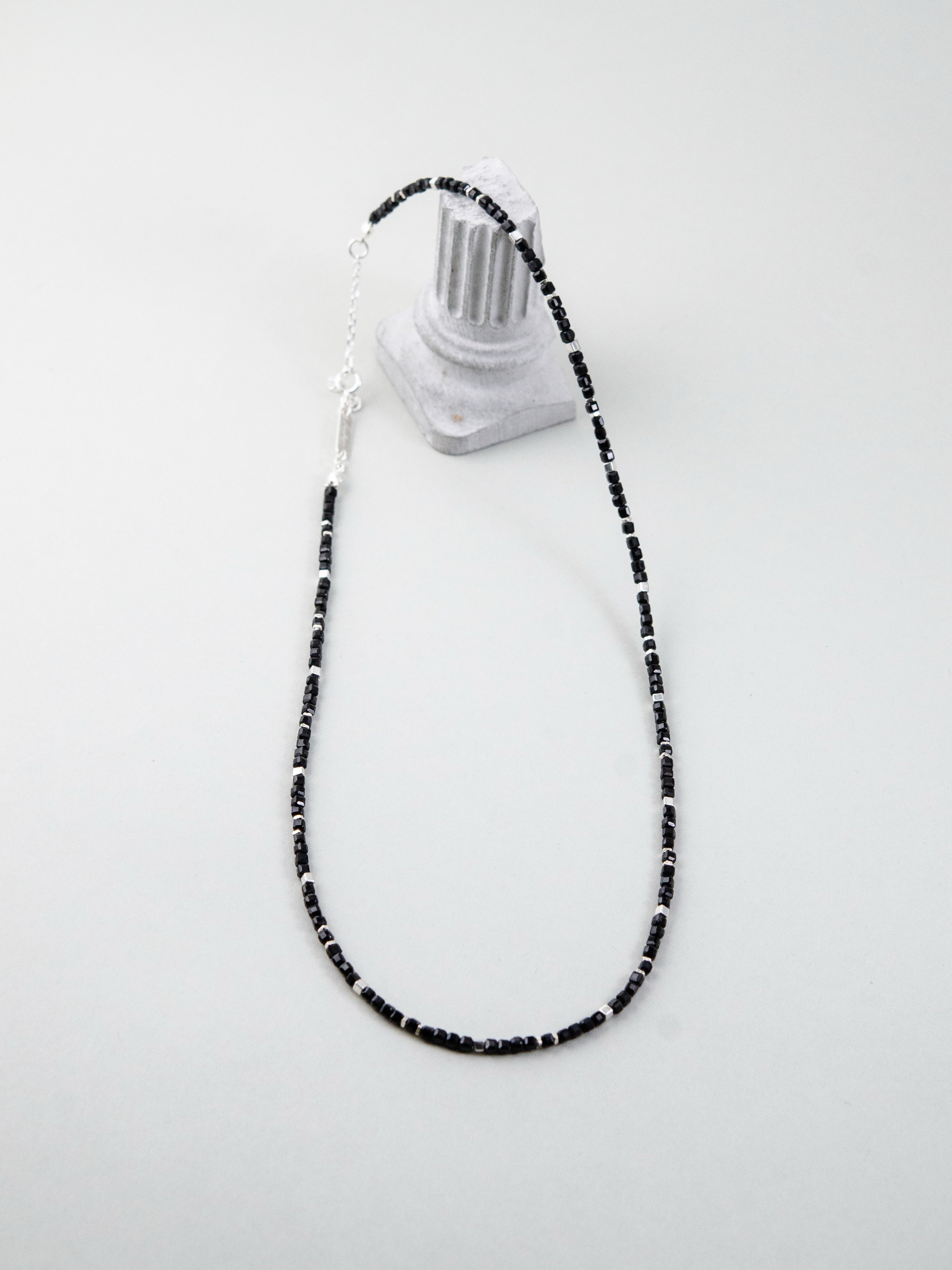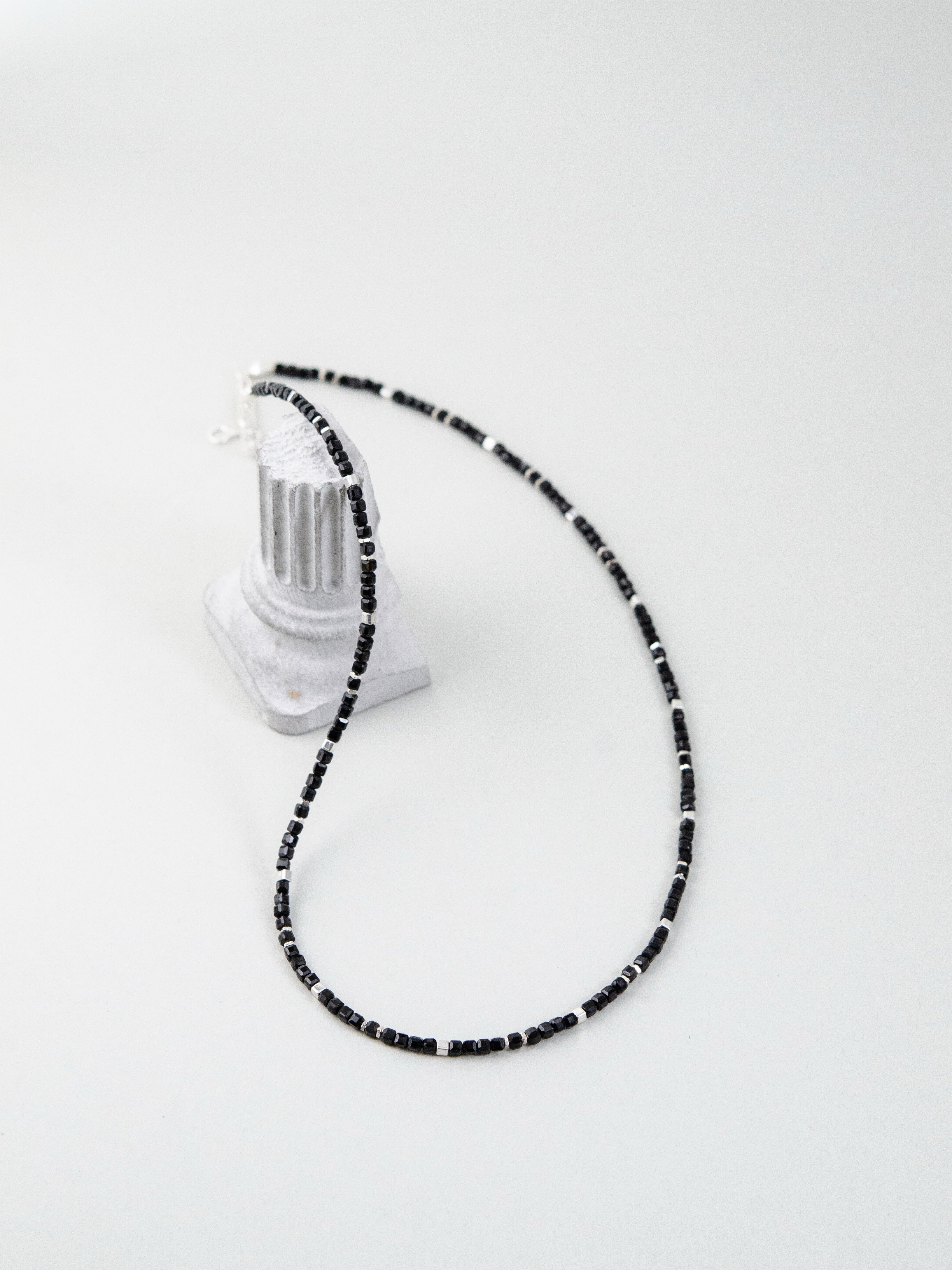 深みのあるブラックオニキスを使用した、ミニマルでスタイリッシュなネックレスです。カットの美しい輝きが控えめながらも確かな存在感を放ち、無駄を削ぎ落としたシンプルなデザインが静かに強さと品格を語ります。さりげなく個性を演出したい方にぴったりの一本です。