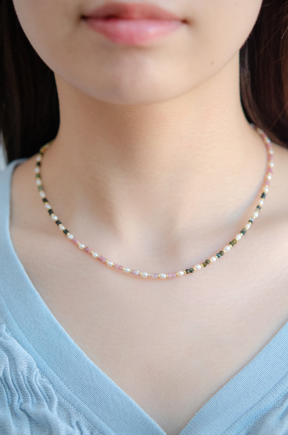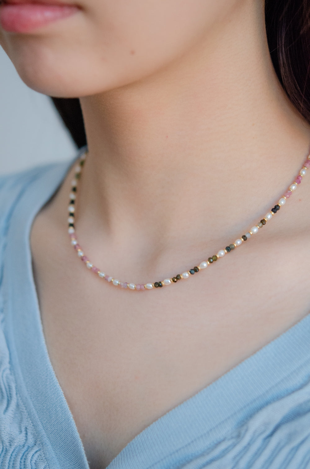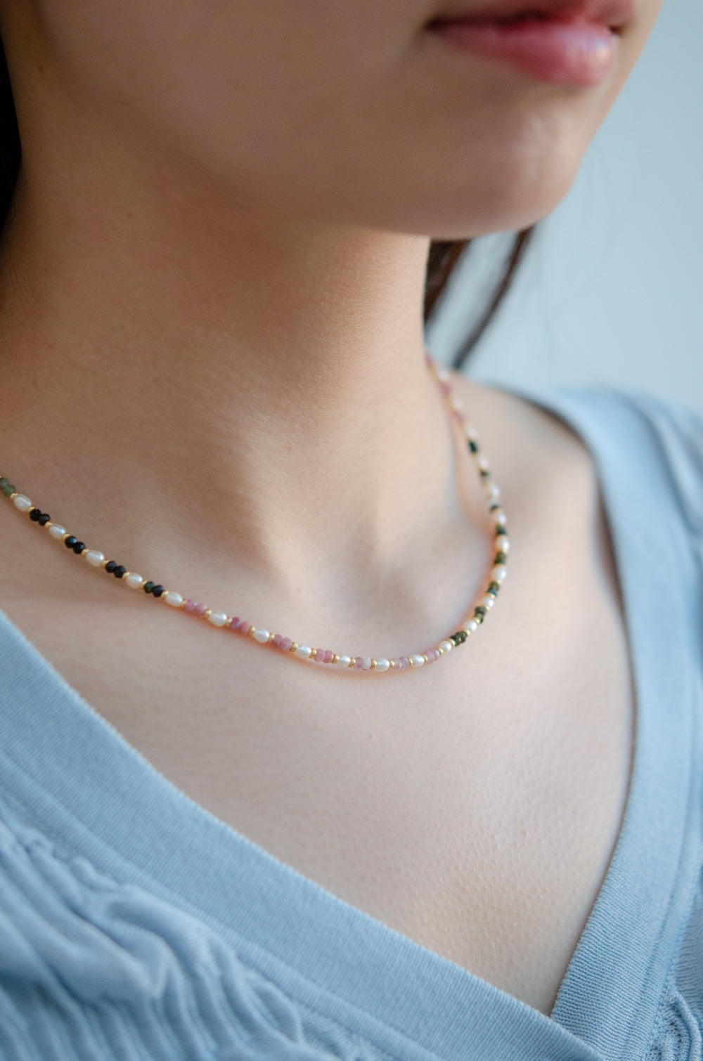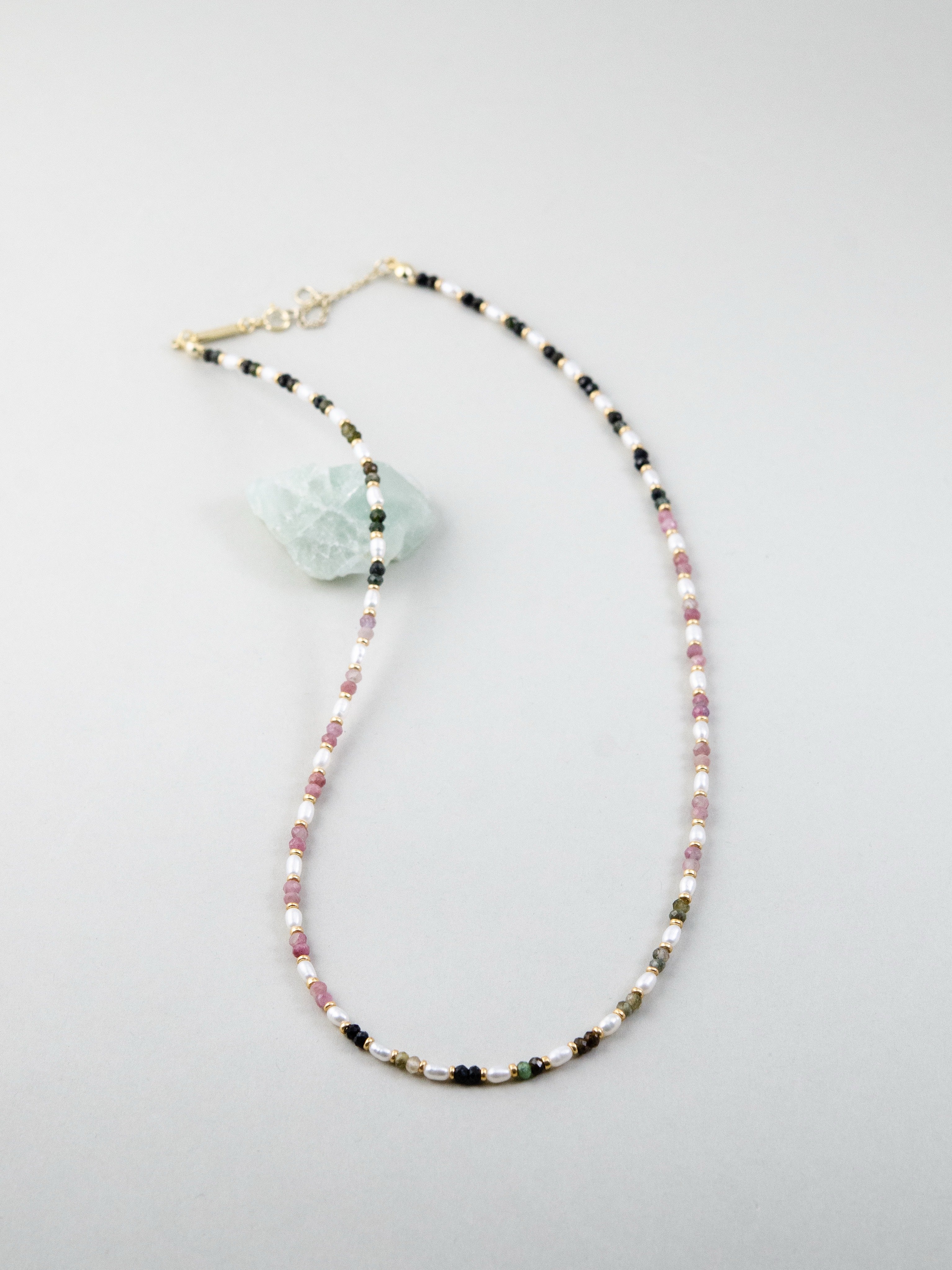 ナチュラルなマルチカラートルマリンをスクエアカットで仕立てた、洗練感のあるネックレスです。ホワイト・ピンク・ブラウン・ブラックの色がグラデーションのように変化し、まるで心の移ろいを表現しているかのようなデザイン。角のあるビーズがシャープさを、やわらかな色合いがやさしさを演出し、静けさの中でも自分らしさを大切にできる一本です。