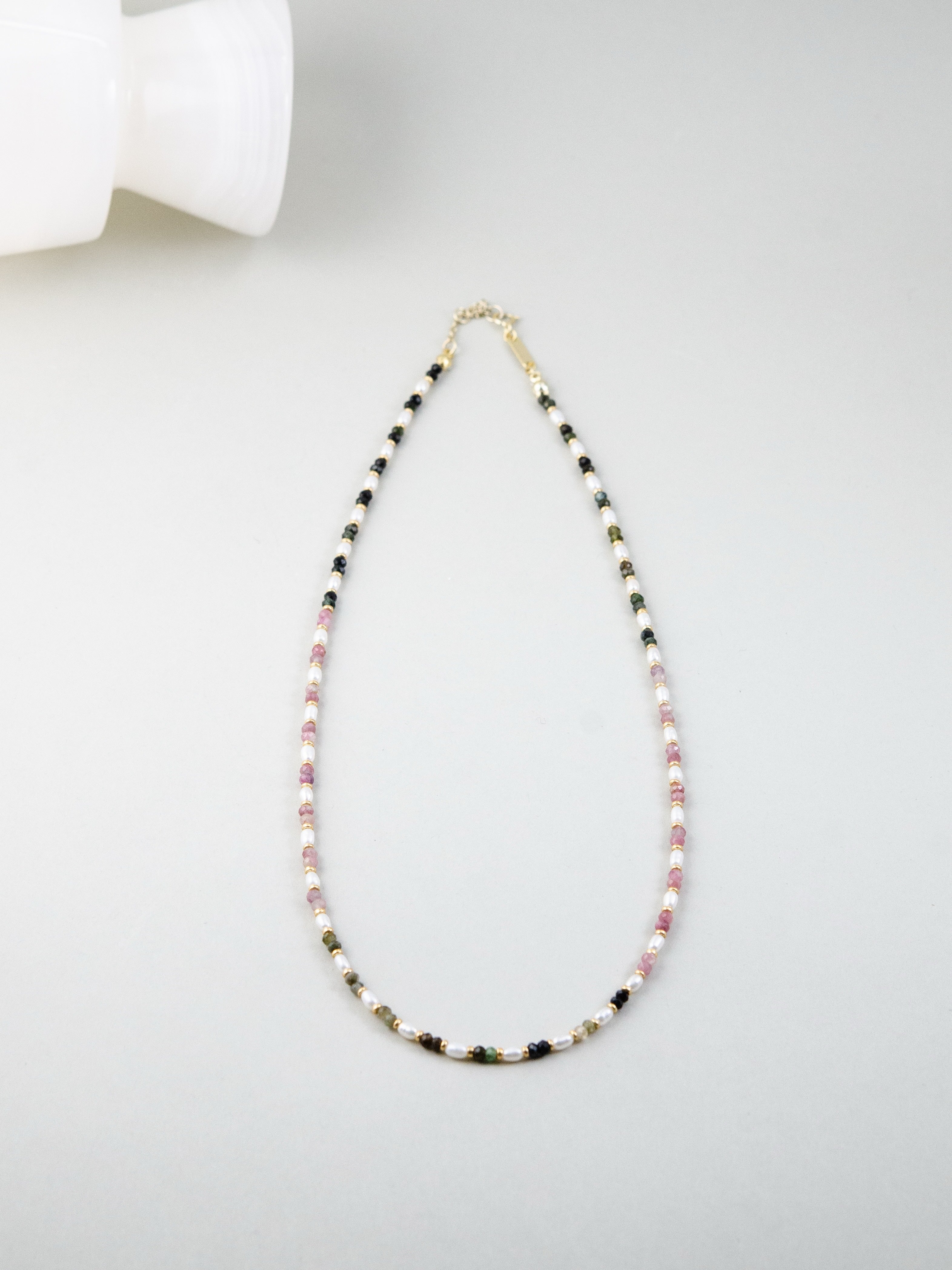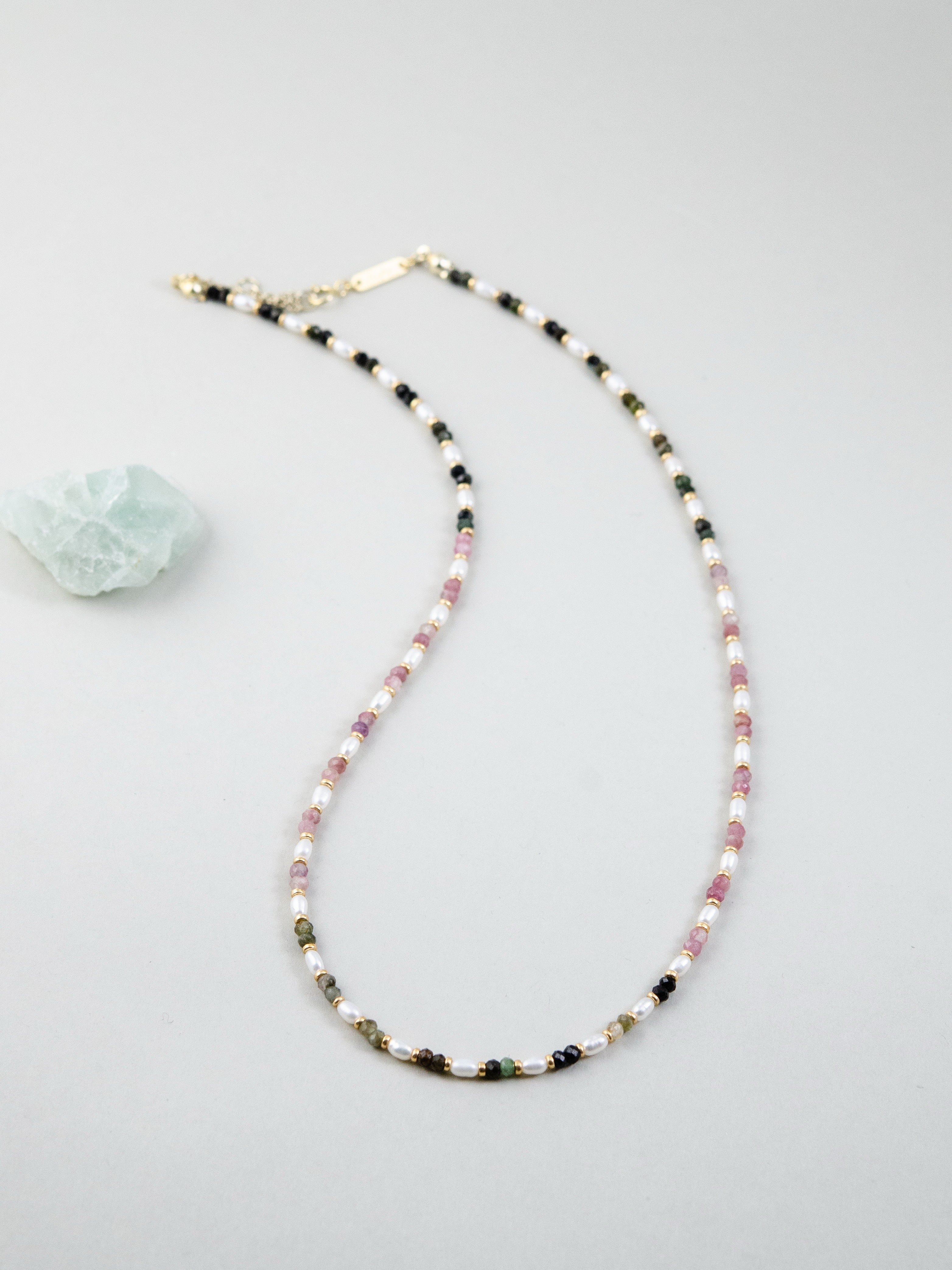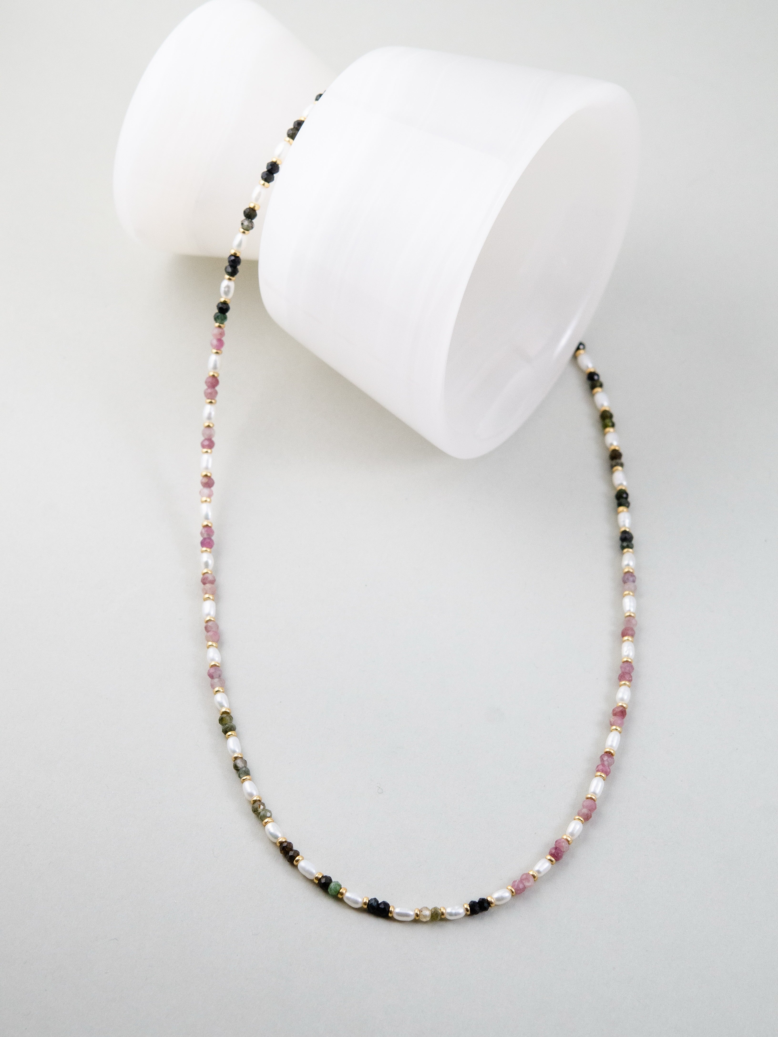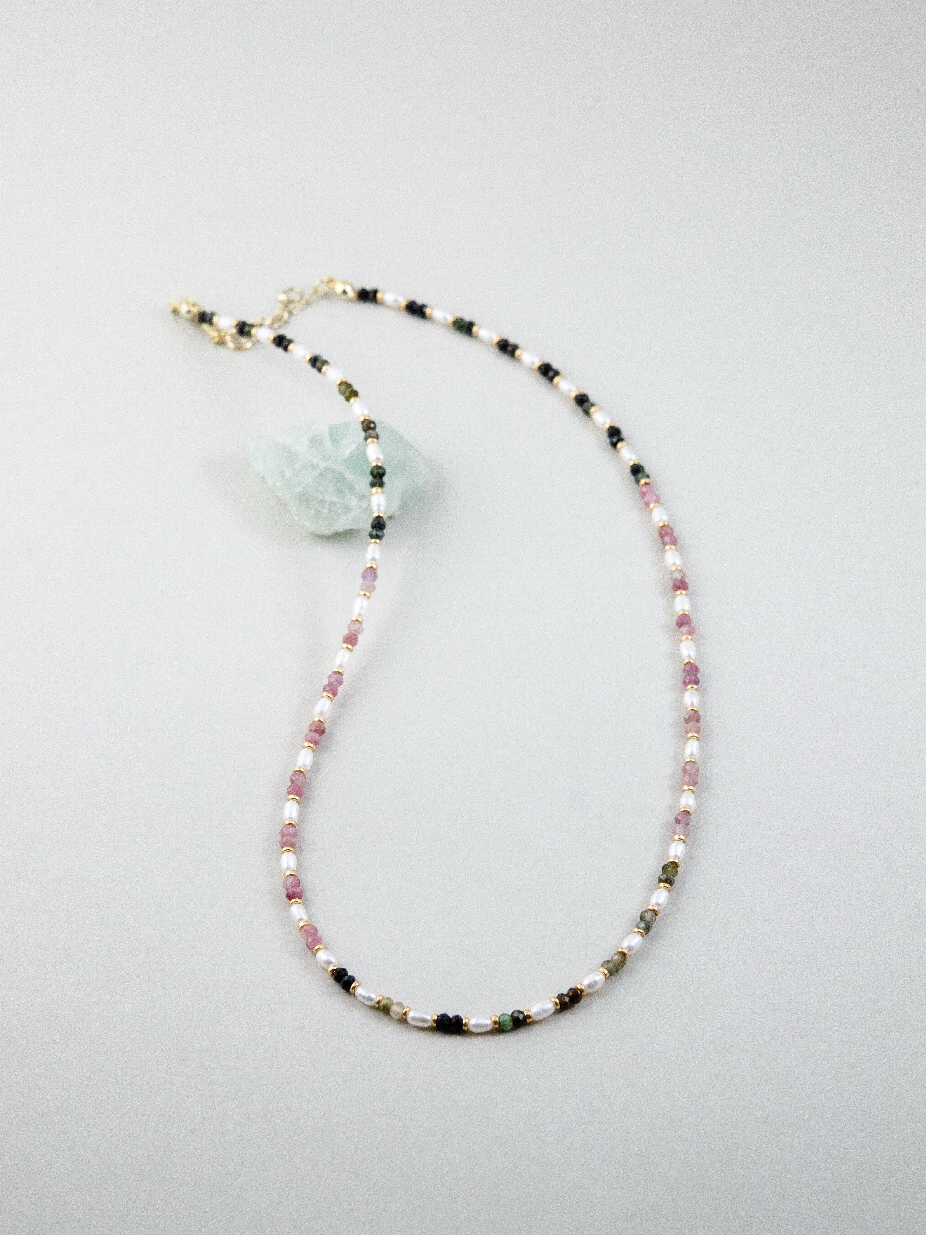ナチュラルなマルチカラートルマリンをスクエアカットで仕立てた、洗練感のあるネックレスです。ホワイト・ピンク・ブラウン・ブラックの色がグラデーションのように変化し、まるで心の移ろいを表現しているかのようなデザイン。角のあるビーズがシャープさを、やわらかな色合いがやさしさを演出し、静けさの中でも自分らしさを大切にできる一本です。