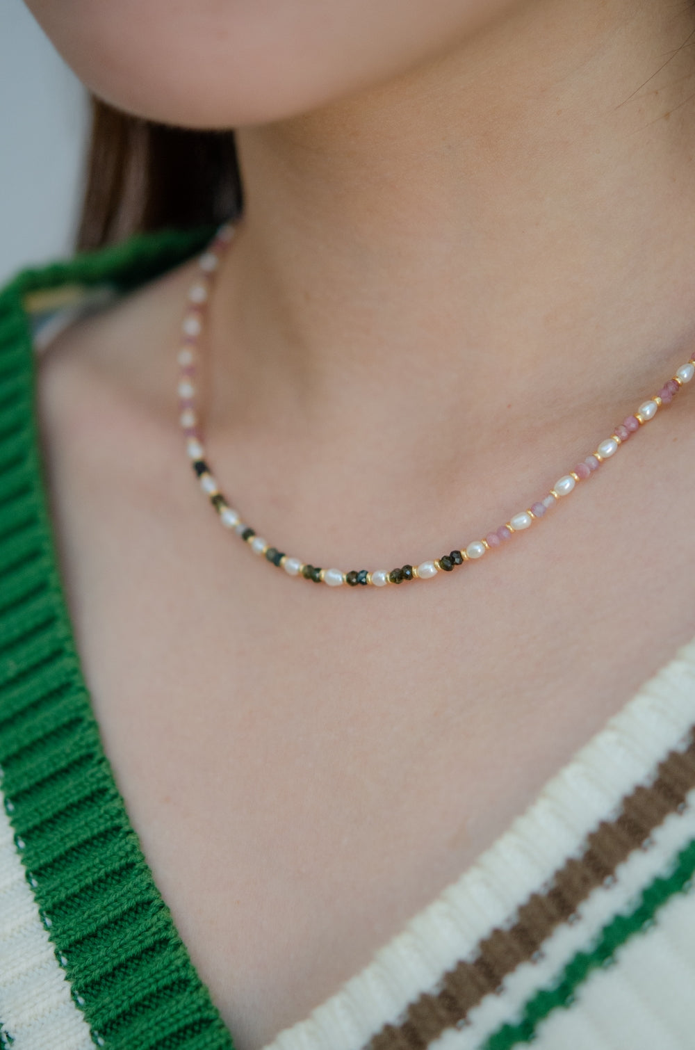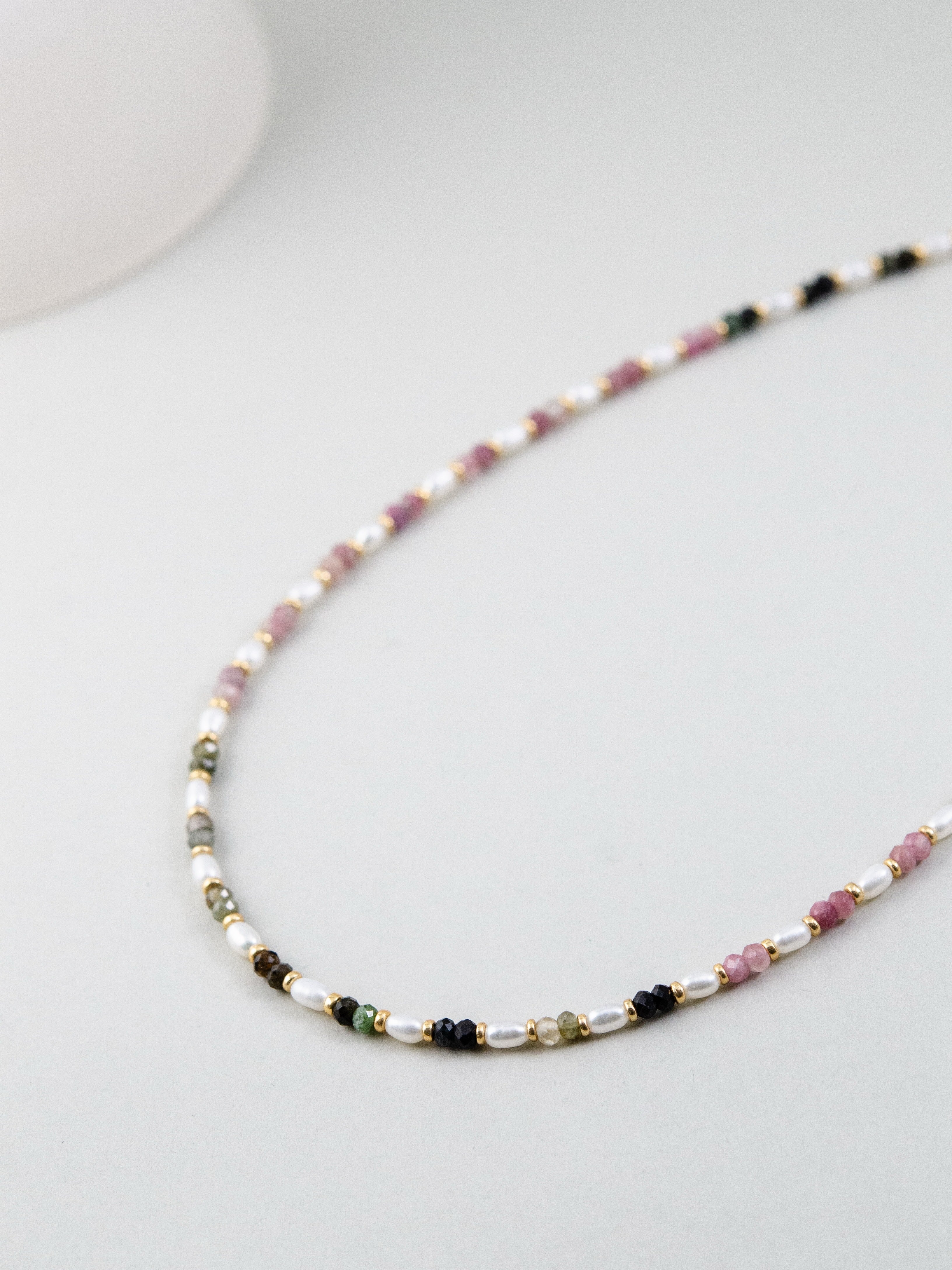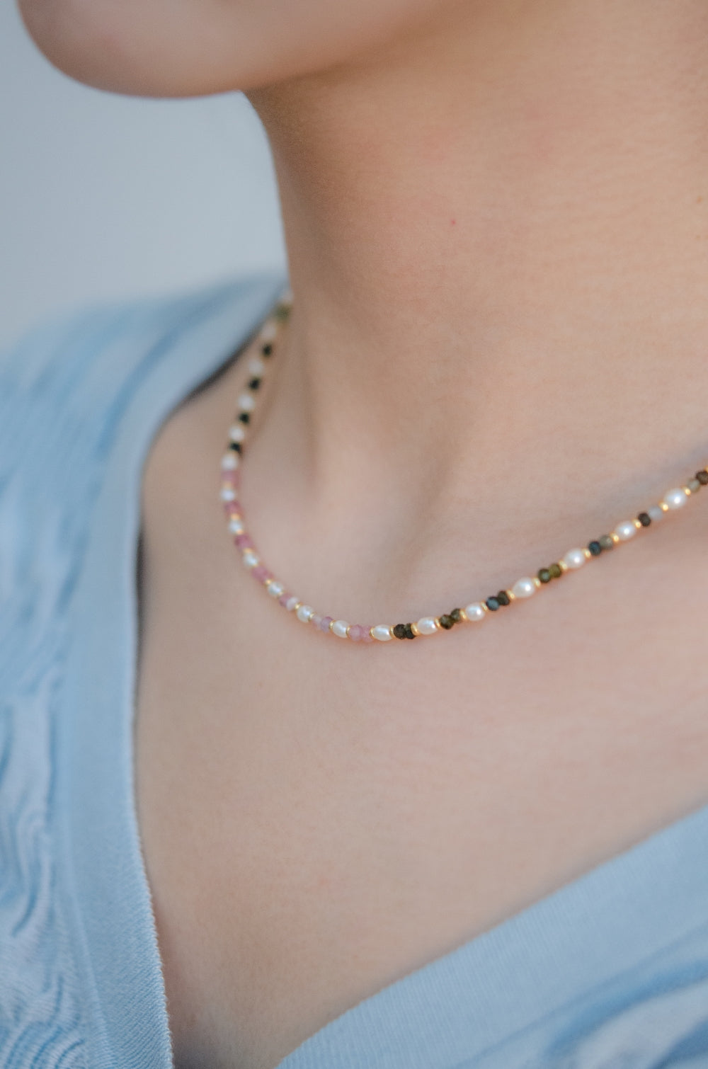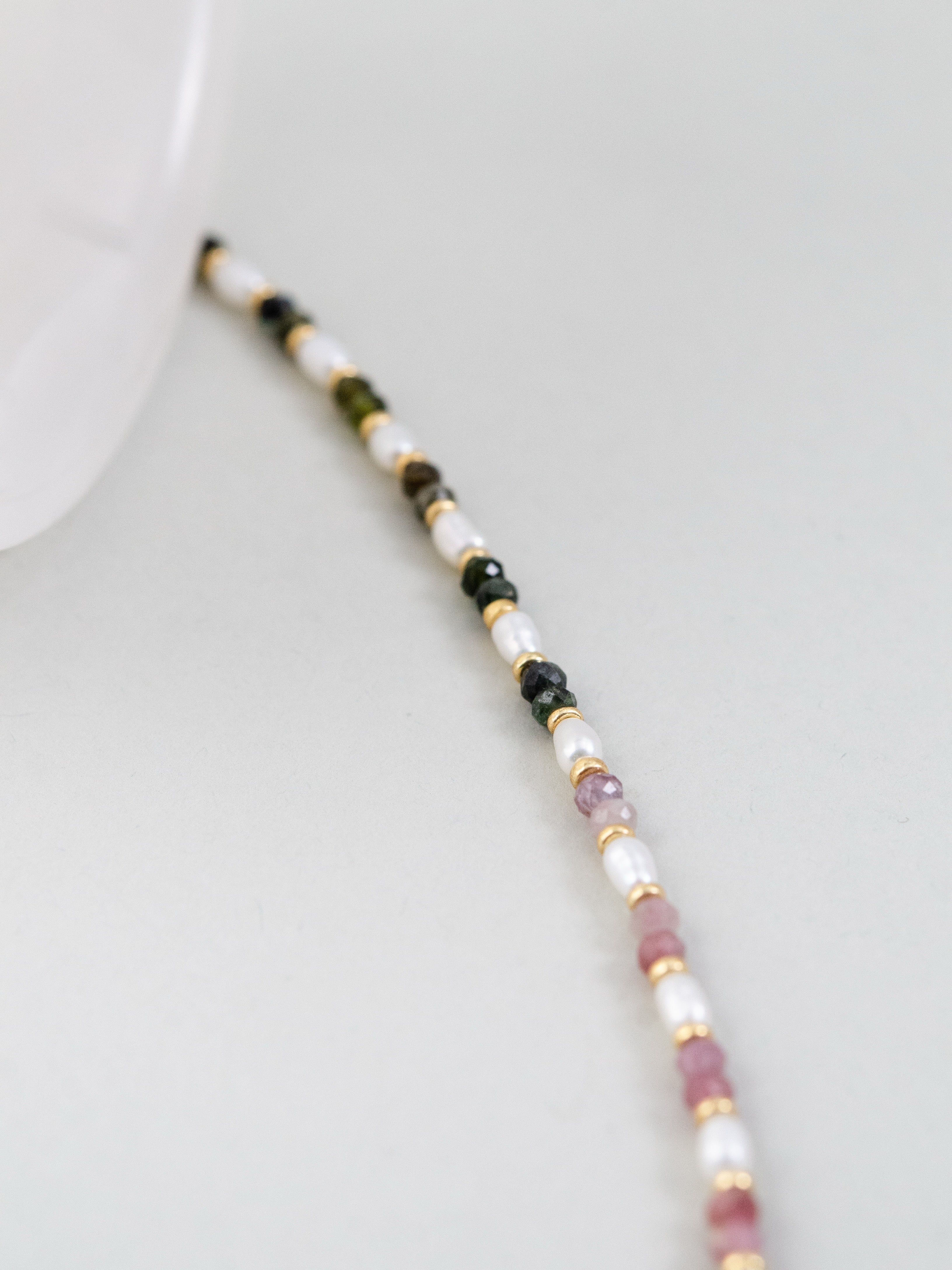 ナチュラルなマルチカラートルマリンをスクエアカットで仕立てた、洗練感のあるネックレスです。ホワイト・ピンク・ブラウン・ブラックの色がグラデーションのように変化し、まるで心の移ろいを表現しているかのようなデザイン。角のあるビーズがシャープさを、やわらかな色合いがやさしさを演出し、静けさの中でも自分らしさを大切にできる一本です。