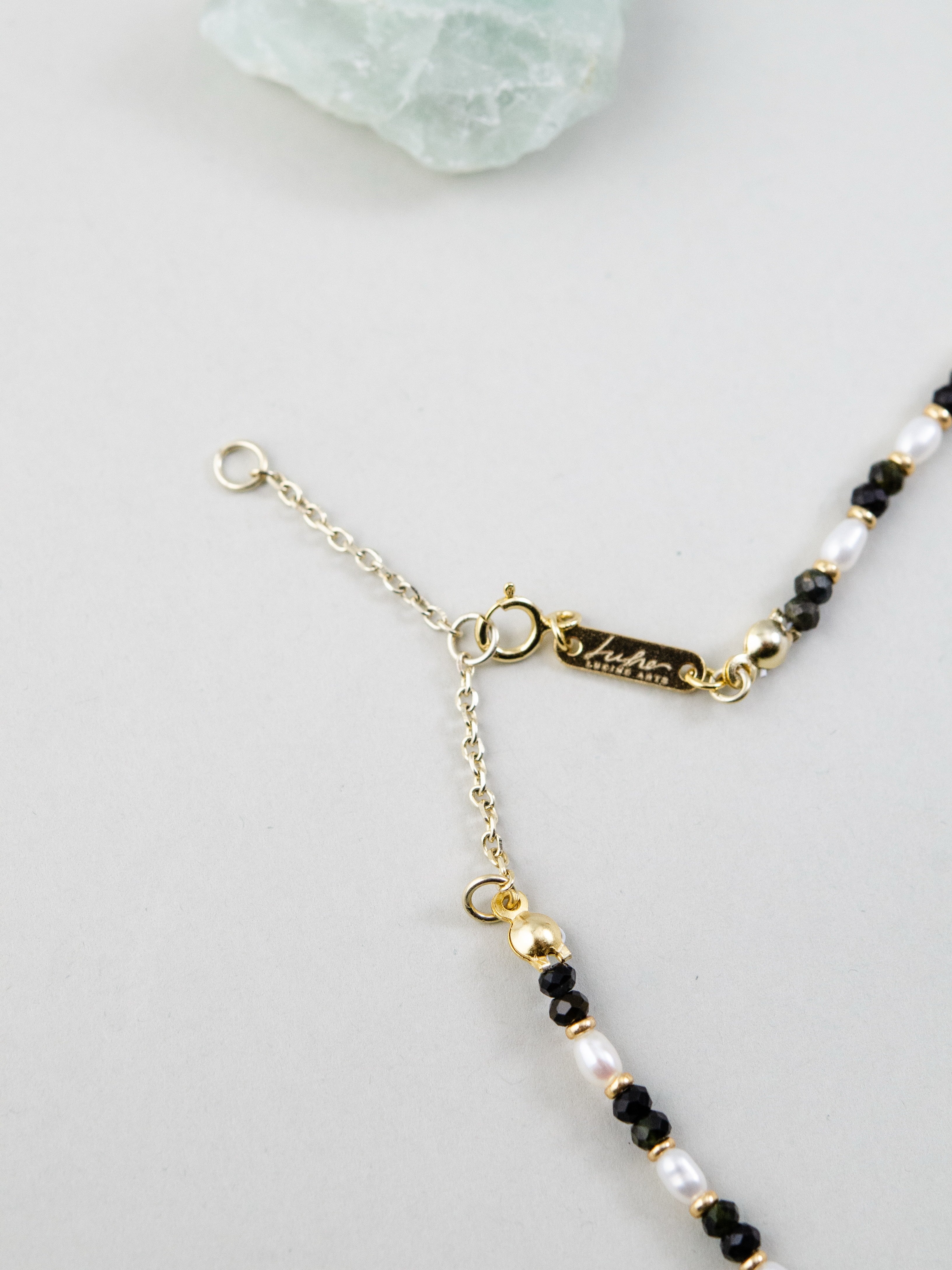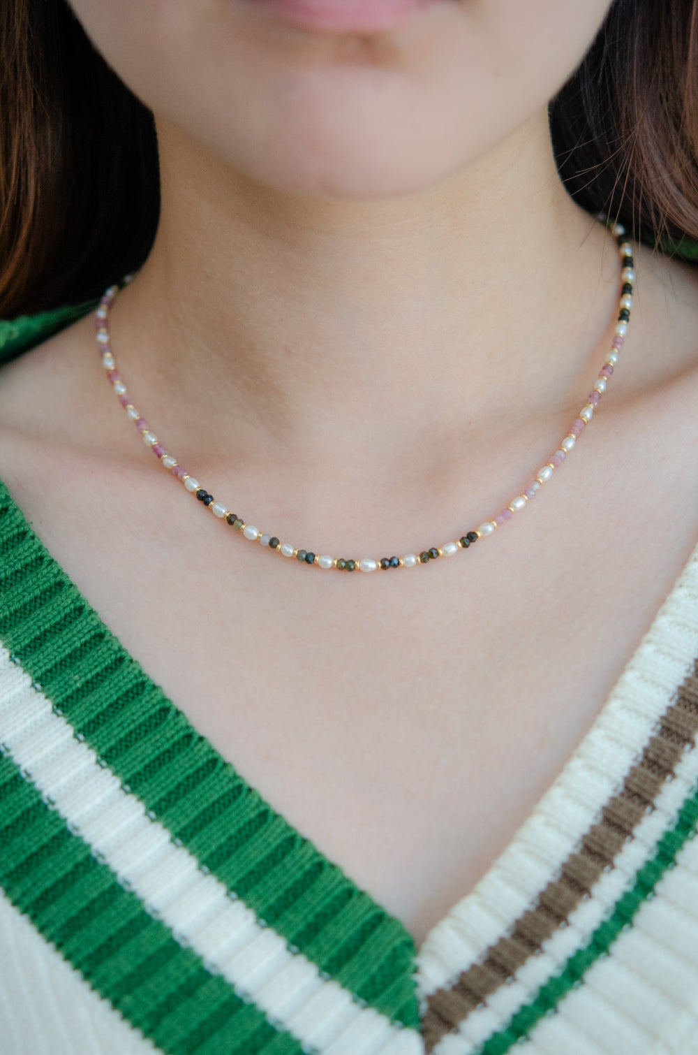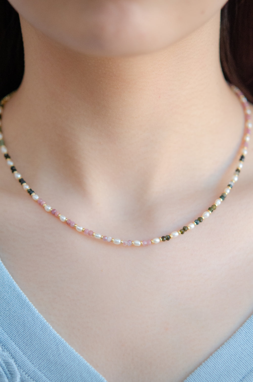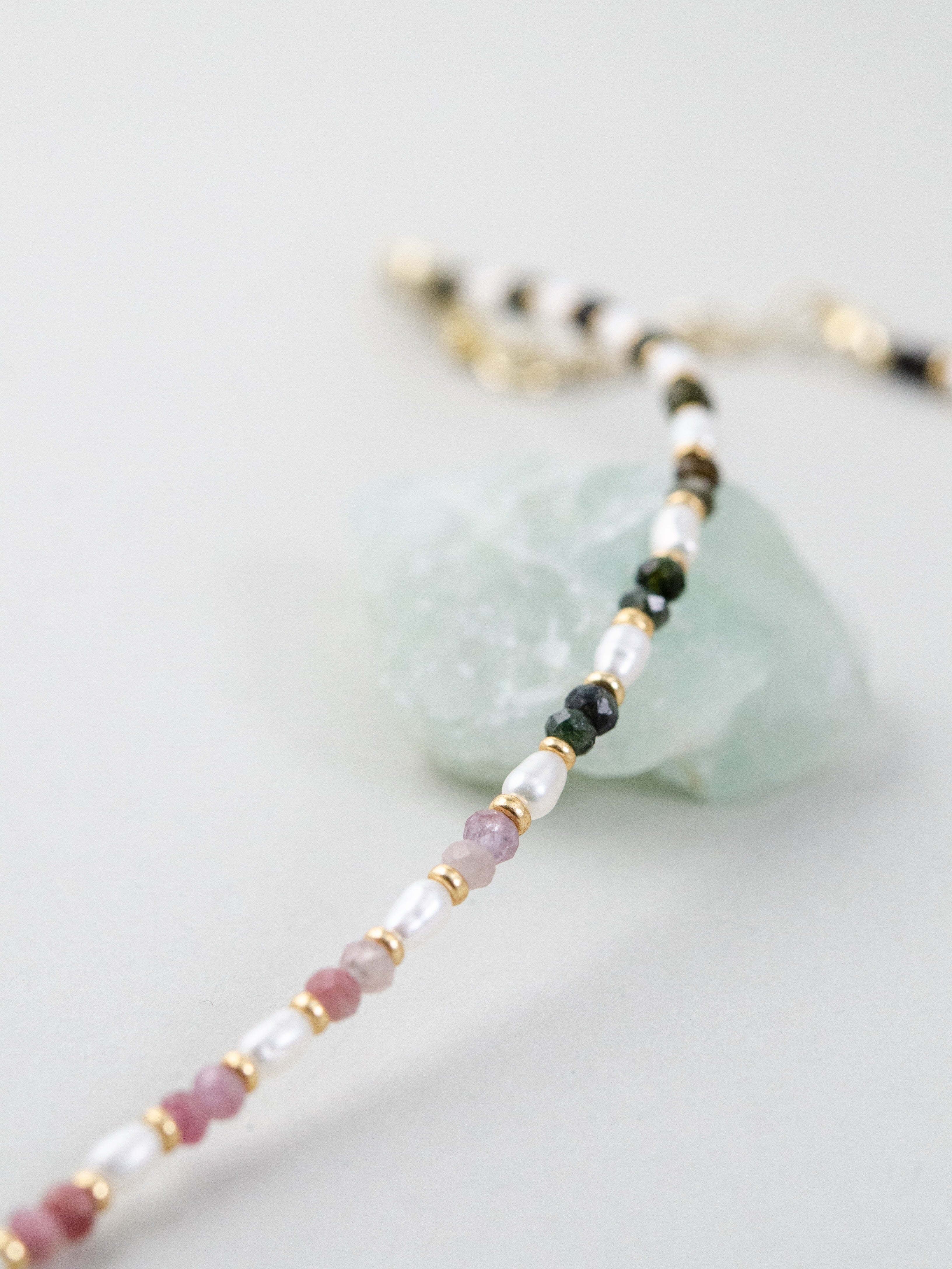 ナチュラルなマルチカラートルマリンをスクエアカットで仕立てた、洗練感のあるネックレスです。ホワイト・ピンク・ブラウン・ブラックの色がグラデーションのように変化し、まるで心の移ろいを表現しているかのようなデザイン。角のあるビーズがシャープさを、やわらかな色合いがやさしさを演出し、静けさの中でも自分らしさを大切にできる一本です。
