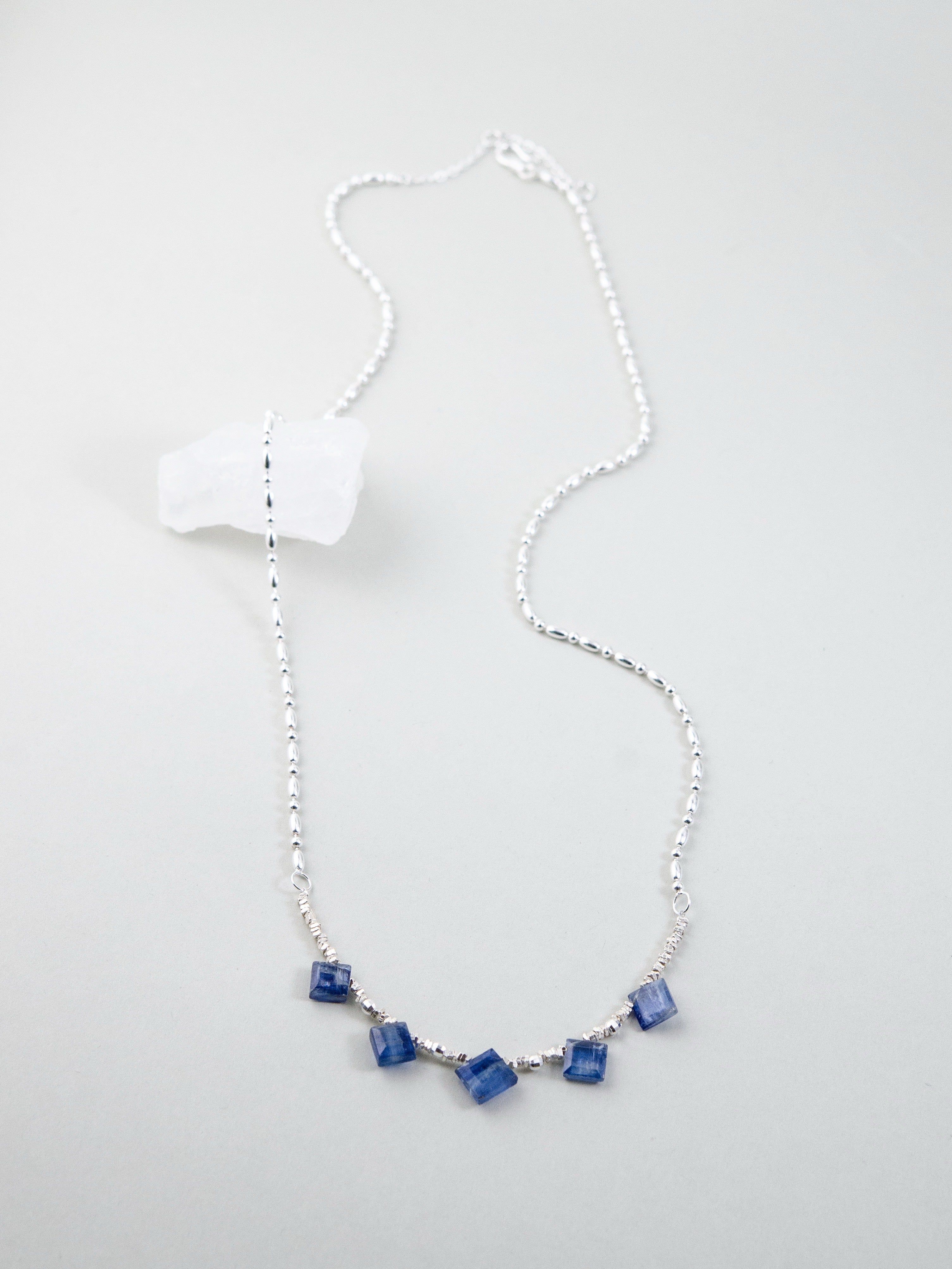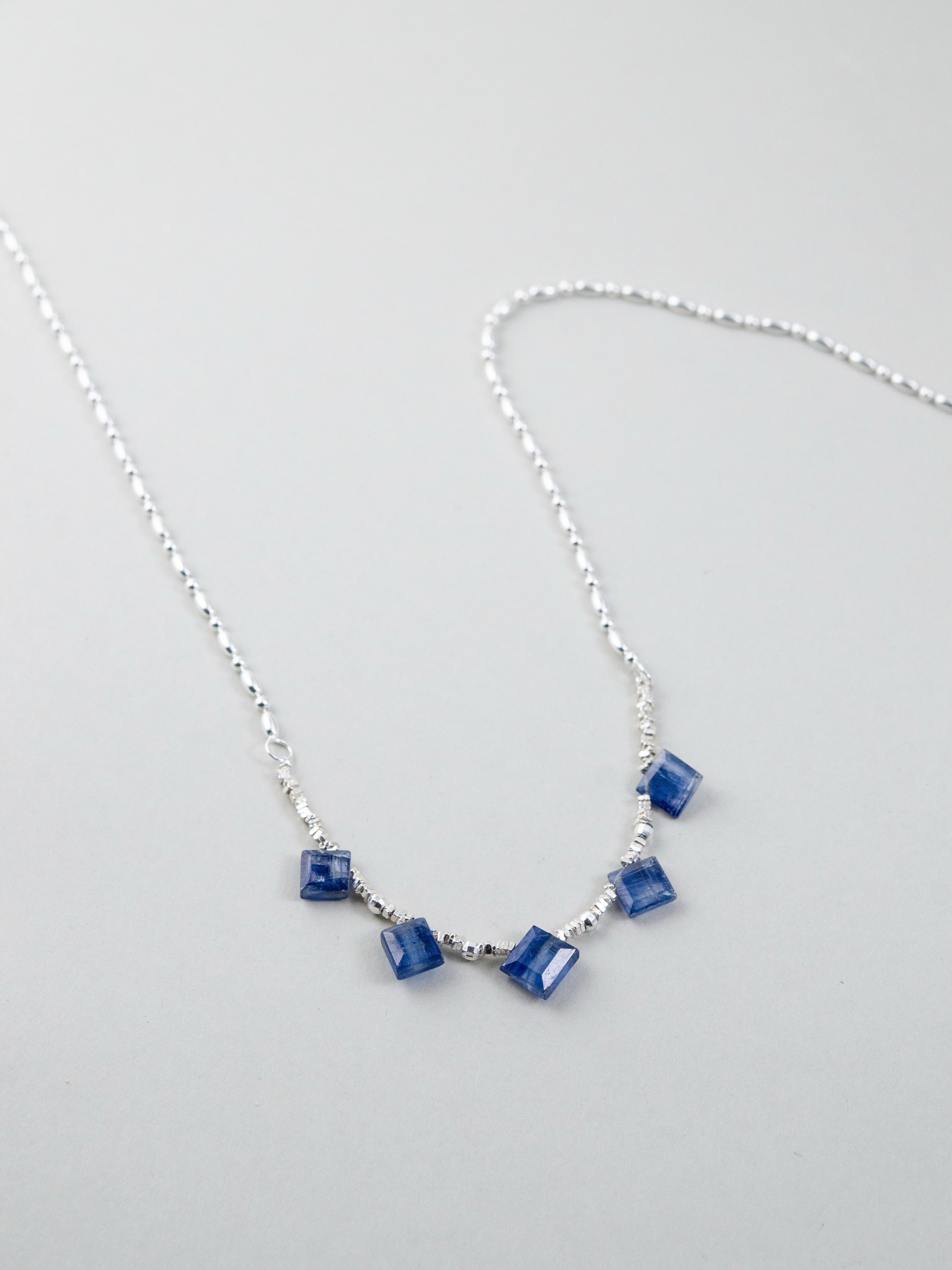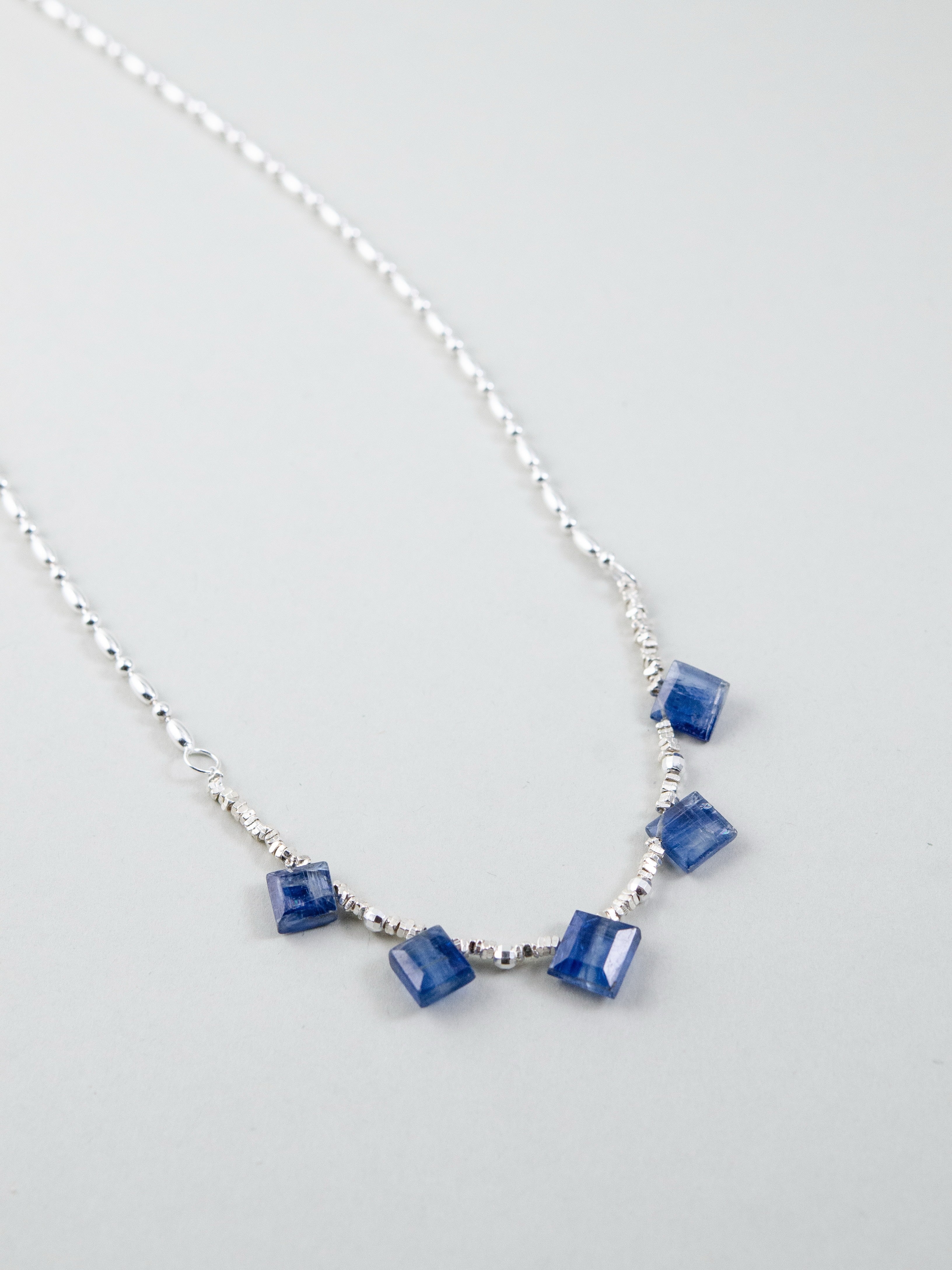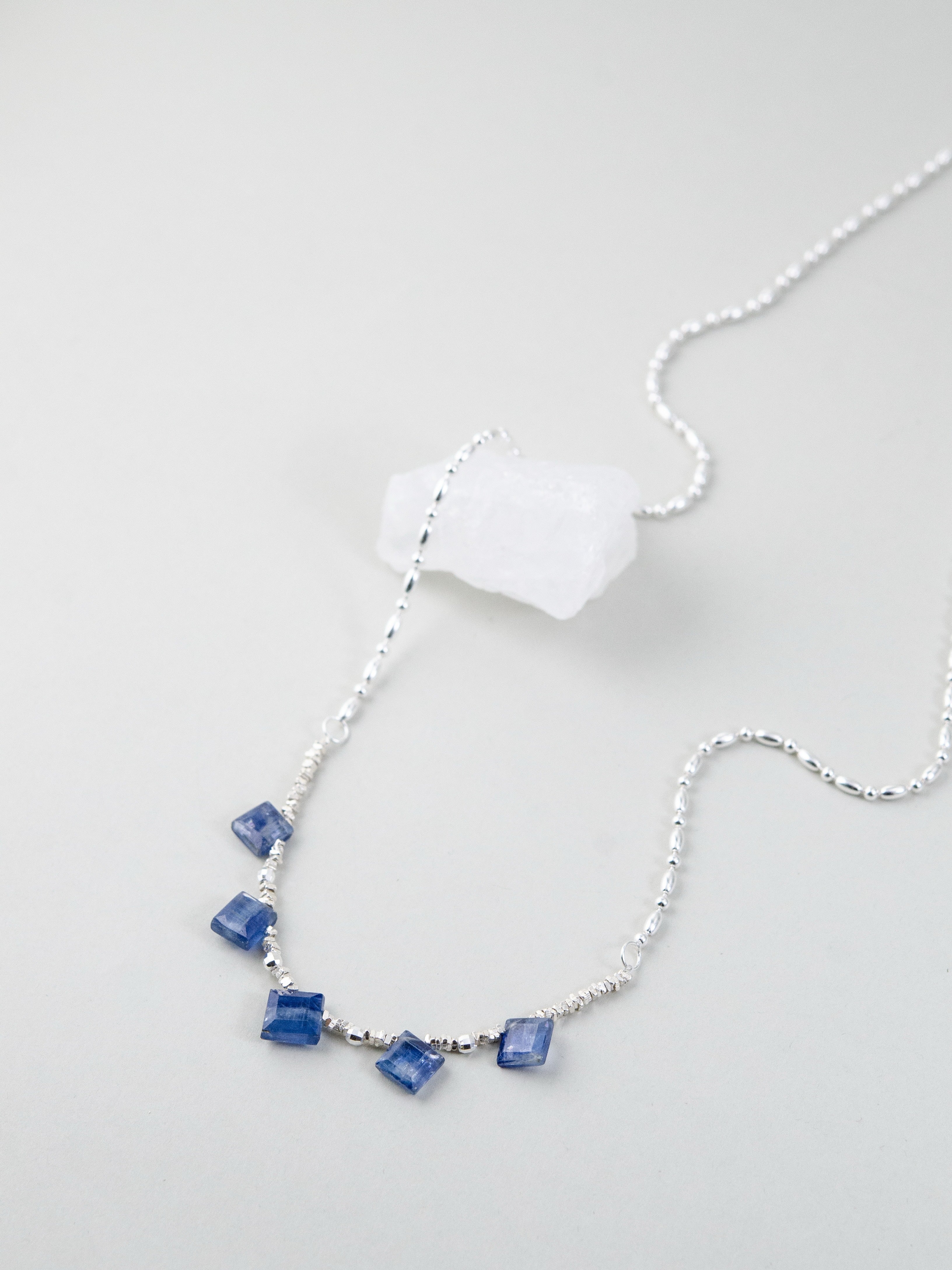 珍しいスクエアカットのカイヤナイトを中心に配した、シャープで洗練された印象のネックレスです。深みのあるブルーとシルバーのコントラストが美しく、知的でクールな雰囲気を胸元に添えます。整った配置が静かな強さを感じさせ、シンプルながらも存在感のあるデザインに仕上げました。