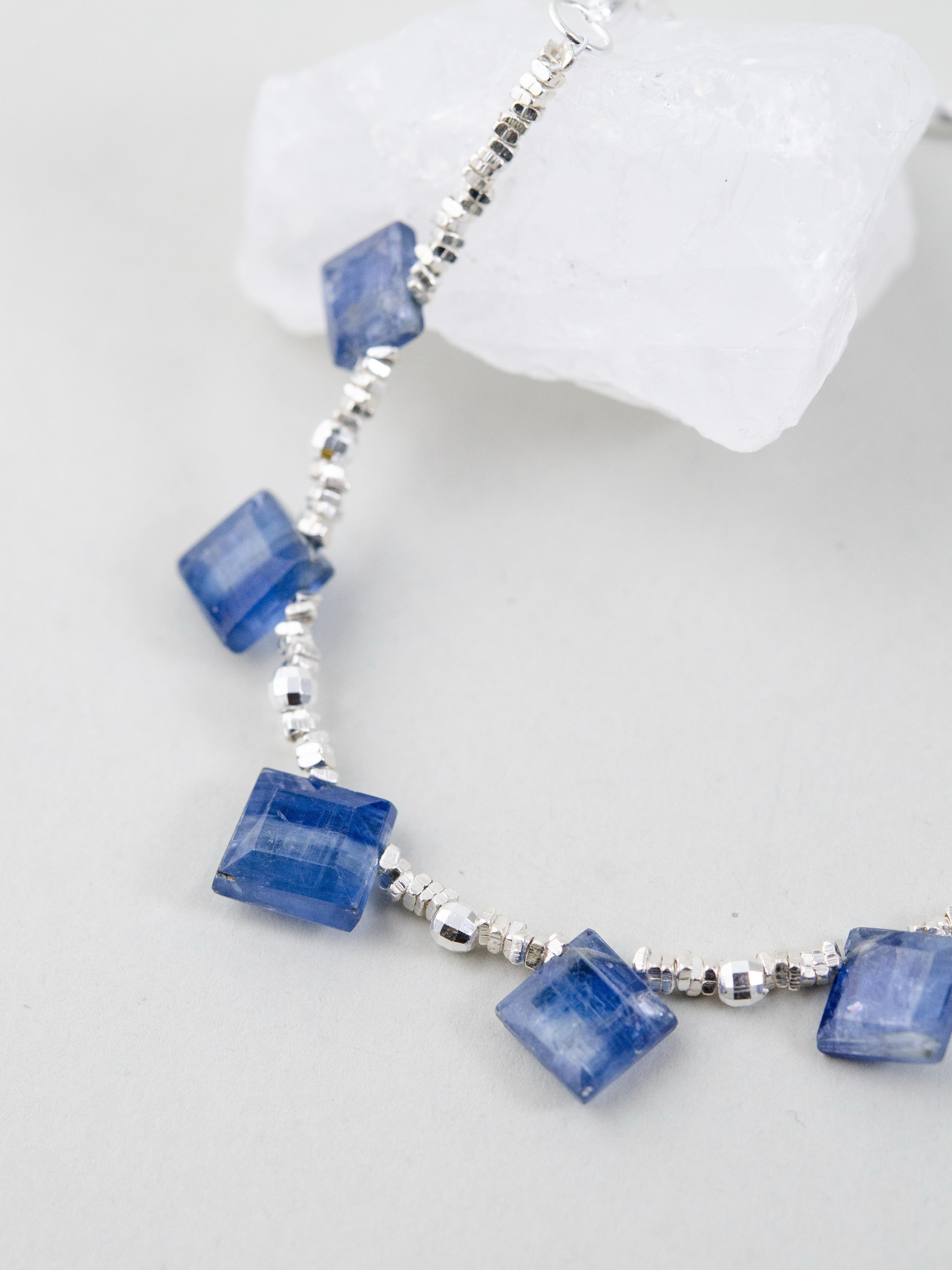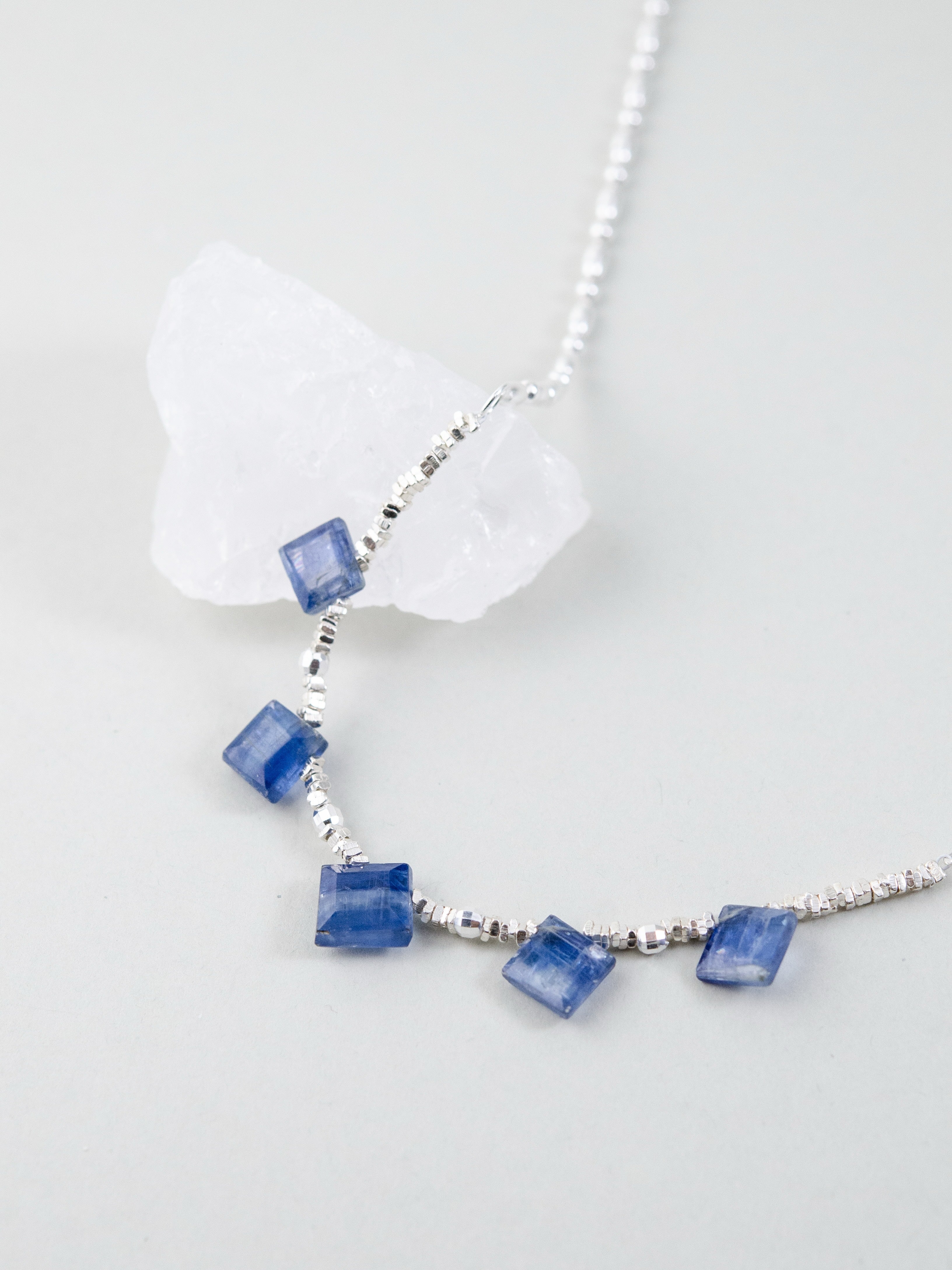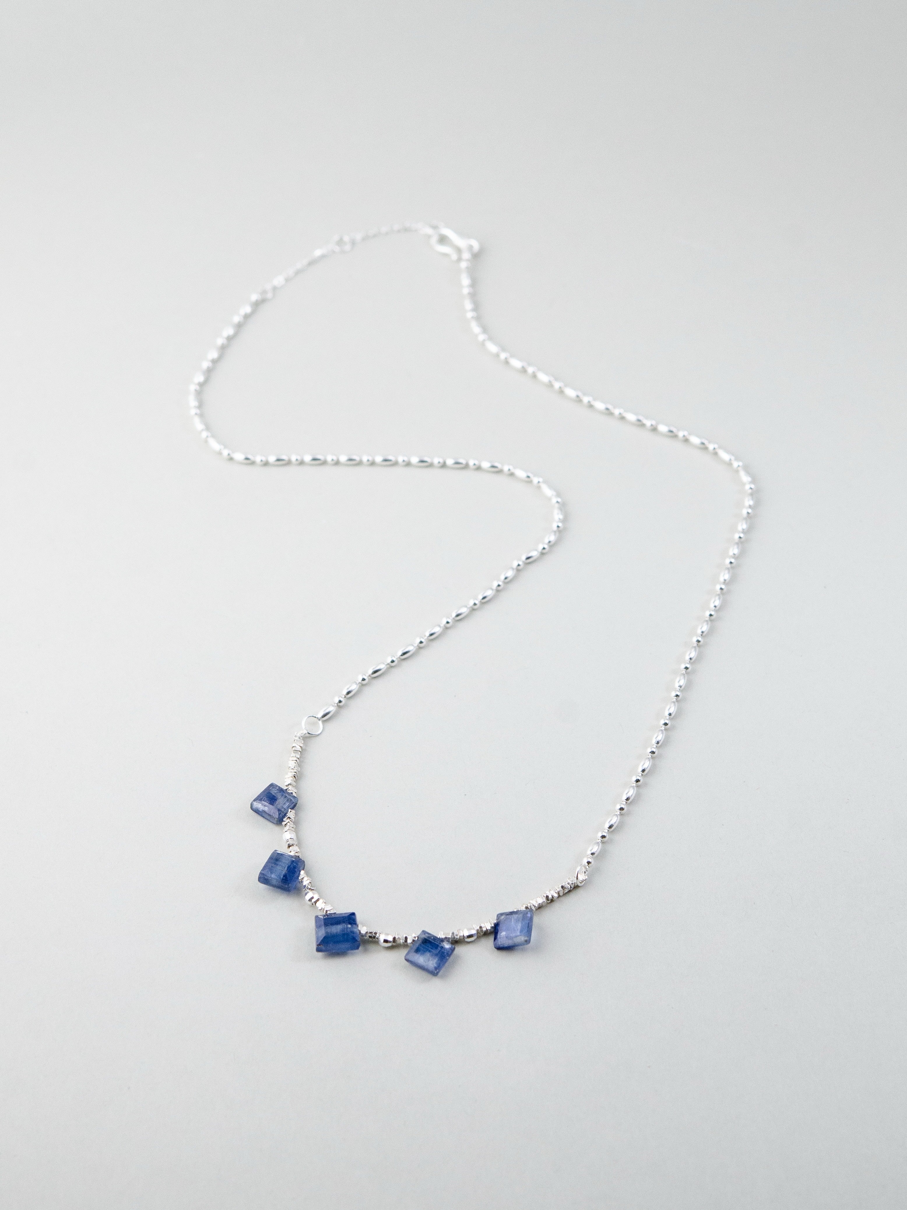 珍しいスクエアカットのカイヤナイトを中心に配した、シャープで洗練された印象のネックレスです。深みのあるブルーとシルバーのコントラストが美しく、知的でクールな雰囲気を胸元に添えます。整った配置が静かな強さを感じさせ、シンプルながらも存在感のあるデザインに仕上げました。