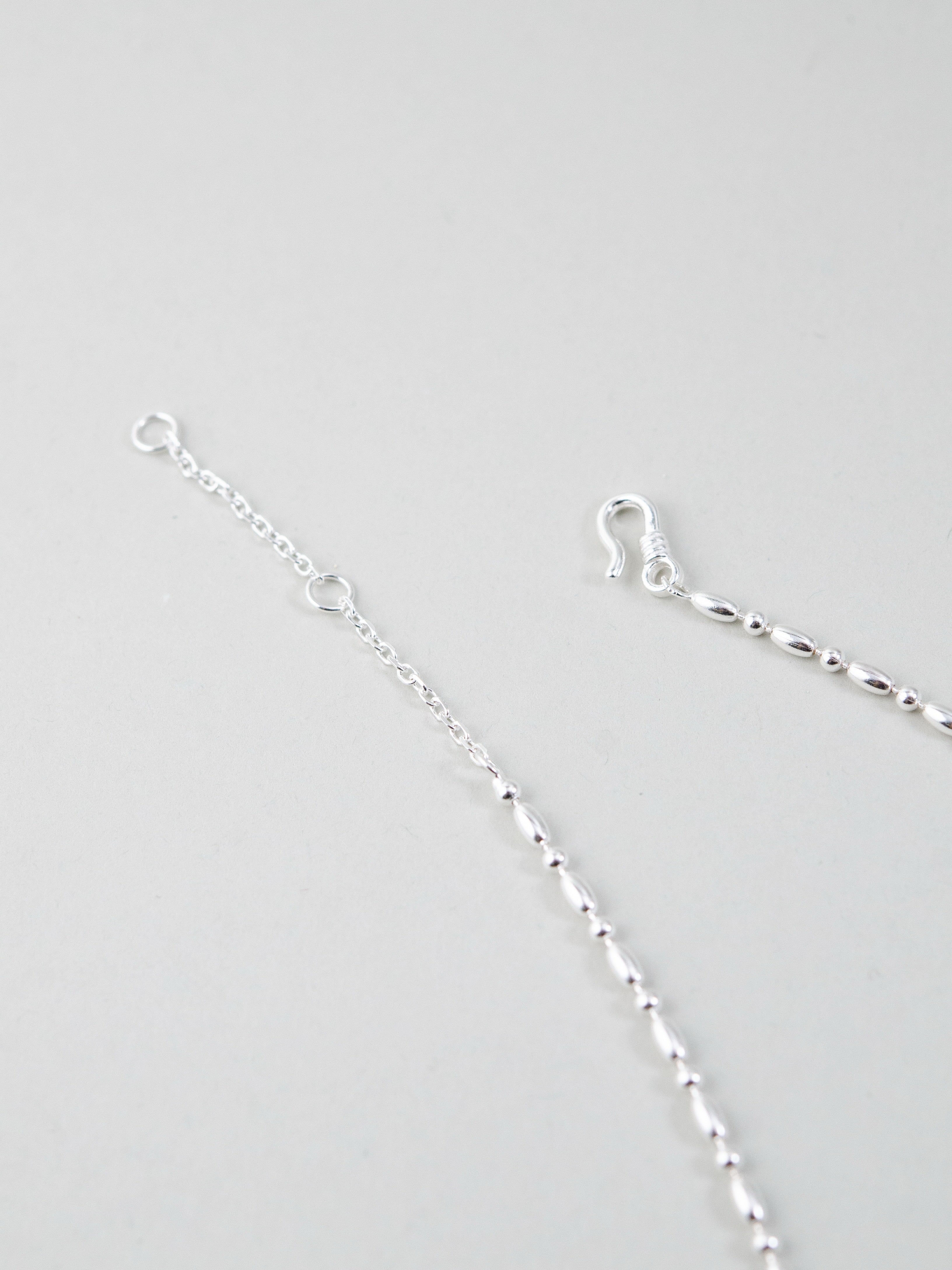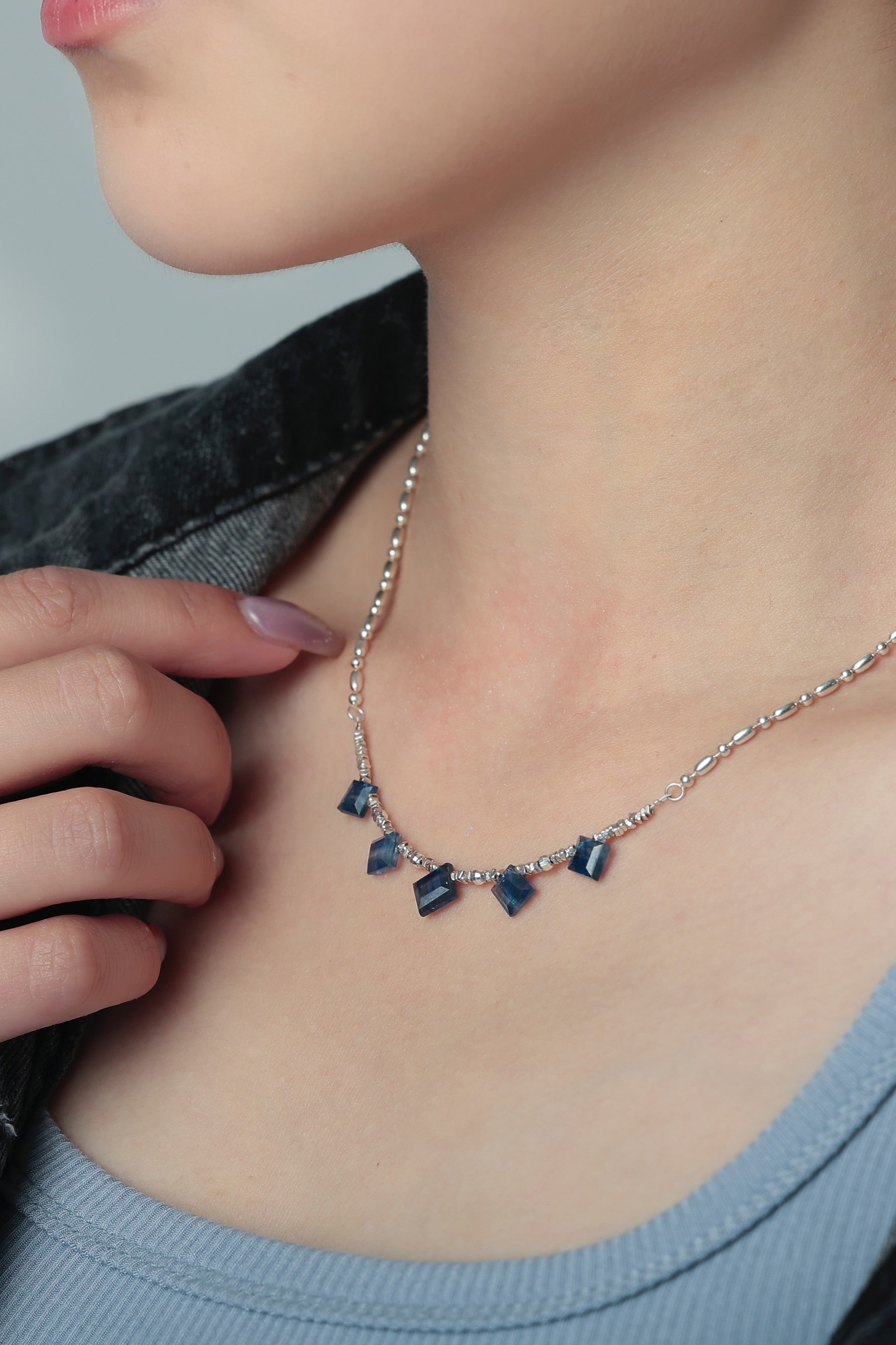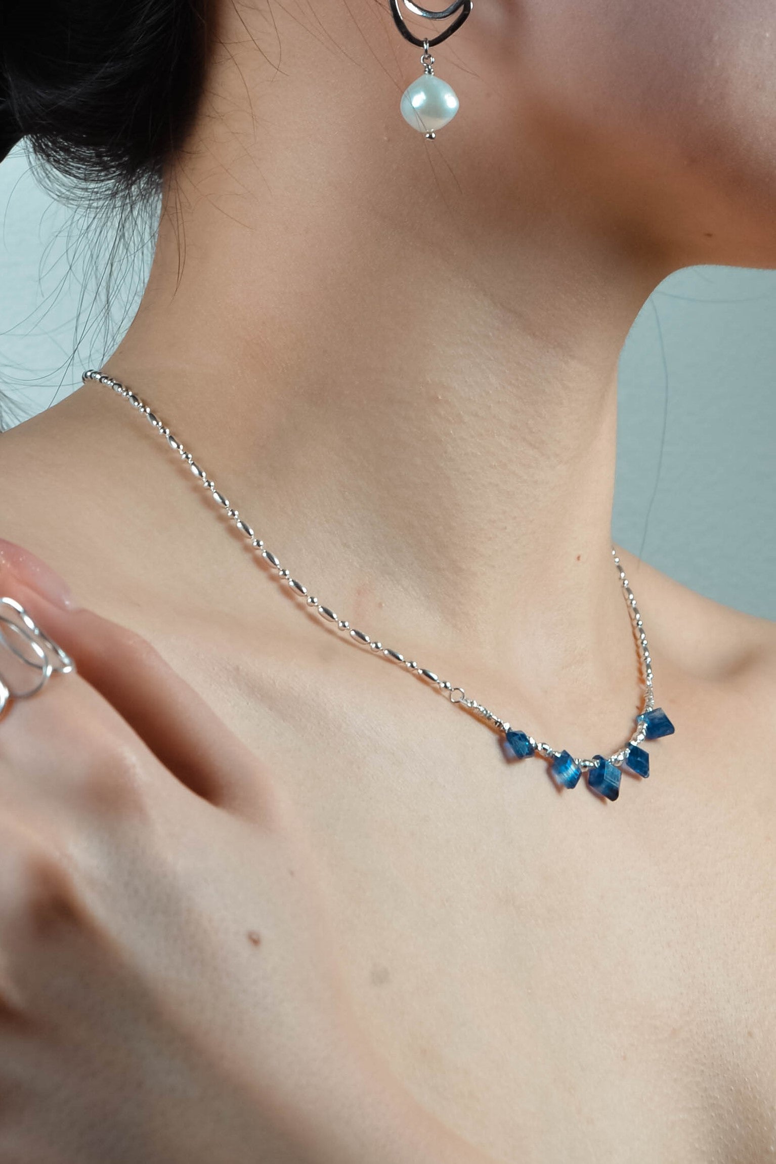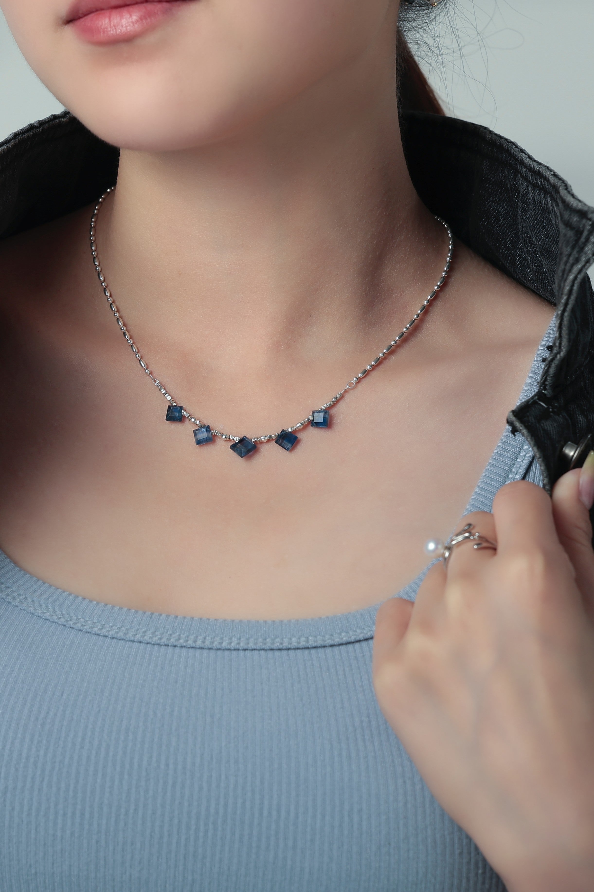 珍しいスクエアカットのカイヤナイトを中心に配した、シャープで洗練された印象のネックレスです。深みのあるブルーとシルバーのコントラストが美しく、知的でクールな雰囲気を胸元に添えます。整った配置が静かな強さを感じさせ、シンプルながらも存在感のあるデザインに仕上げました。