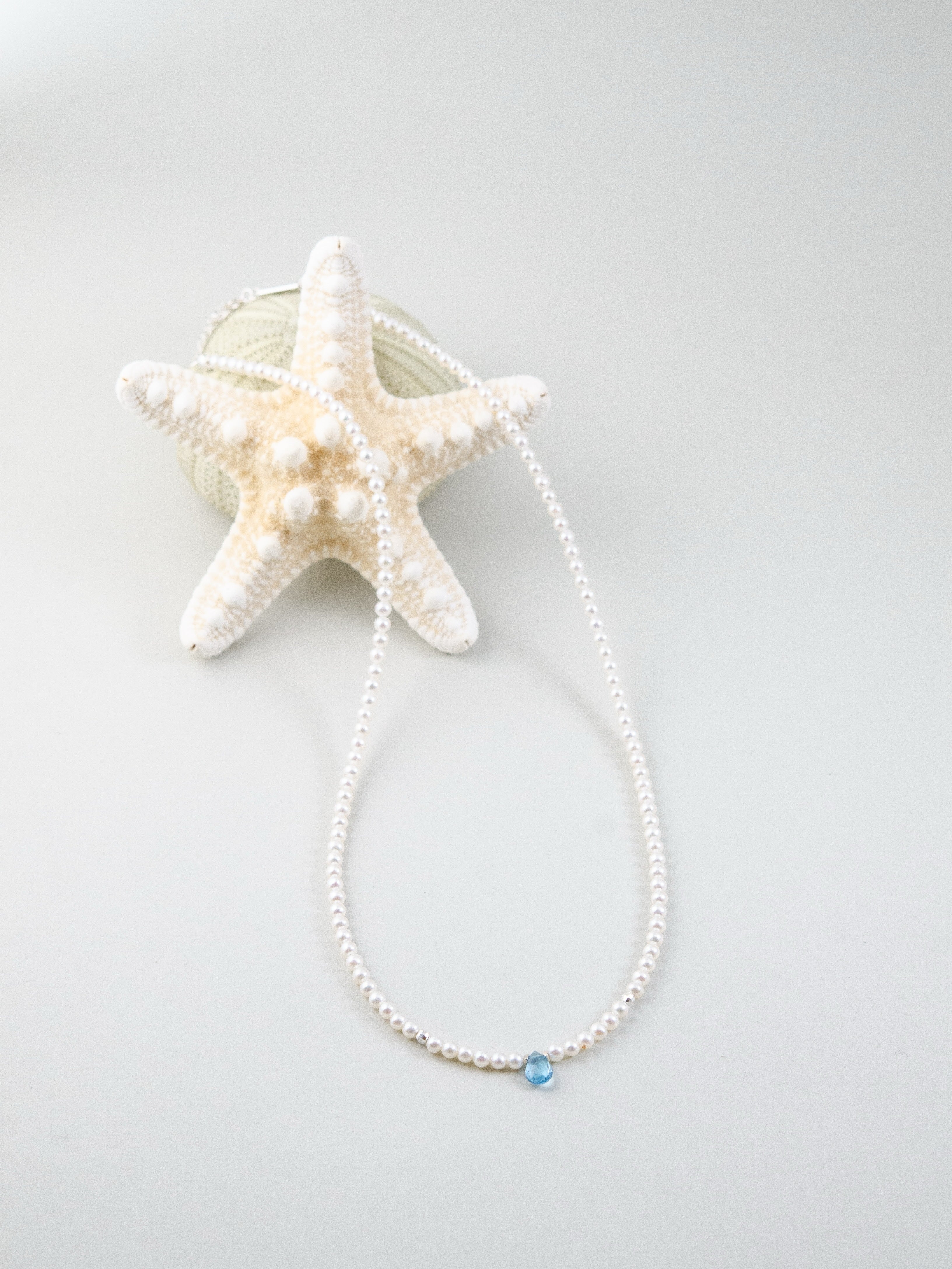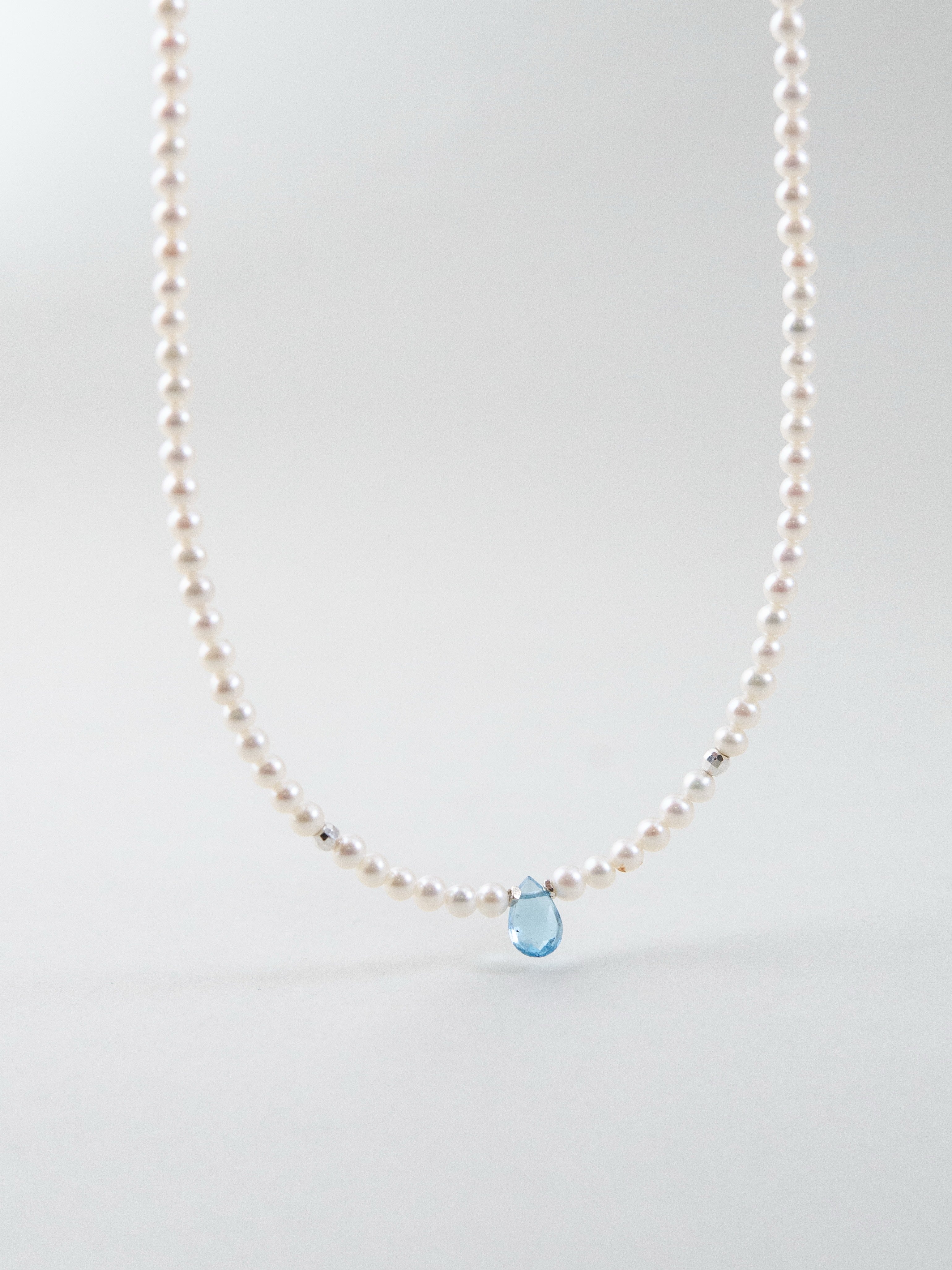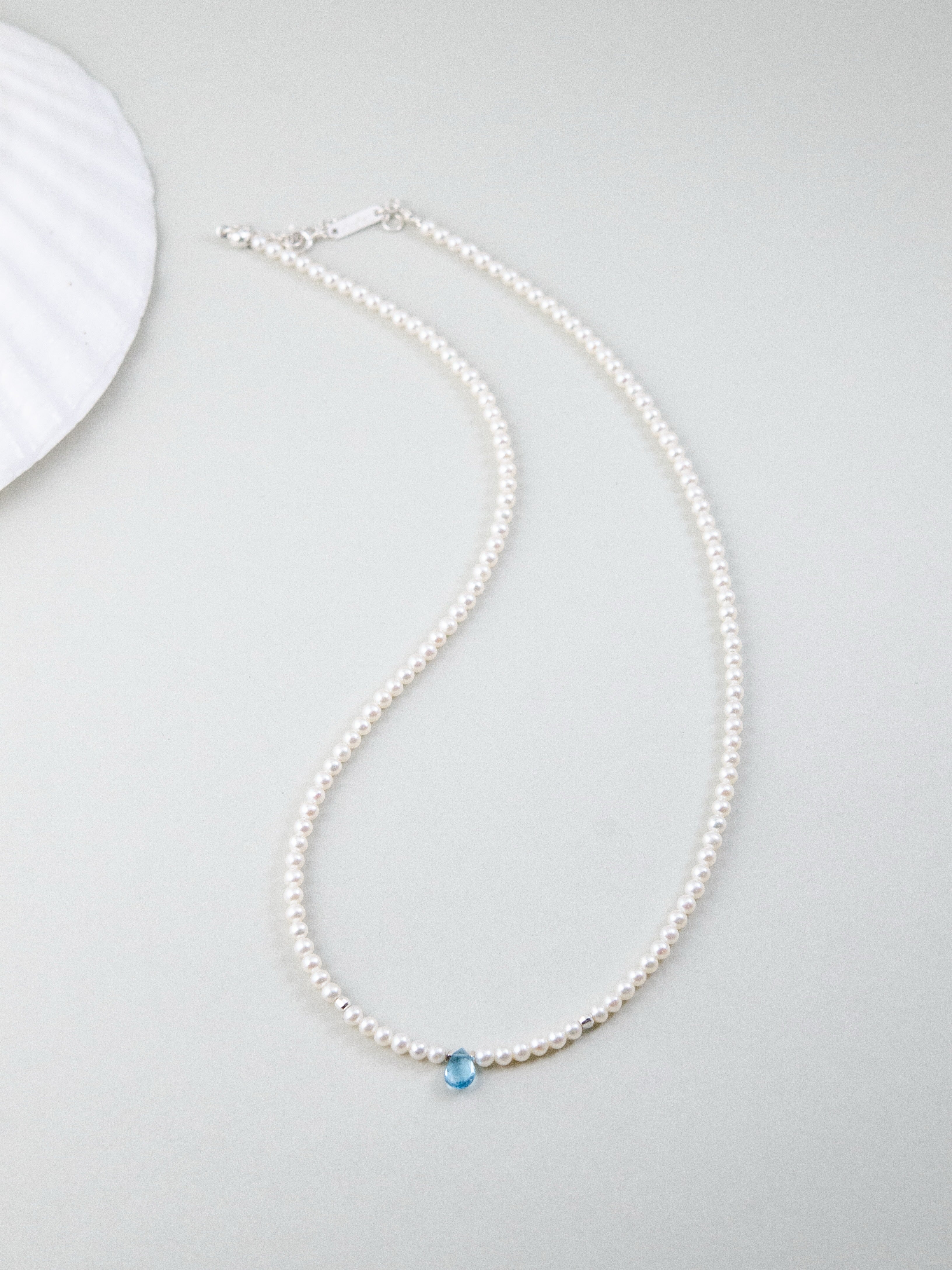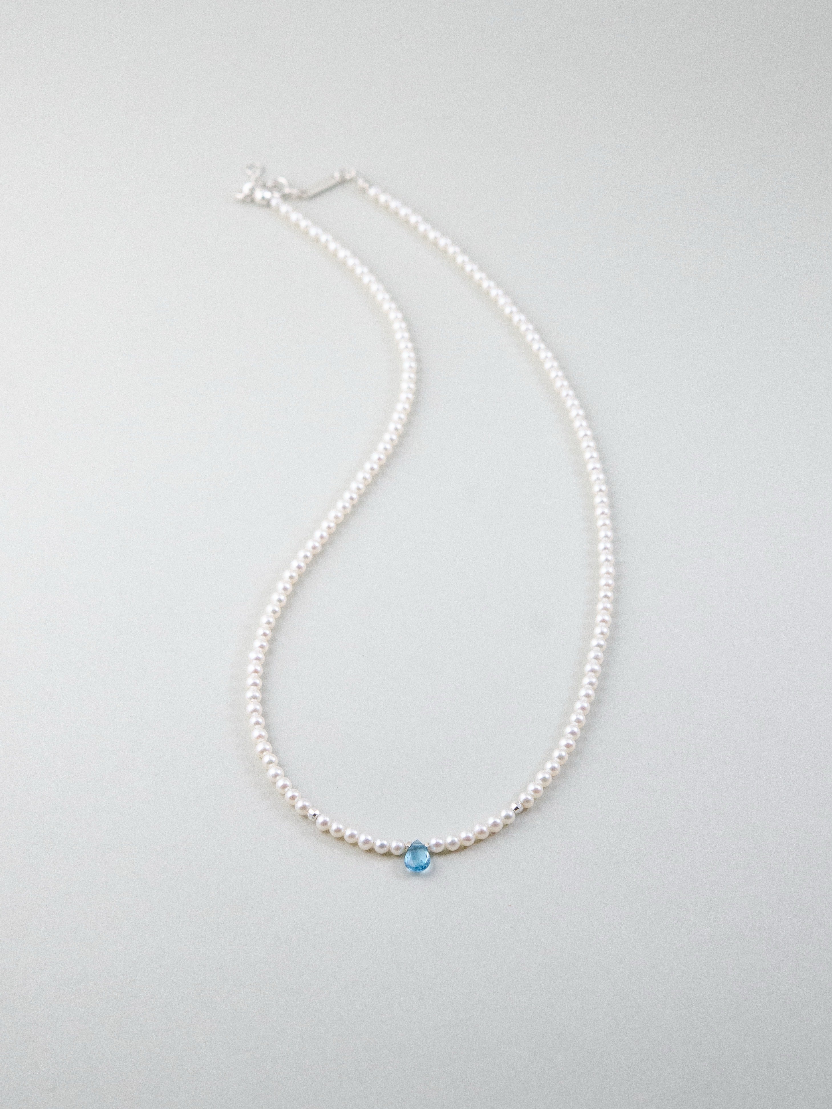 小粒の淡水パールをベースに、中央にひと粒だけ配したブルートパーズが印象的なネックレスです。朝の海に射し込む光のような清らかで凛とした雰囲気が胸元に広がり、ミニマルながらも心に残る存在感を放ちます。静かな日常の中で、自分らしい輝きをそっと添えてくれるジュエリーです。