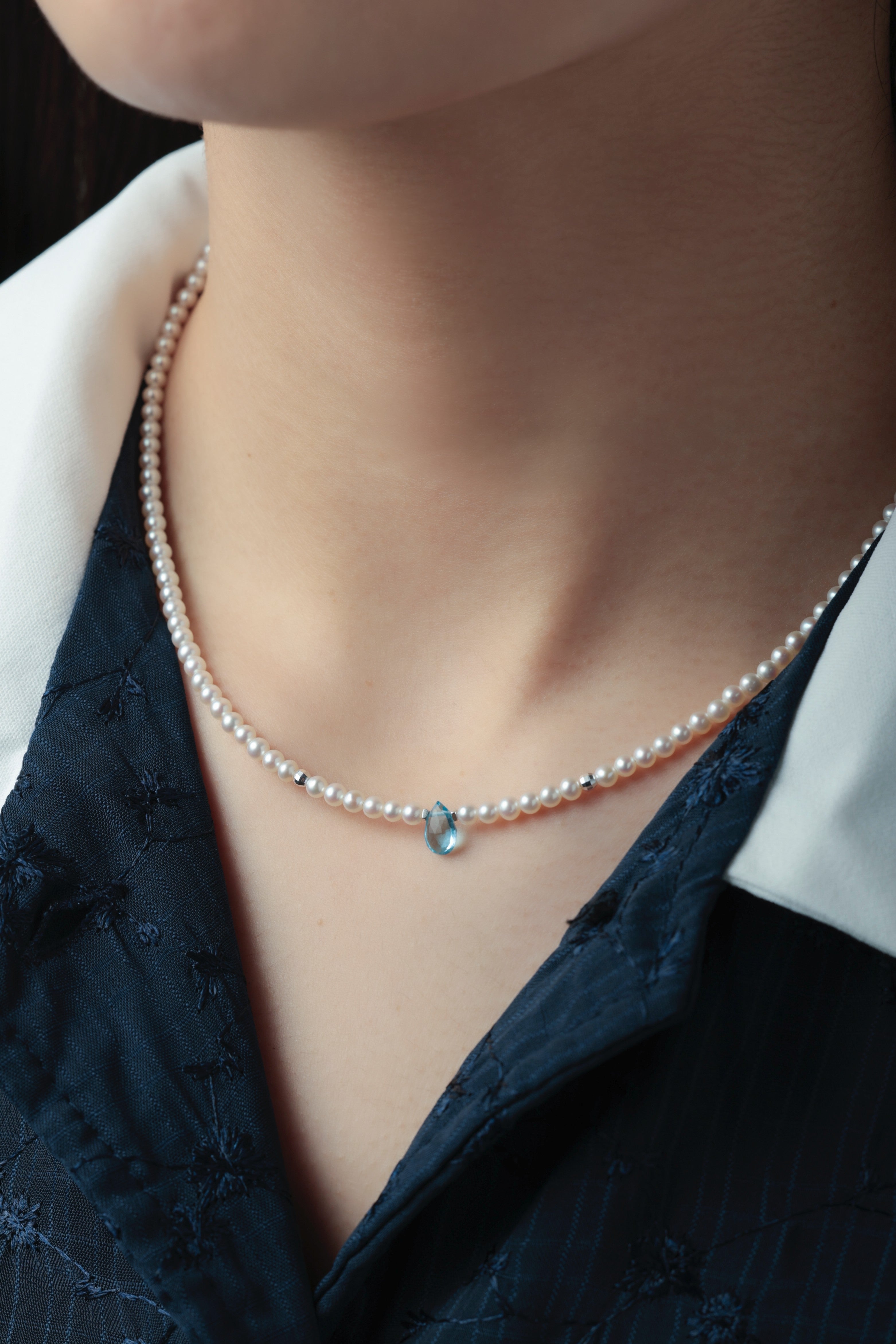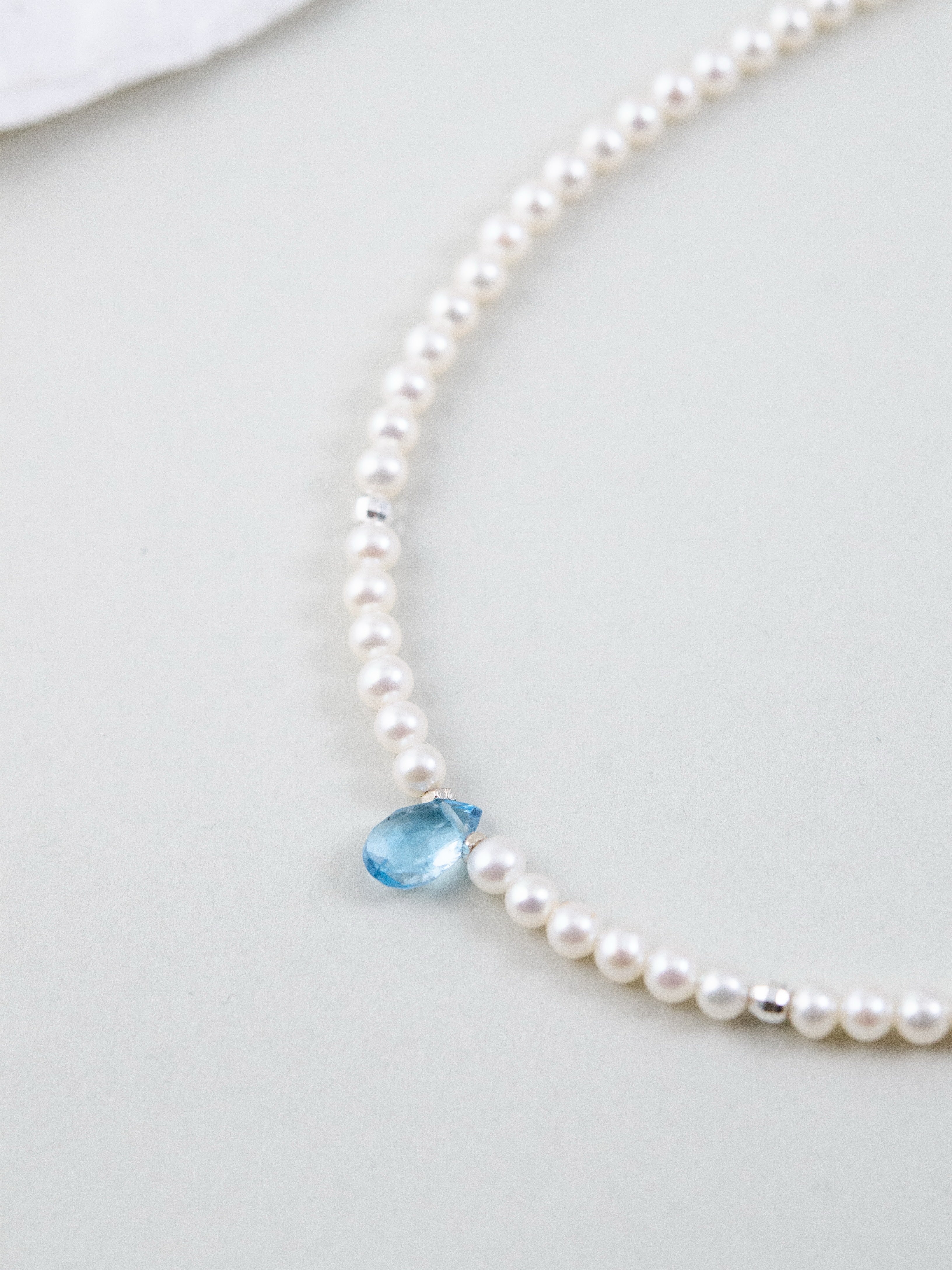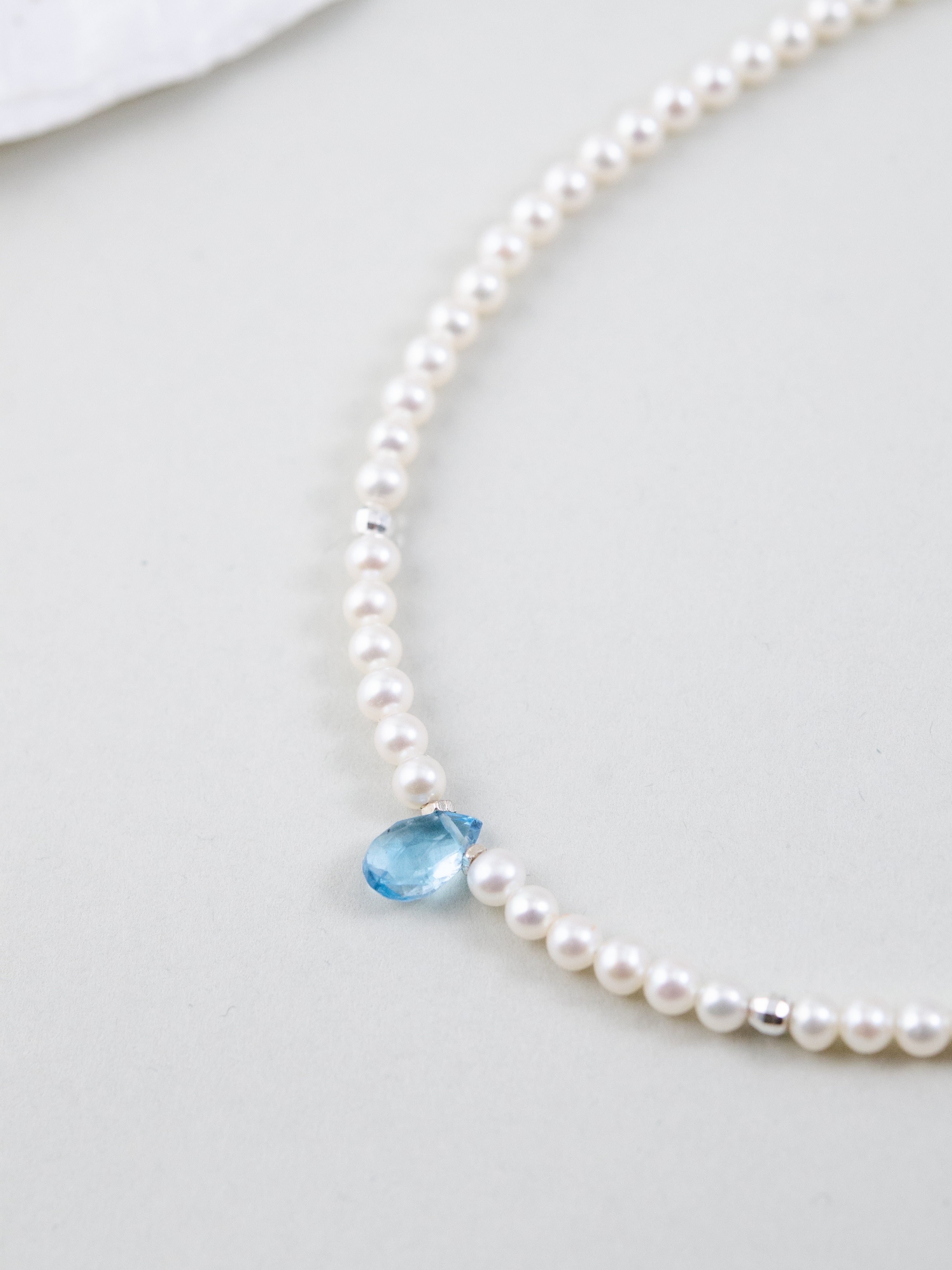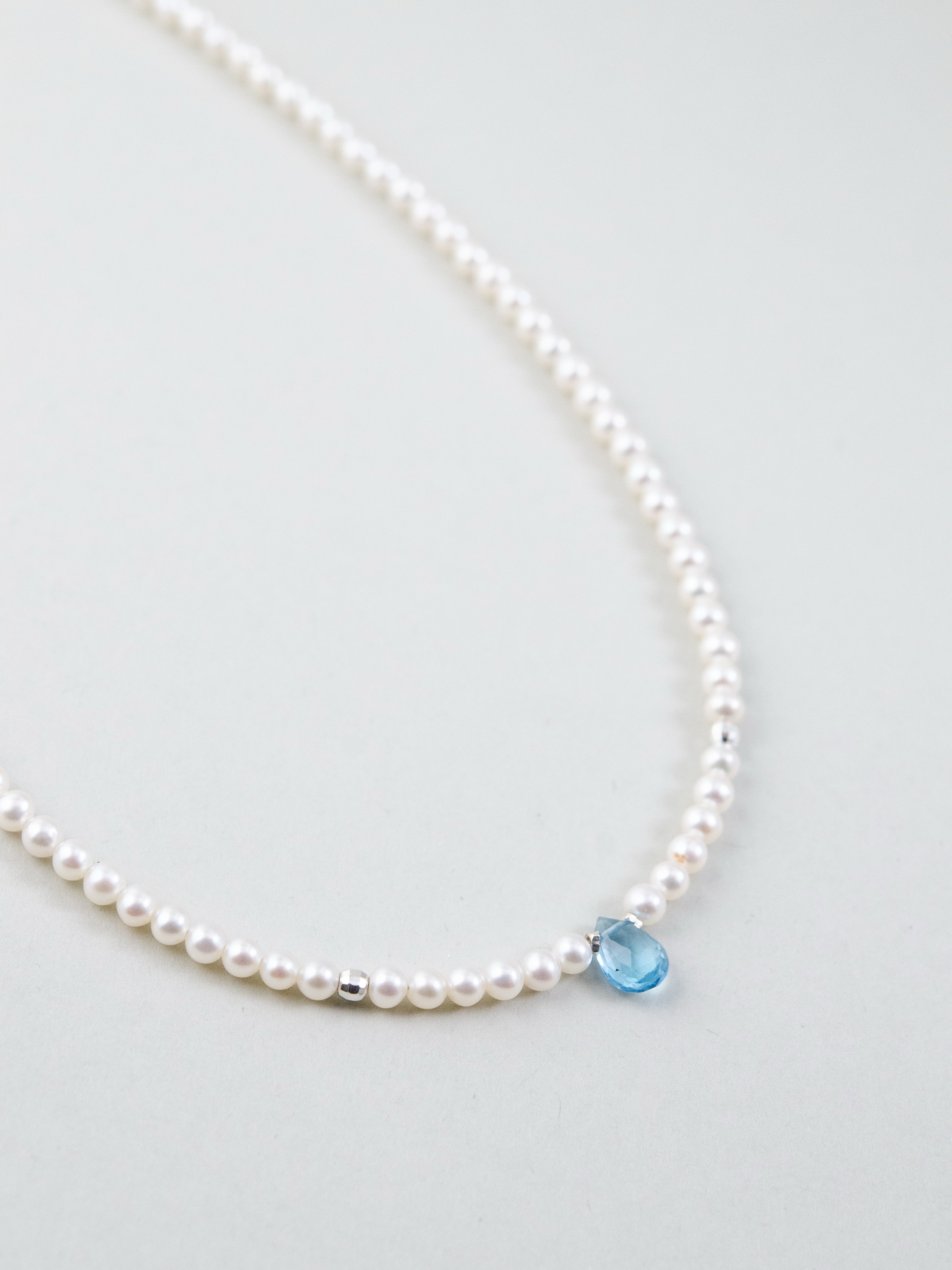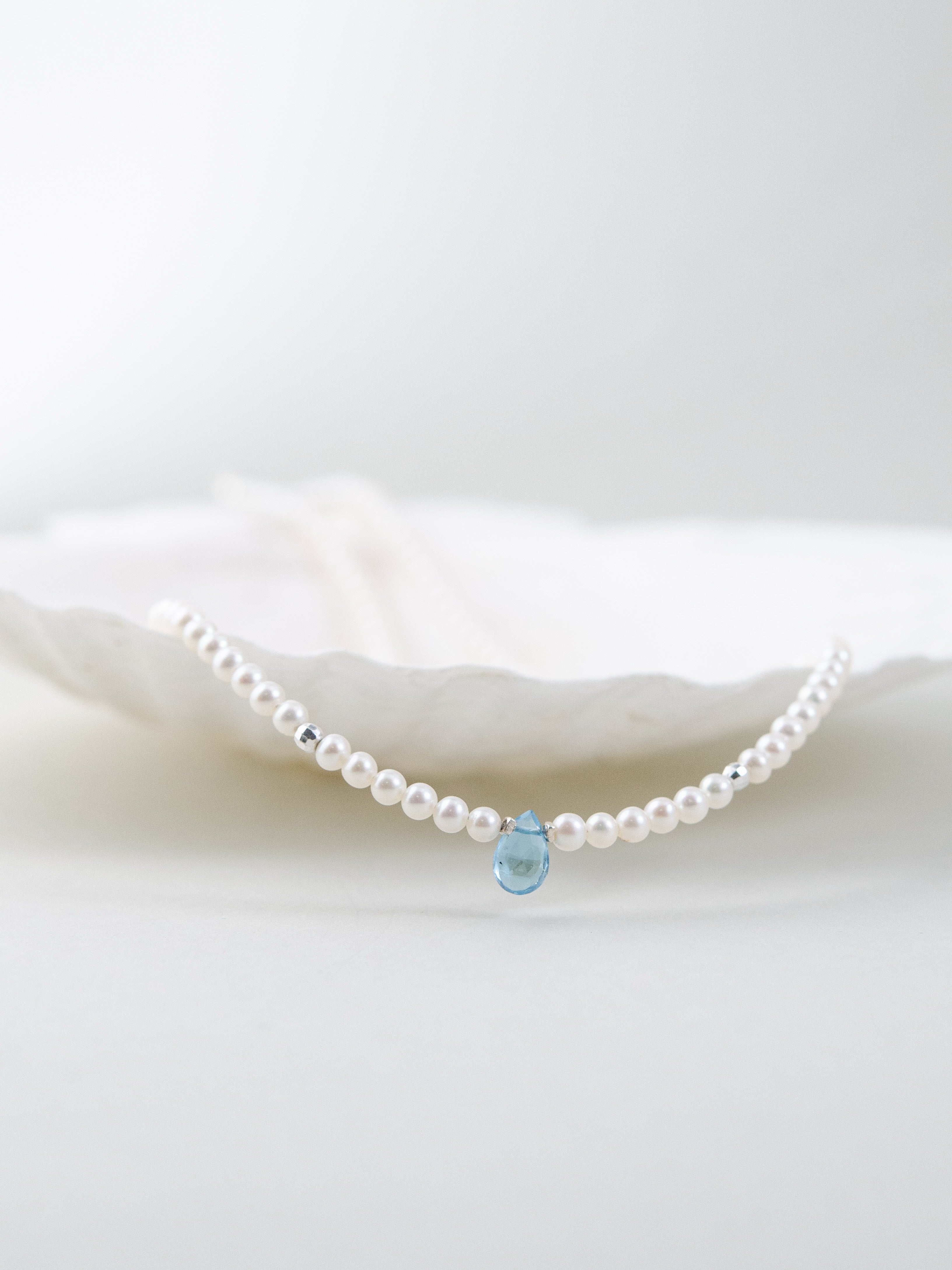 小粒の淡水パールをベースに、中央にひと粒だけ配したブルートパーズが印象的なネックレスです。朝の海に射し込む光のような清らかで凛とした雰囲気が胸元に広がり、ミニマルながらも心に残る存在感を放ちます。静かな日常の中で、自分らしい輝きをそっと添えてくれるジュエリーです。