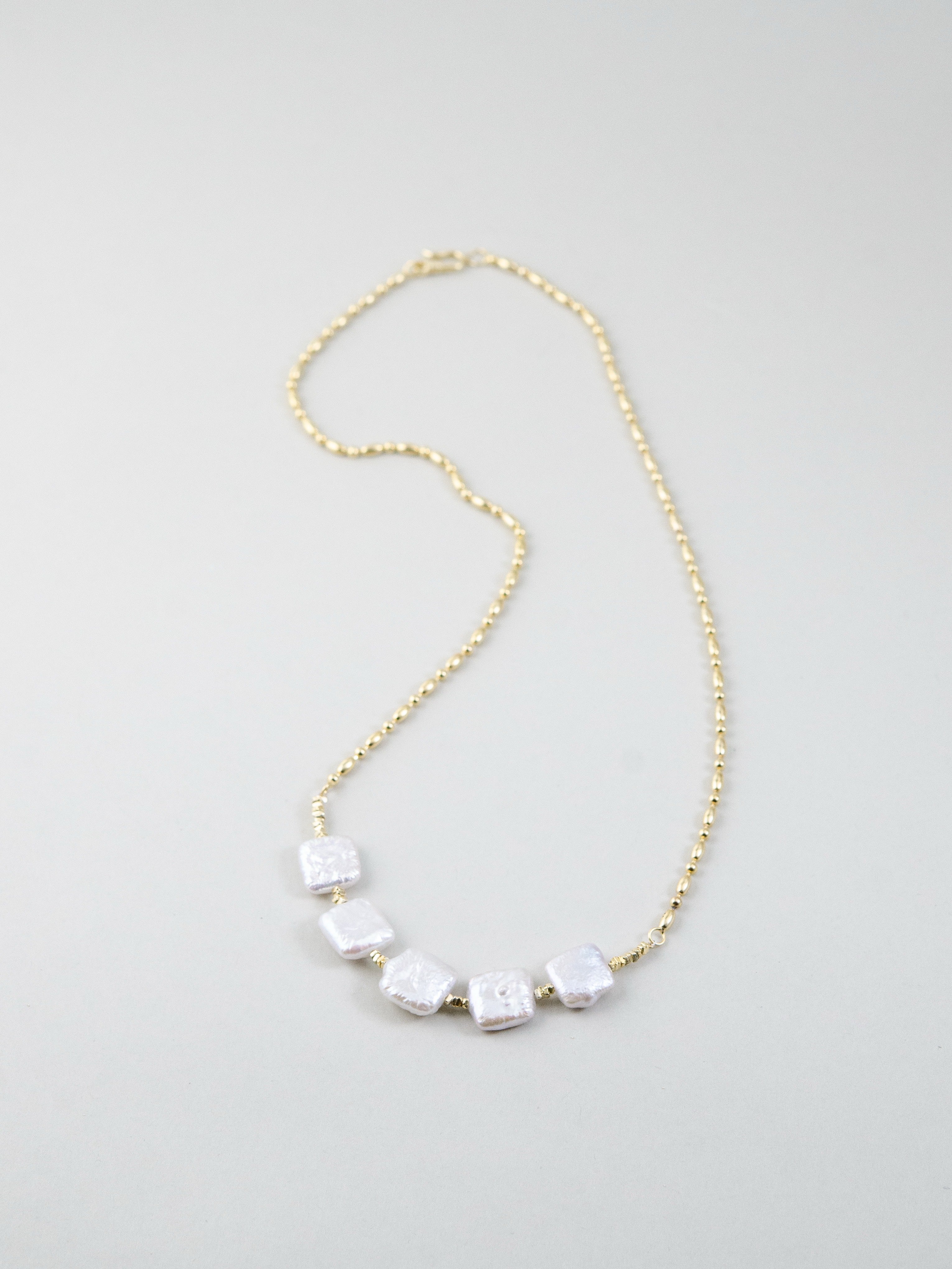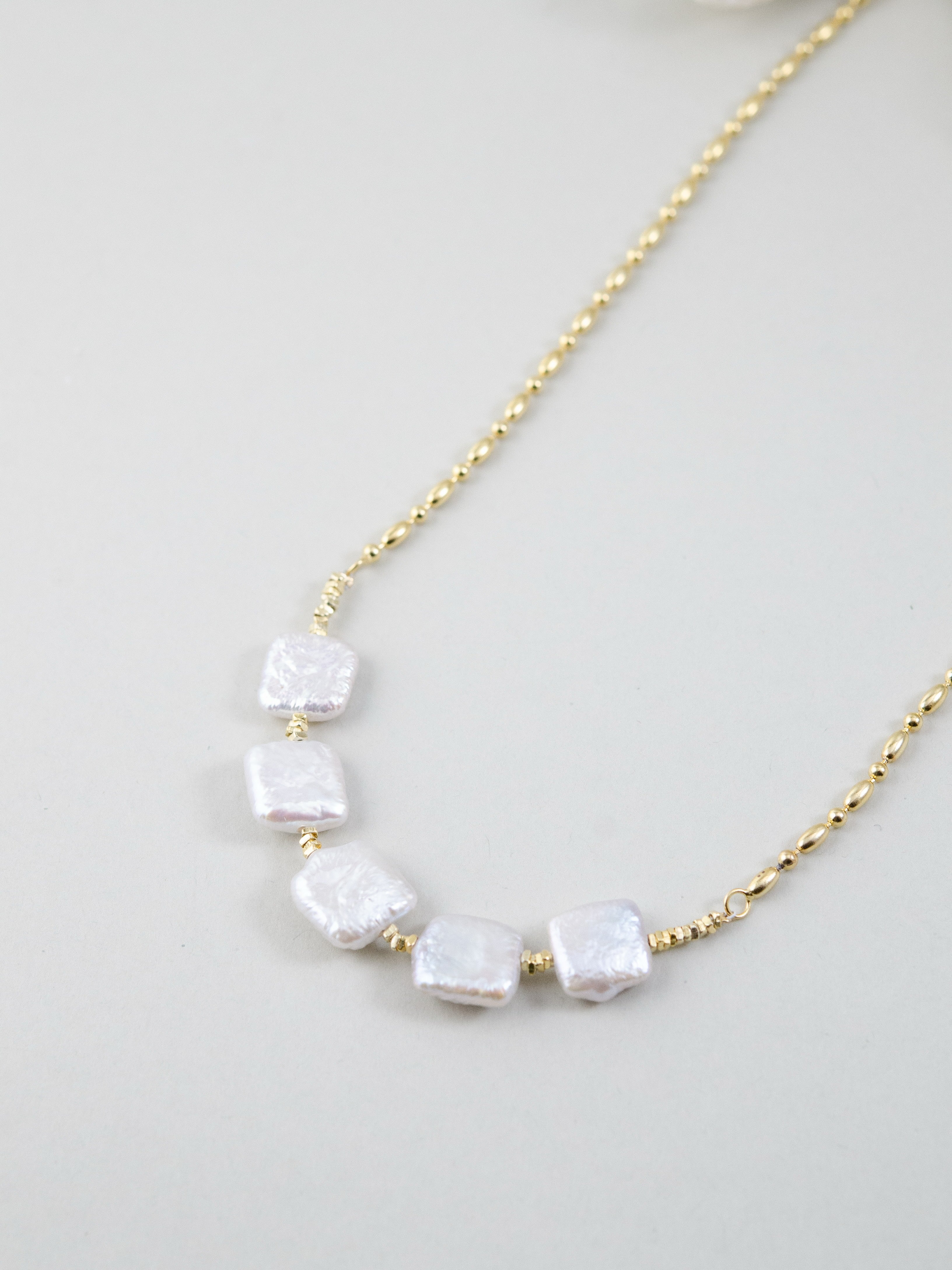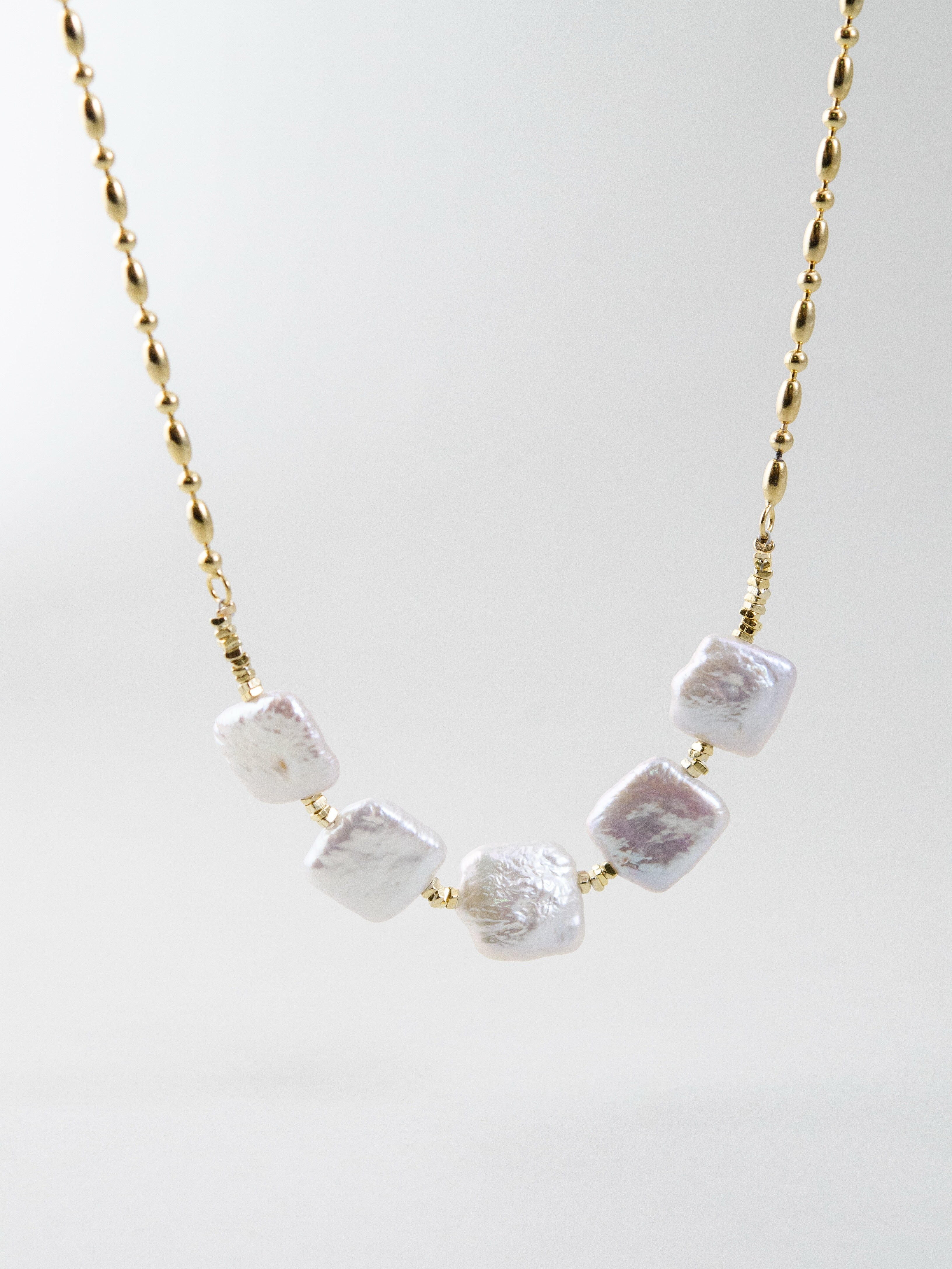 ナチュラルなスクエア型の淡水パールを規則的に並べ、細身のゴールドビーズチェーンと組み合わせたネックレスです。整ったライン構成が洗練された印象を演出し、自然な艶や質感がやわらかさを添えています。さりげなく個性と上品さを表現できる、大人のためのミニマルジュエリーです。