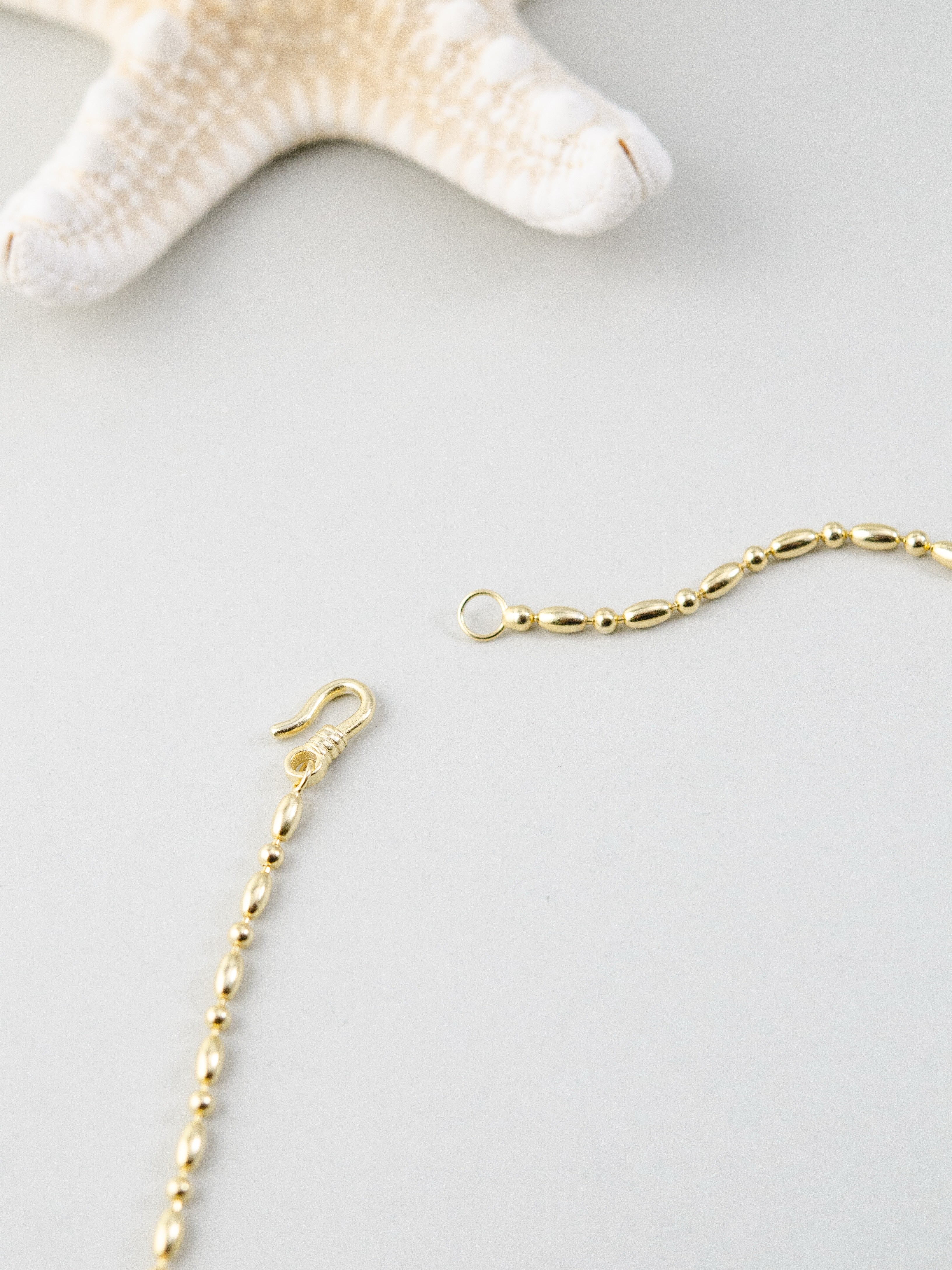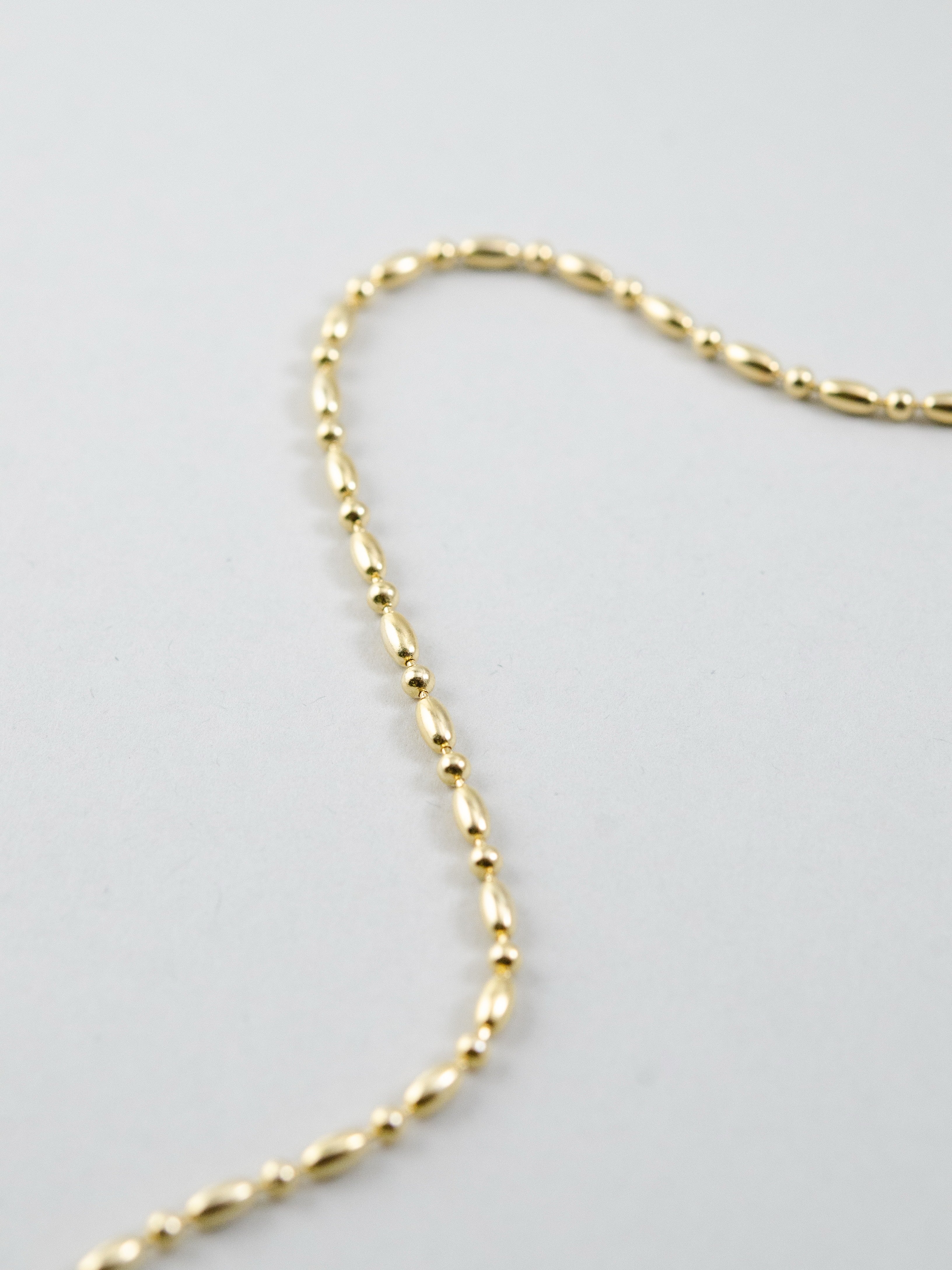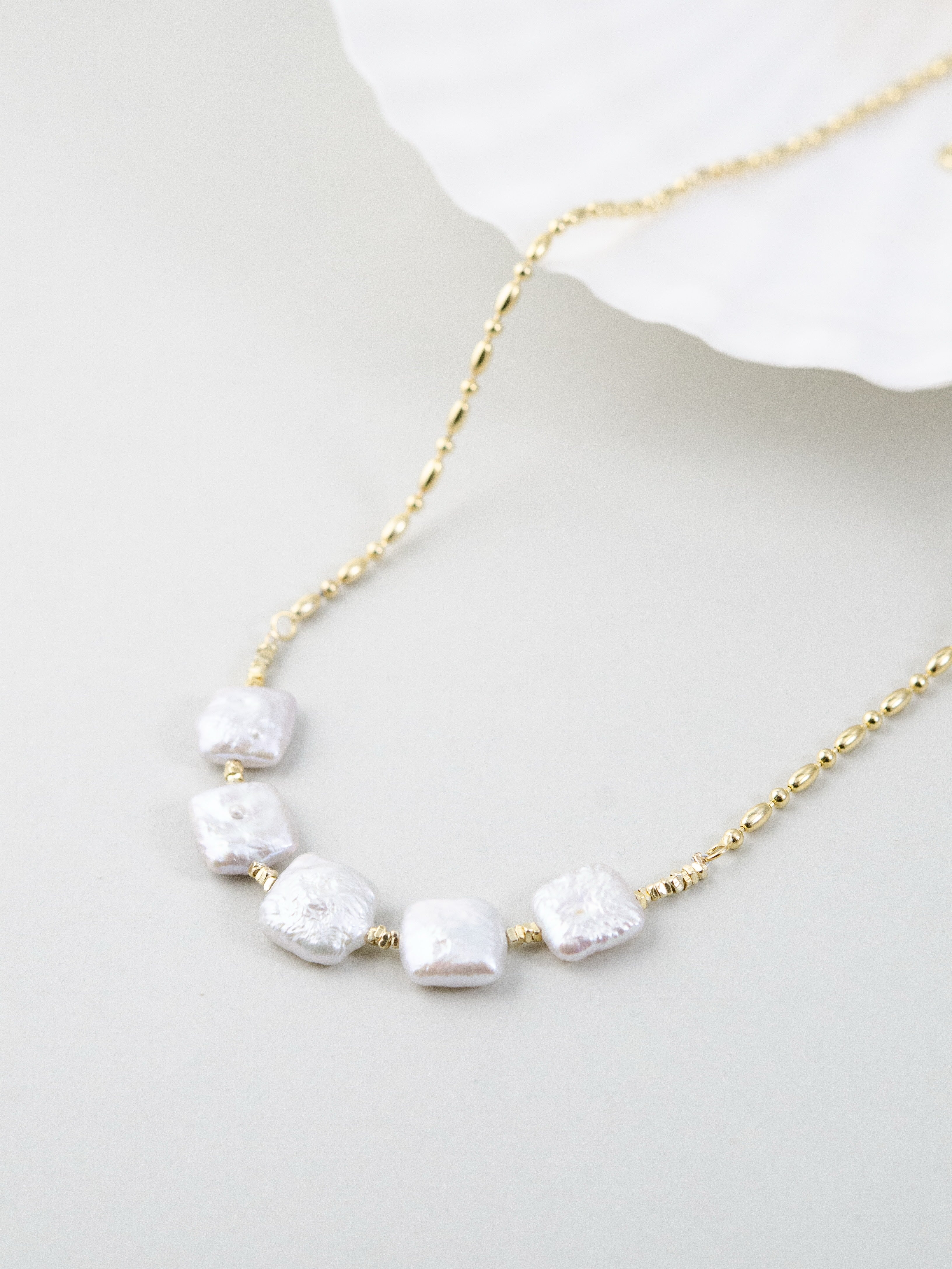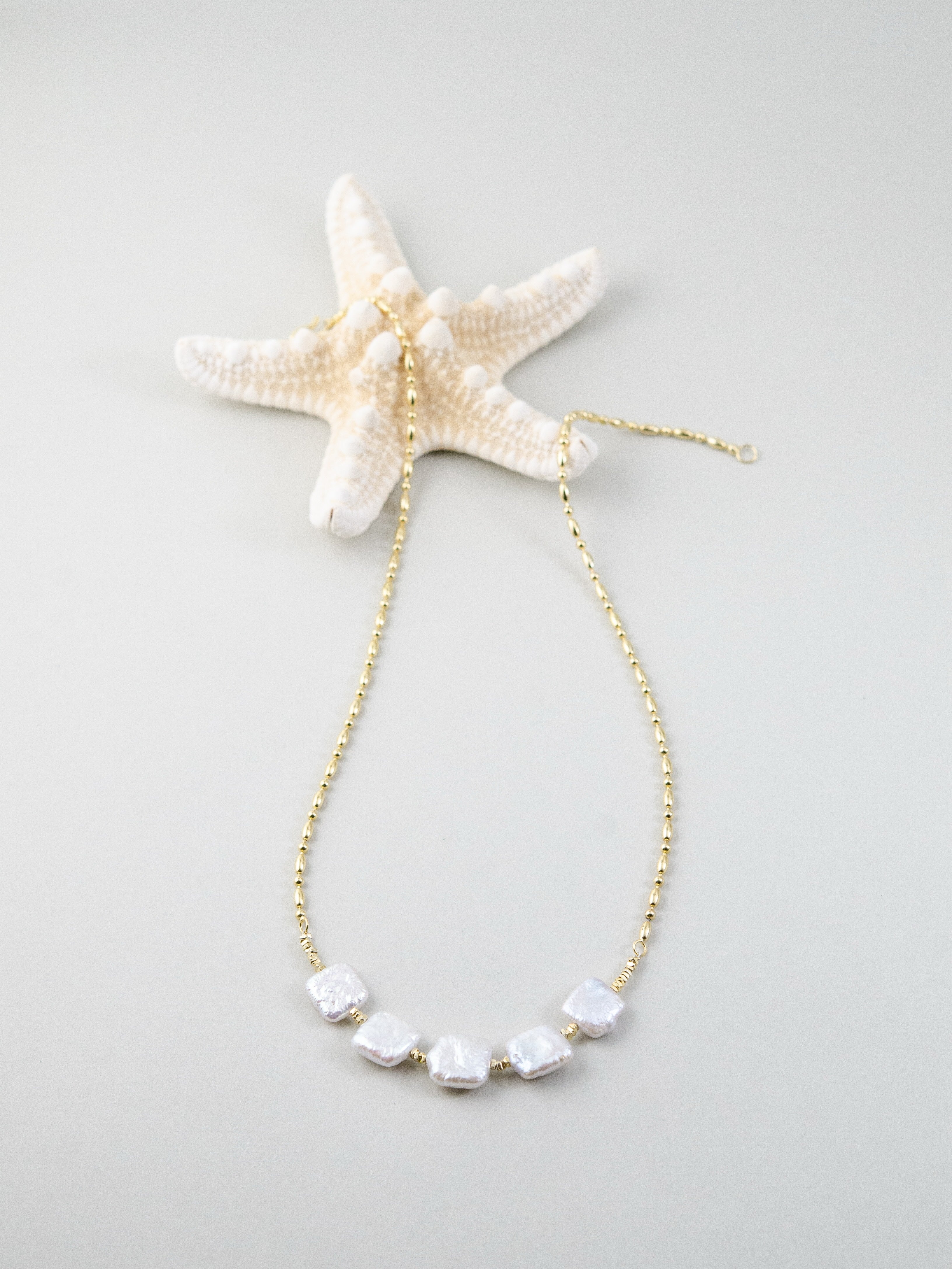 ナチュラルなスクエア型の淡水パールを規則的に並べ、細身のゴールドビーズチェーンと組み合わせたネックレスです。整ったライン構成が洗練された印象を演出し、自然な艶や質感がやわらかさを添えています。さりげなく個性と上品さを表現できる、大人のためのミニマルジュエリーです。