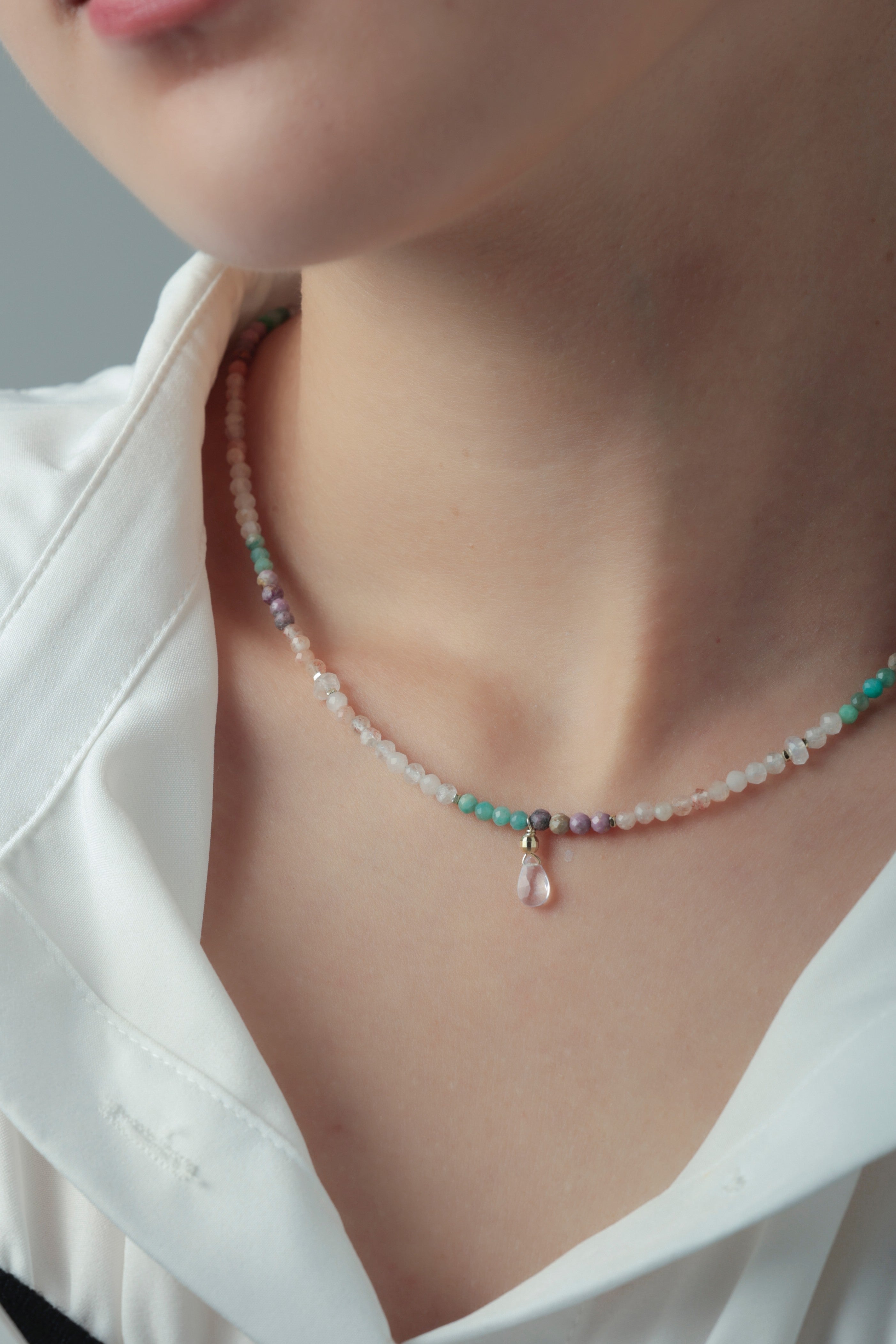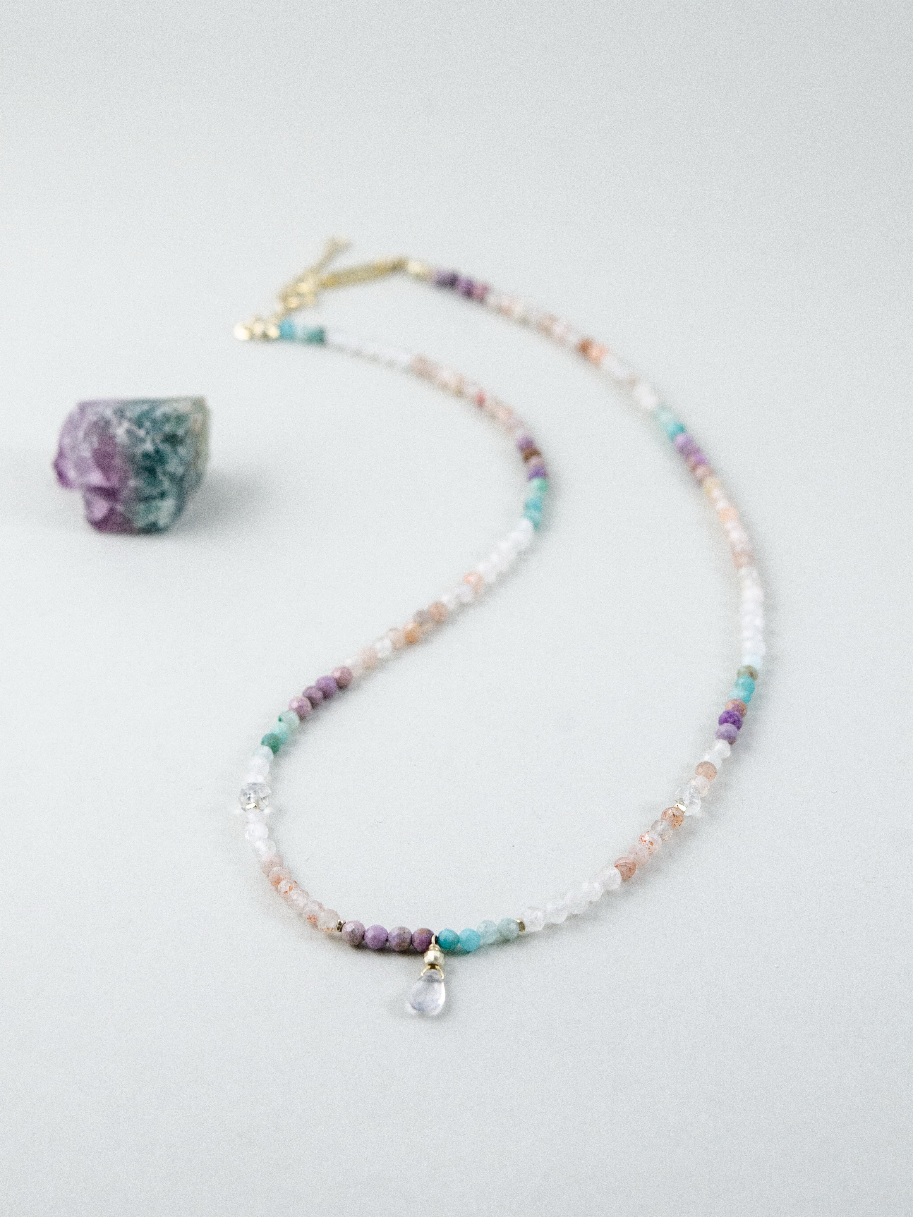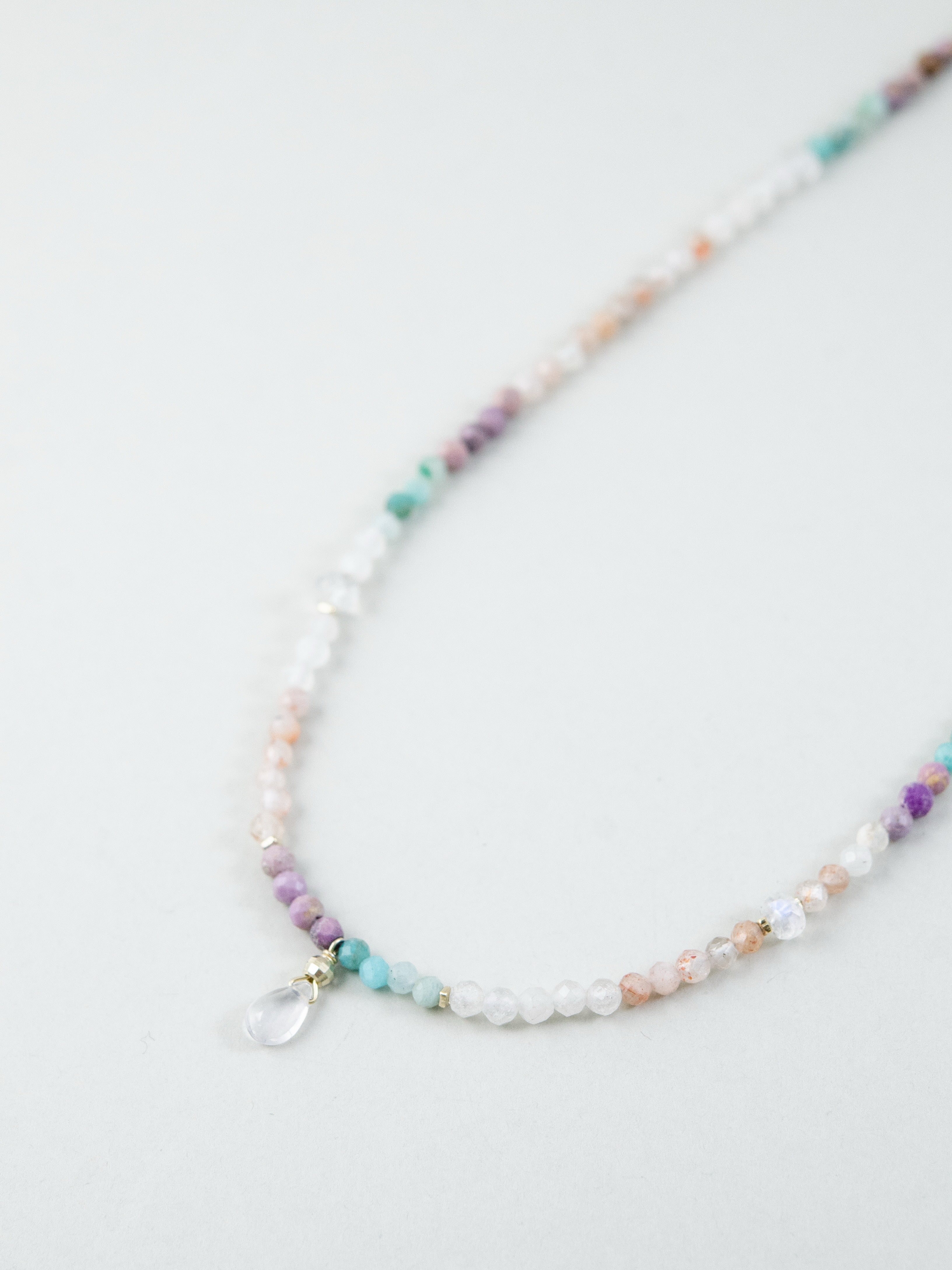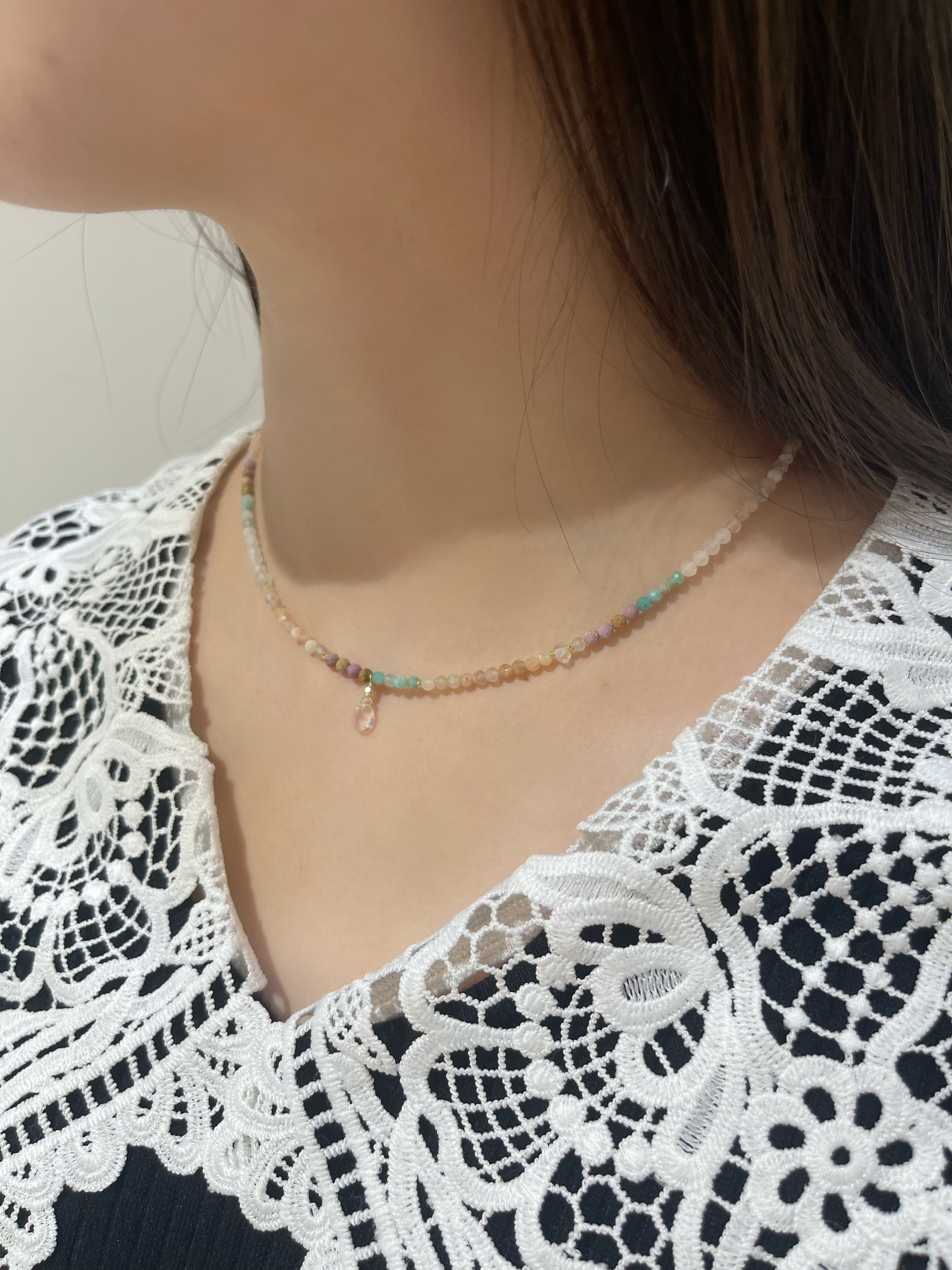 アマゾナイトの爽やかなブルーと、ムーンストーンの優しいシアーな輝きを織り交ぜた、淡くやわらかな色合いのネックレスです。まるで朝焼けの光を身にまとったかのような透明感と軽やかさがあり、控えめなカラフルさが大人の遊び心を演出します。小さなドロップチャームが揺れるたび、日常にやさしい輝きを添えてくれる一本です。
