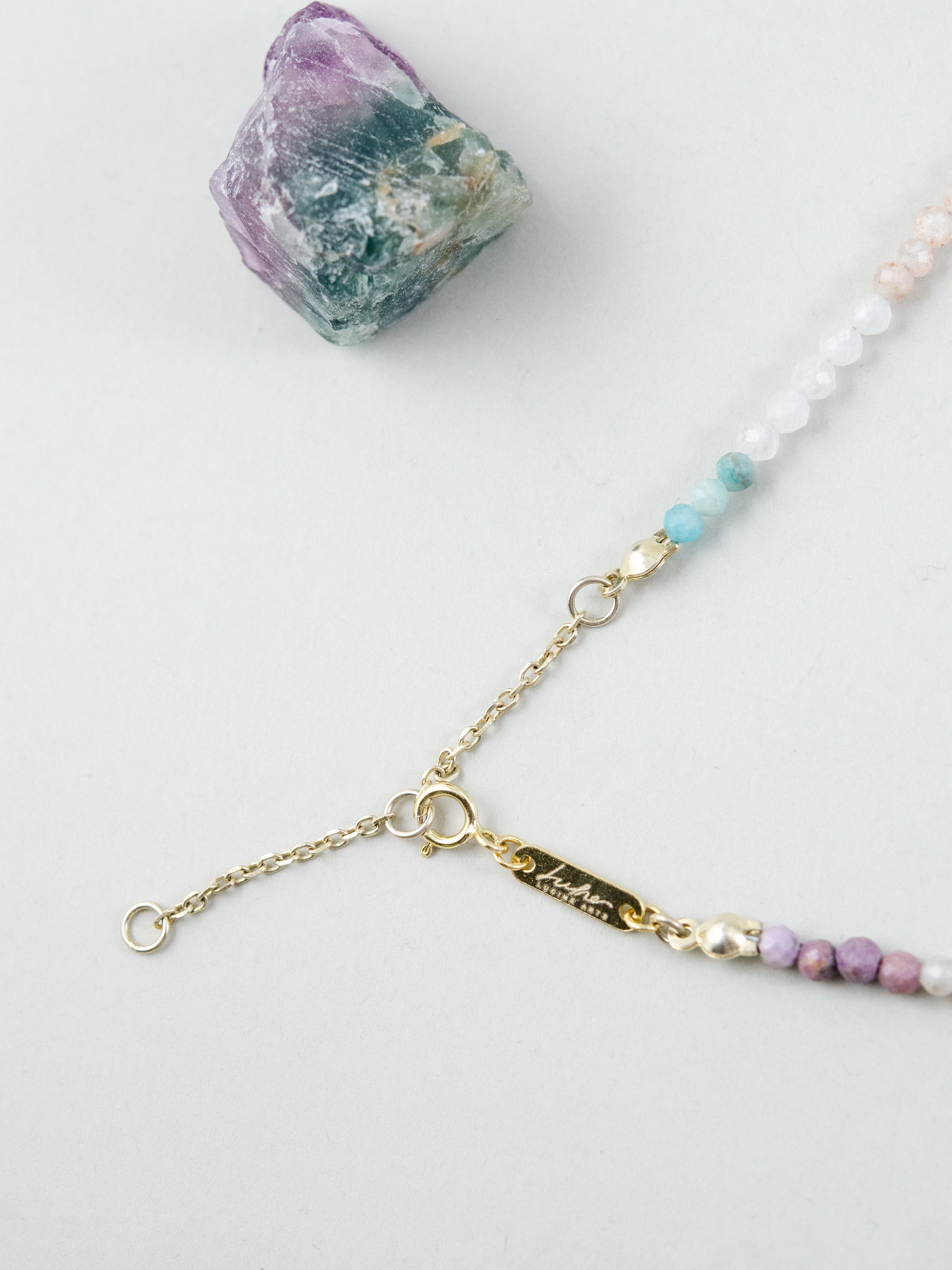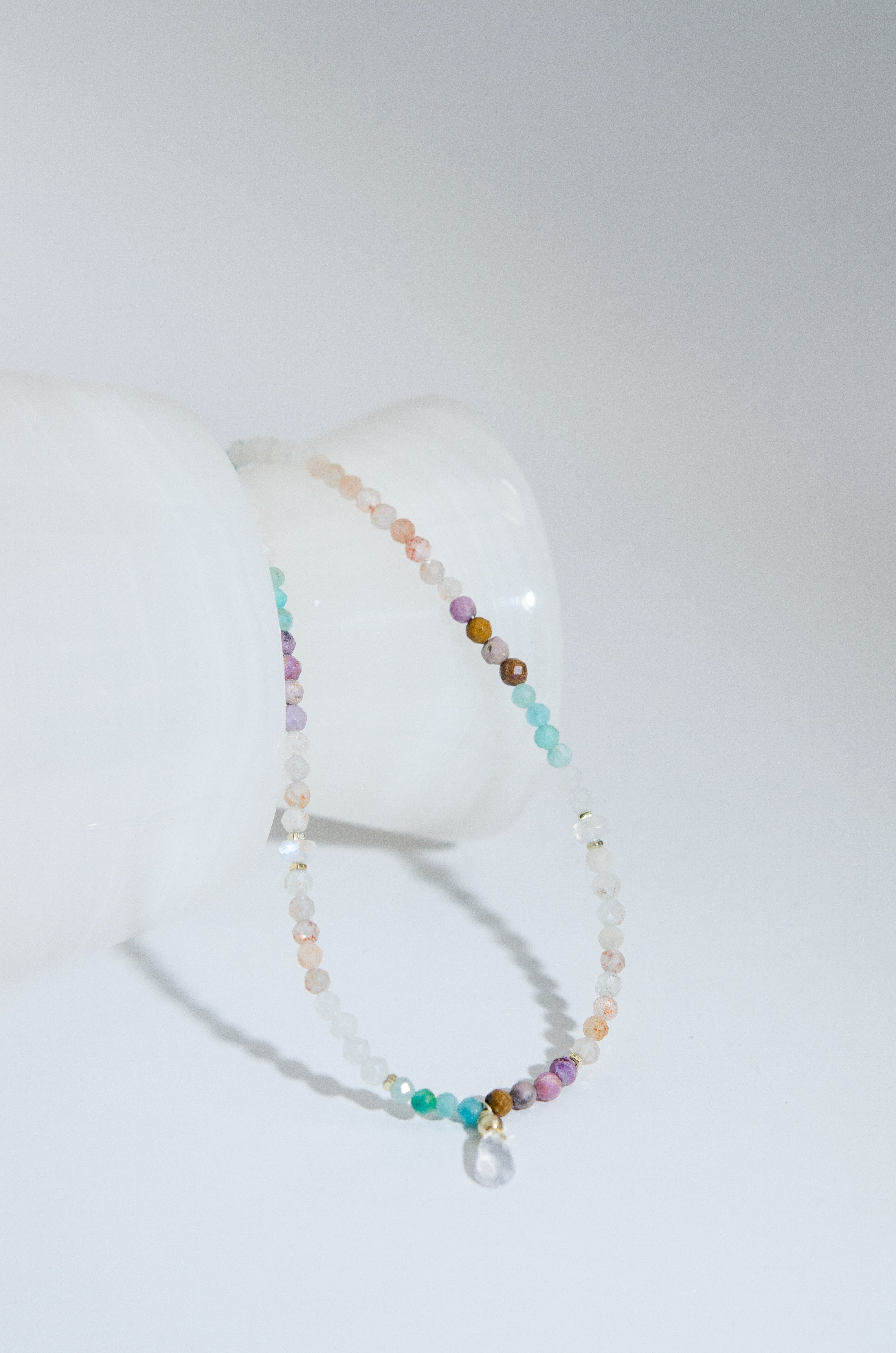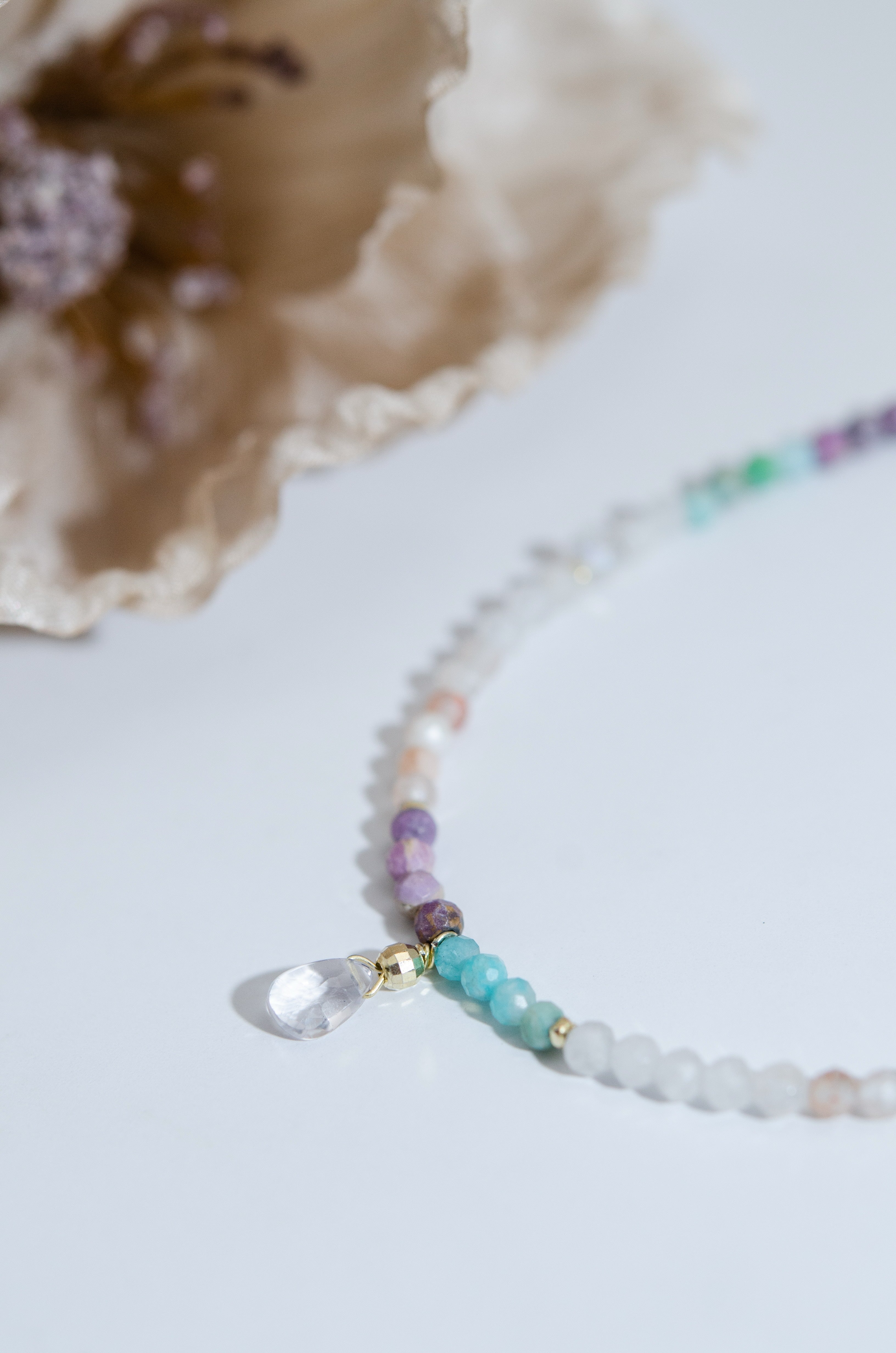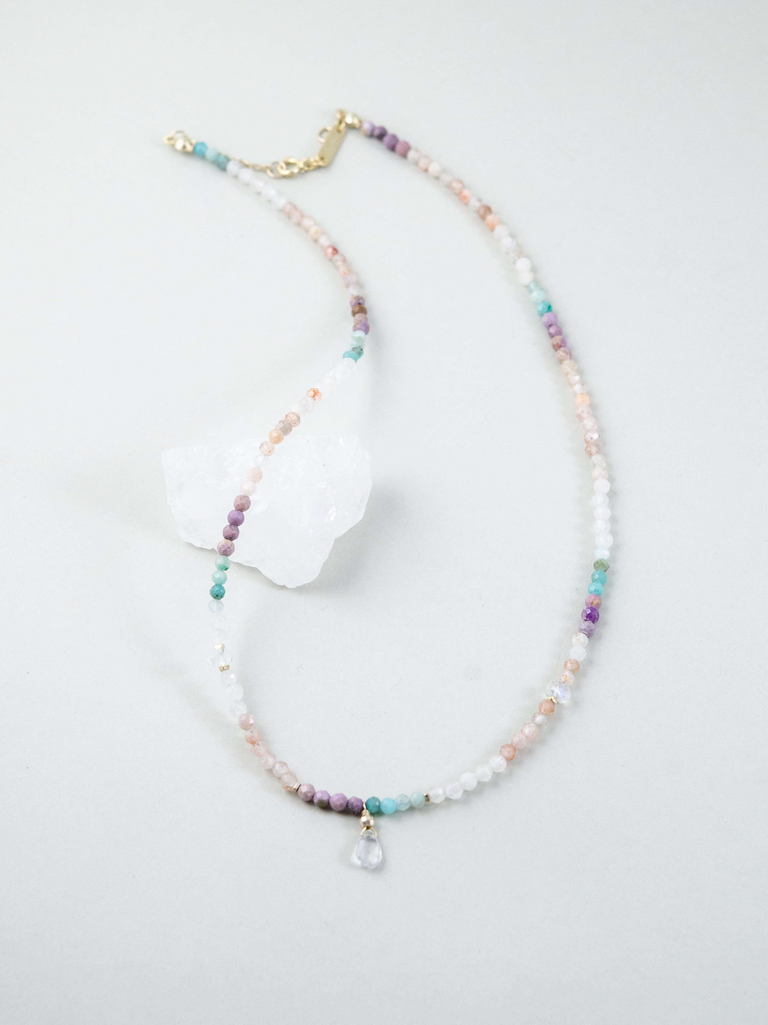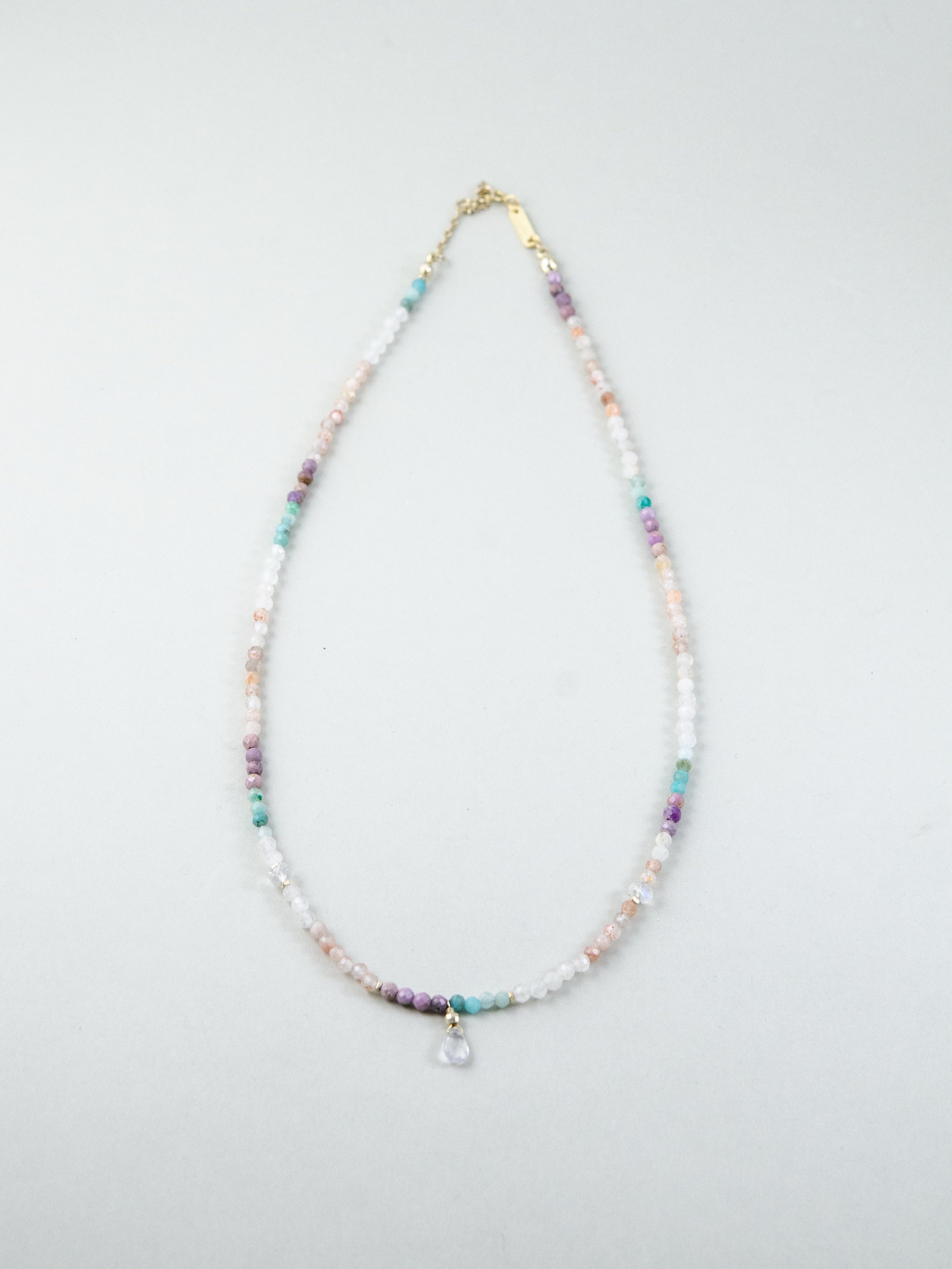 アマゾナイトの爽やかなブルーと、ムーンストーンの優しいシアーな輝きを織り交ぜた、淡くやわらかな色合いのネックレスです。まるで朝焼けの光を身にまとったかのような透明感と軽やかさがあり、控えめなカラフルさが大人の遊び心を演出します。小さなドロップチャームが揺れるたび、日常にやさしい輝きを添えてくれる一本です。