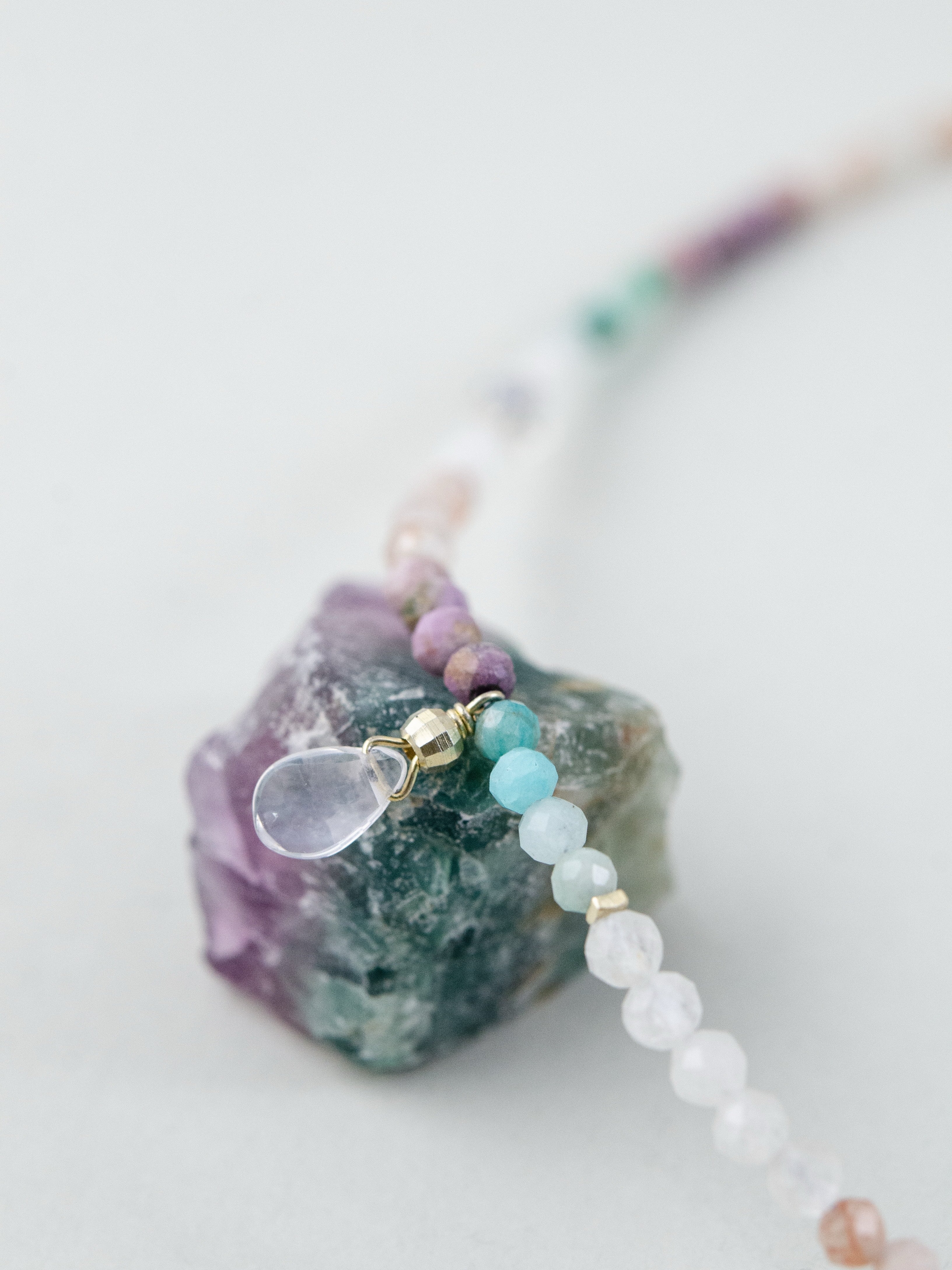 淡く多彩な配色は春夏の装いにぴったりで、ドロップチャームがさりげないアクセントに。心を浄化し、自分らしさを引き出すジュエリーとして、日常使いやギフトにもおすすめです。