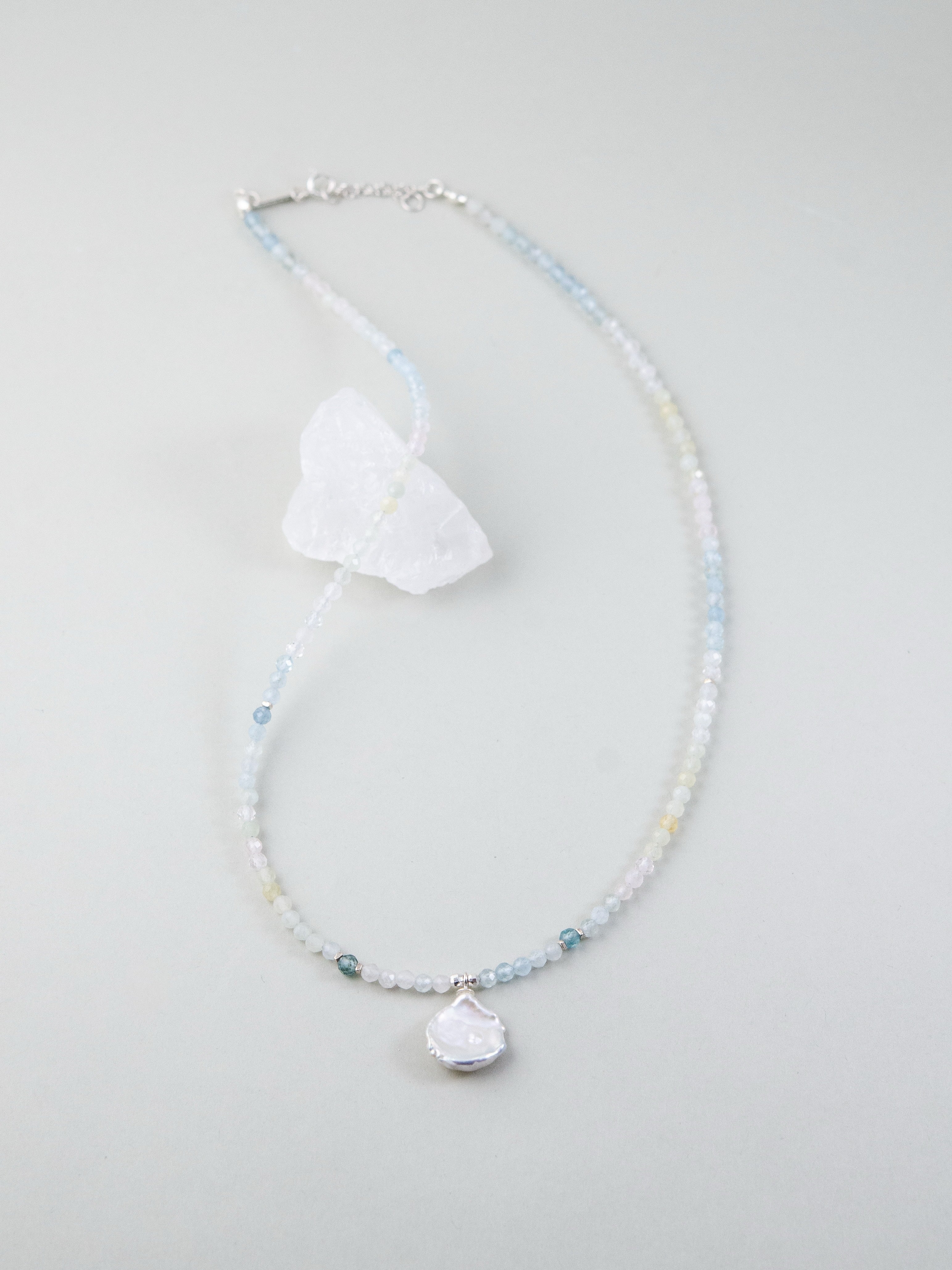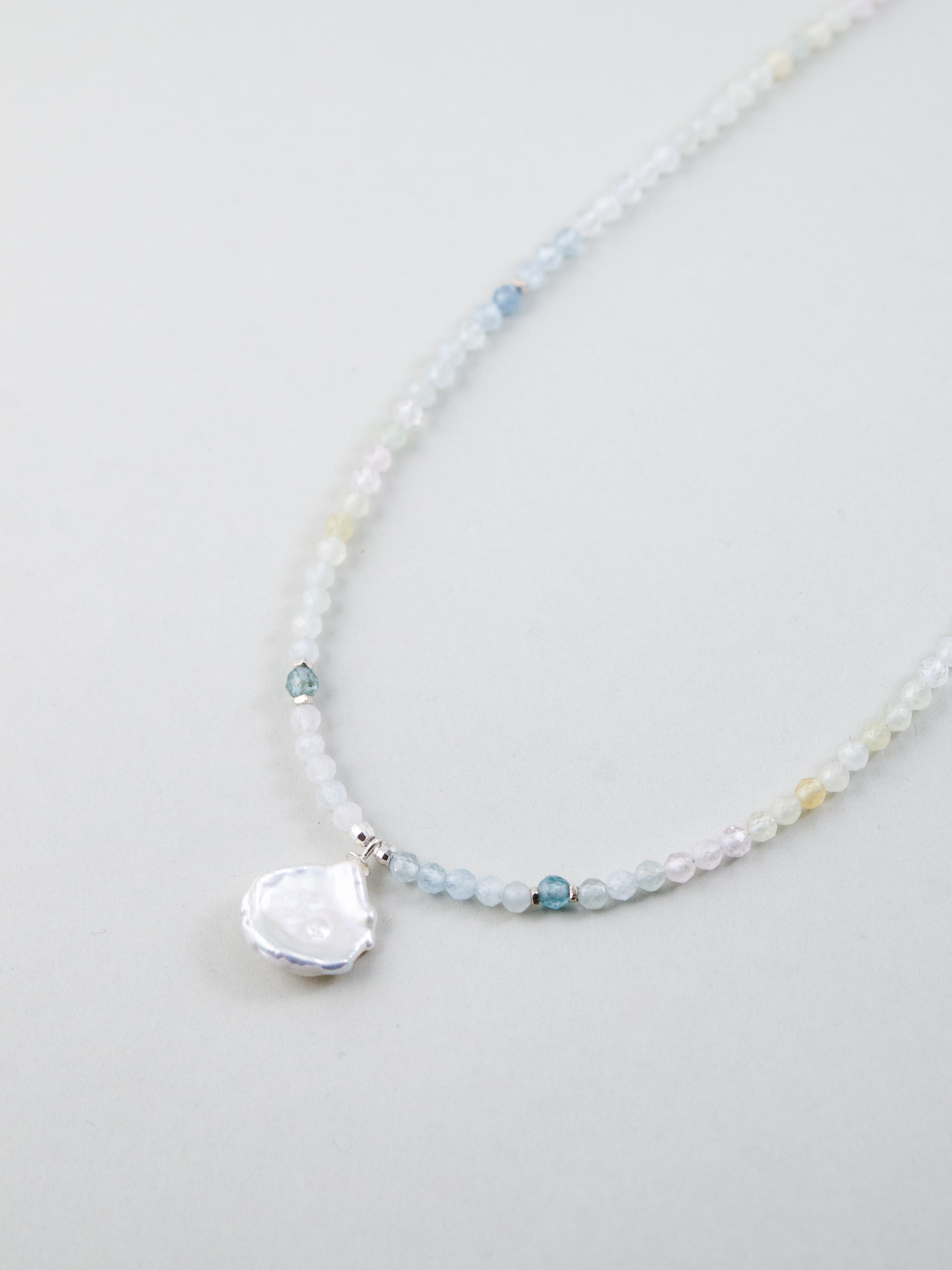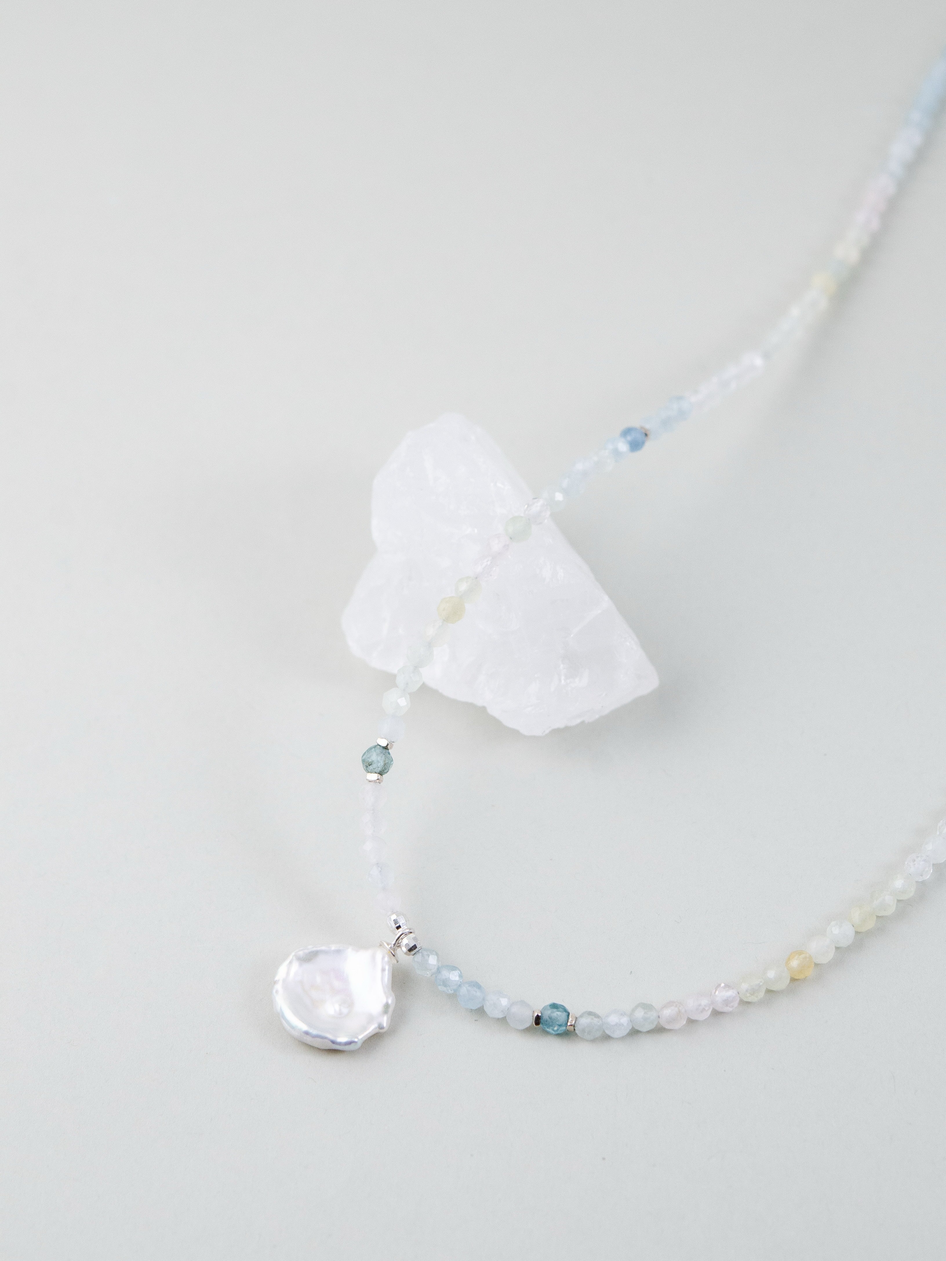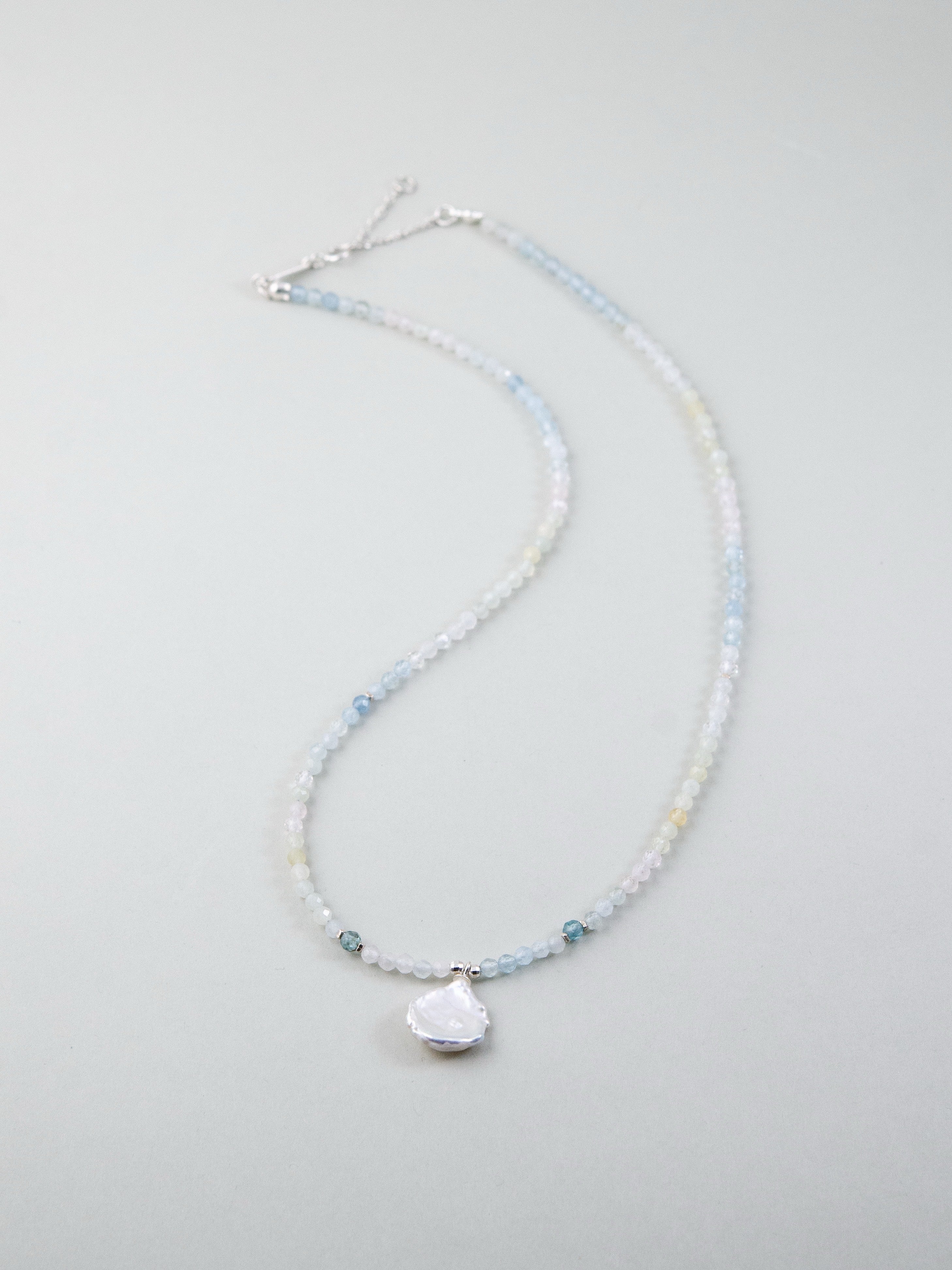 まるで朝の光がそっと差し込む窓辺のように、やさしく澄んだ雰囲気を持つネックレスです。主役のモルガナイトに、淡いピンクやブルー、イエローなどのやわらかなカラーが溶け合い、穏やかな時間を感じさせます。胸元で揺れるしずく型の透明チャームが、心に残る一瞬のときめきを表現し、全体に静かな輝きを添えています。「静かな幸せ」をテーマに、日々の中にそっと寄り添うジュエリーです。