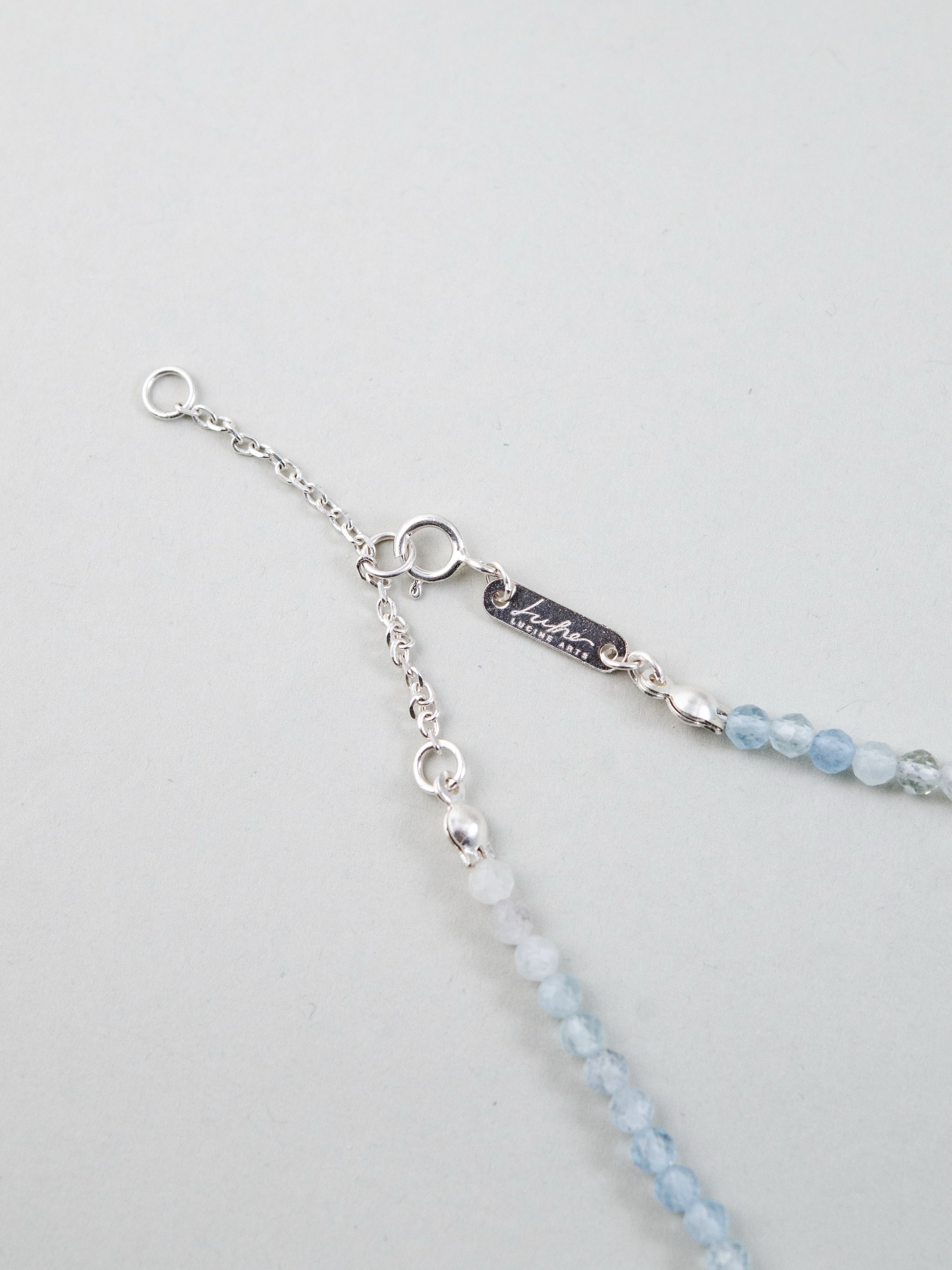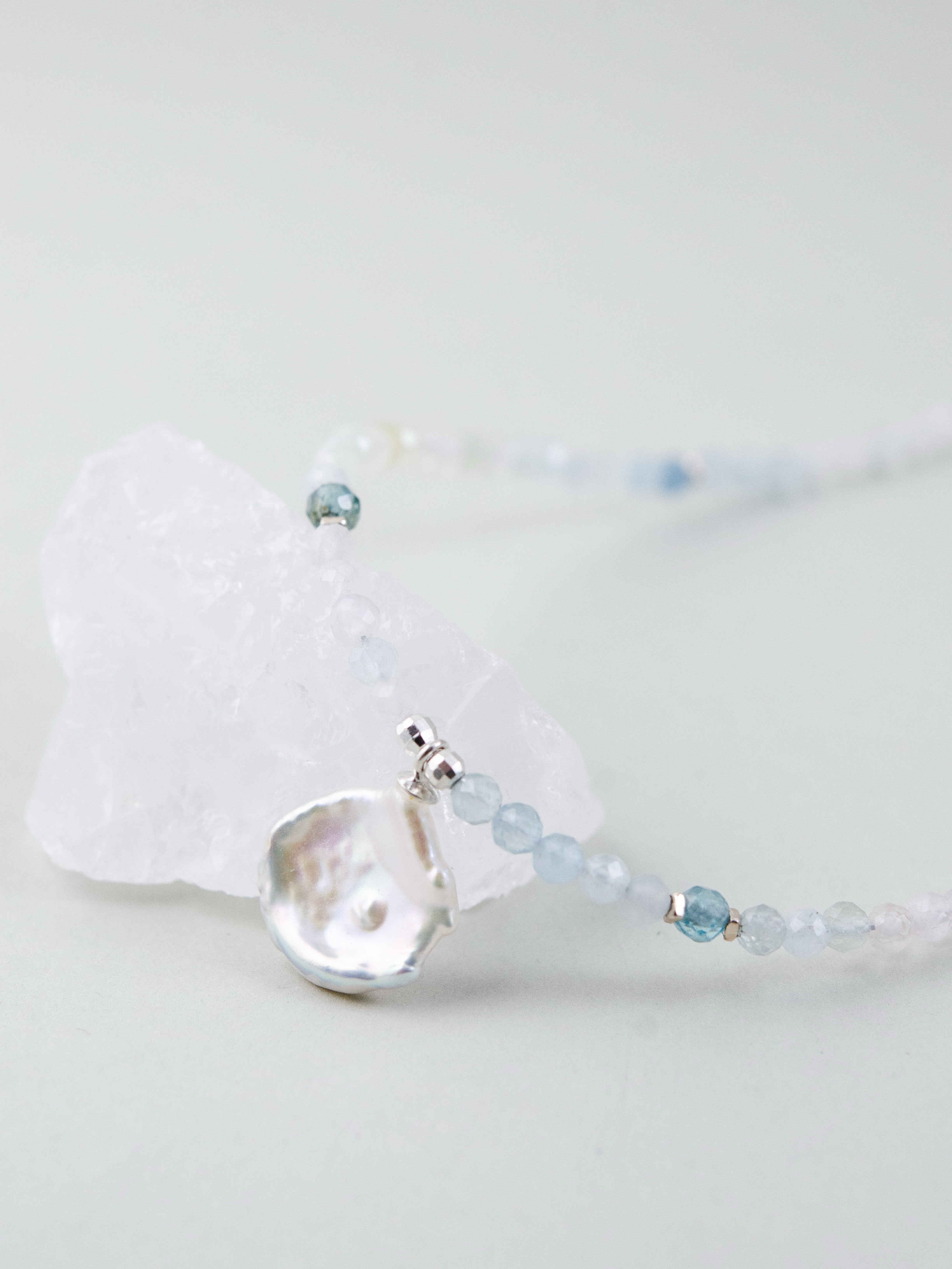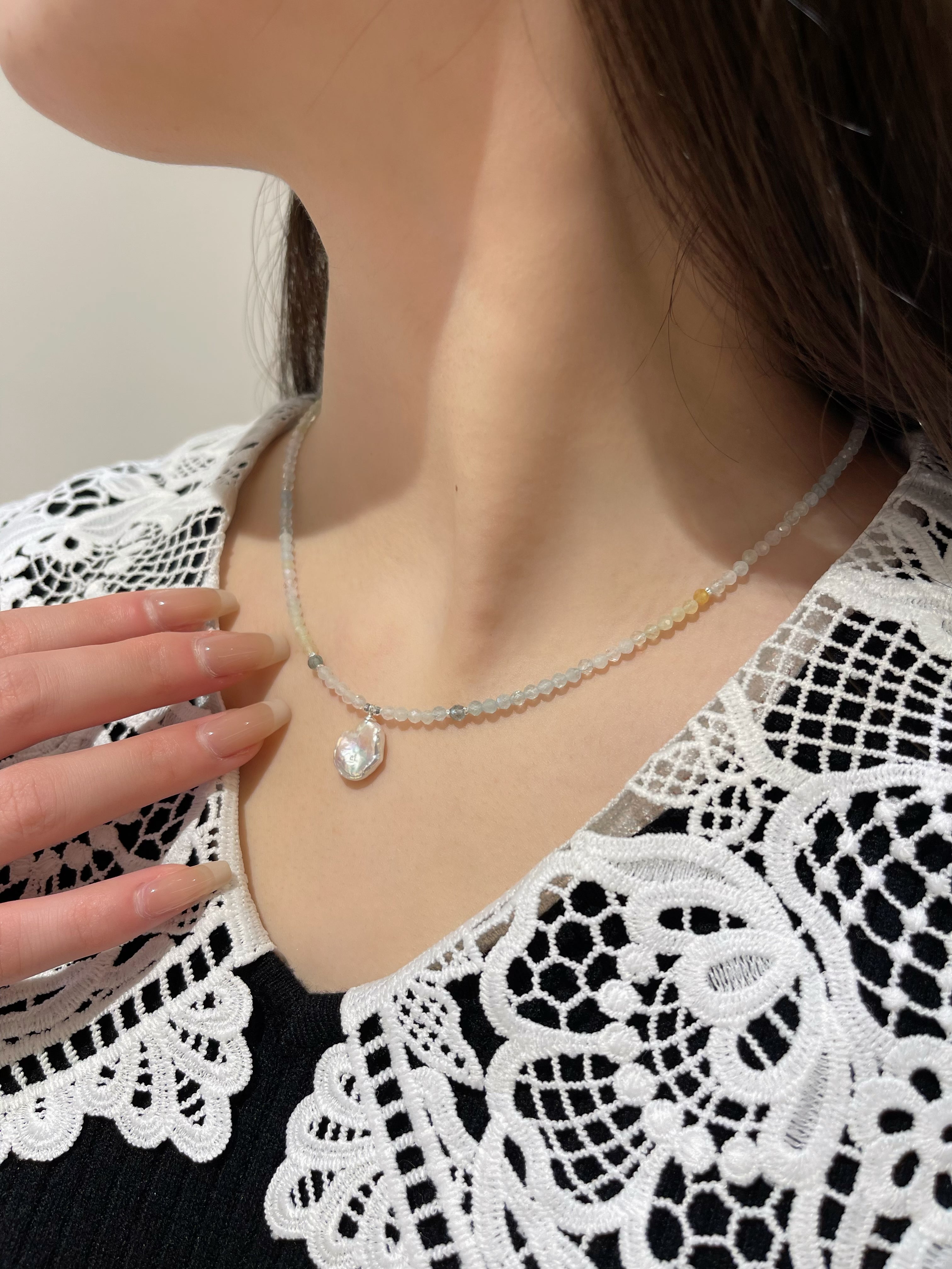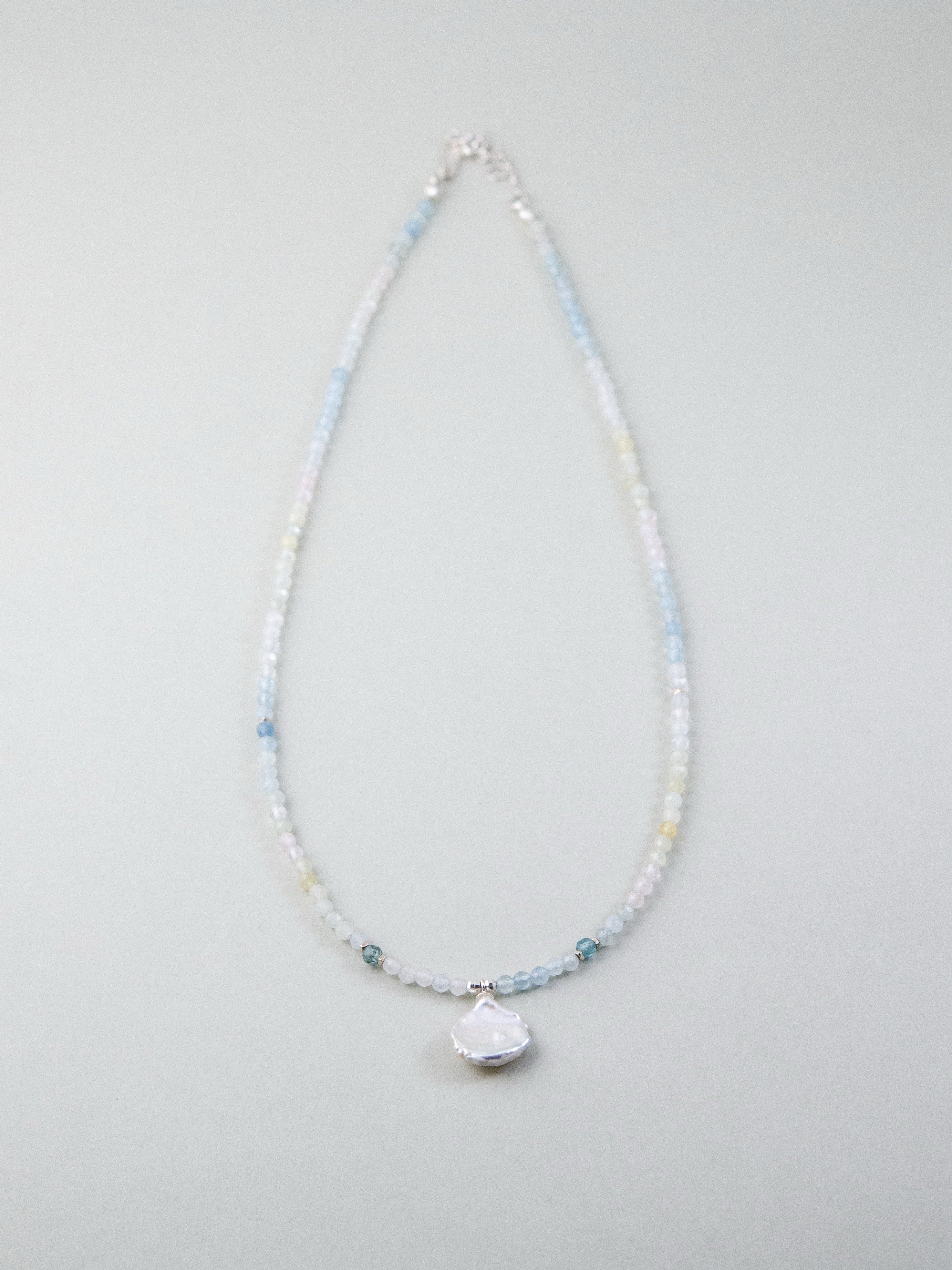 まるで朝の光がそっと差し込む窓辺のように、やさしく澄んだ雰囲気を持つネックレスです。主役のモルガナイトに、淡いピンクやブルー、イエローなどのやわらかなカラーが溶け合い、穏やかな時間を感じさせます。胸元で揺れるしずく型の透明チャームが、心に残る一瞬のときめきを表現し、全体に静かな輝きを添えています。「静かな幸せ」をテーマに、日々の中にそっと寄り添うジュエリーです。