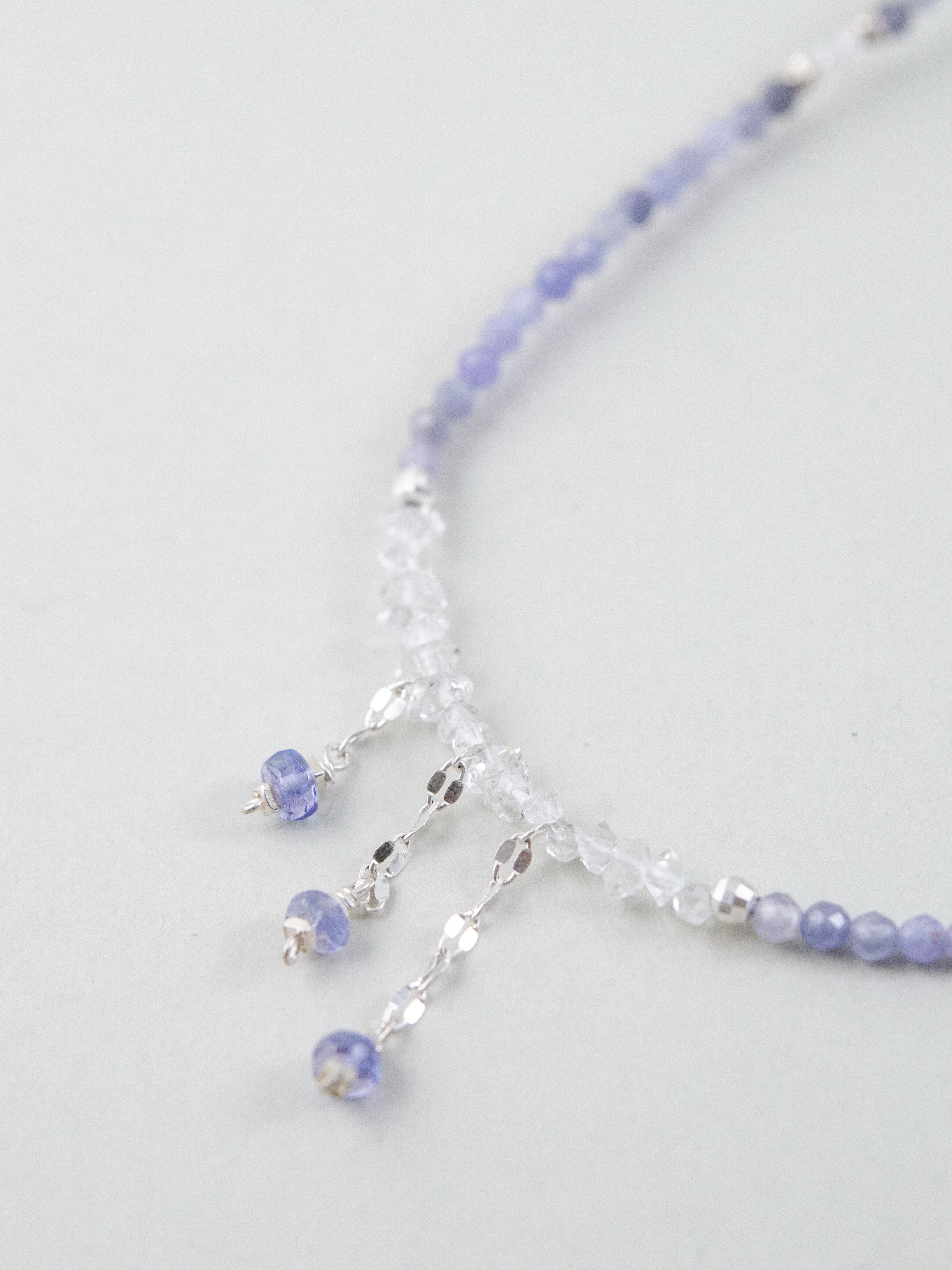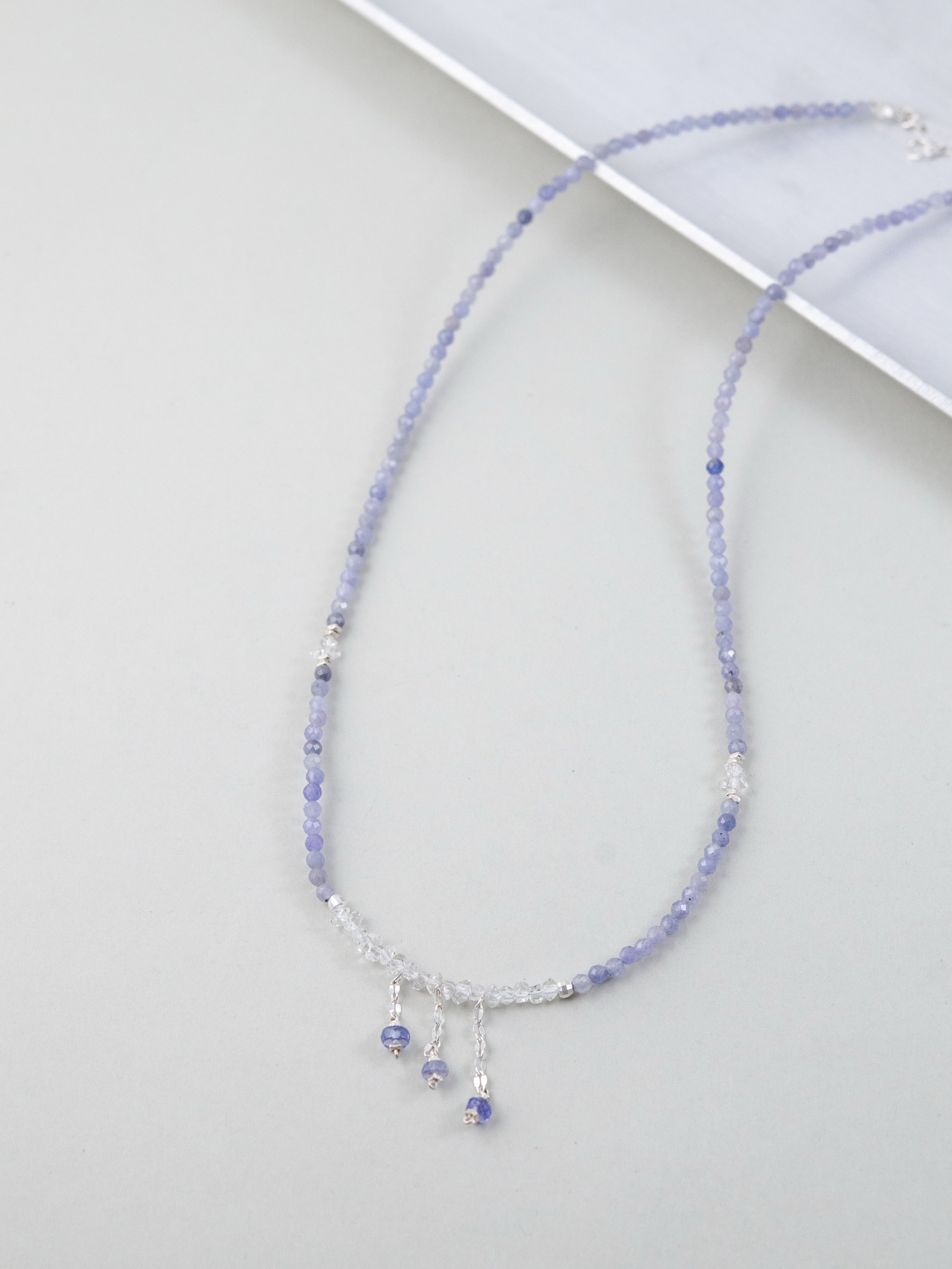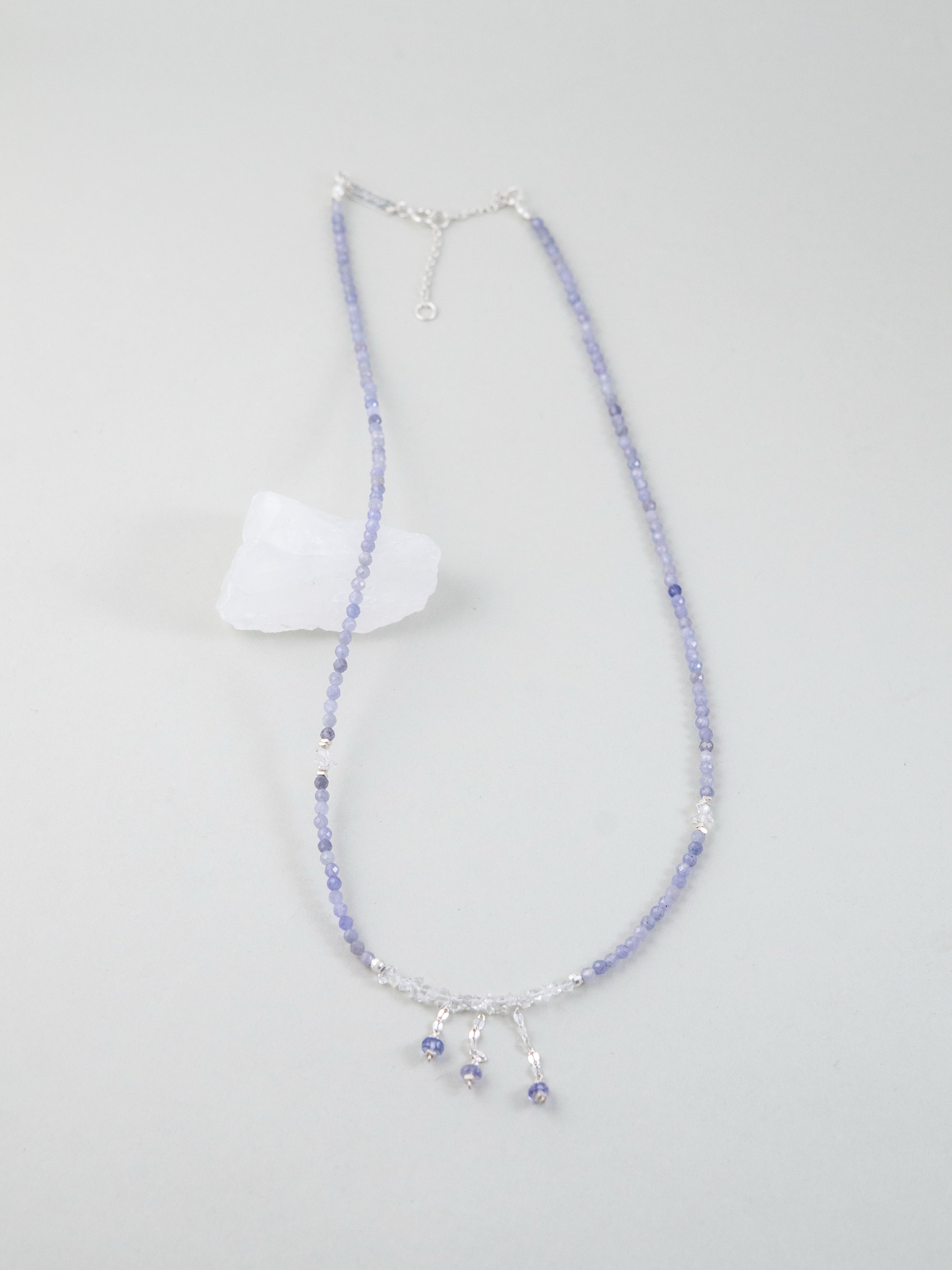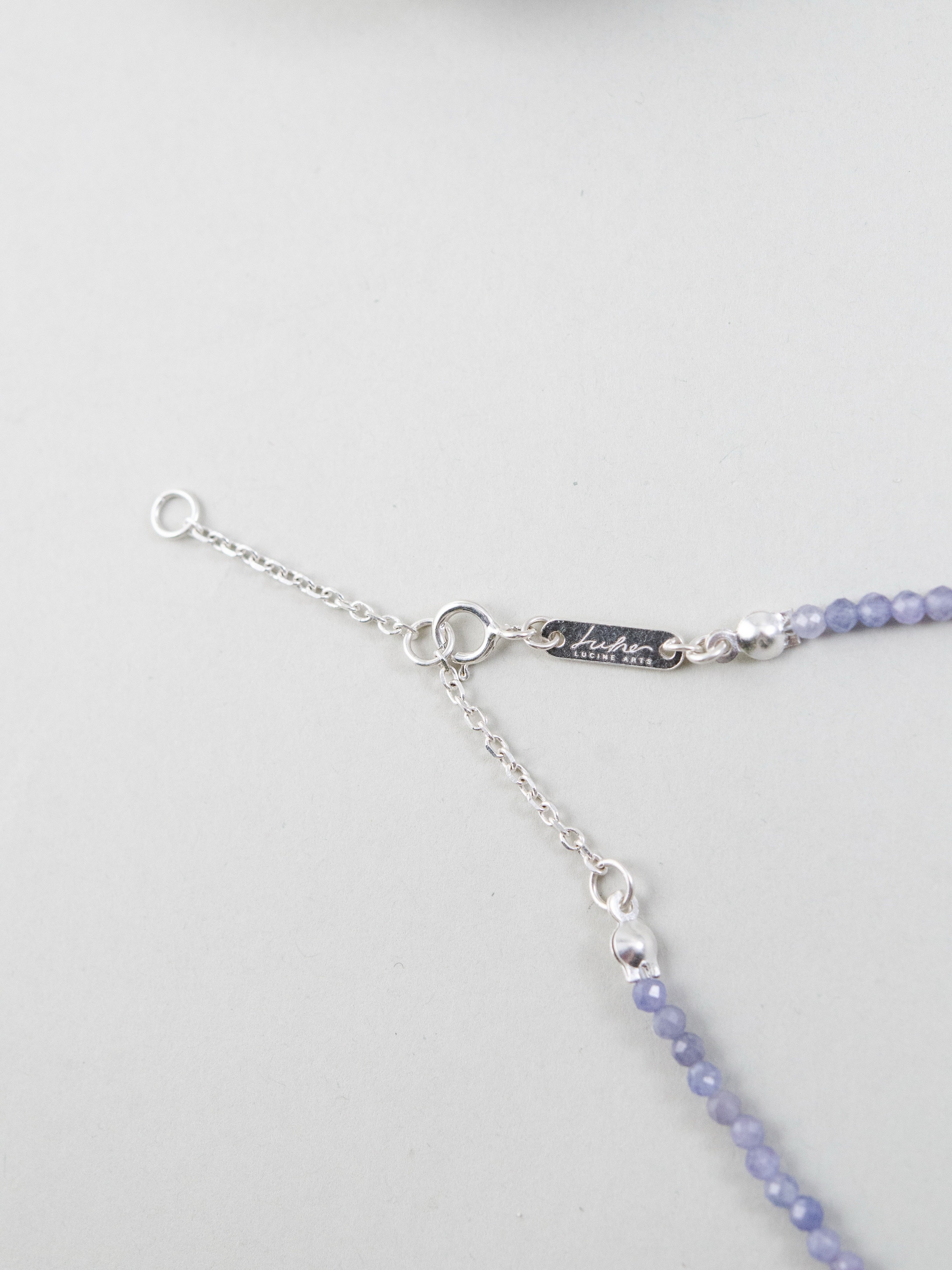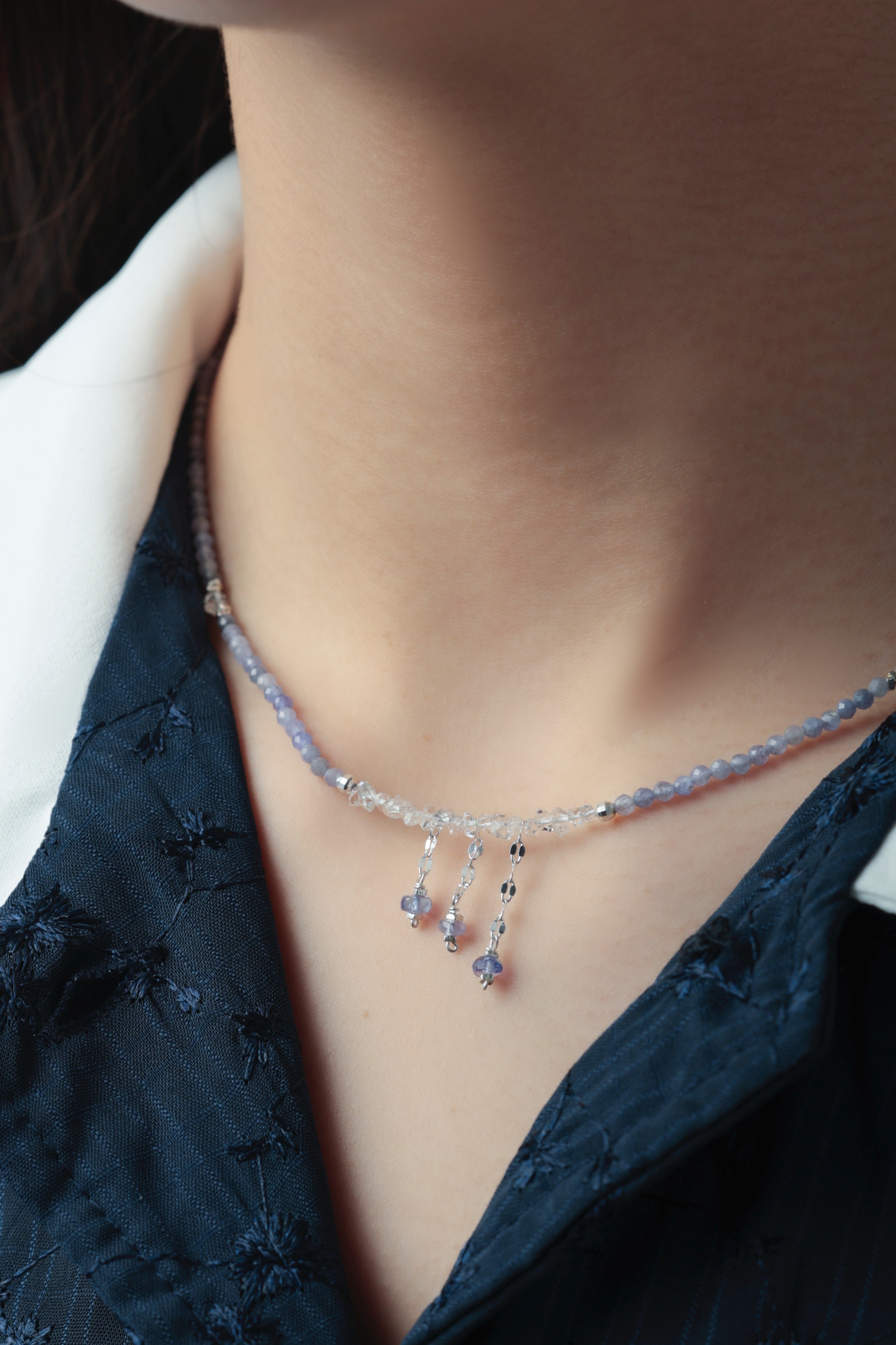 タンザナイトの深みあるブルーとフェナカイトの澄んだ輝きが溶け合い、まるで静かな夜空を閉じ込めたような透明感を纏うネックレス。中央には3つの小さなチャームが星のようにきらめき、さりげなく動きを添えます。「静けさの中に宿る力」をテーマに、凛とした美しさと内なる強さを表現した一本です。