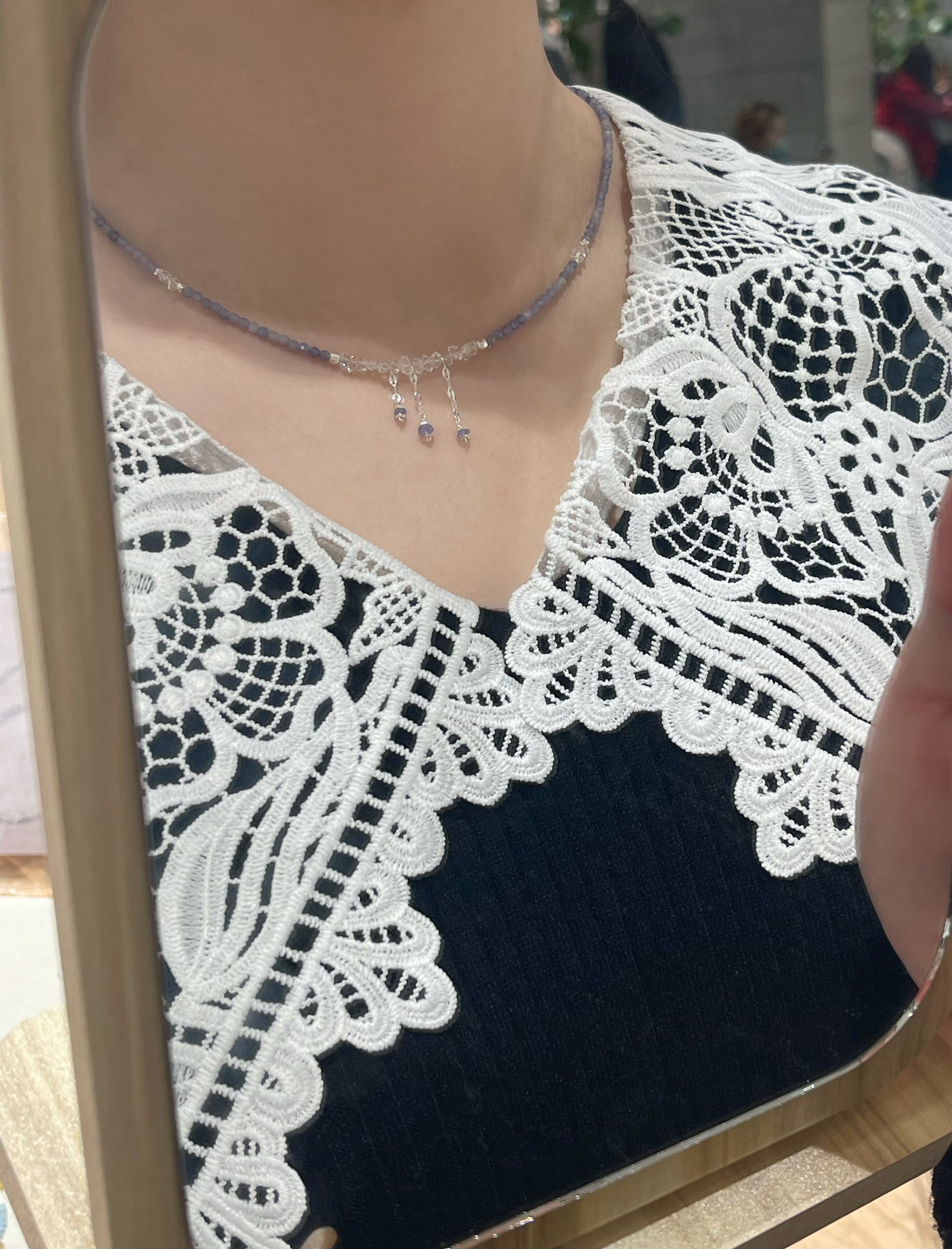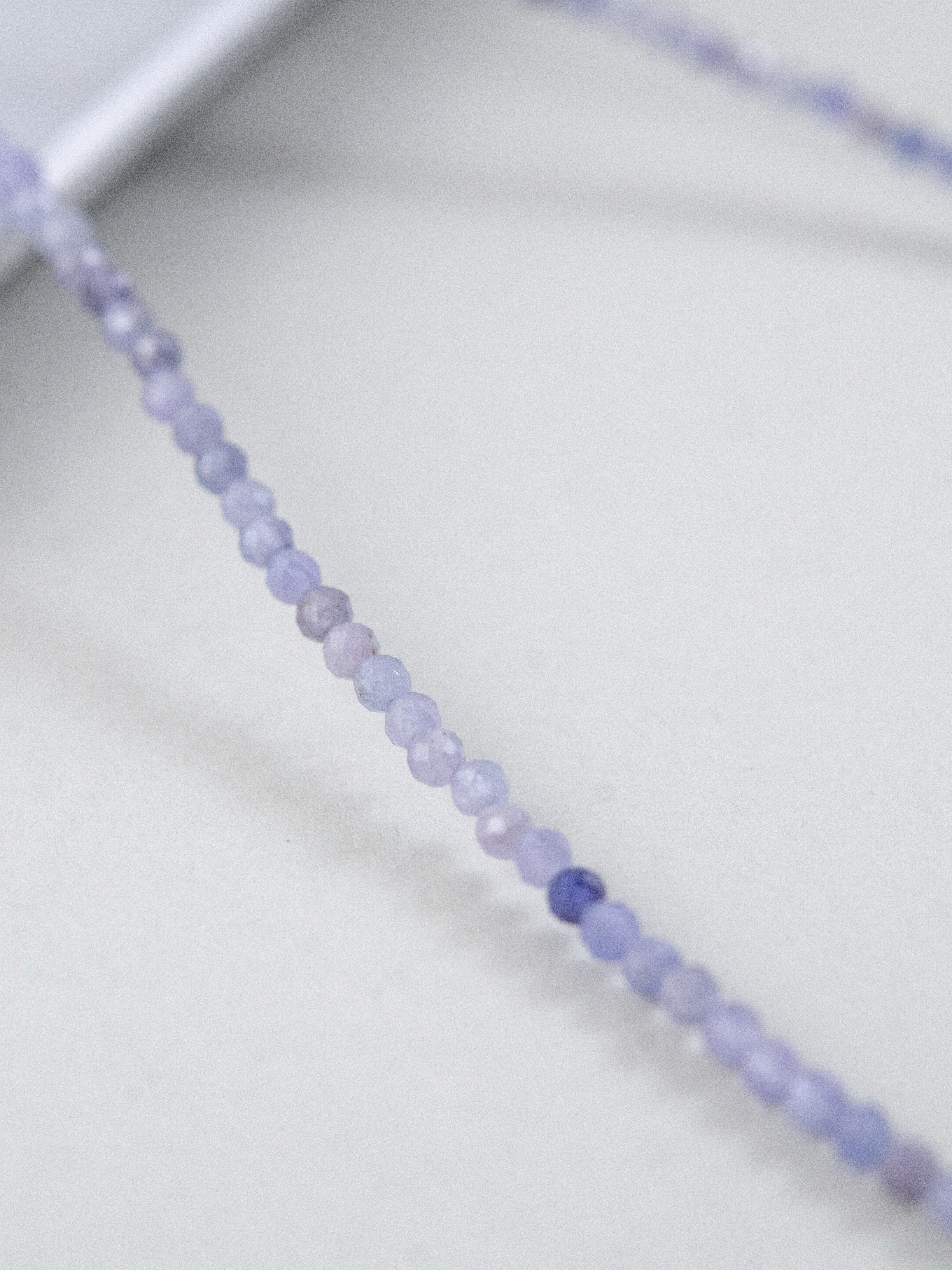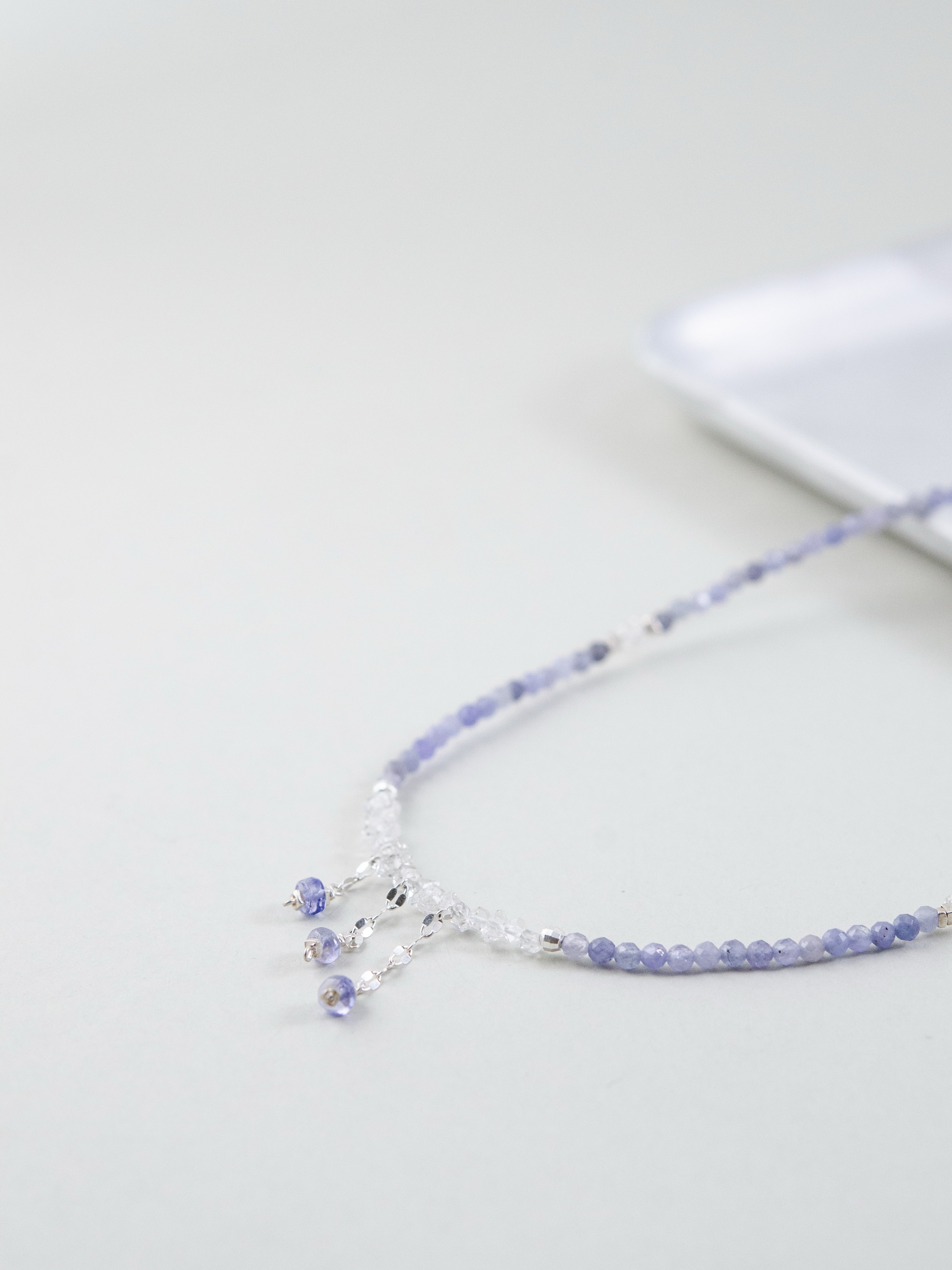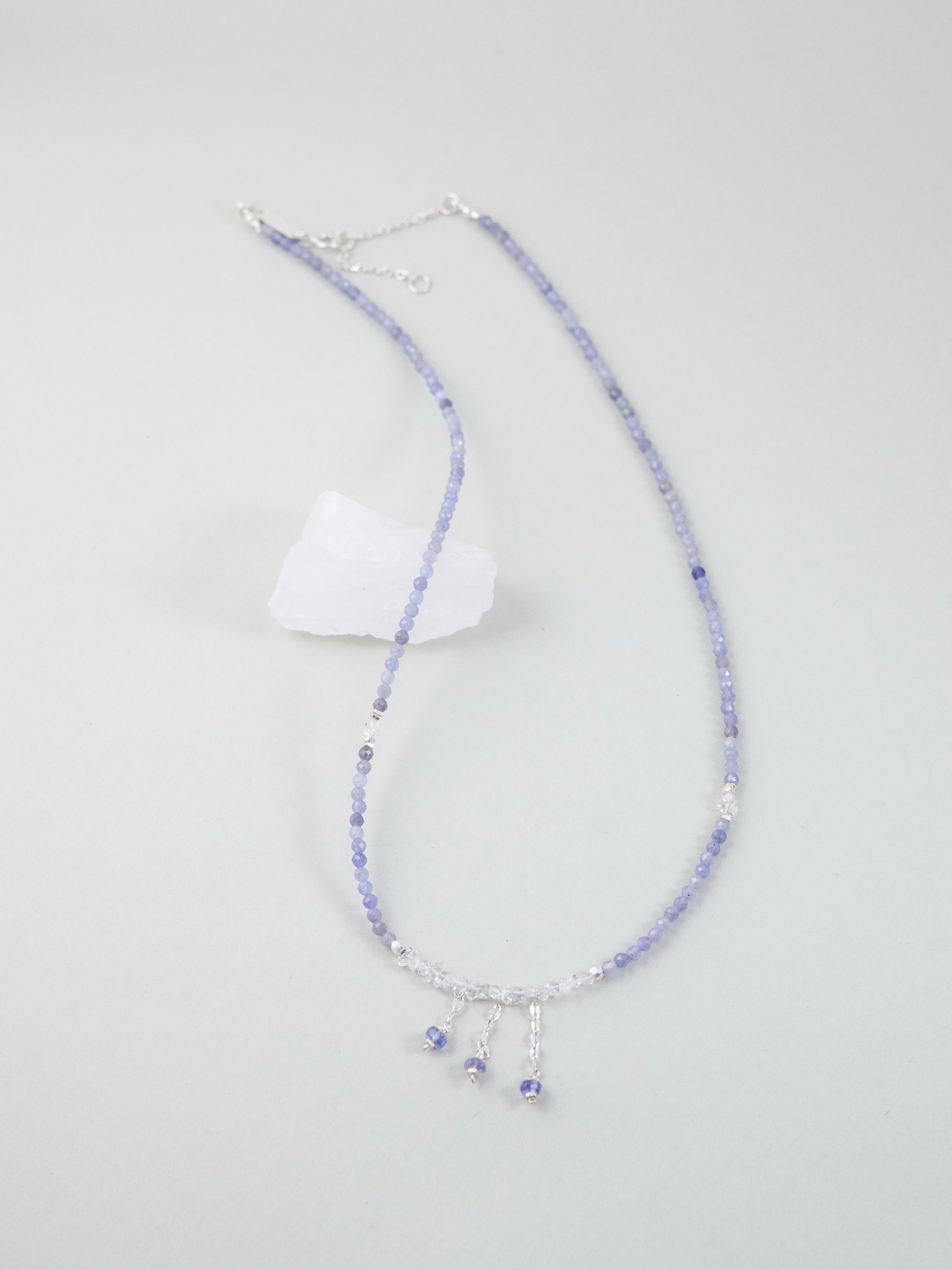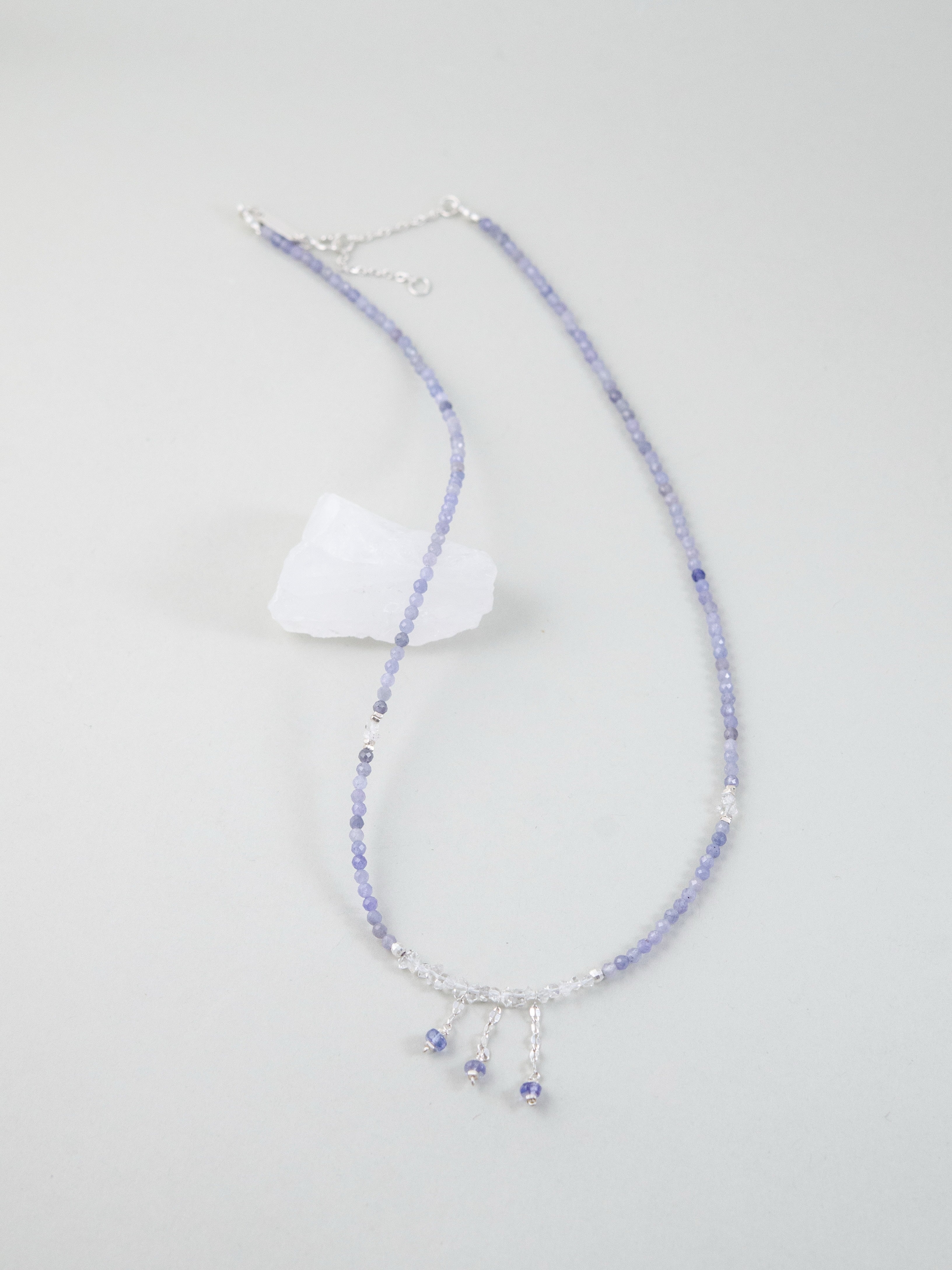 タンザナイトの深みあるブルーとフェナカイトの澄んだ輝きが溶け合い、まるで静かな夜空を閉じ込めたような透明感を纏うネックレス。中央には3つの小さなチャームが星のようにきらめき、さりげなく動きを添えます。「静けさの中に宿る力」をテーマに、凛とした美しさと内なる強さを表現した一本です。