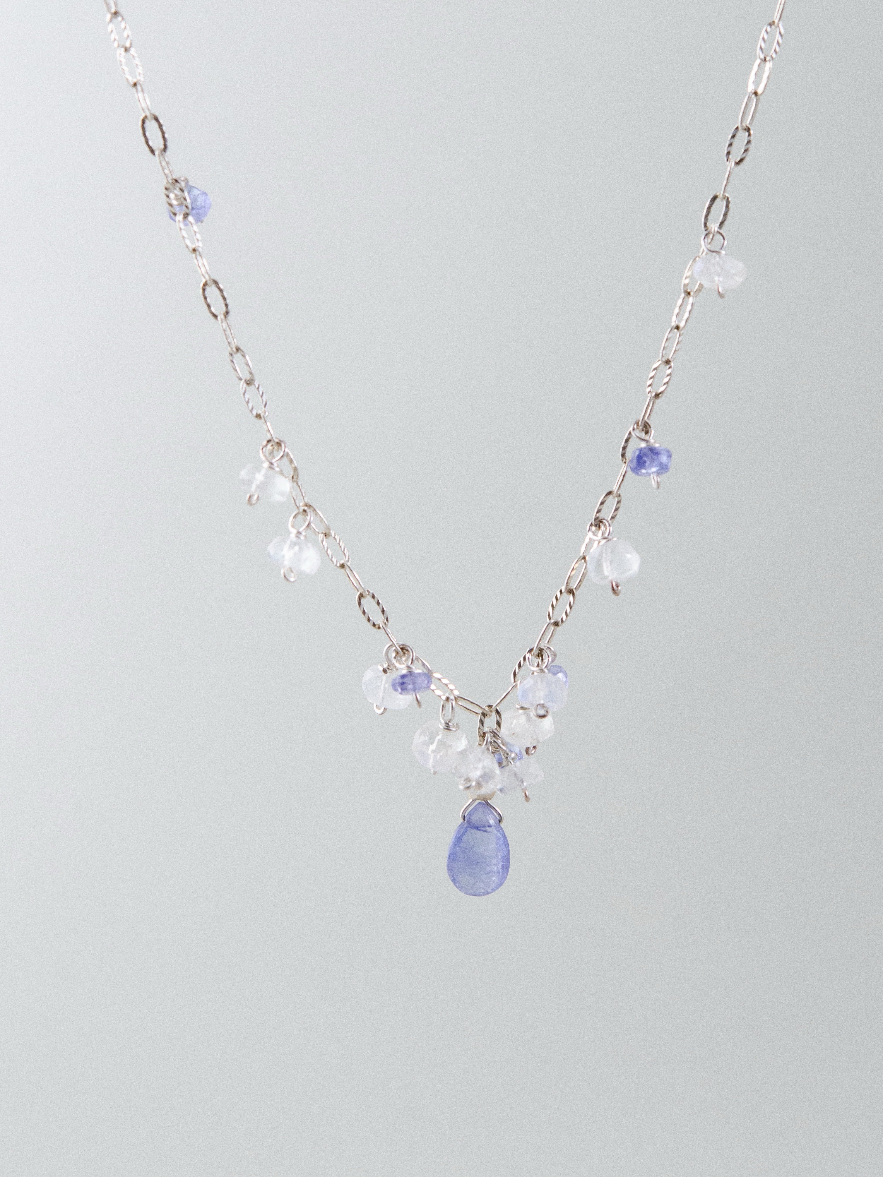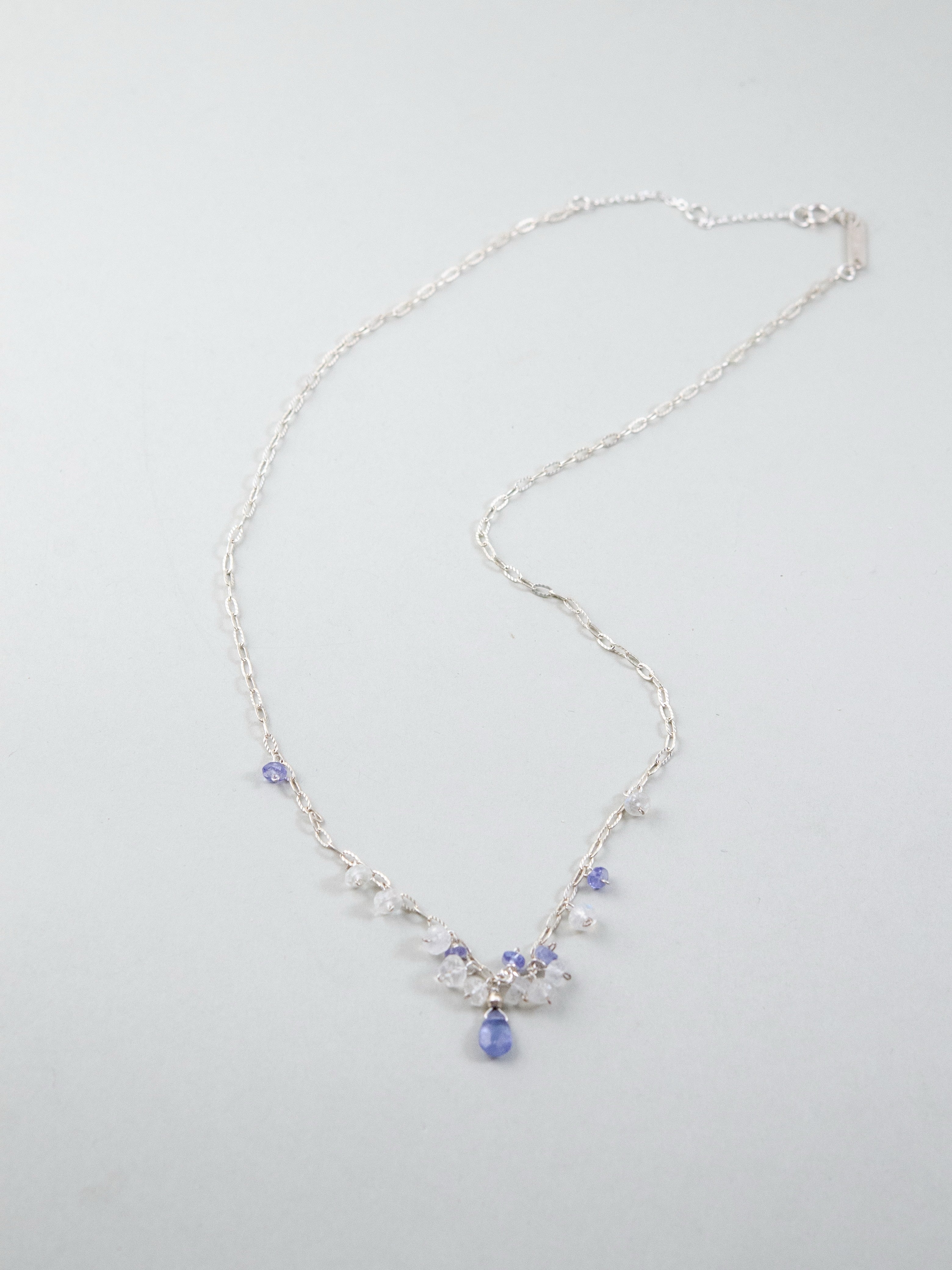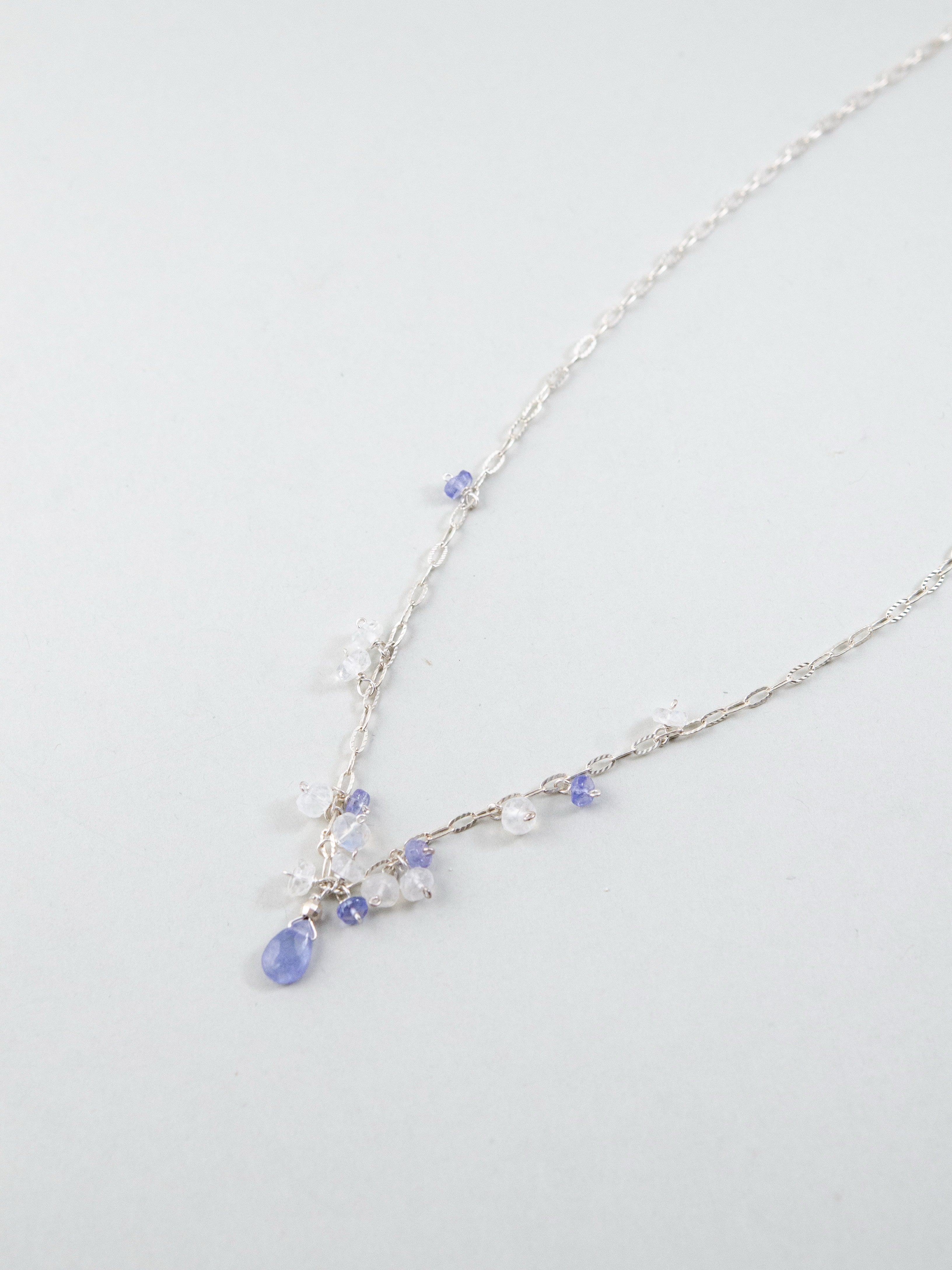 朝の光にきらめく露をイメージした、ムーンストーンとタンザナイトの繊細なネックレス。透明感のあるチェーンに、揺れるドロップ型の天然石をあしらい、さりげない存在感を放ちます。中央に配したタンザナイトの深いブルーが、静けさの中に芯の強さを感じさせ、やさしく凛とした印象を演出。