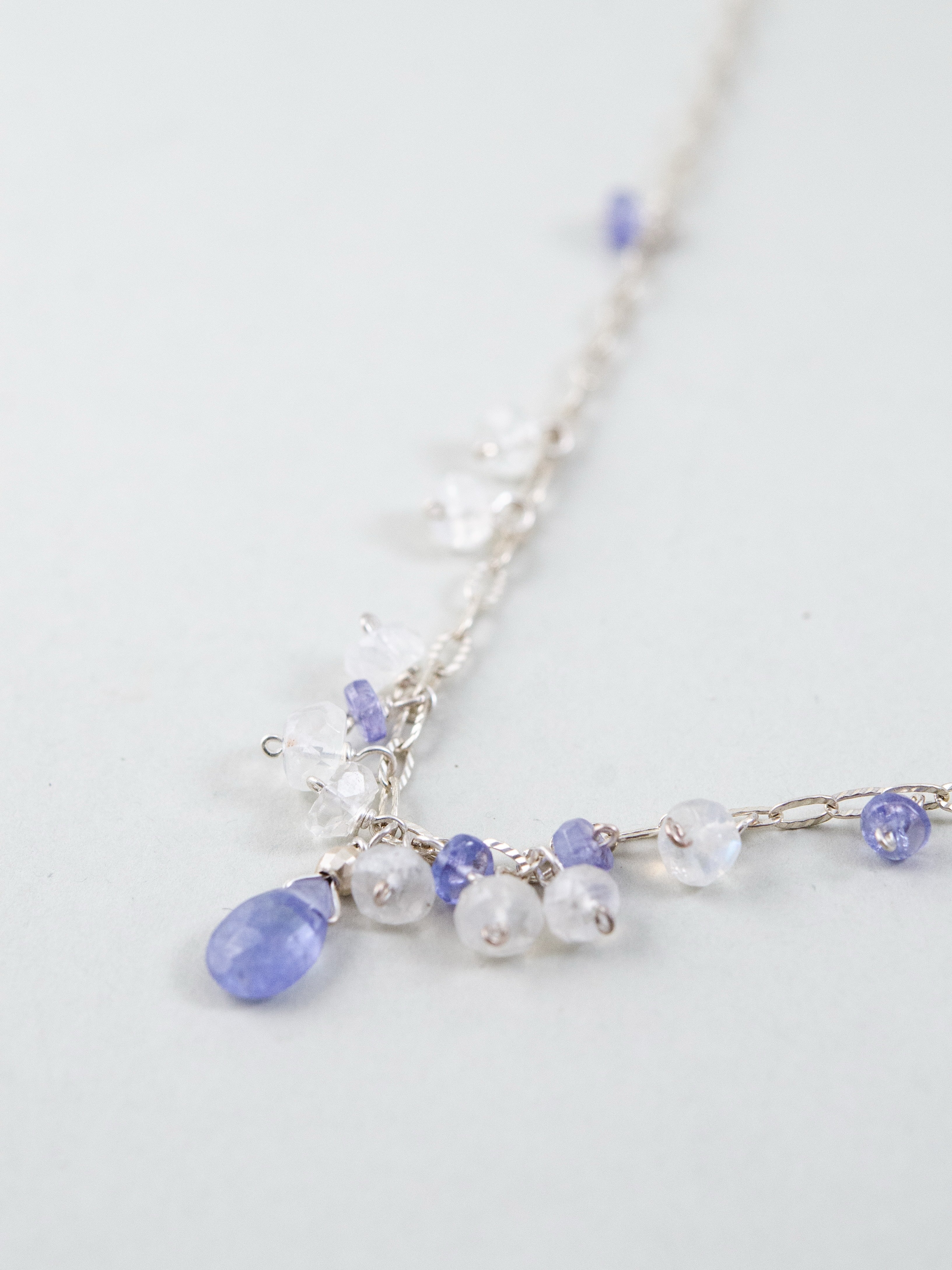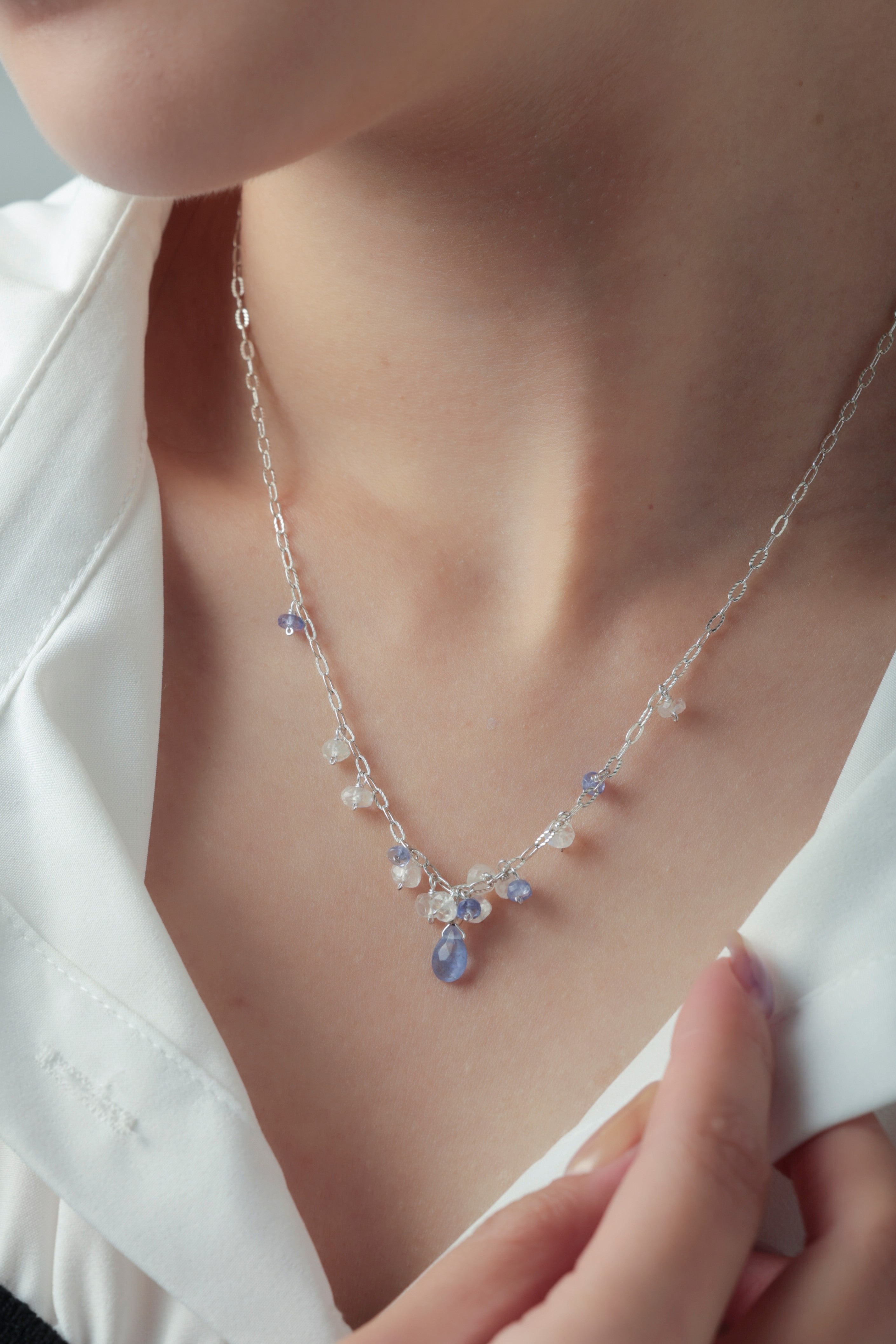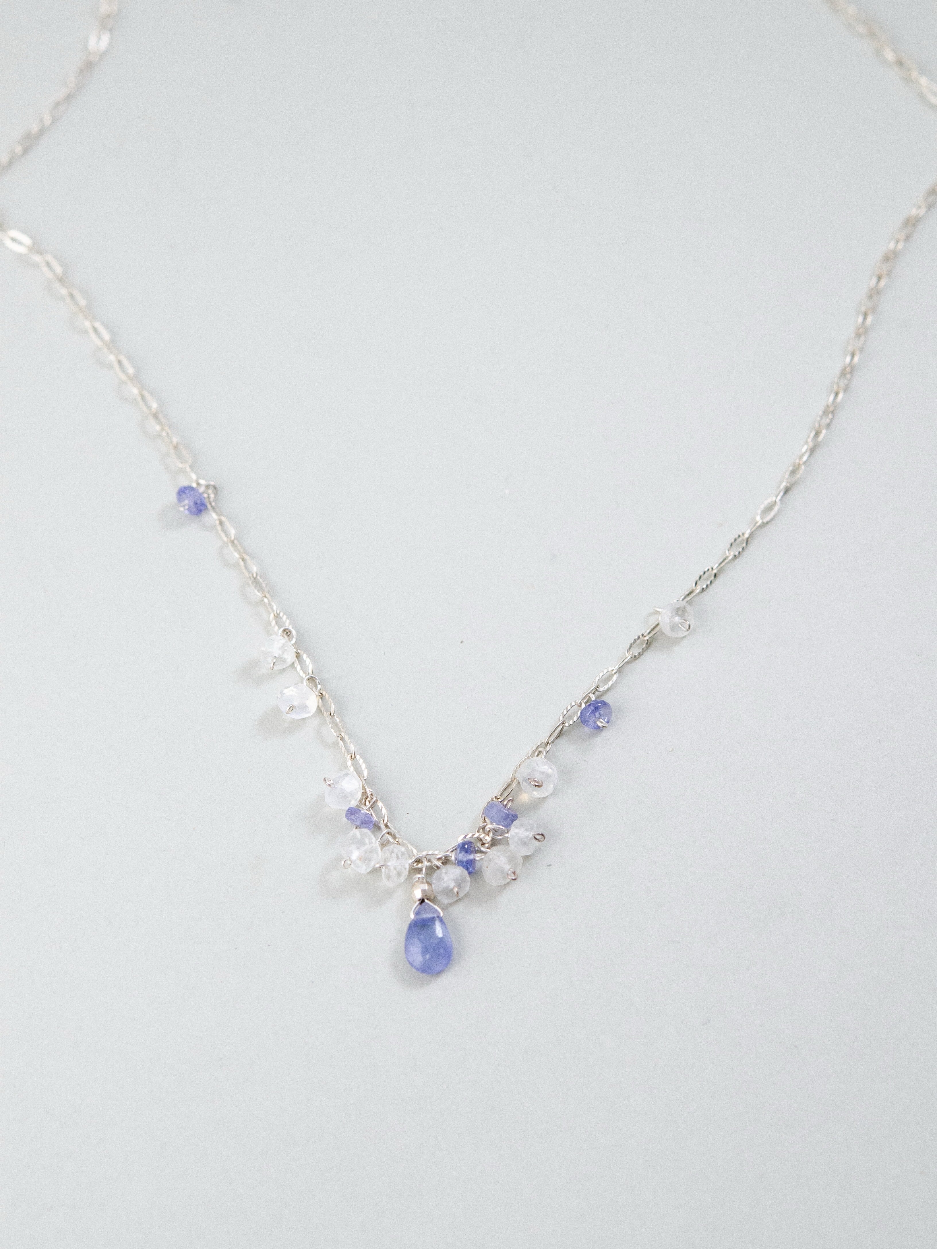 朝の光にきらめく露をイメージした、ムーンストーンとタンザナイトの繊細なネックレス。透明感のあるチェーンに、揺れるドロップ型の天然石をあしらい、さりげない存在感を放ちます。中央に配したタンザナイトの深いブルーが、静けさの中に芯の強さを感じさせ、やさしく凛とした印象を演出。