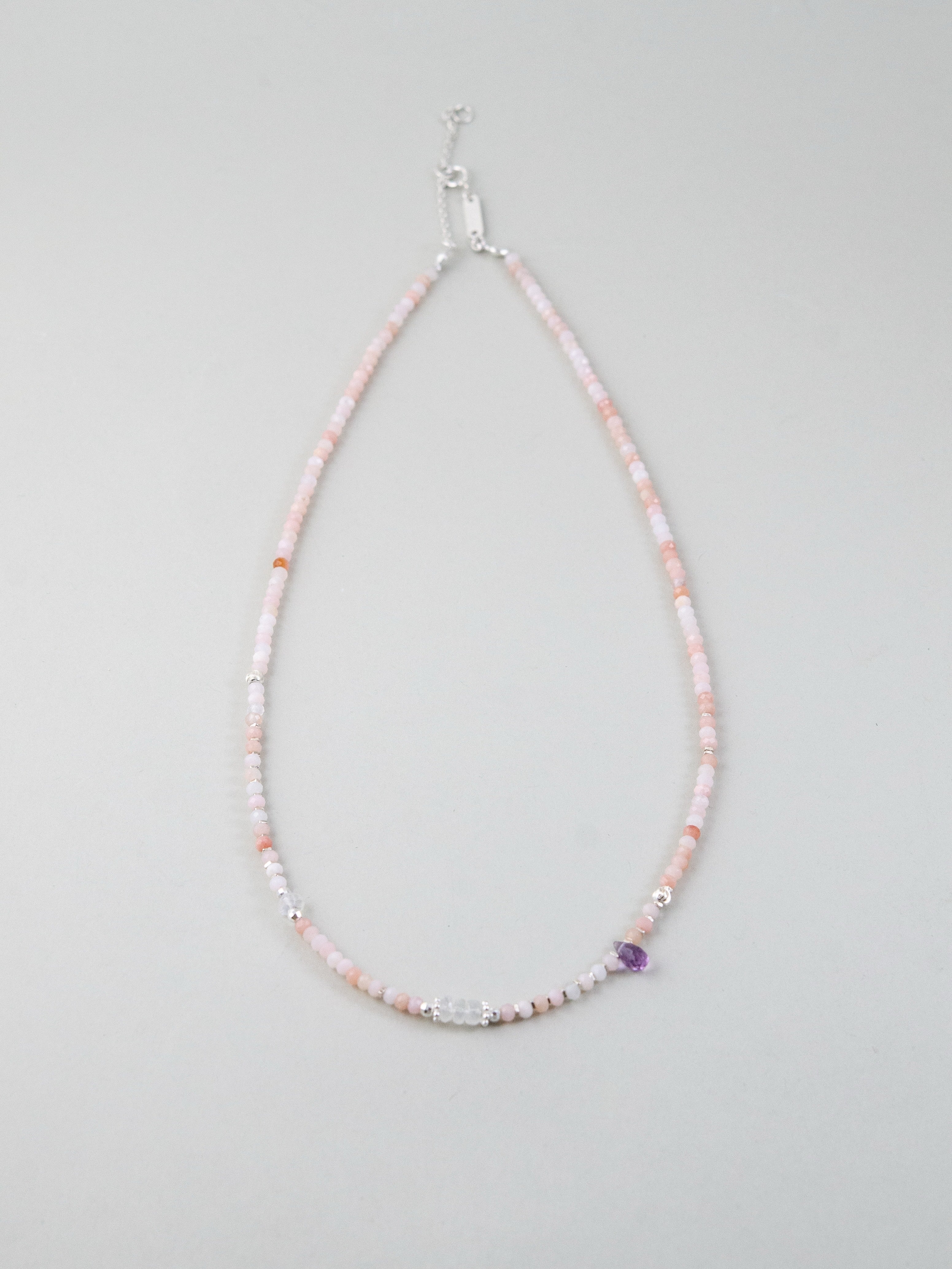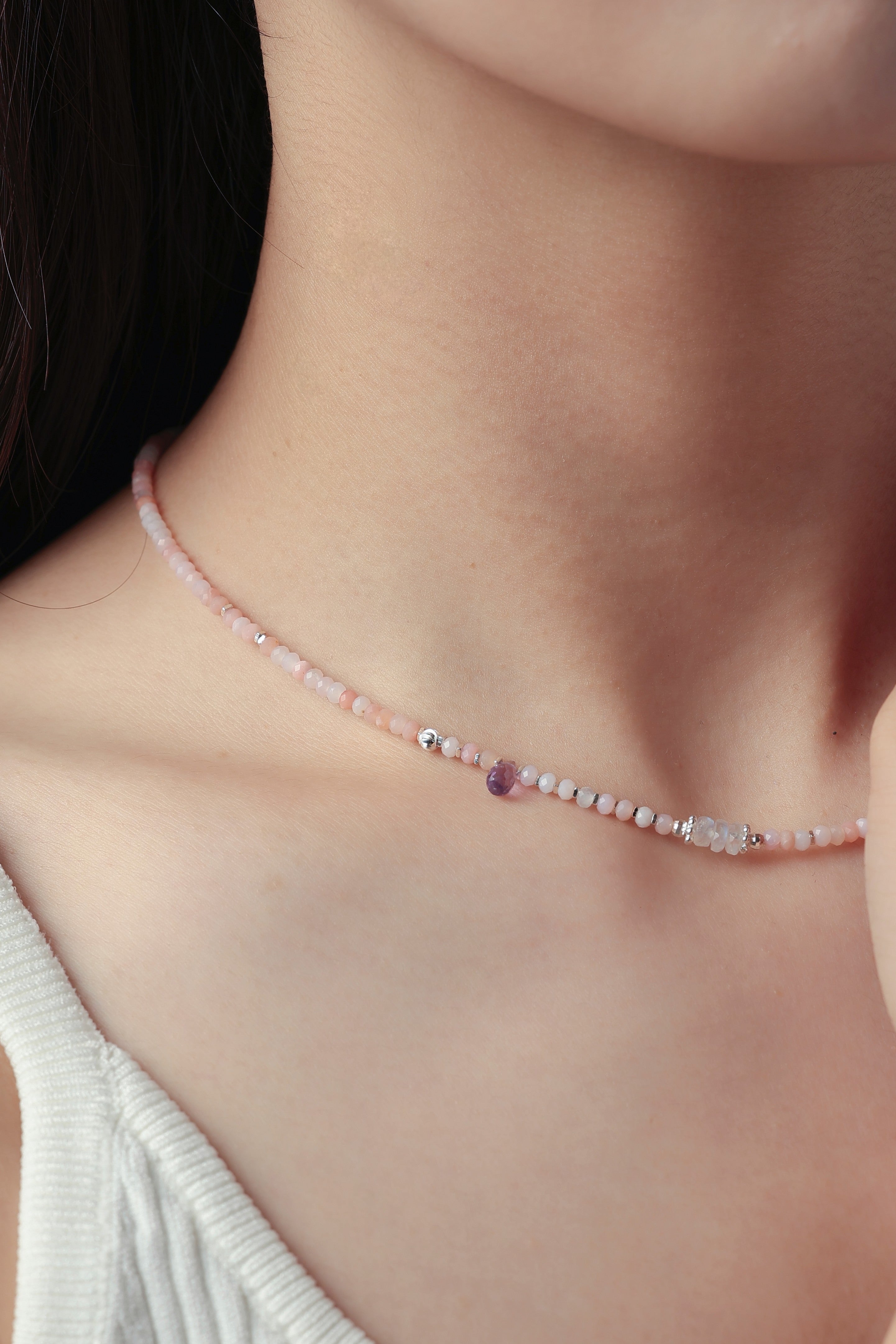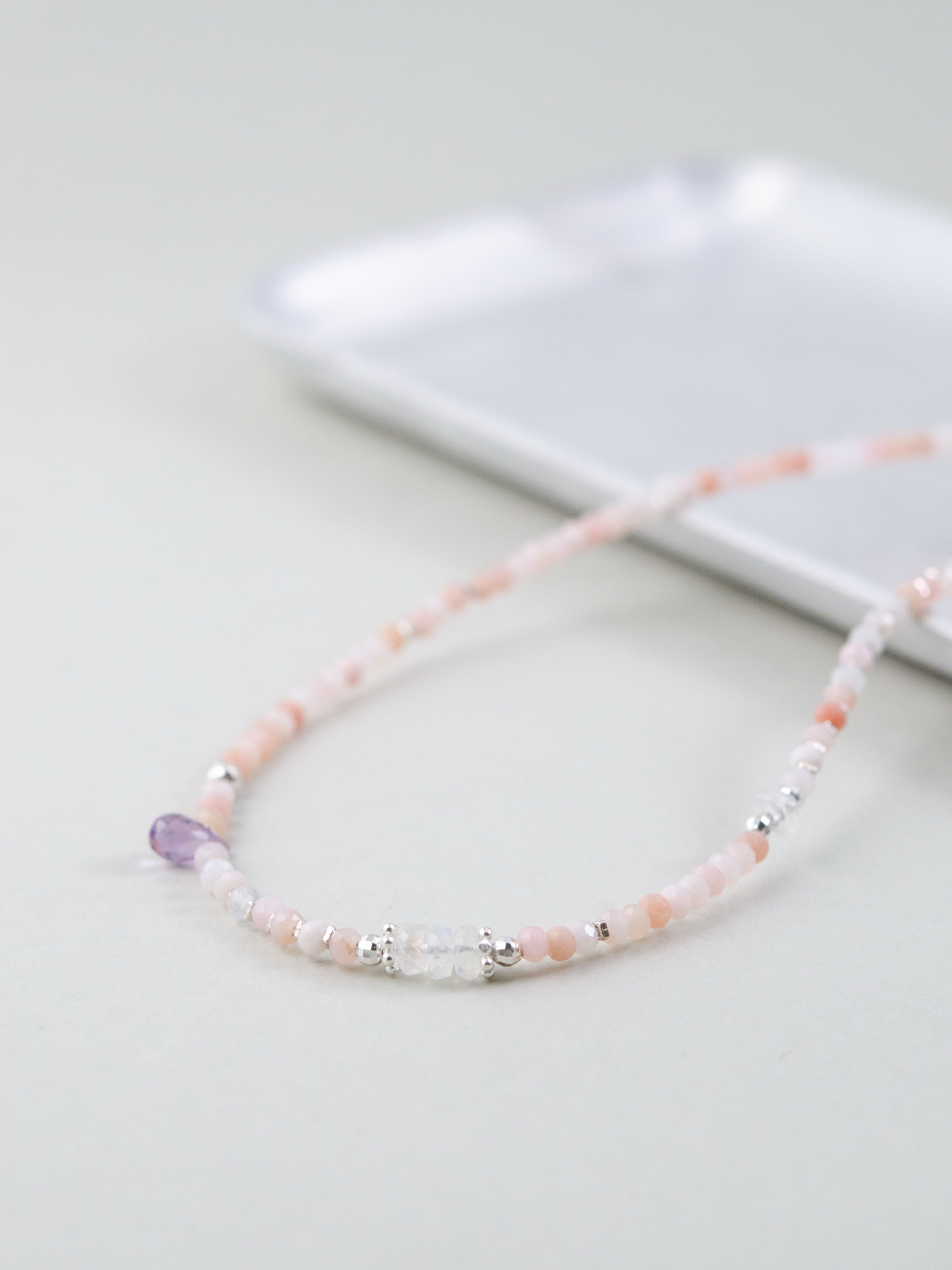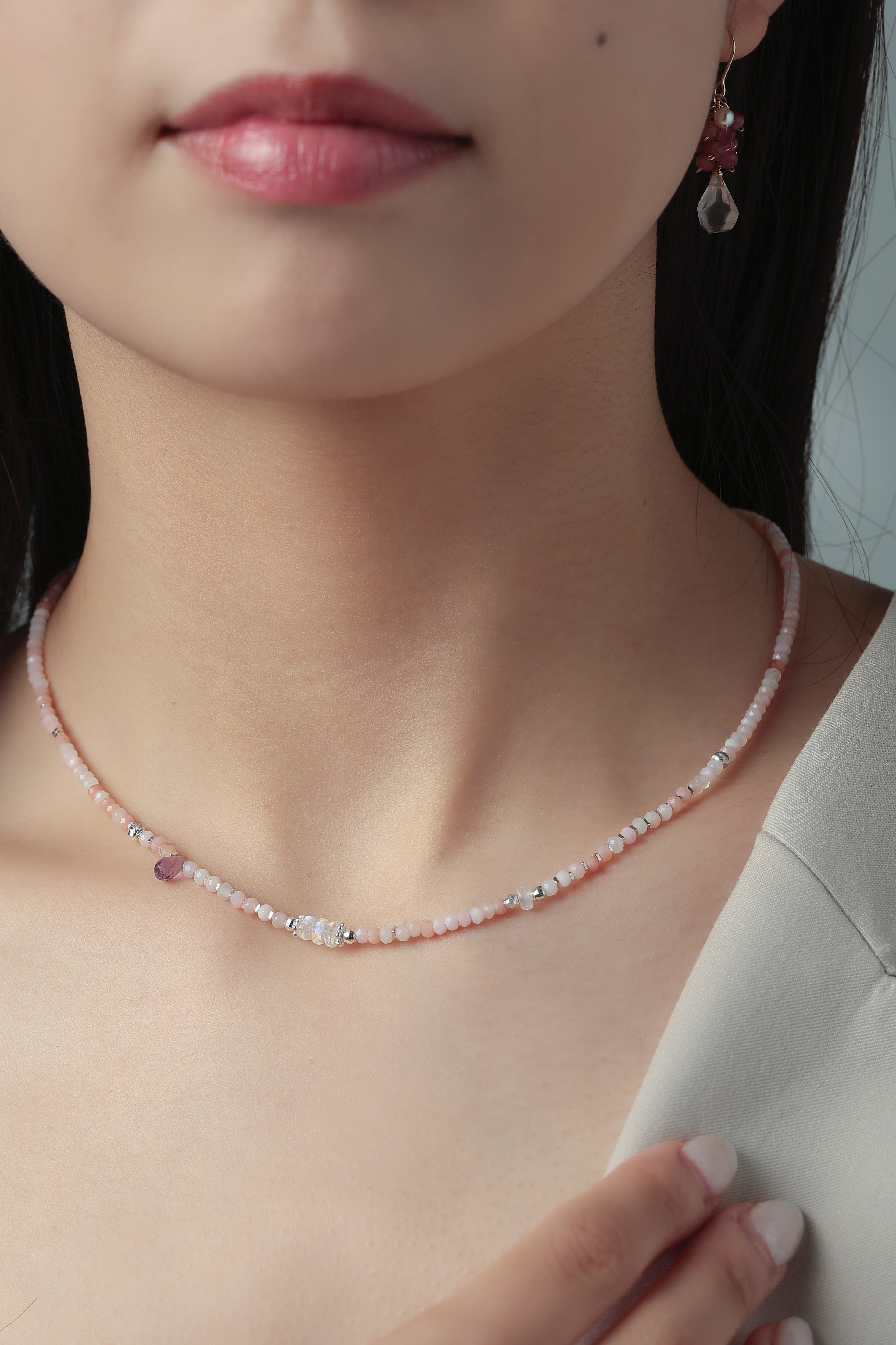 淡いピンクとホワイトのグラデーションに、虹色の輝きを放つオパールが優しく寄り添うネックレスです。コンセプトは「日常の静かなひととき」。さりげない中に繊細な表情を秘めたデザインで、装いに柔らかなアクセントを添え、身に着けることで日常に小さな癒しと喜びを運んでくれる一本です。