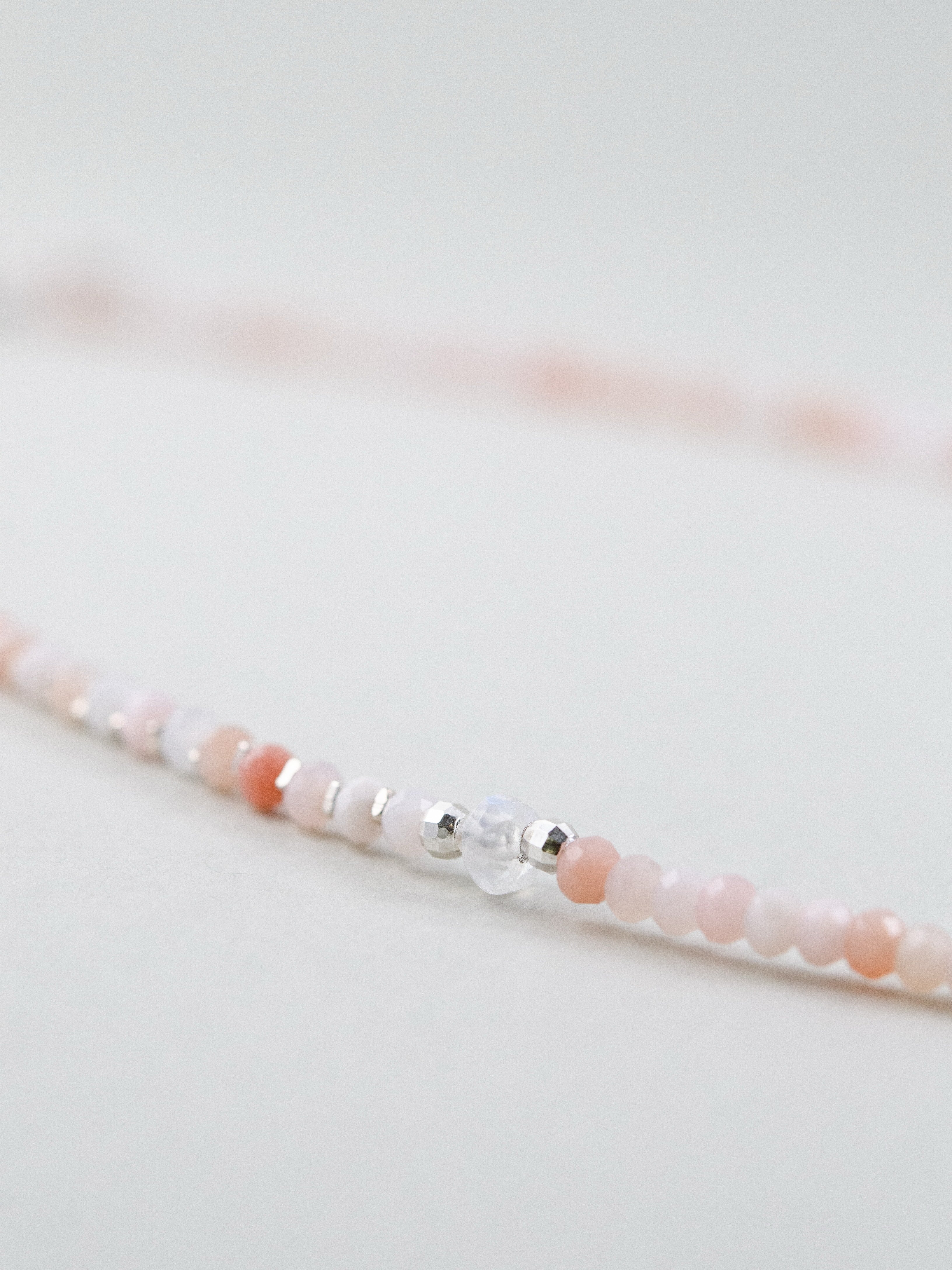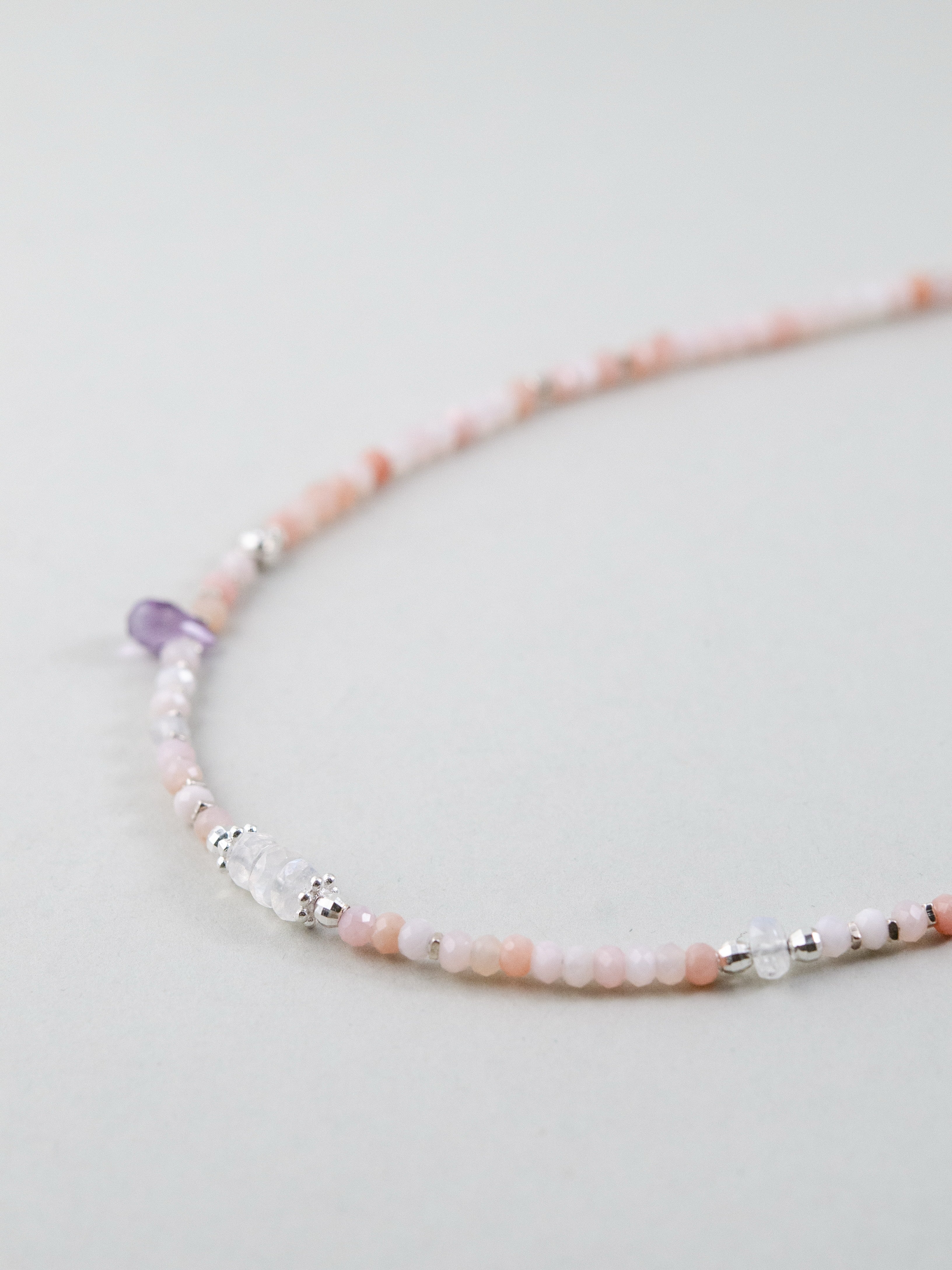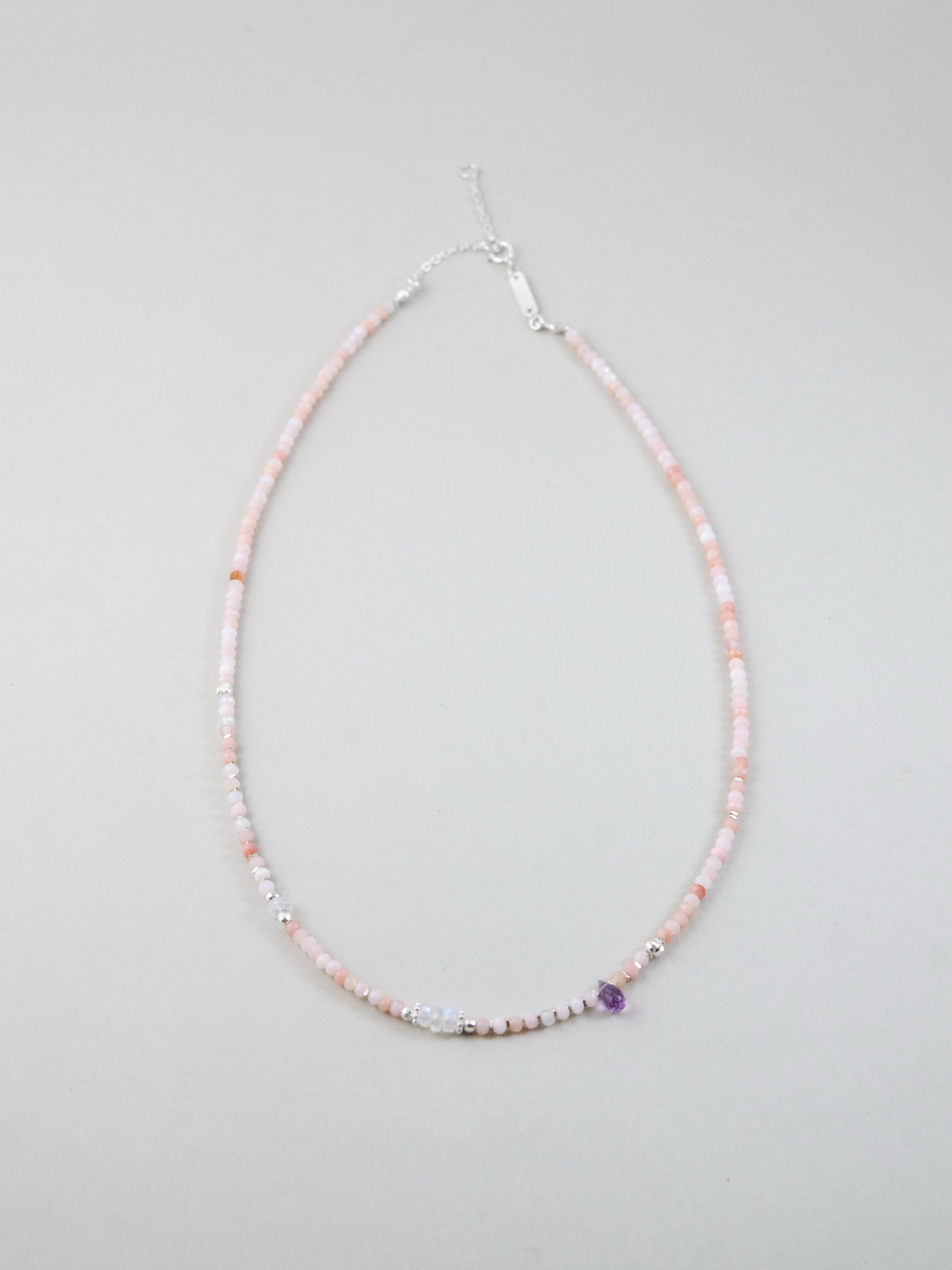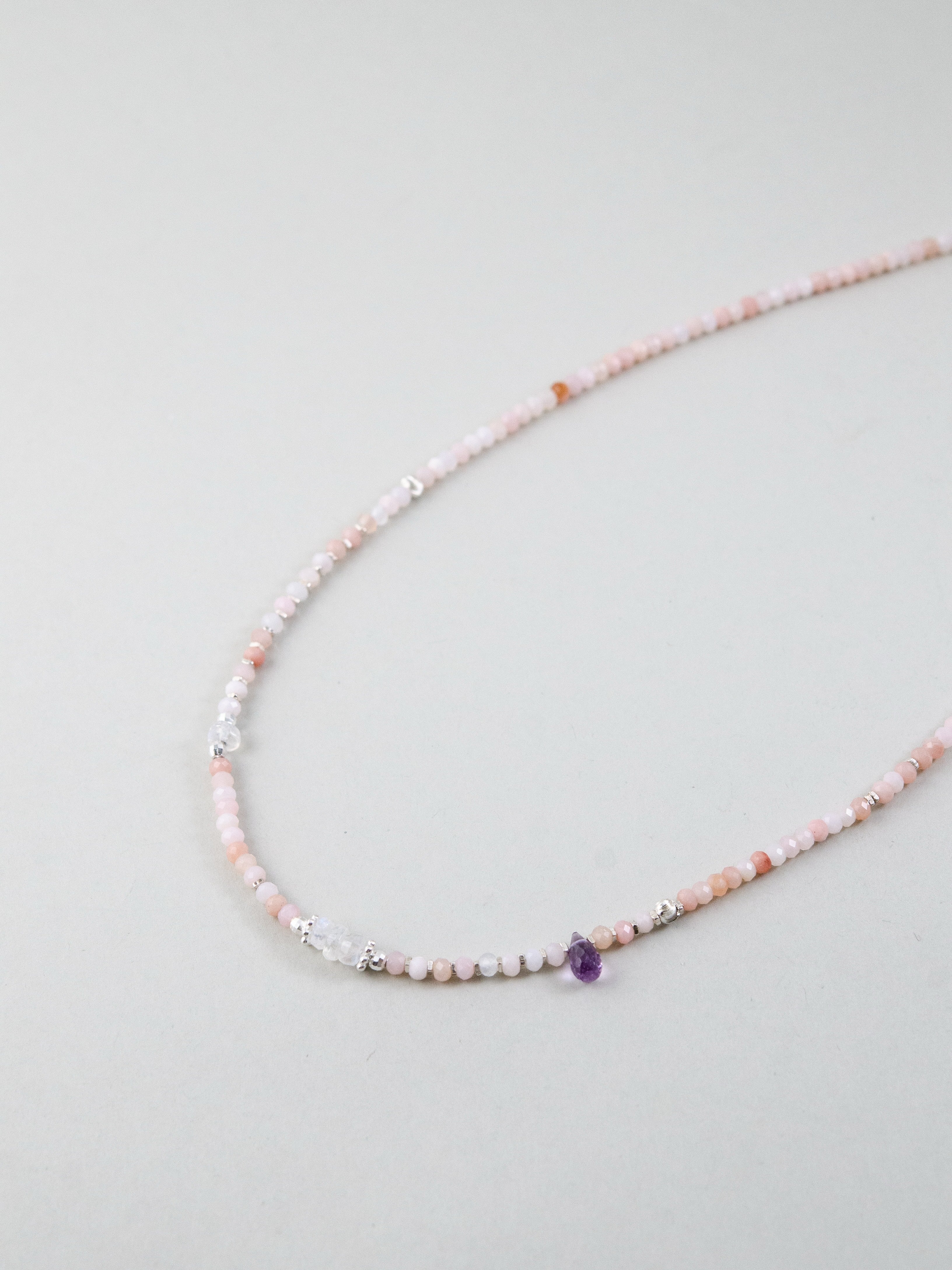 淡いピンクとホワイトのグラデーションに、虹色の輝きを放つオパールが優しく寄り添うネックレスです。コンセプトは「日常の静かなひととき」。さりげない中に繊細な表情を秘めたデザインで、装いに柔らかなアクセントを添え、身に着けることで日常に小さな癒しと喜びを運んでくれる一本です。