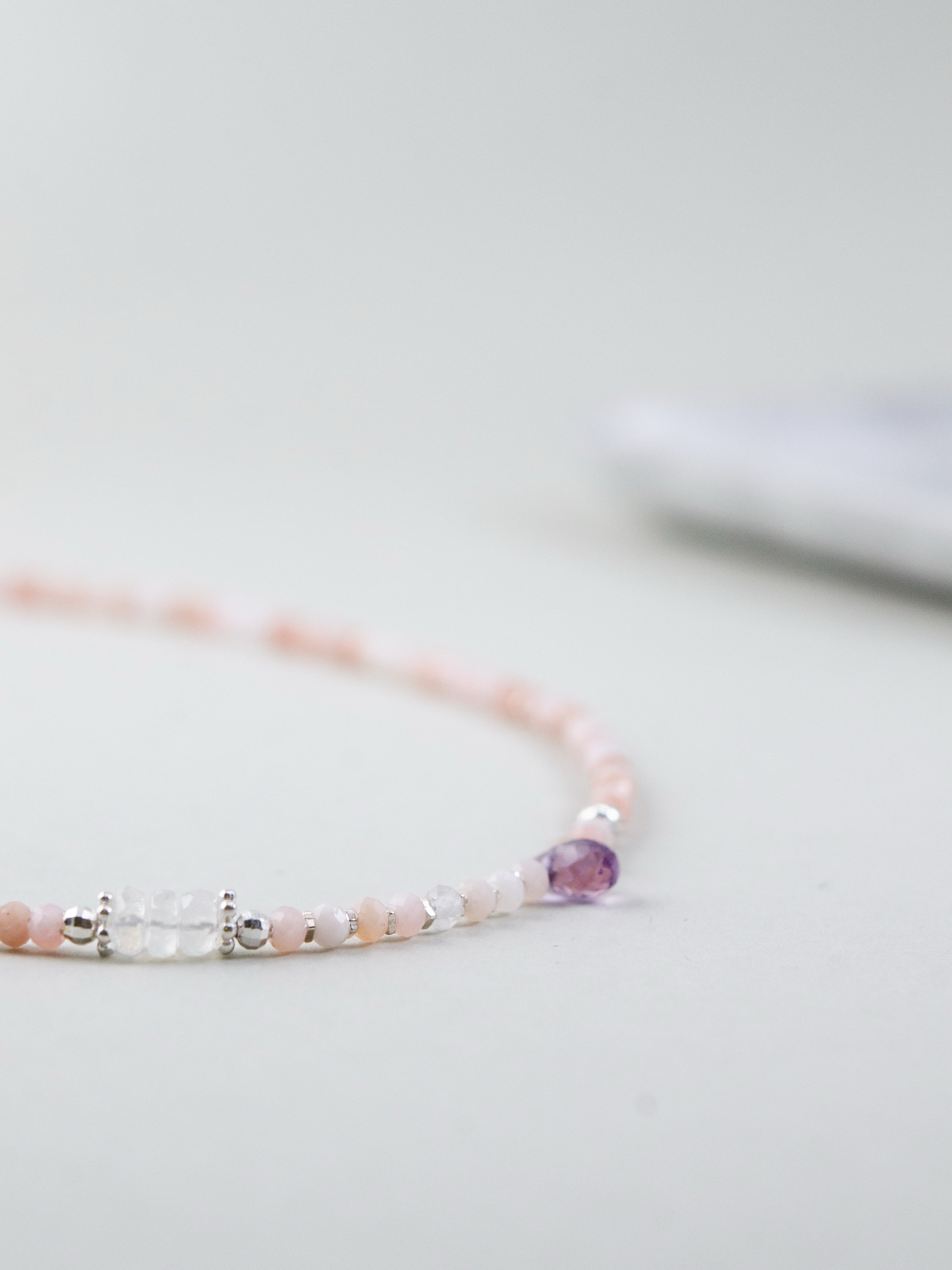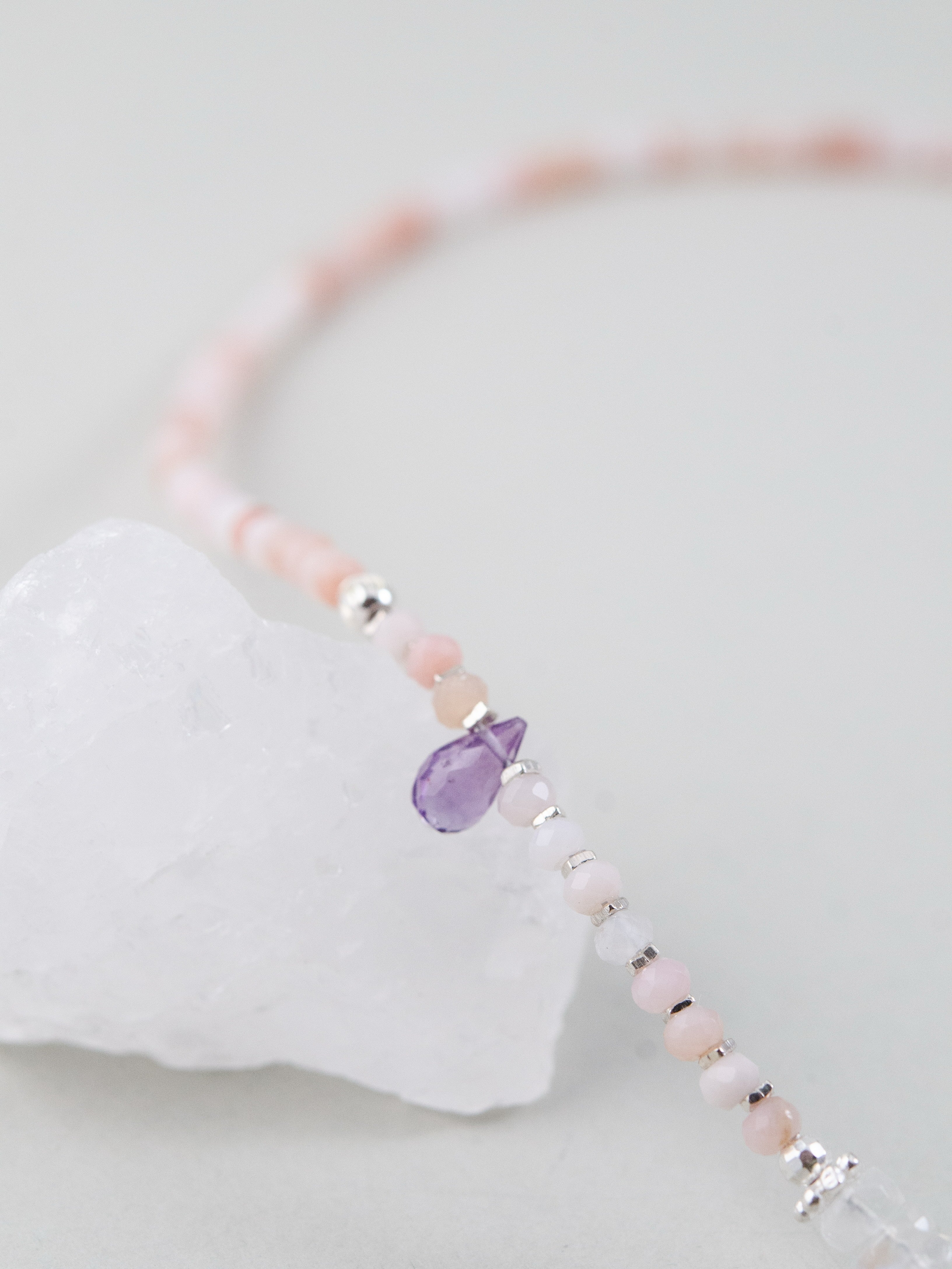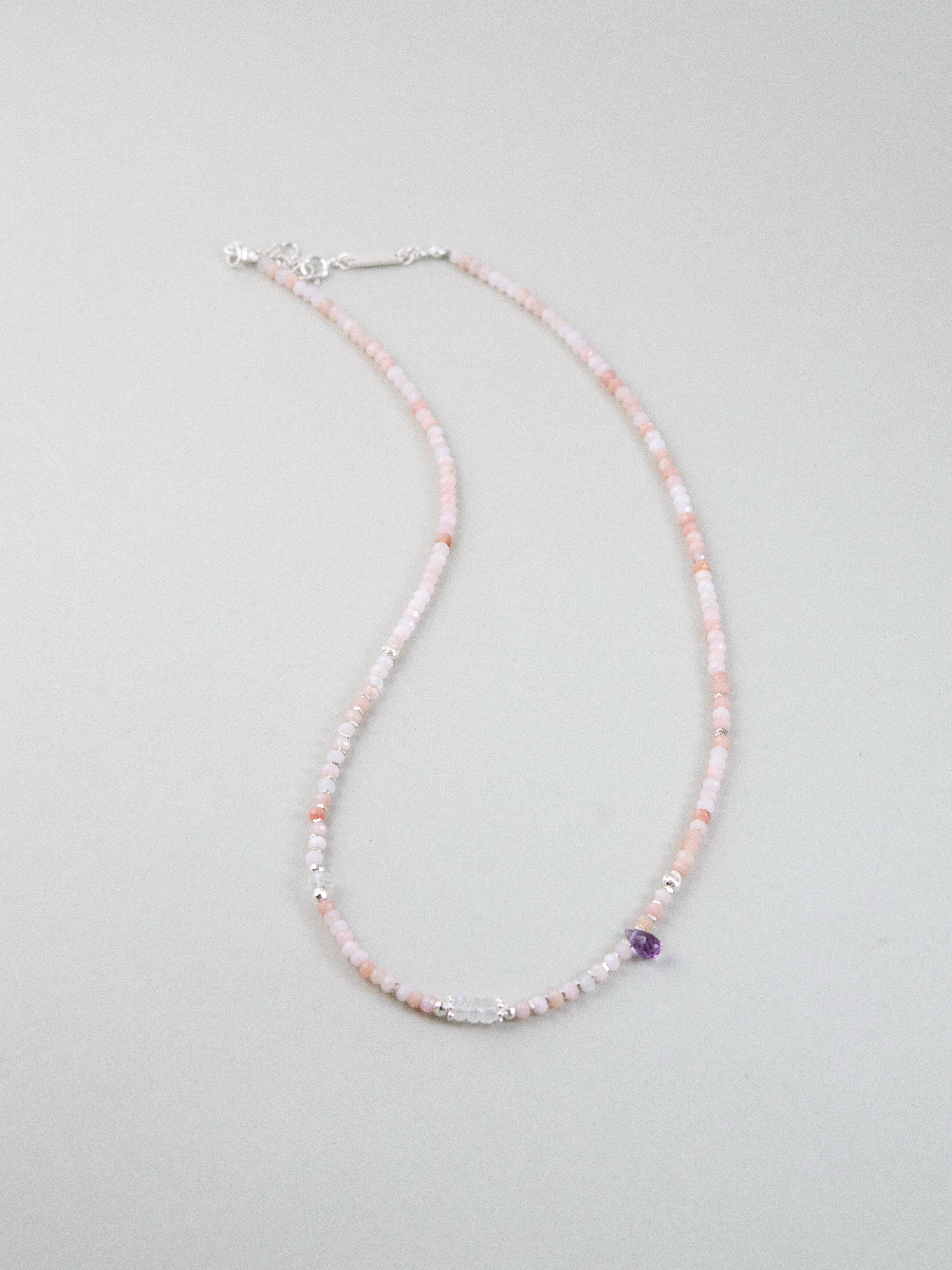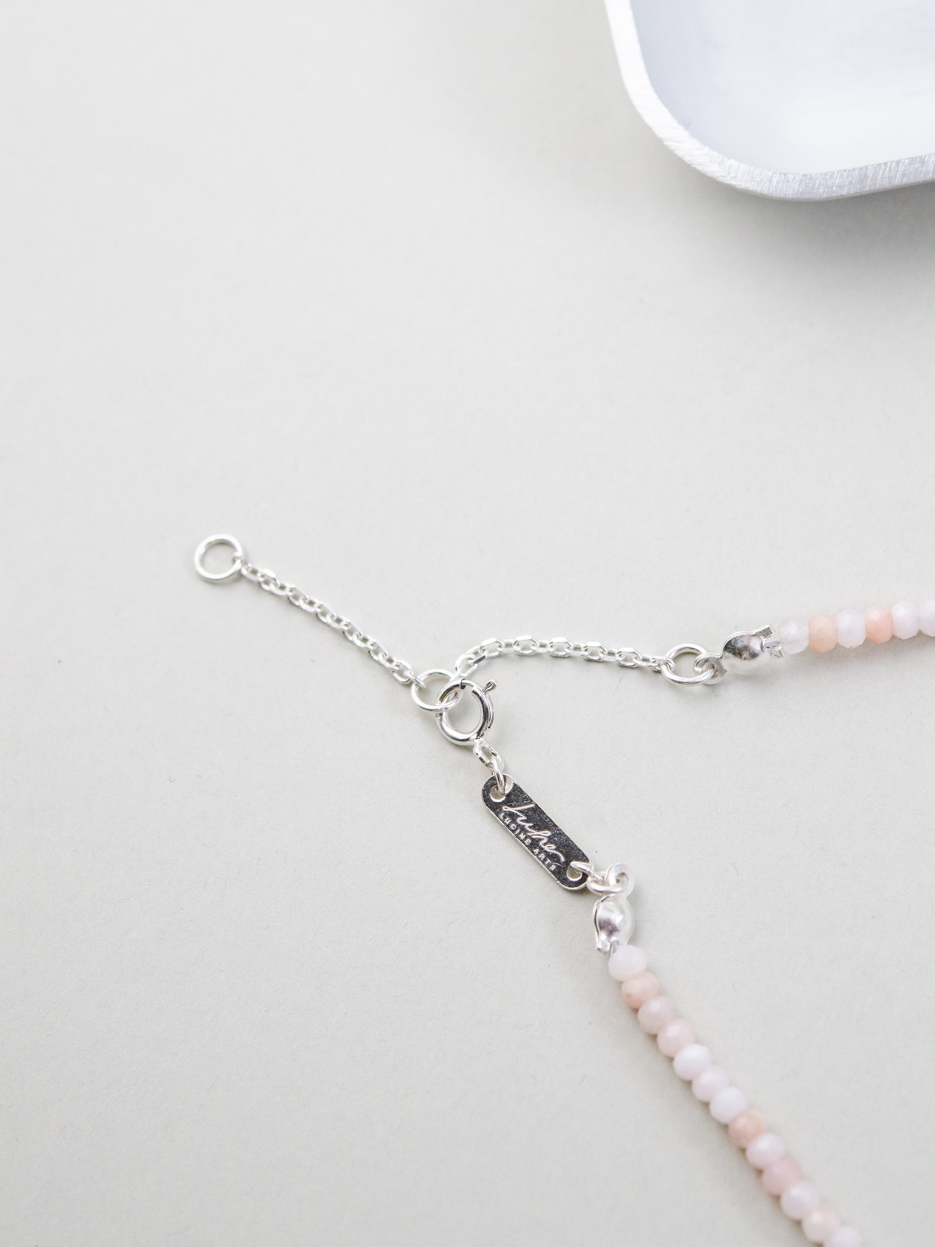 淡いピンクとホワイトのグラデーションに、虹色の輝きを放つオパールが優しく寄り添うネックレスです。コンセプトは「日常の静かなひととき」。さりげない中に繊細な表情を秘めたデザインで、装いに柔らかなアクセントを添え、身に着けることで日常に小さな癒しと喜びを運んでくれる一本です。