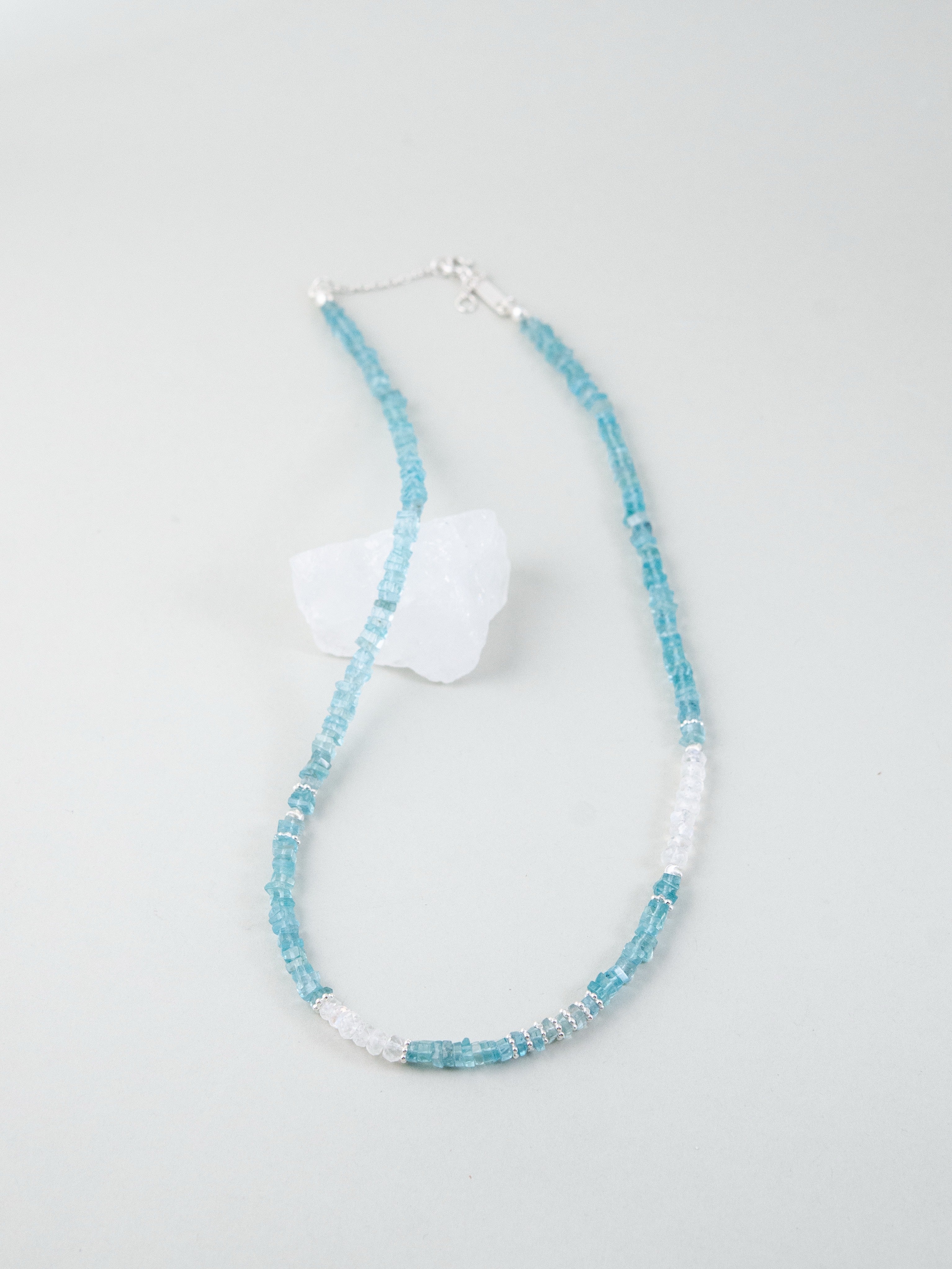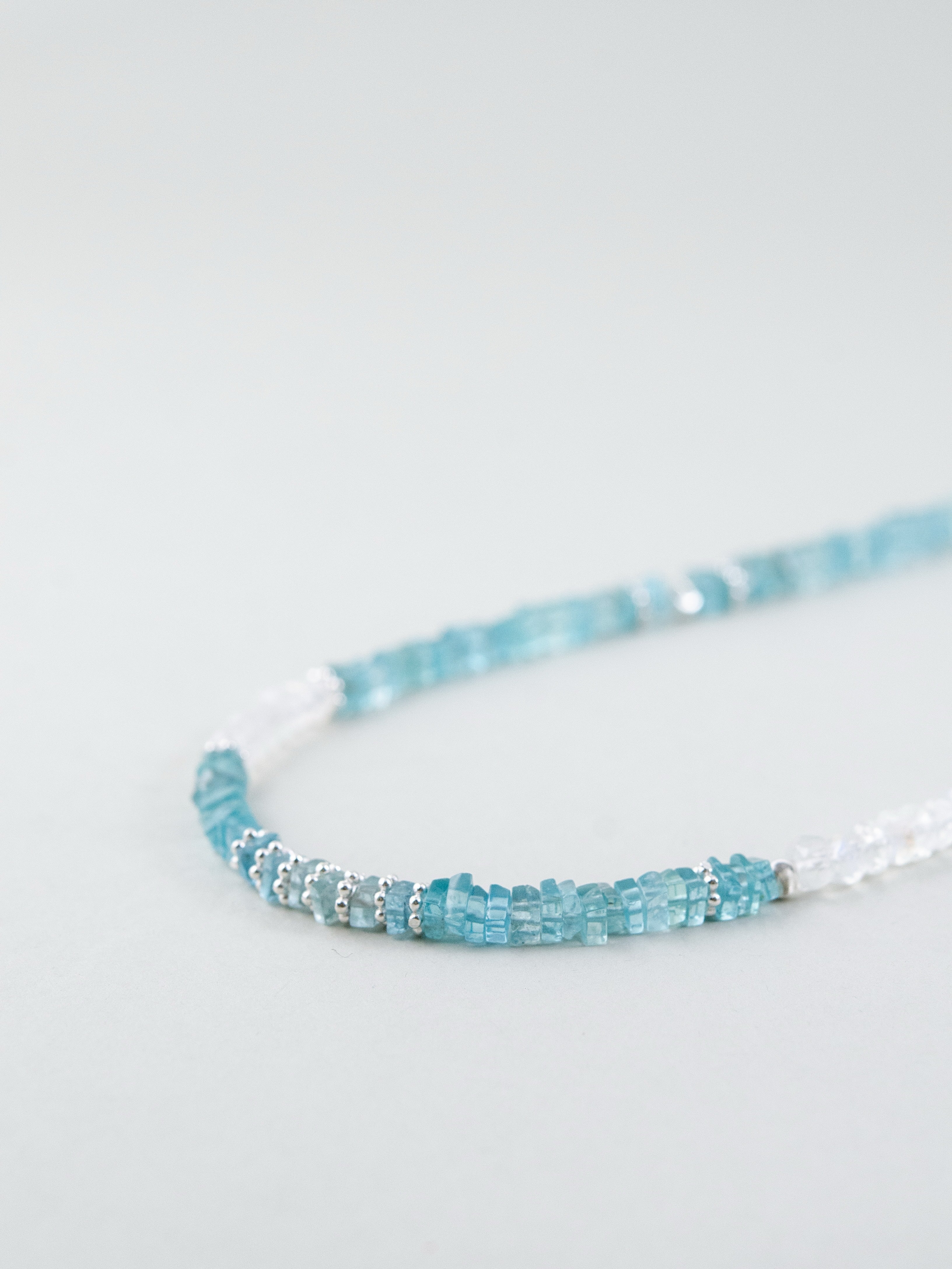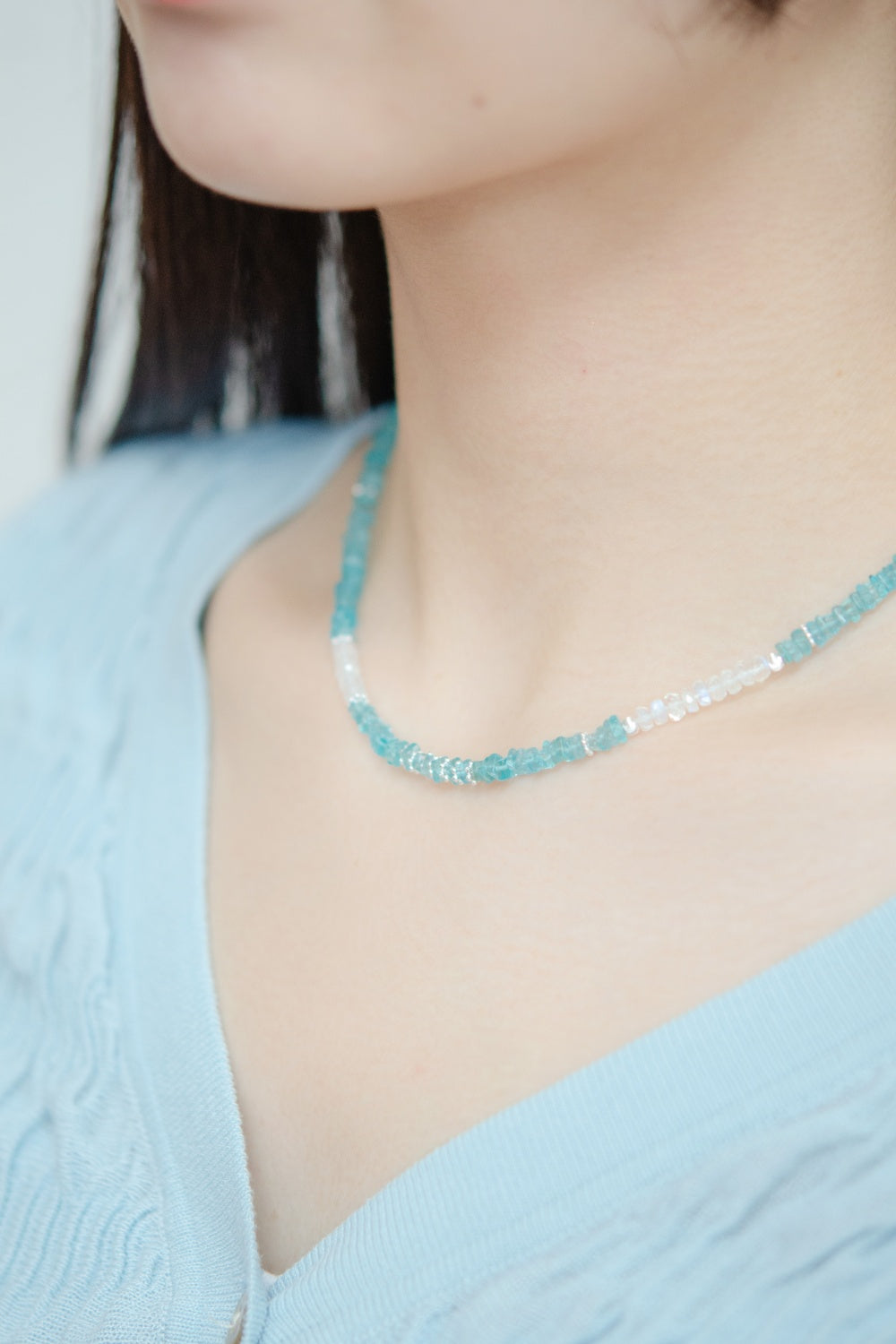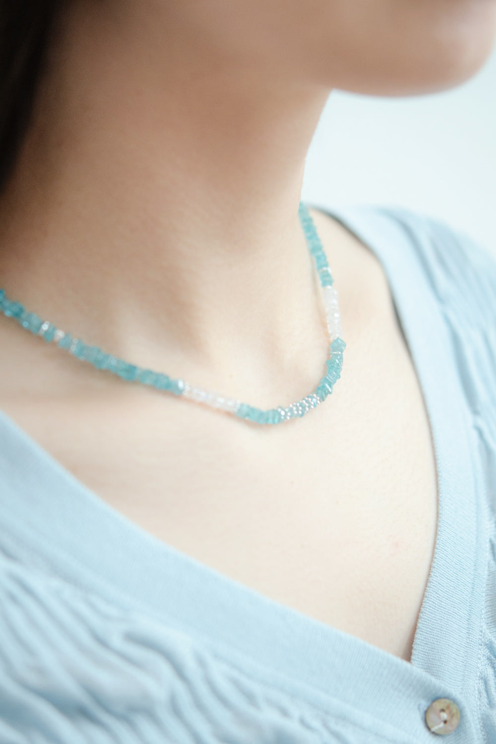 透き通るようなアパタイトのブルーと、やわらかなホワイトのムーンストーンを組み合わせた清楚なネックレスです。朝の海辺に射す光のような透明感と静けさを胸元にまとい、軽やかで爽やかな印象を与えます。爽やかな色合いがどんなコーディネートにも馴染み、日常から特別な日まで幅広く活躍する万能ジュエリーです。