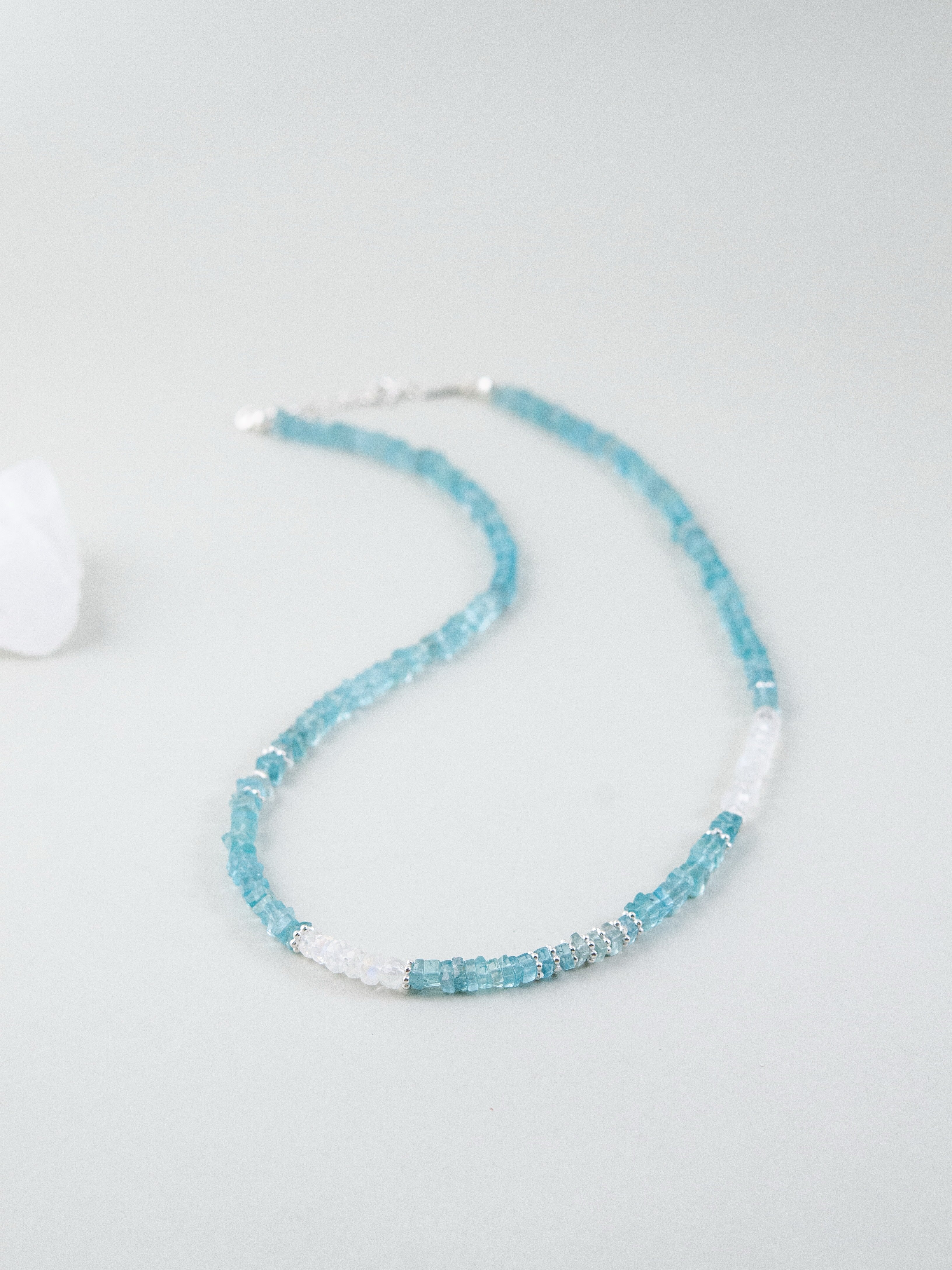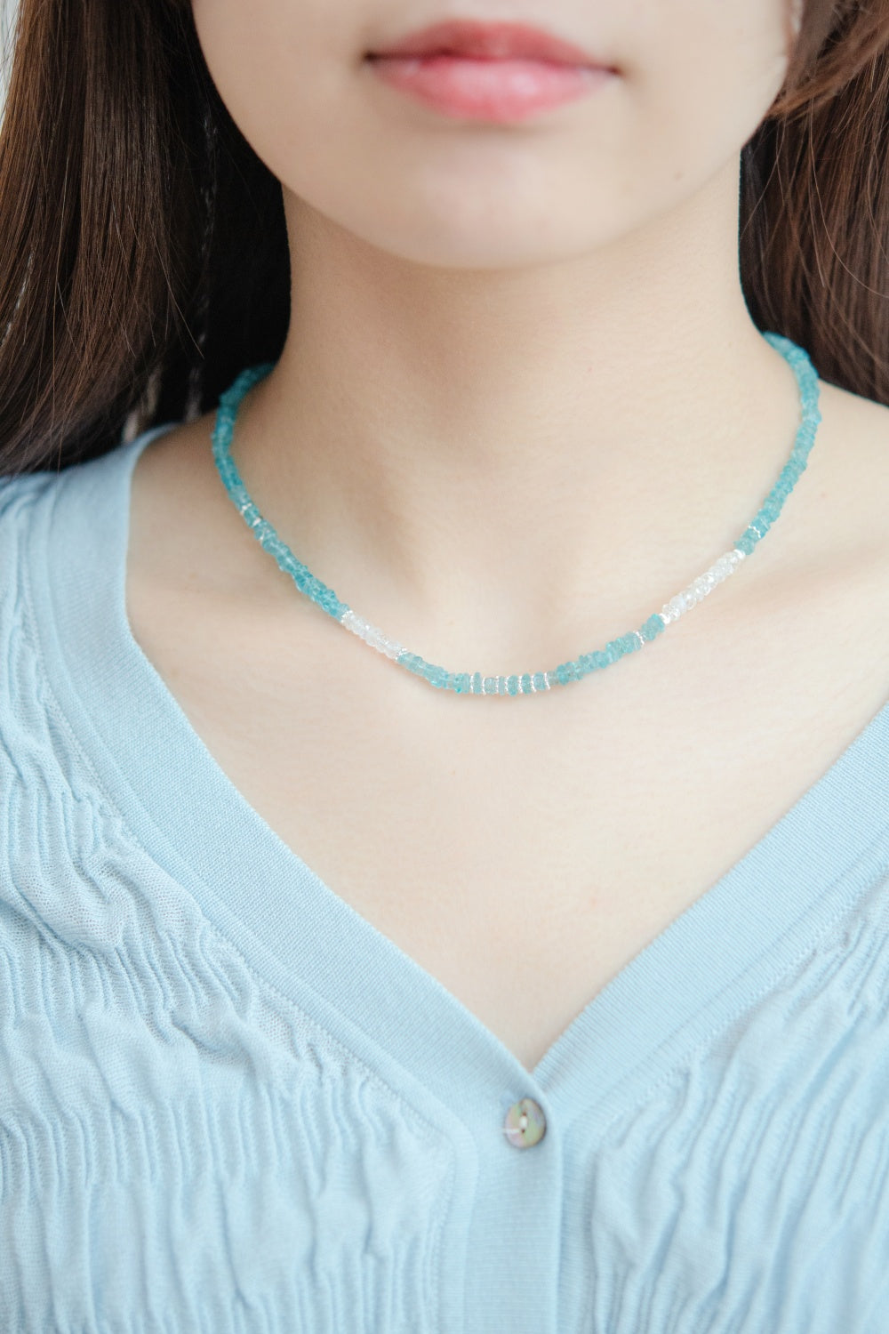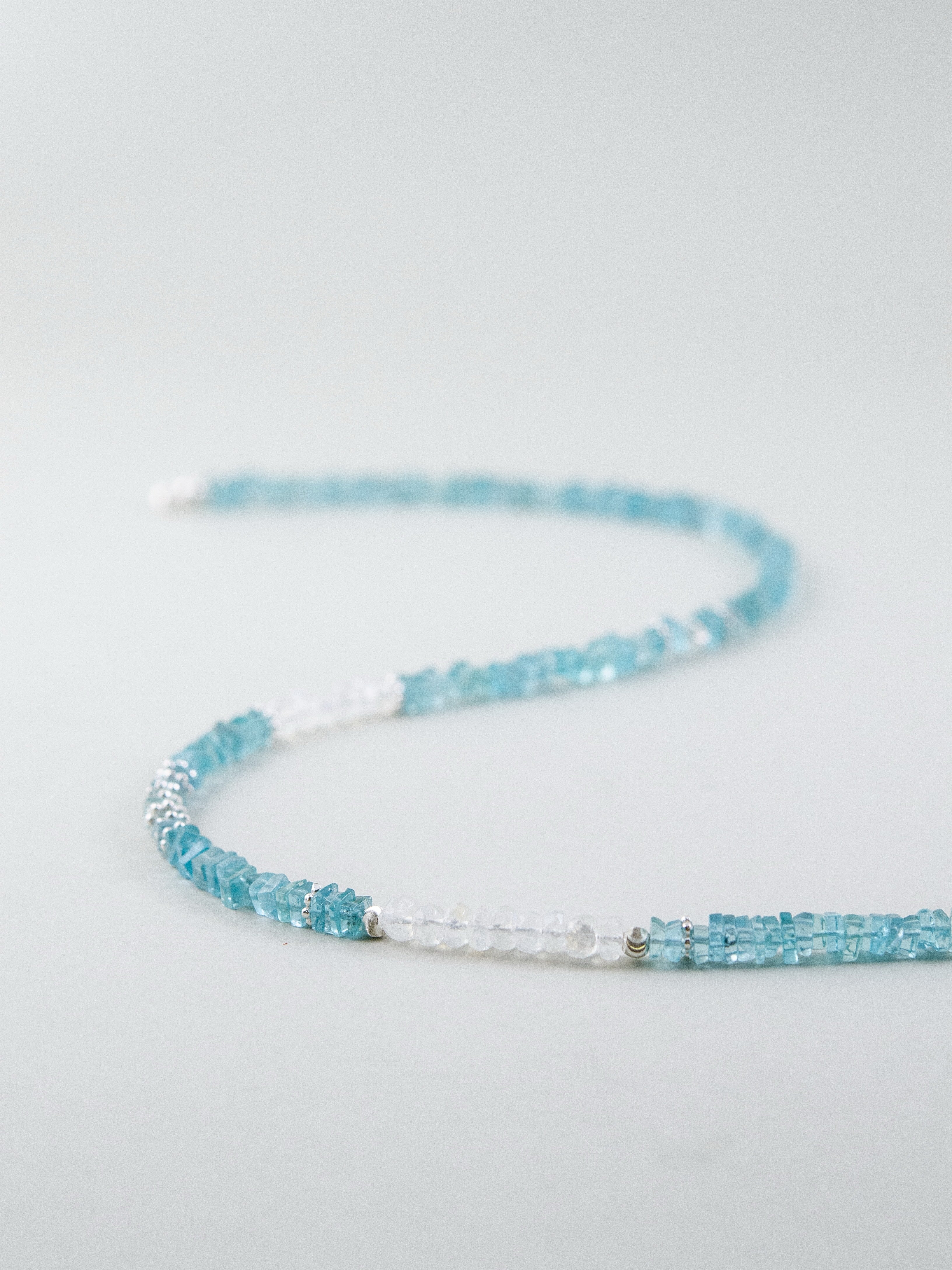 透き通るようなアパタイトのブルーと、やわらかなホワイトのムーンストーンを組み合わせた清楚なネックレスです。朝の海辺に射す光のような透明感と静けさを胸元にまとい、軽やかで爽やかな印象を与えます。爽やかな色合いがどんなコーディネートにも馴染み、日常から特別な日まで幅広く活躍する万能ジュエリーです。
