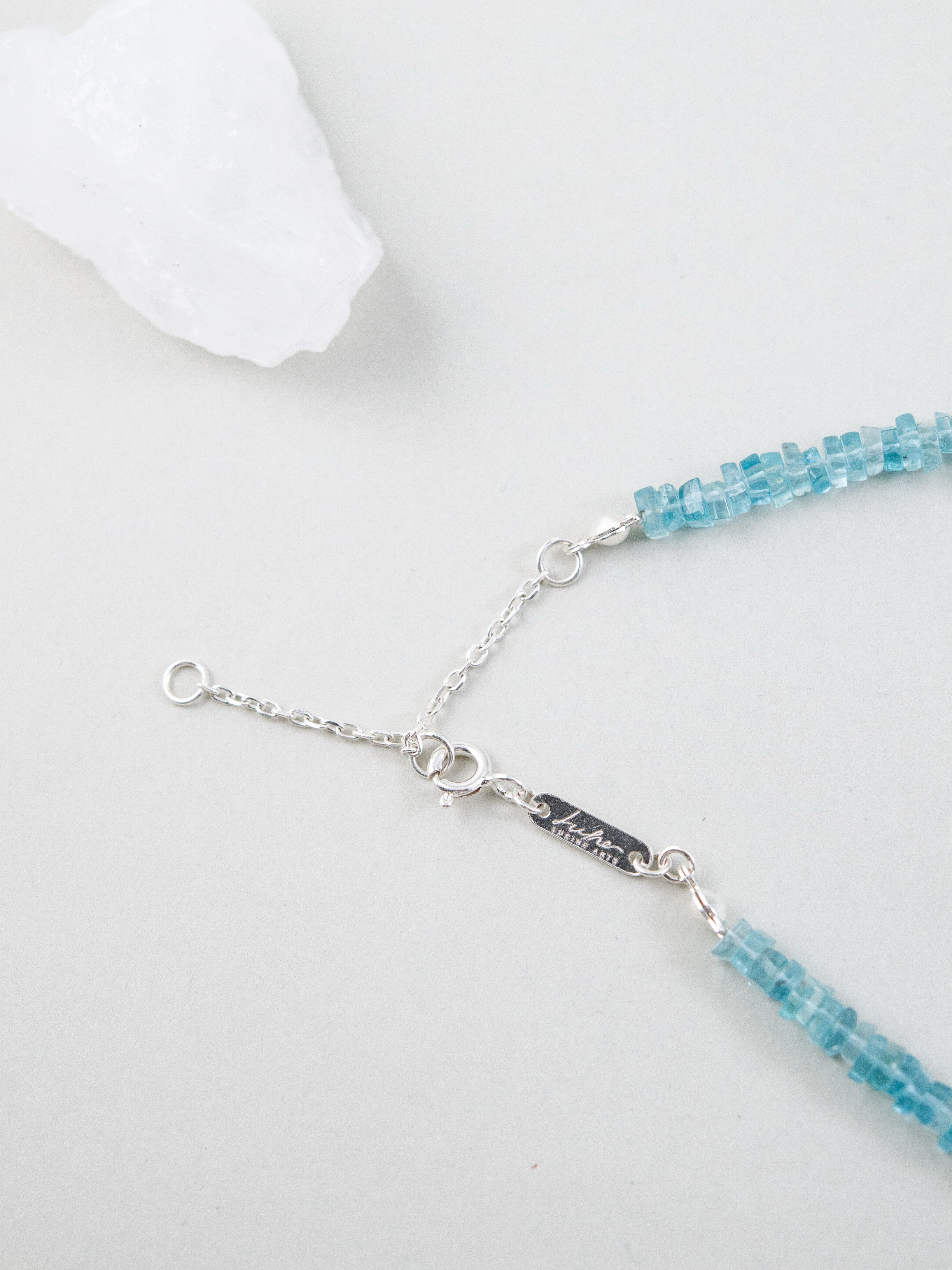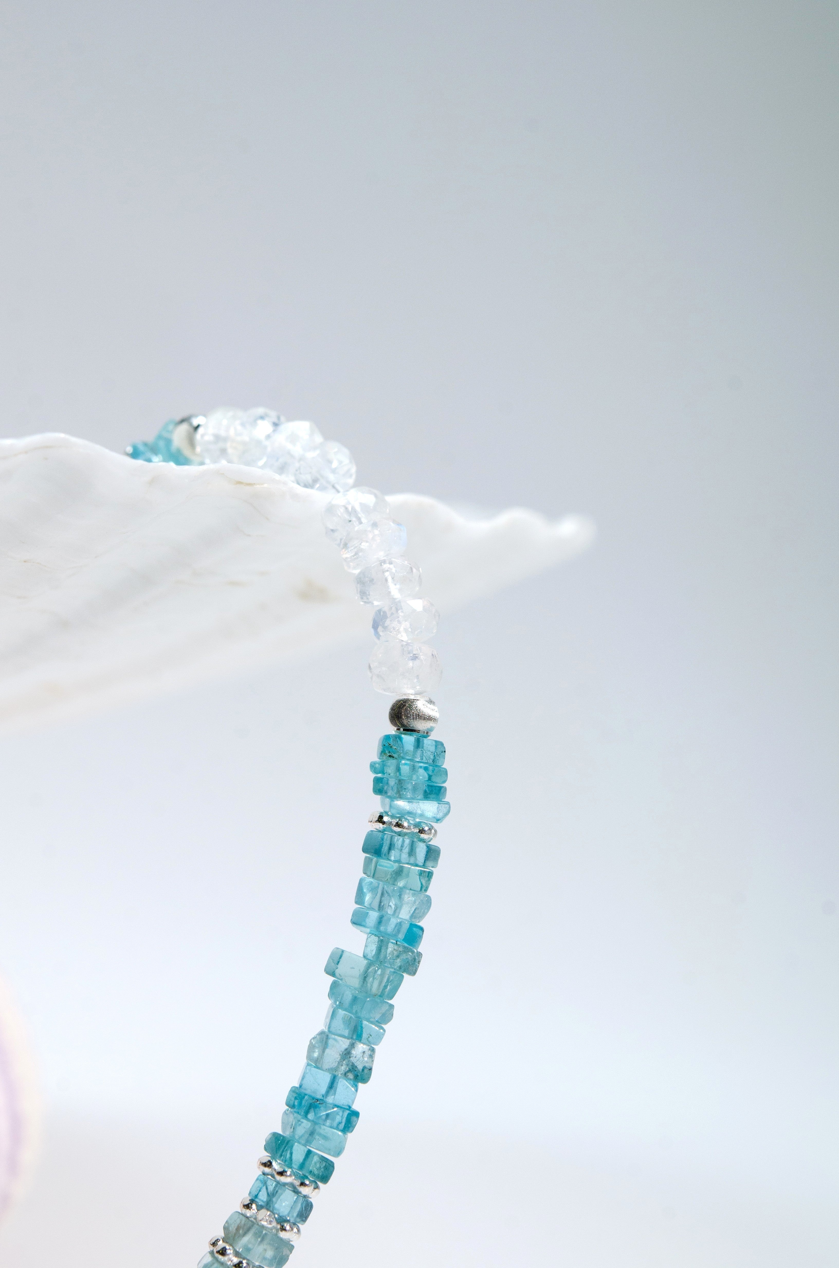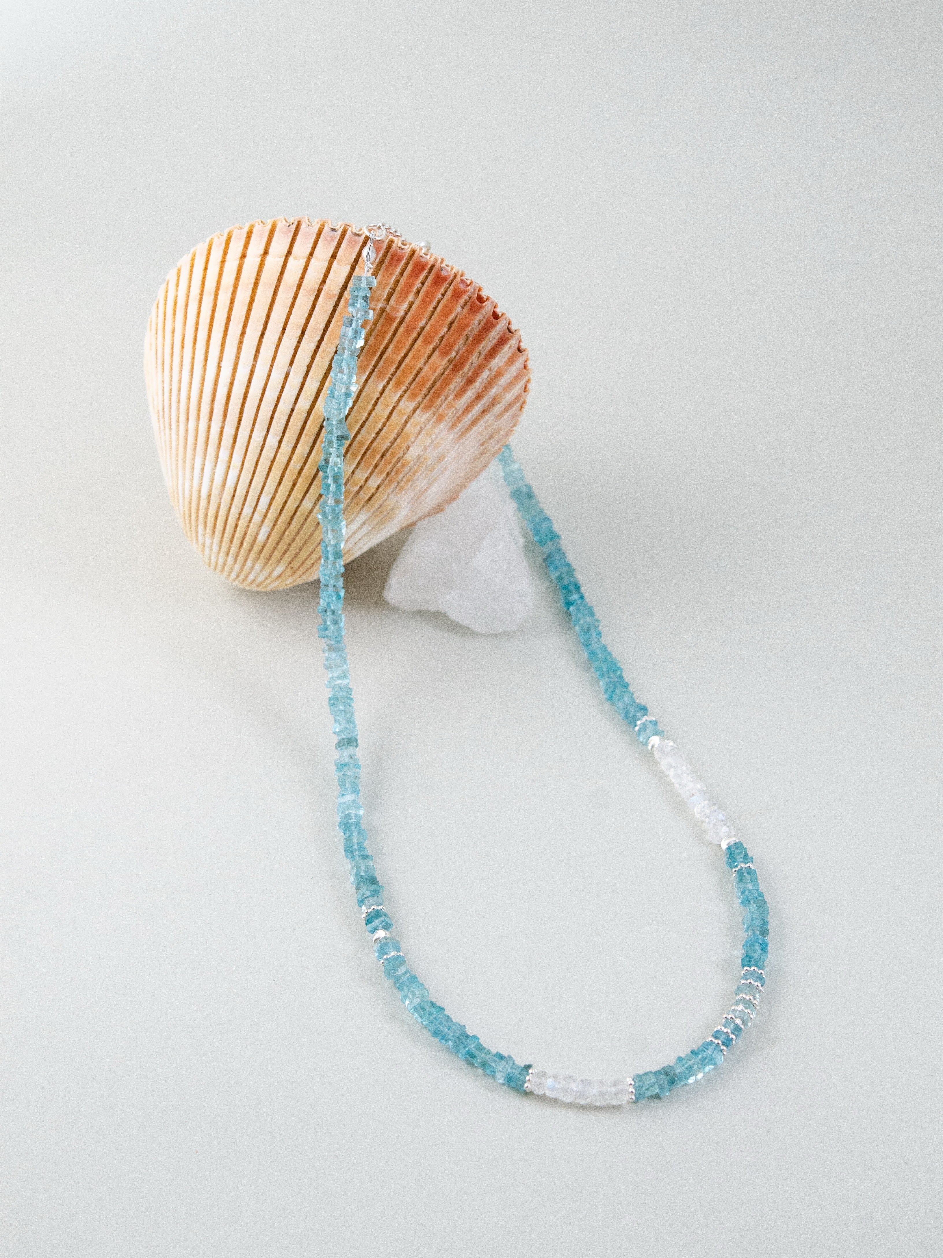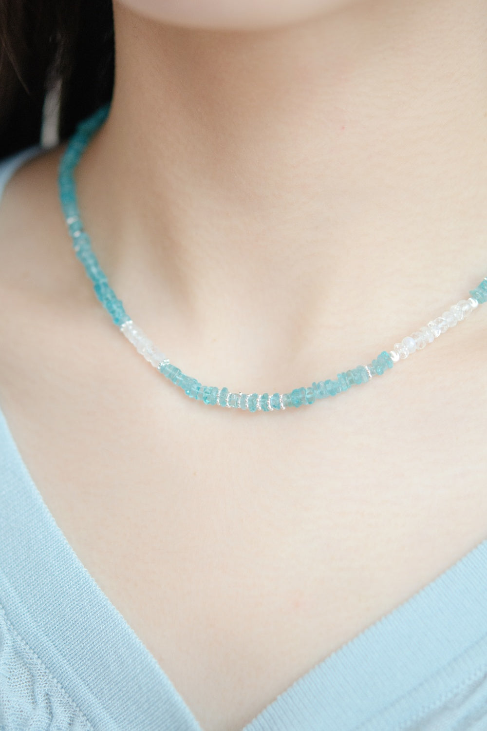 透き通るようなアパタイトのブルーと、やわらかなホワイトのムーンストーンを組み合わせた清楚なネックレスです。朝の海辺に射す光のような透明感と静けさを胸元にまとい、軽やかで爽やかな印象を与えます。爽やかな色合いがどんなコーディネートにも馴染み、日常から特別な日まで幅広く活躍する万能ジュエリーです。